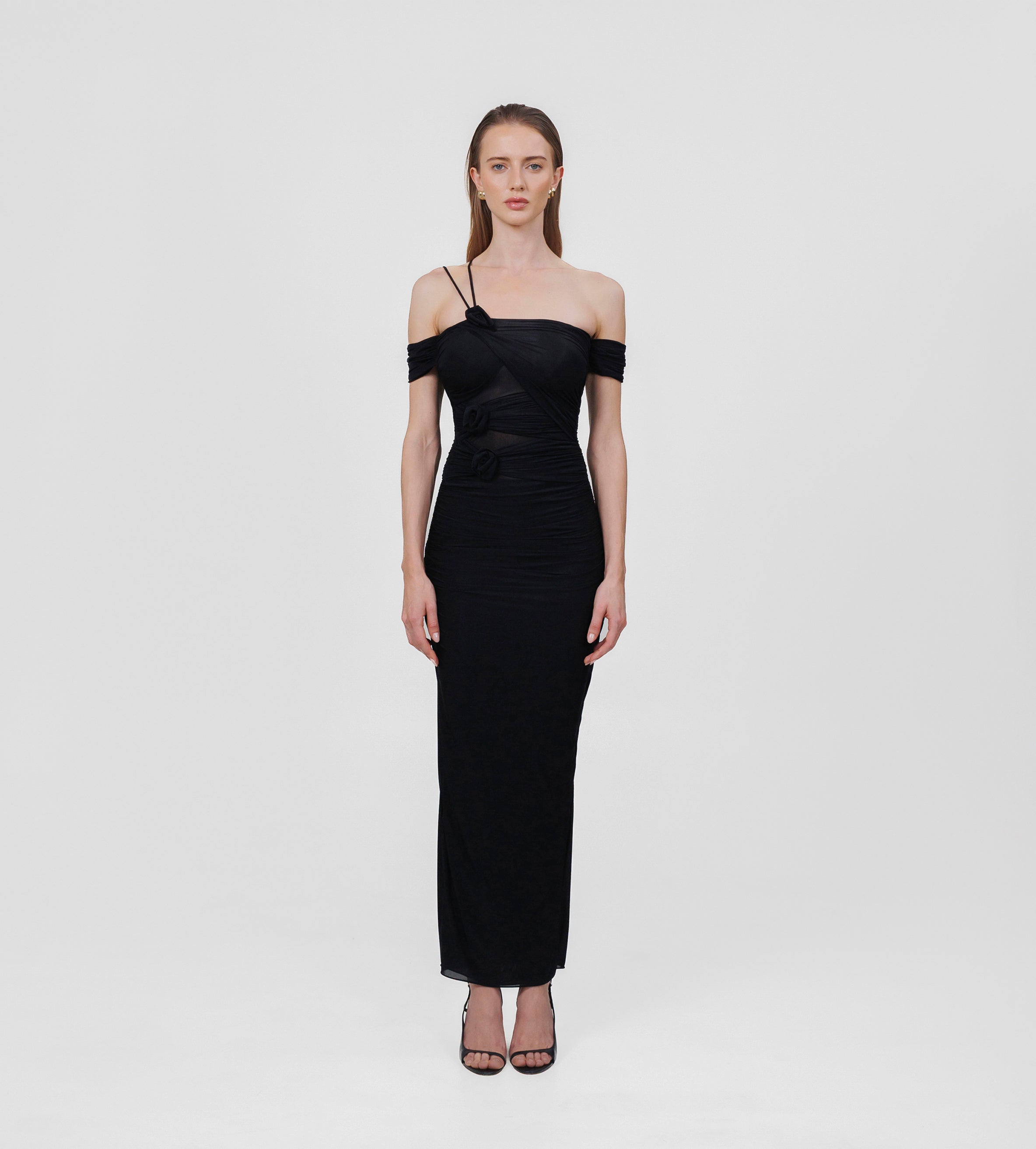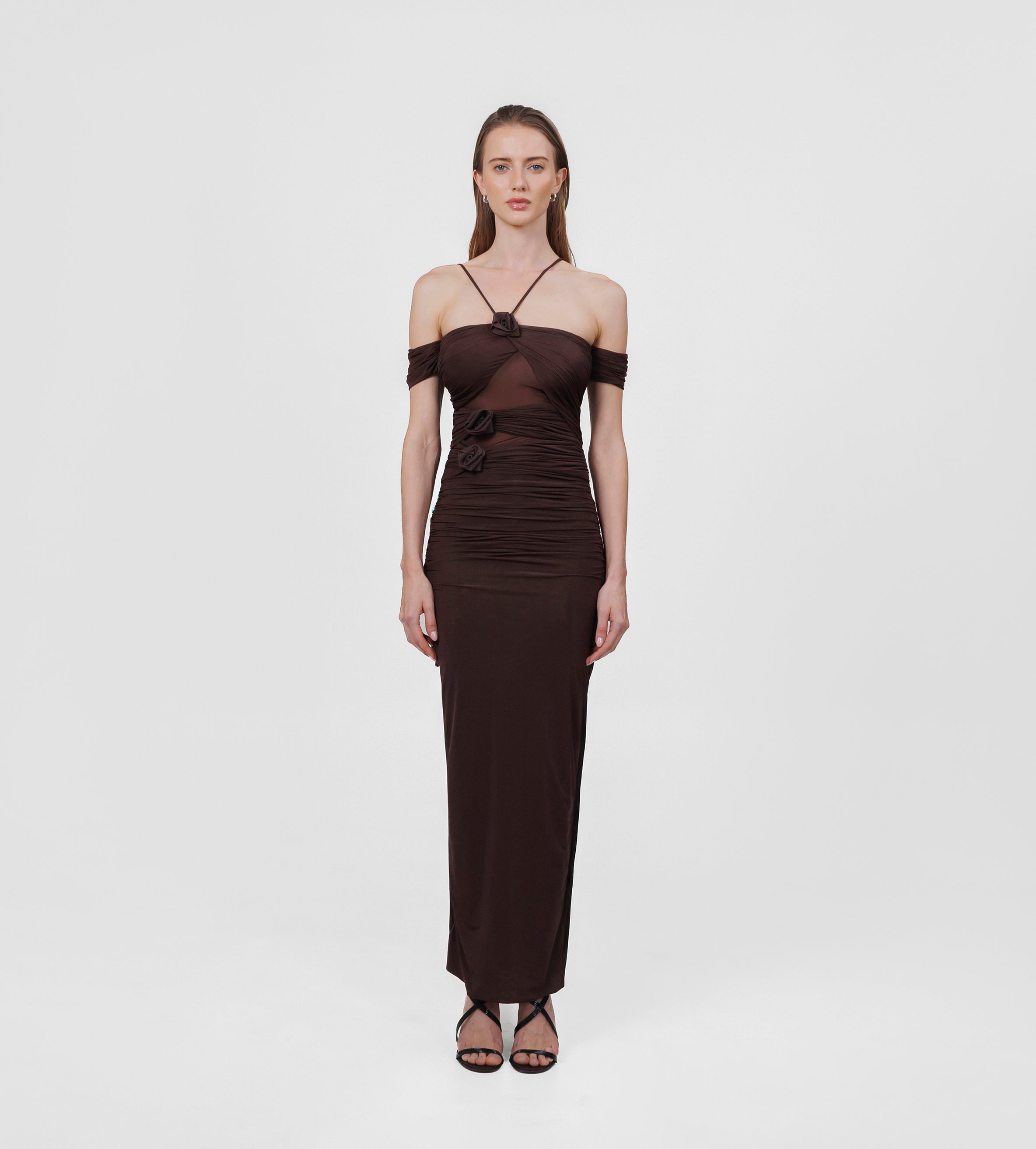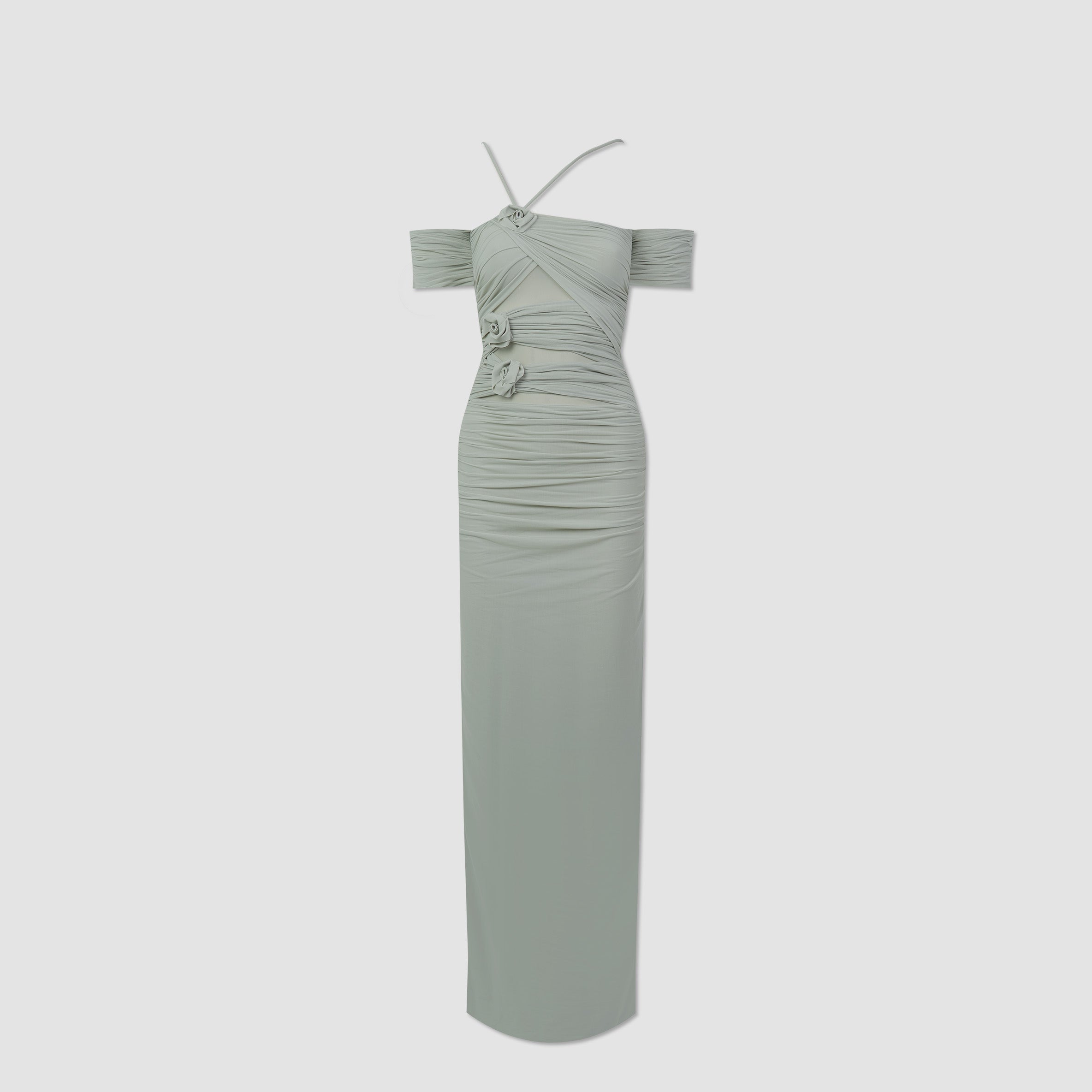 The Abisso long dress plays with perception through a sheer layer overlaid with ruched straps that gracefully contour the bust and intertwine playfully across the body. Finished with three delicate floral embellishments, the design flows into a softly gathered column skirt. Off-shoulder ruched short sleeves and slender straps complete the look, striking a perfect balance of sensuality and sophistication.