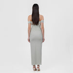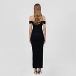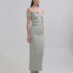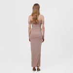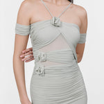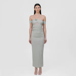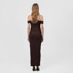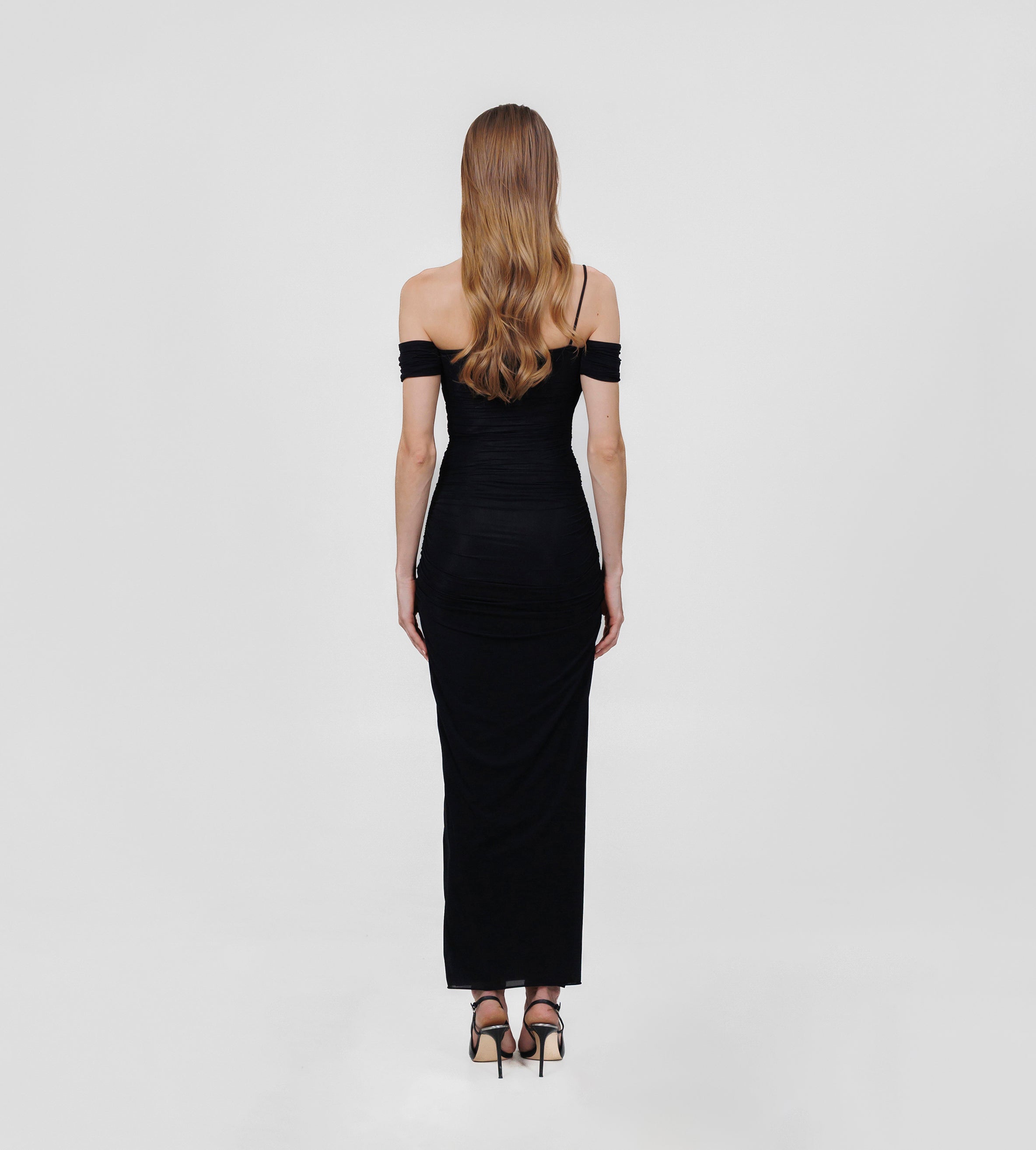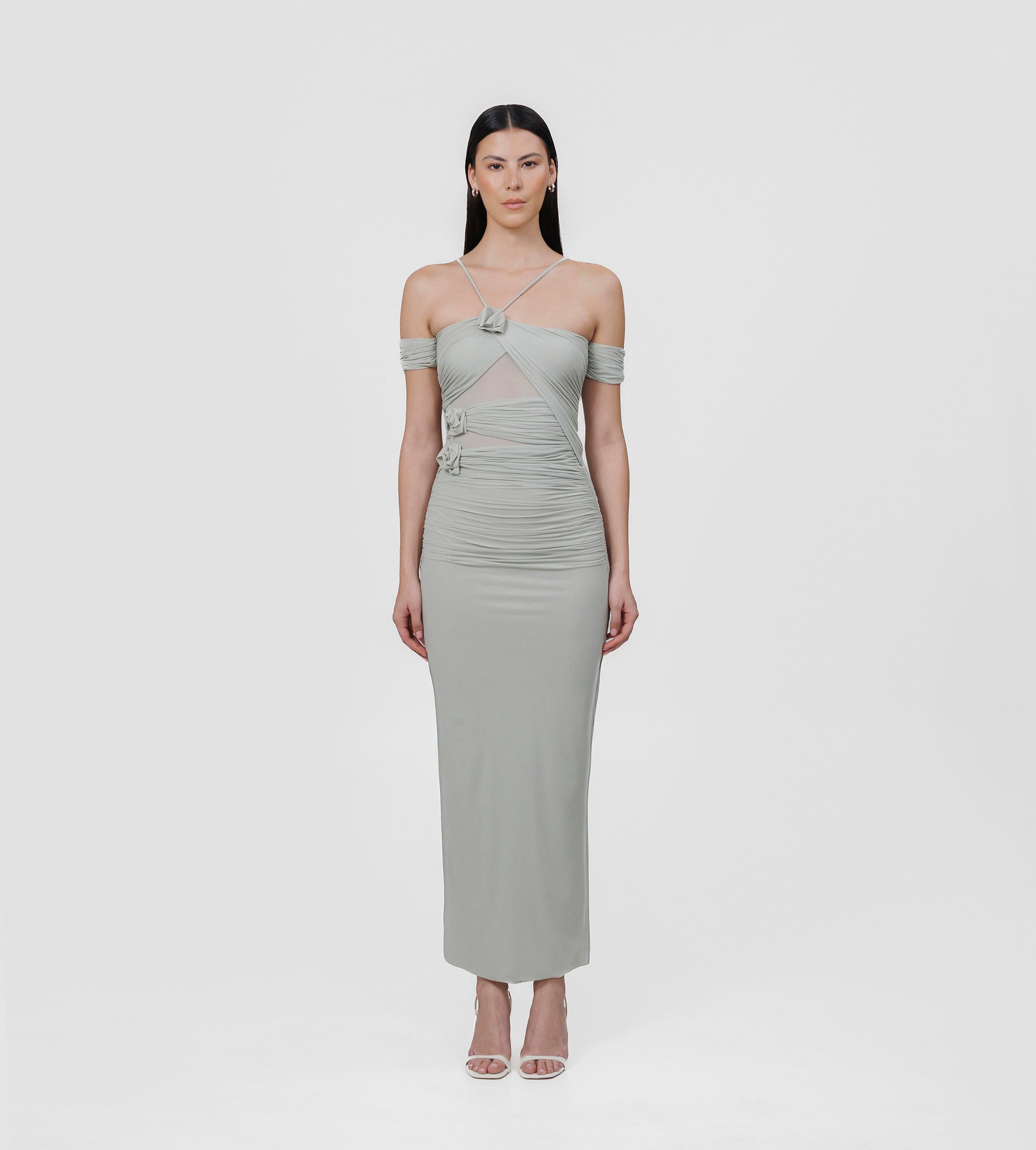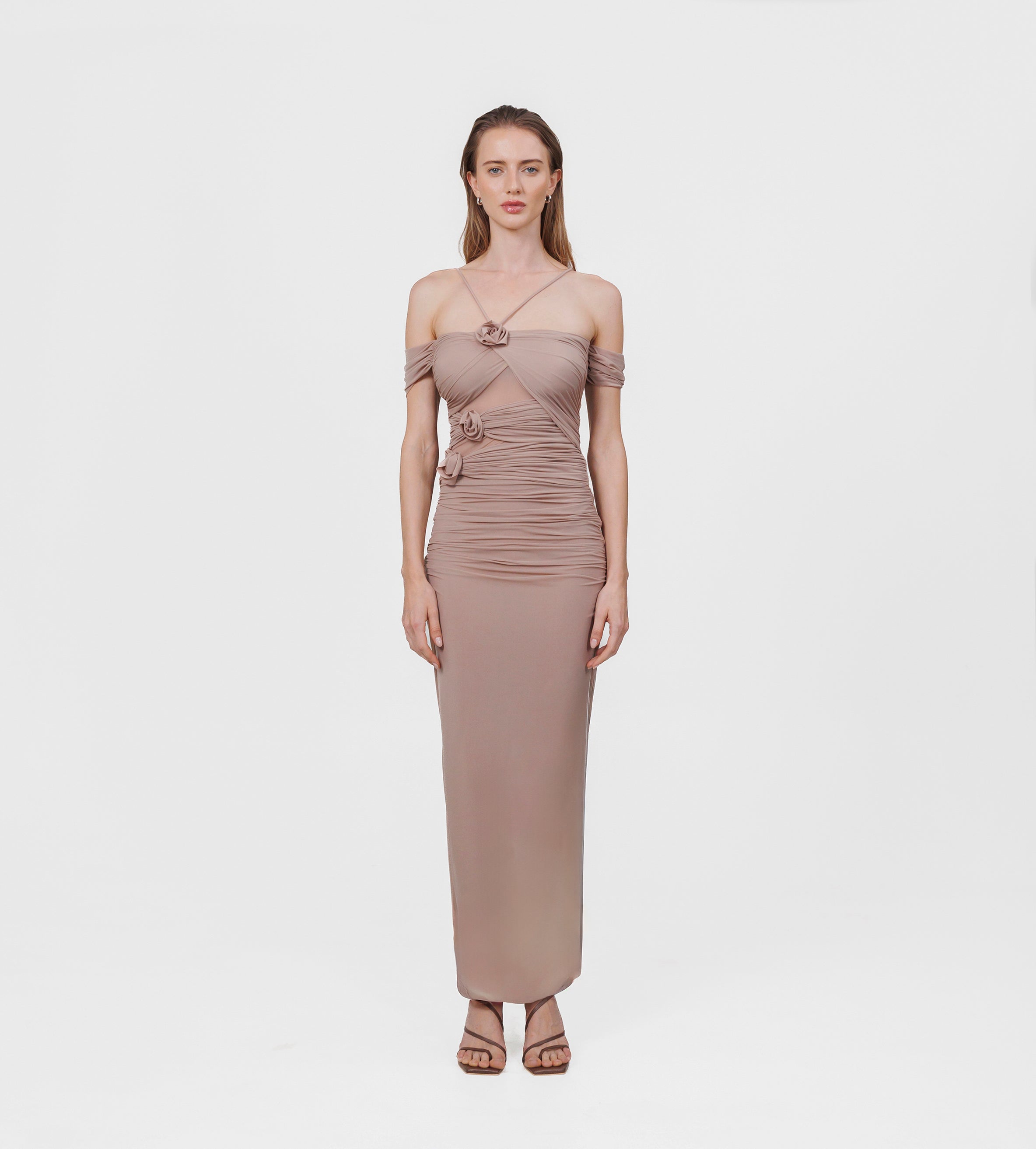The Abisso long dress plays with perception through a sheer layer overlaid with ruched straps that gracefully contour the bust and intertwine playfully across the body. Finished with three delicate floral embellishments, the design flows into a softly gathered column skirt. Off-shoulder ruched short sleeves and slender straps complete the look, striking a perfect balance of sensuality and sophistication.