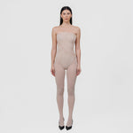 The Alondra one-piece showcases a soft, strapless neckline with intricate ruching that gracefully contours the body and continues into a fully ruched back. Its gathered texture accentuates the waist, creating a sculpted elegant look.