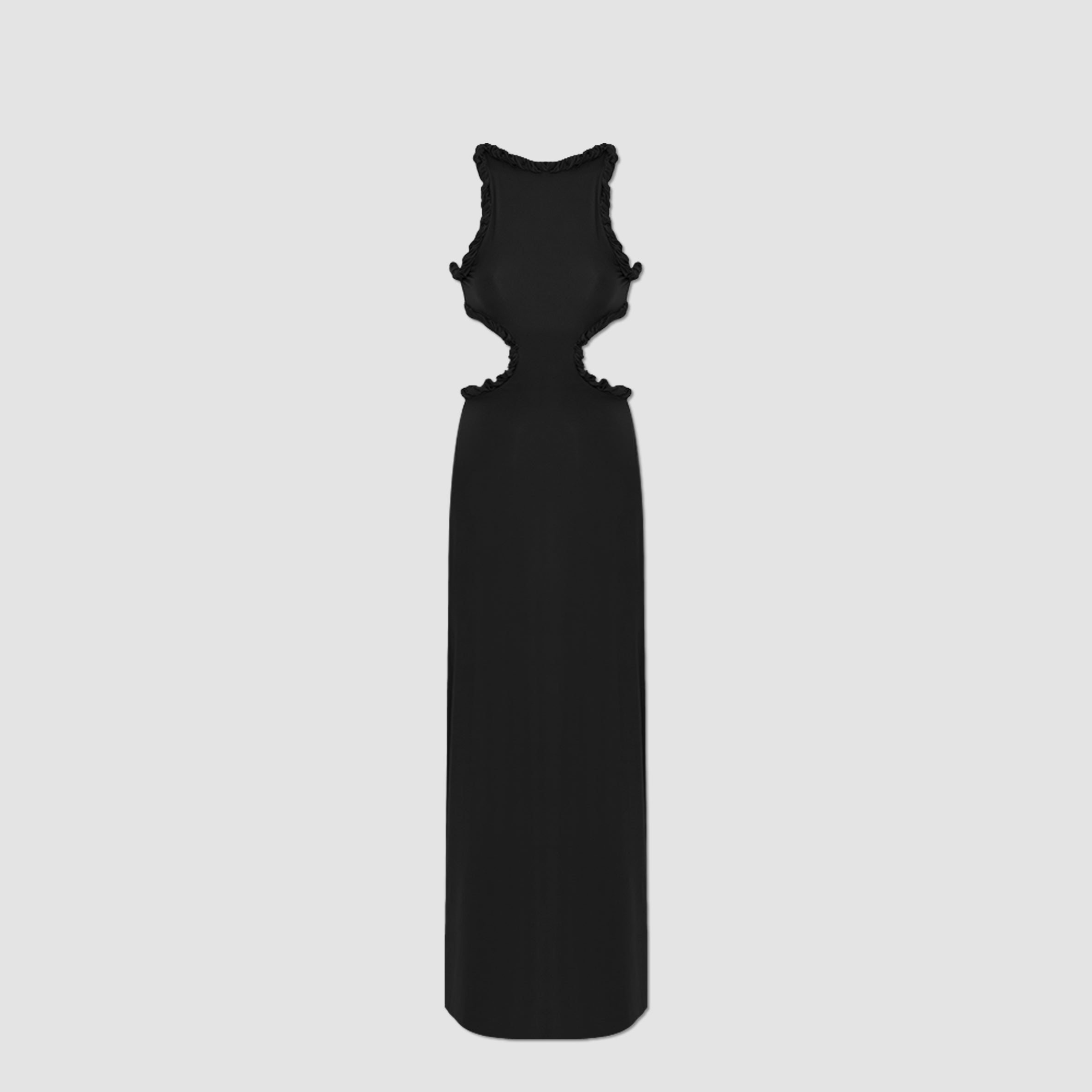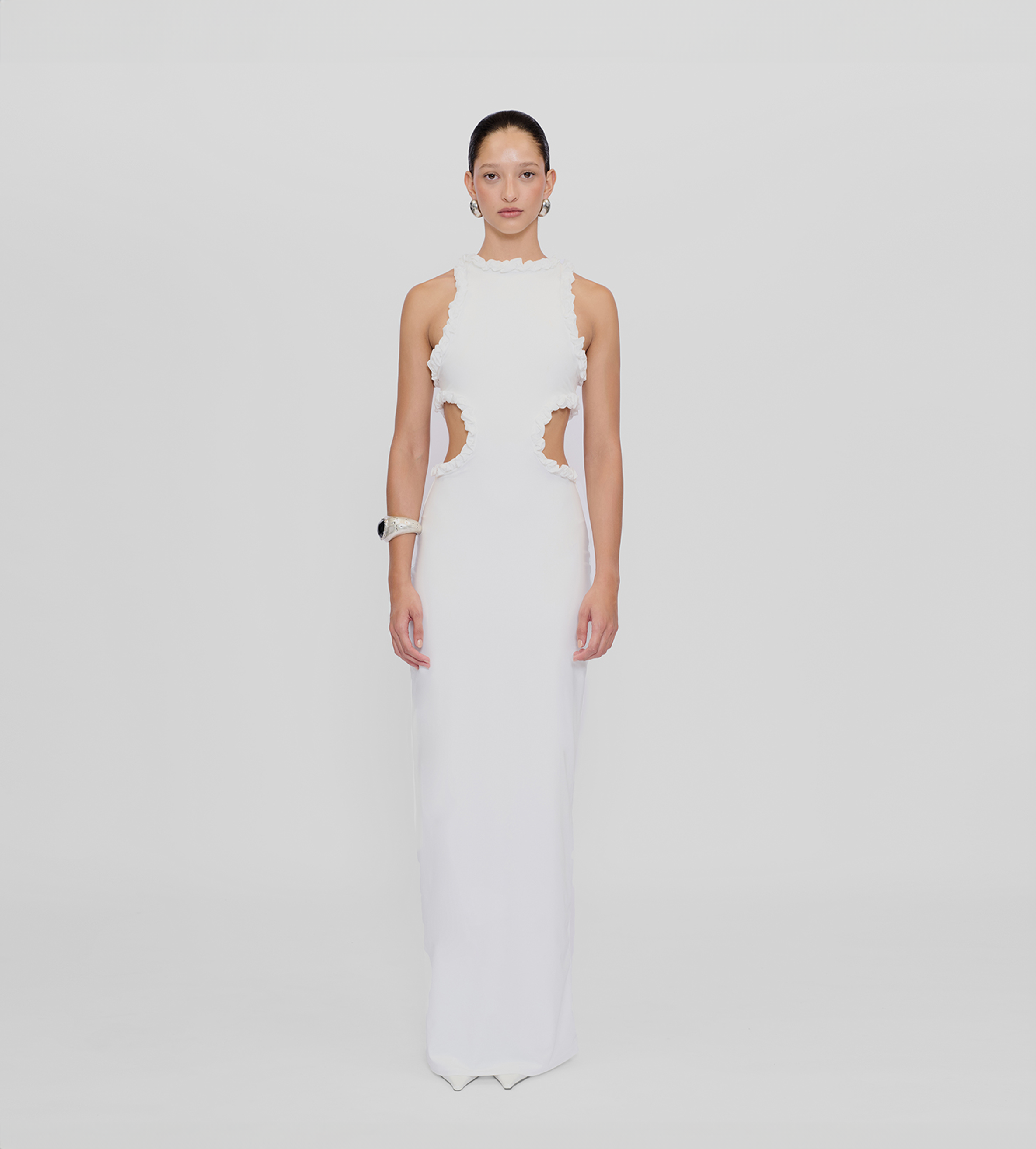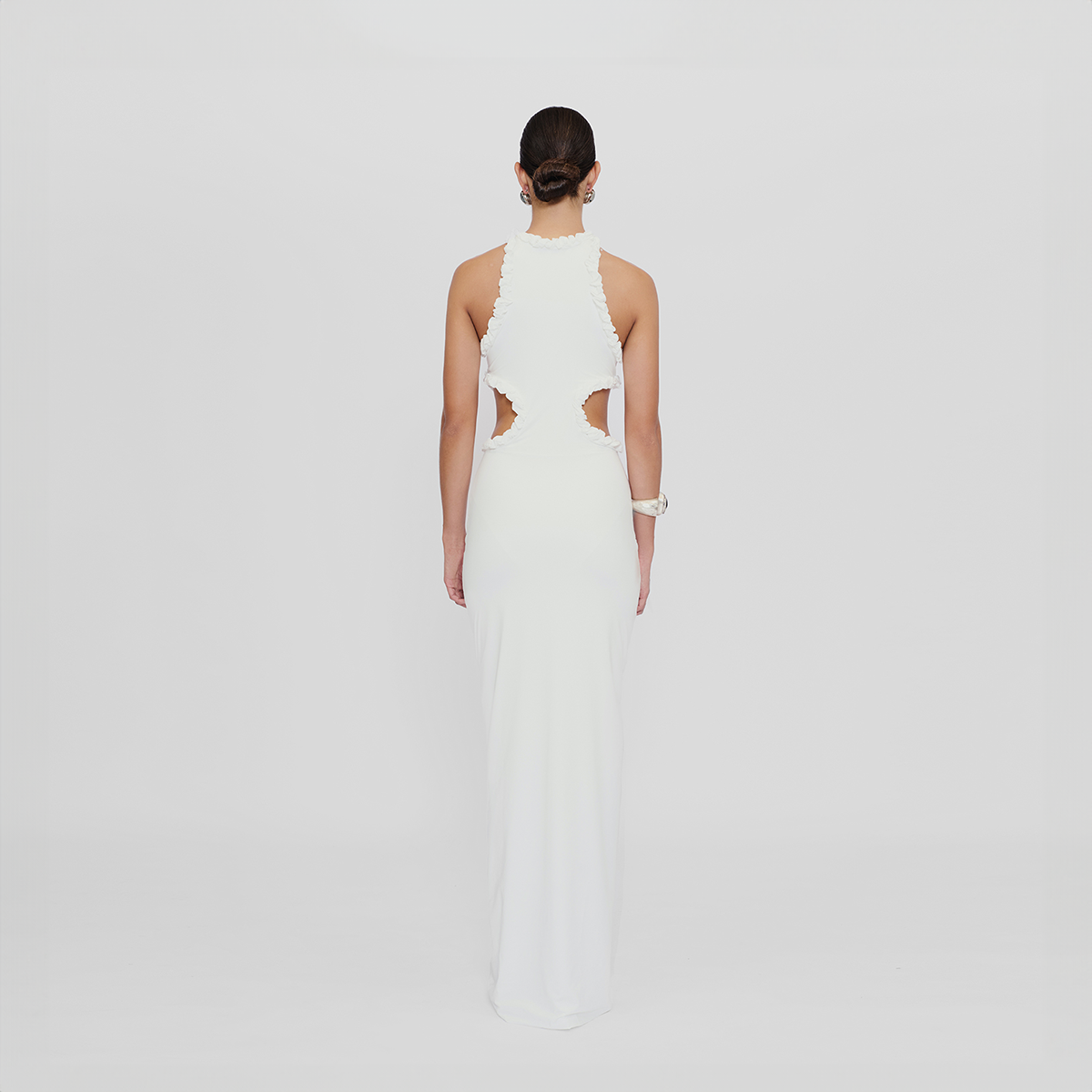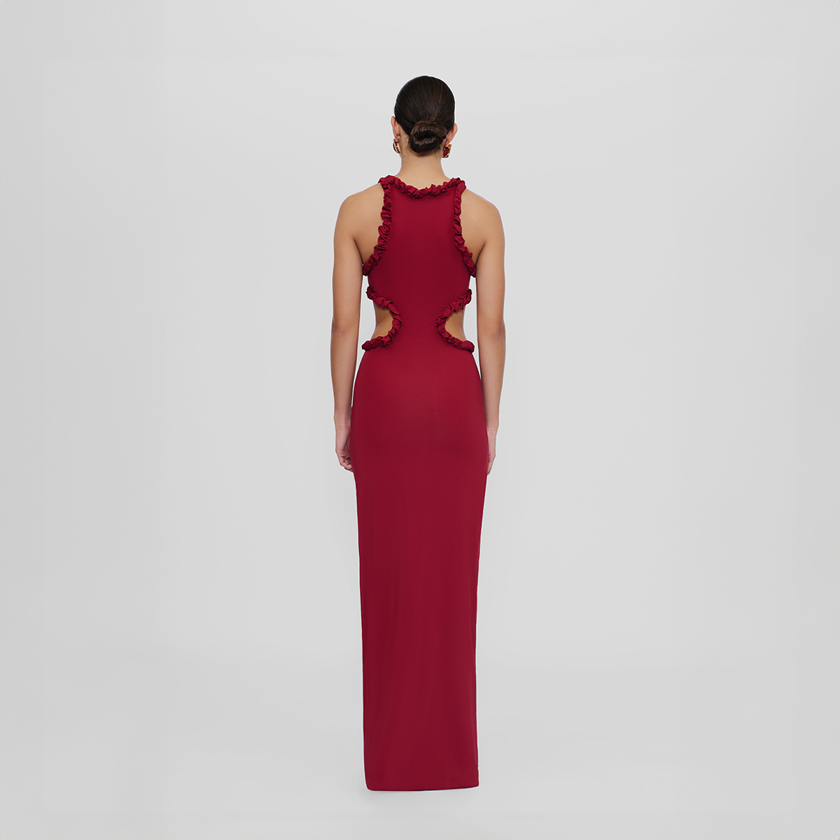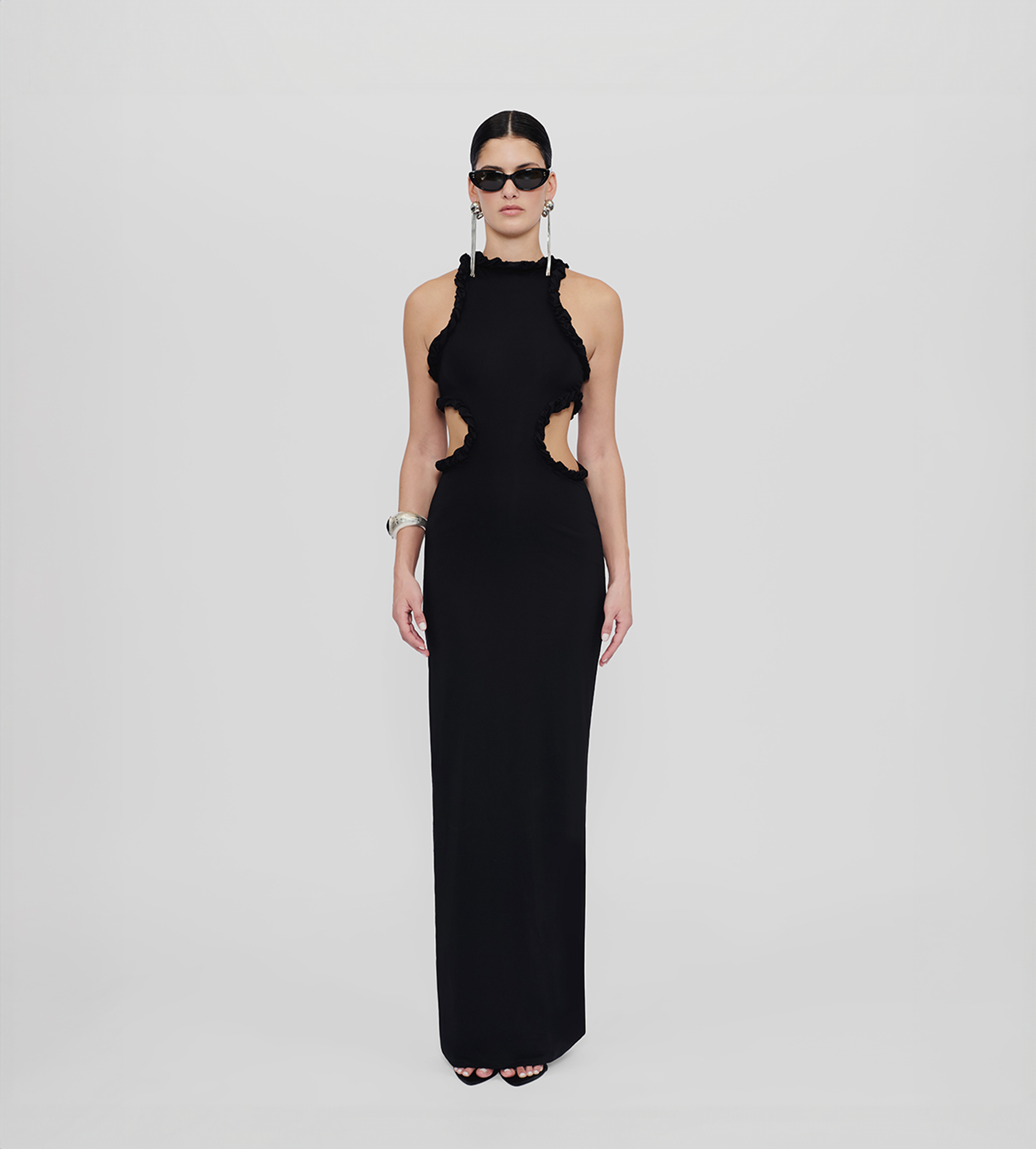 Long and sleek, our Anassa dress features a round neckline, sensual side cutouts and a flirtatious mini ruffle all around detail, wrap up with a long column-style skirt a sophisticated design perfect for any celebration.