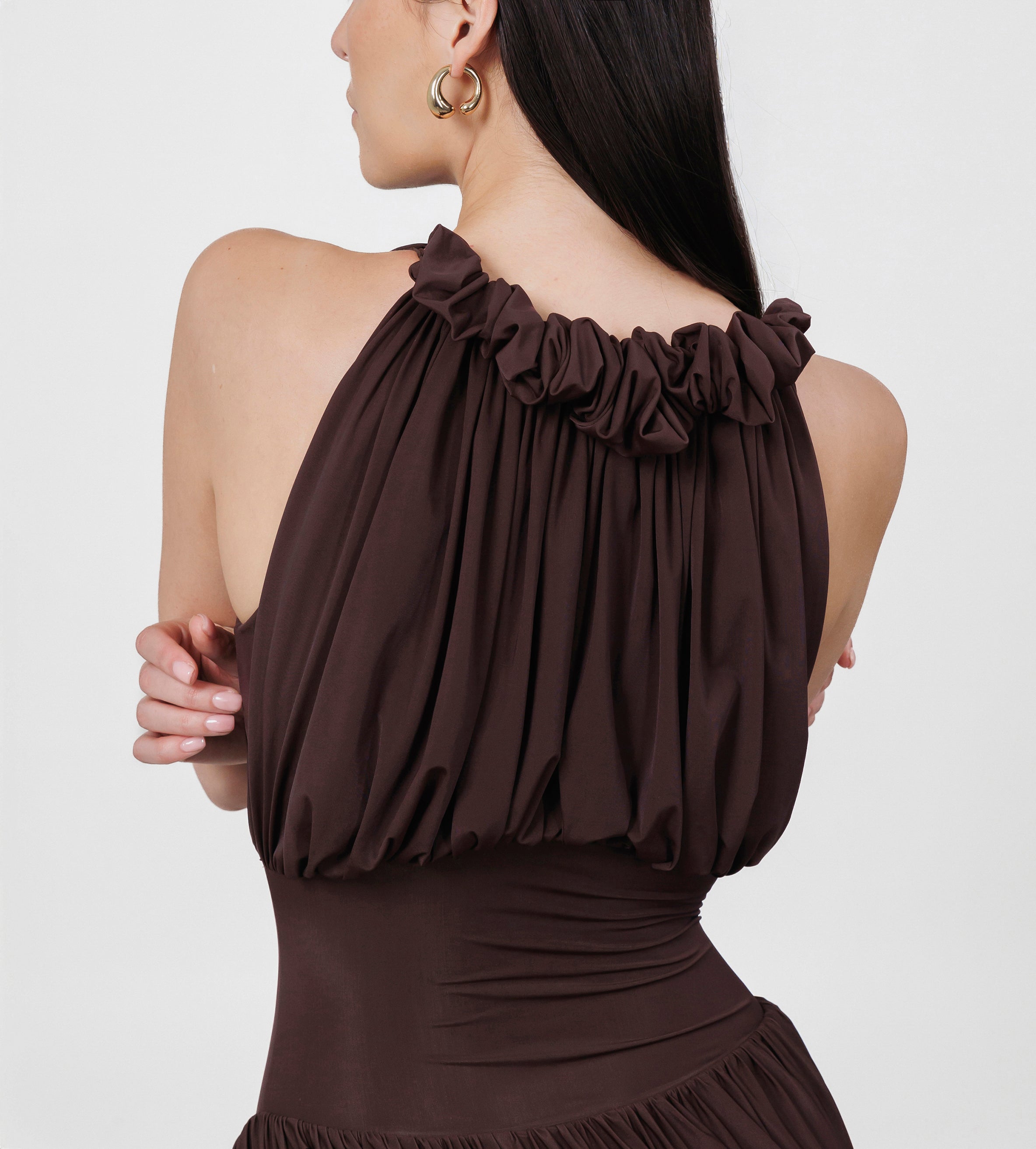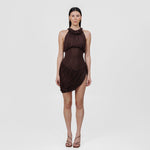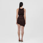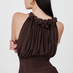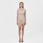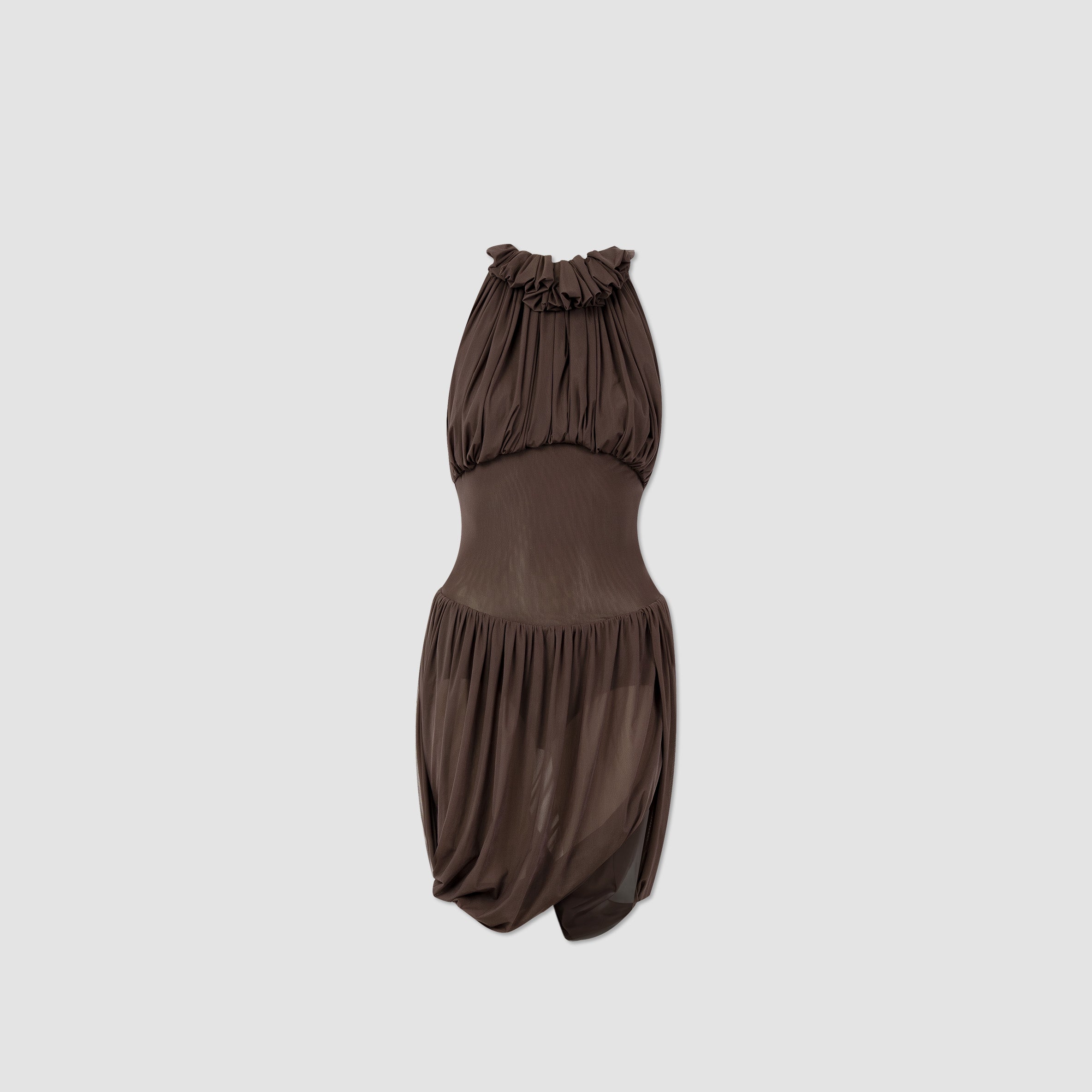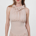The Angulo mini dress blends the delicate shades of our sheer fabric, featuring a soft round neckline adorned with mini ruffles and a button clasp at the side. A ruched bodice gently contours the silhouette, revealing a sleek layer at the torso that transitions into a fully gathered, twisted mini skirt with a graceful side opening. For added comfort, the Angulo mini dress includes an internal bodysuit clasp, ensuring both ease and elegance in every movement.