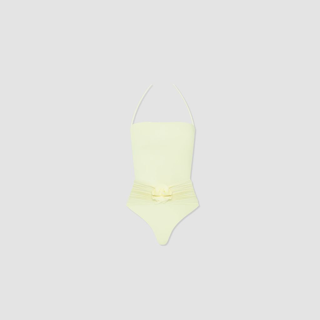 Straight neckline one-piece with delicate ruched detail at the waist in front and back, wrapped up with our signature 3D handmade flower at front and an elegant thin strap to the neck; a minimal design that embodies the brand's feminine essence.