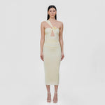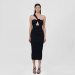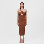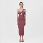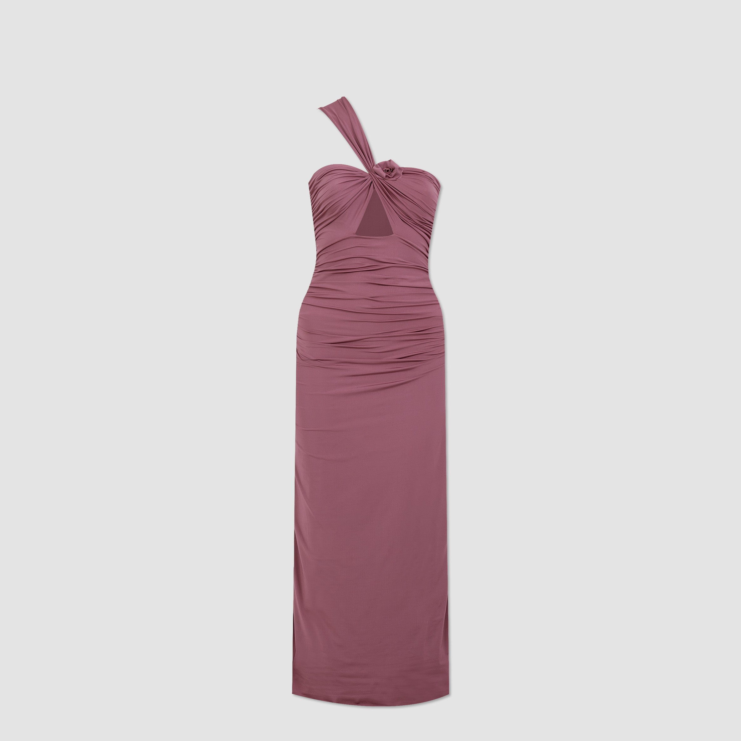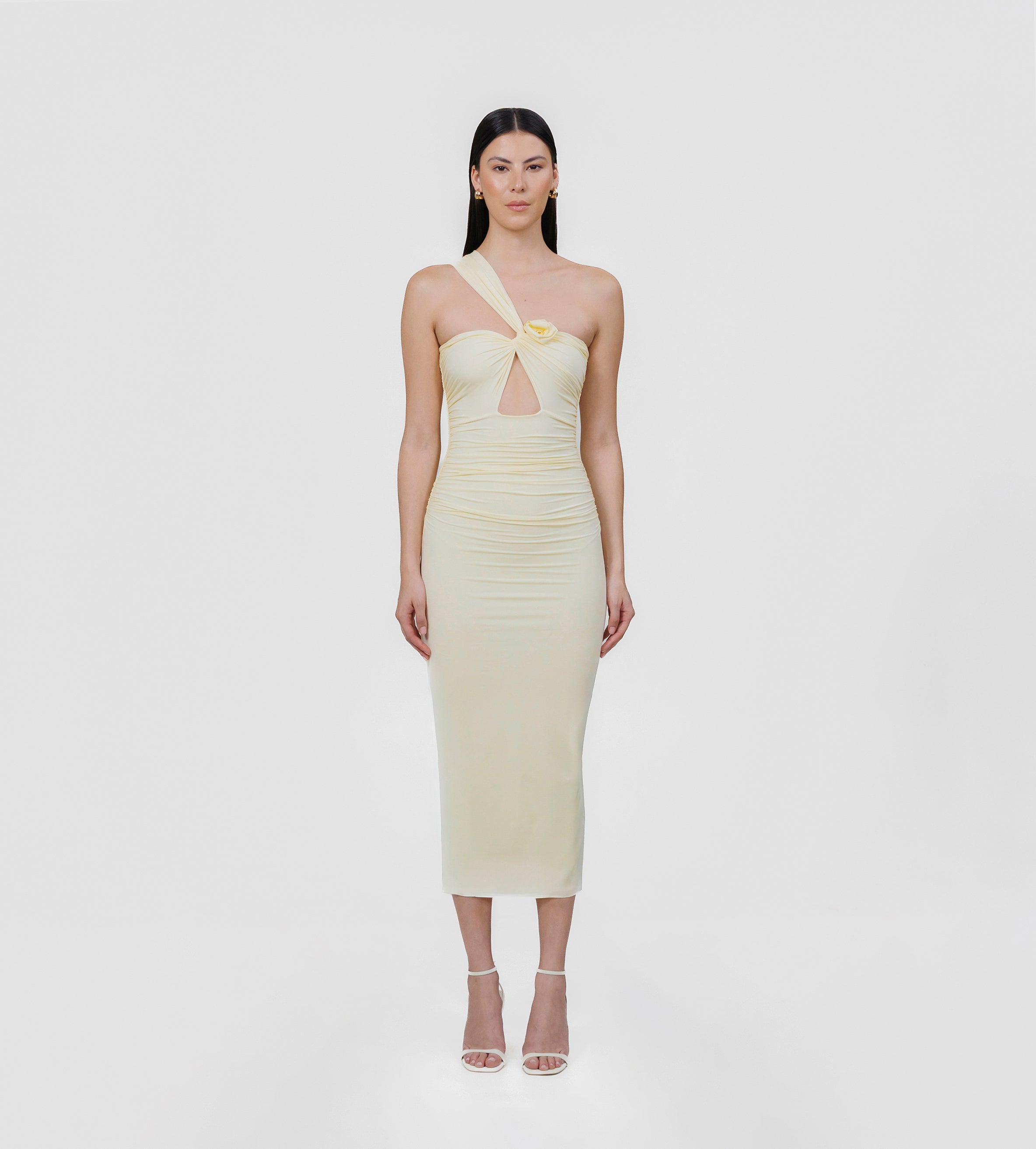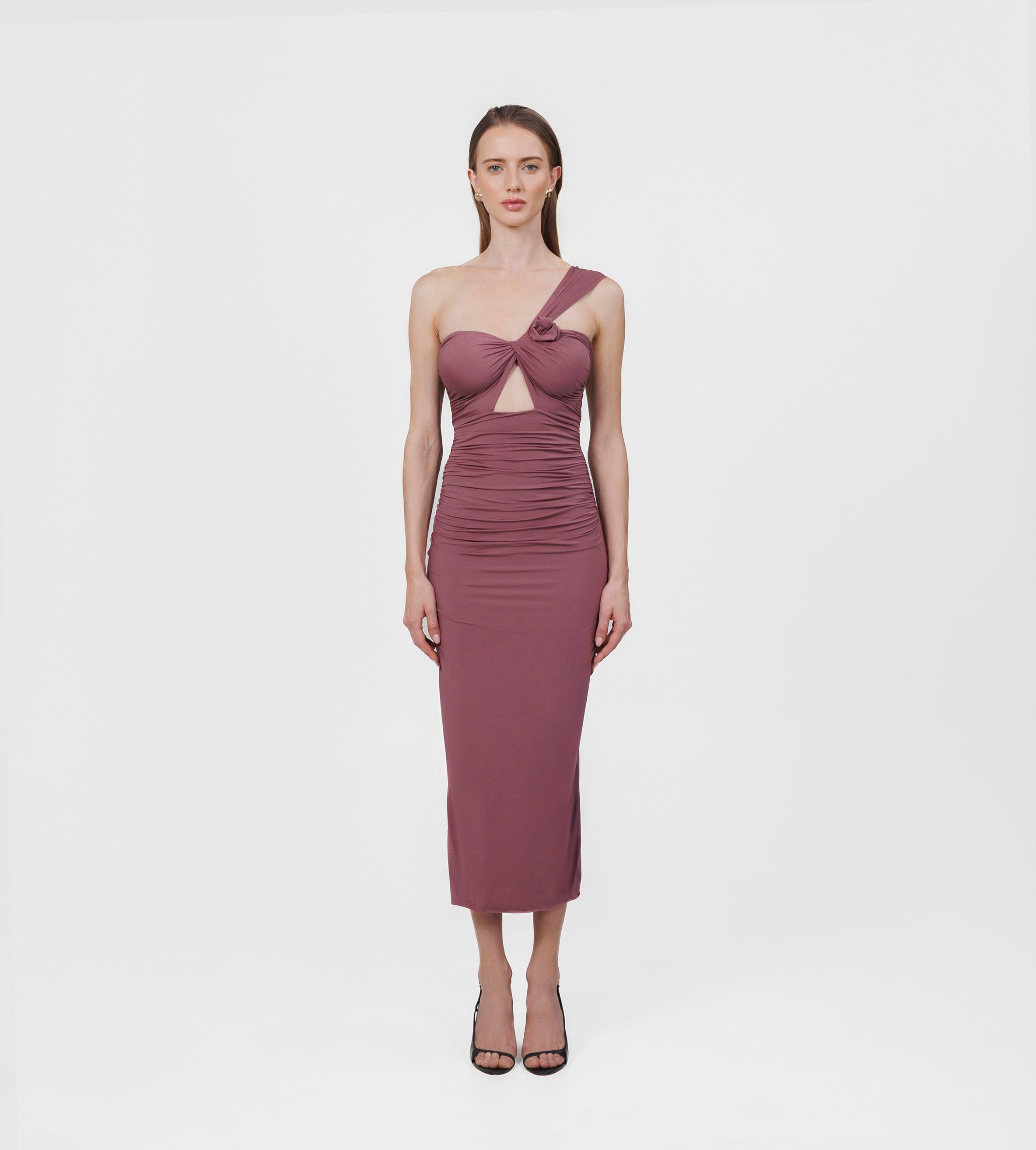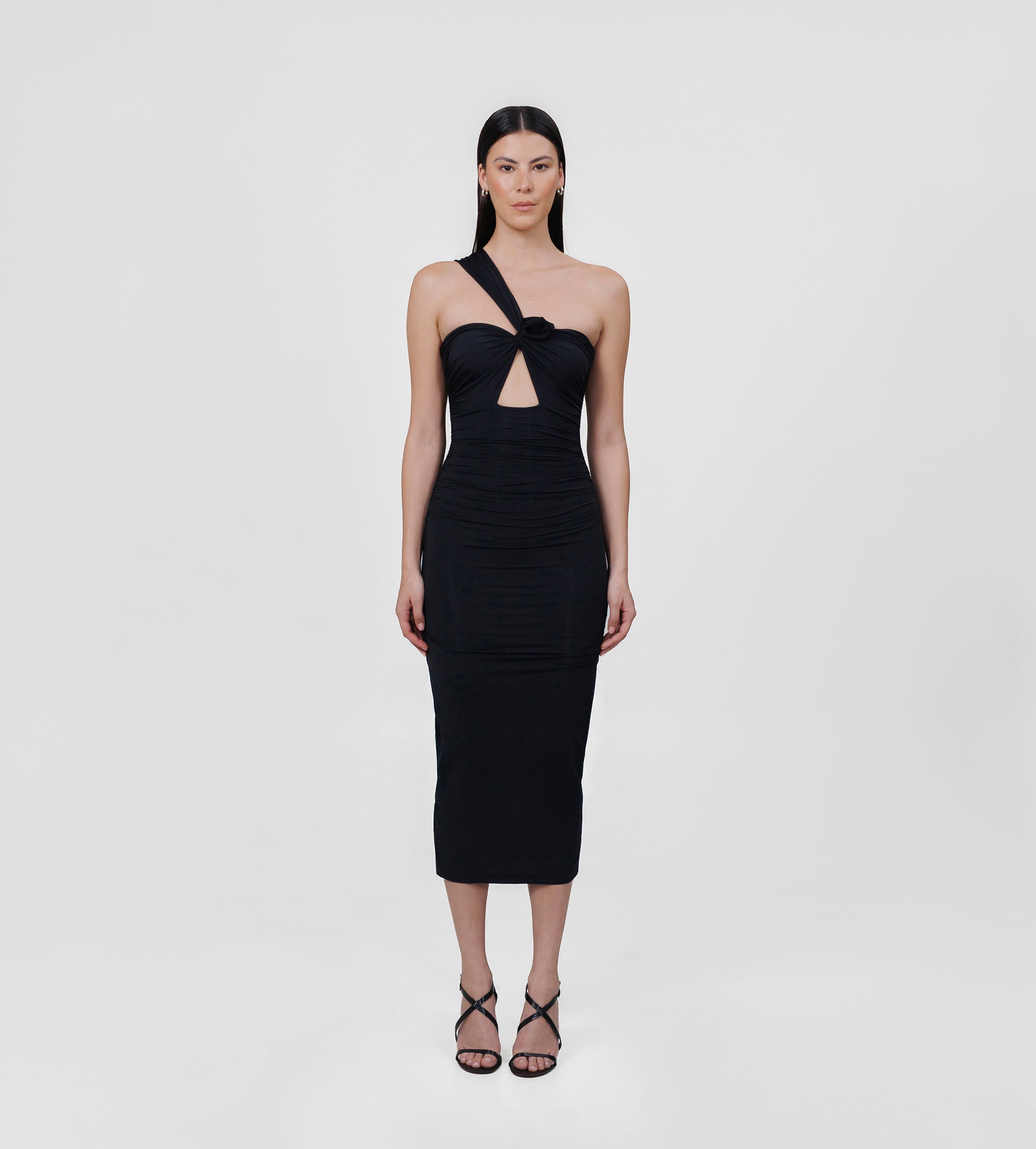 The Arcano midi dress features a one-shoulder design with a ruched diagonal strap that contours a subtle heart-shape neckline and frames a central cut-out, finished with a 3D floral detail. The softly gathered bodice at the front and back flows effortlessly into a sleek plain column skirt, creating a harmonious balance.