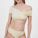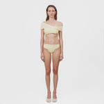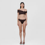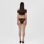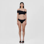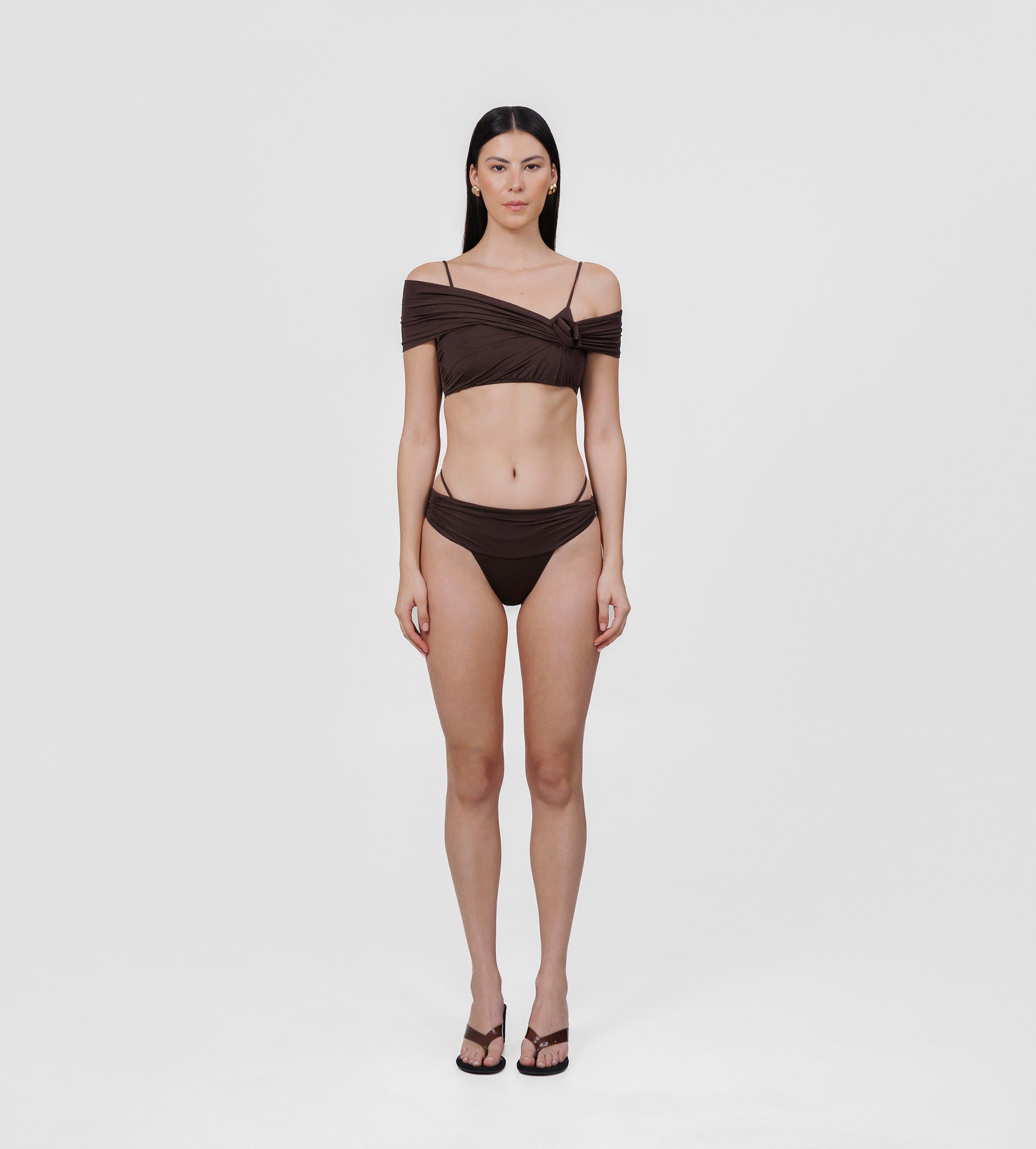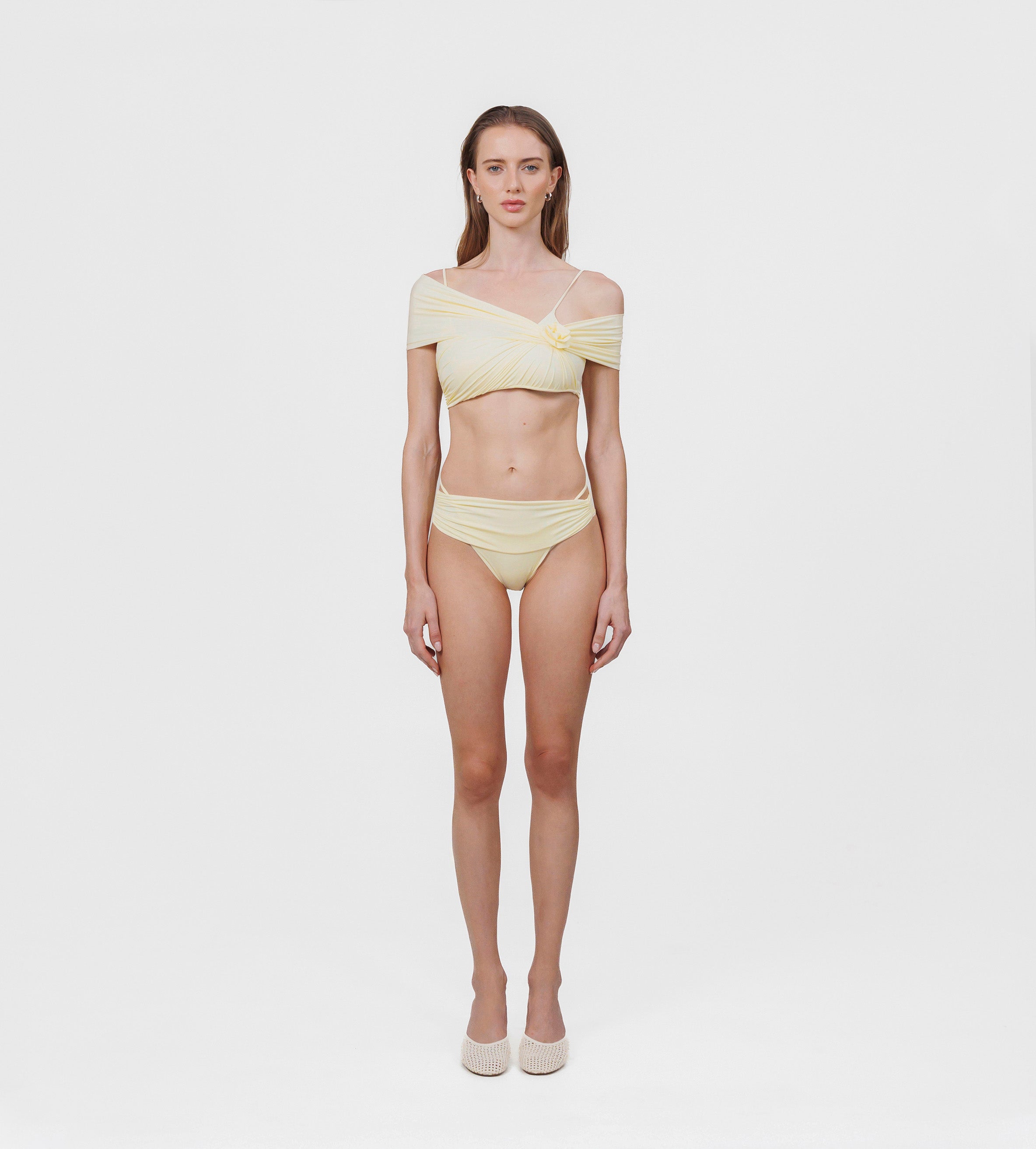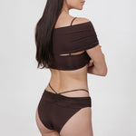 The Aria two-piece features an off-shoulder bandeau top with thin straps an asymmetric layered design. A wide ruched overlay gathered by a delicate 3D floral embellishment contrasts with the diagonally draped under layer—creating the illusion of two pieces in one. It pairs with a mid-rise, medium-coverage bottom that echoes the same dual concept, combining thin straps with a wide ruched band for a versatile and sophisticated ensemble.