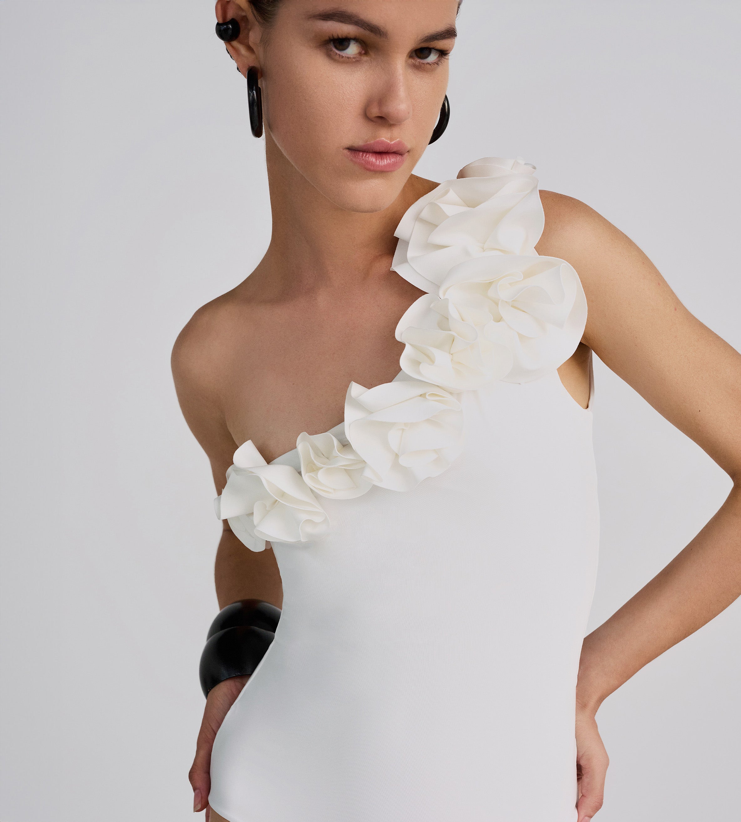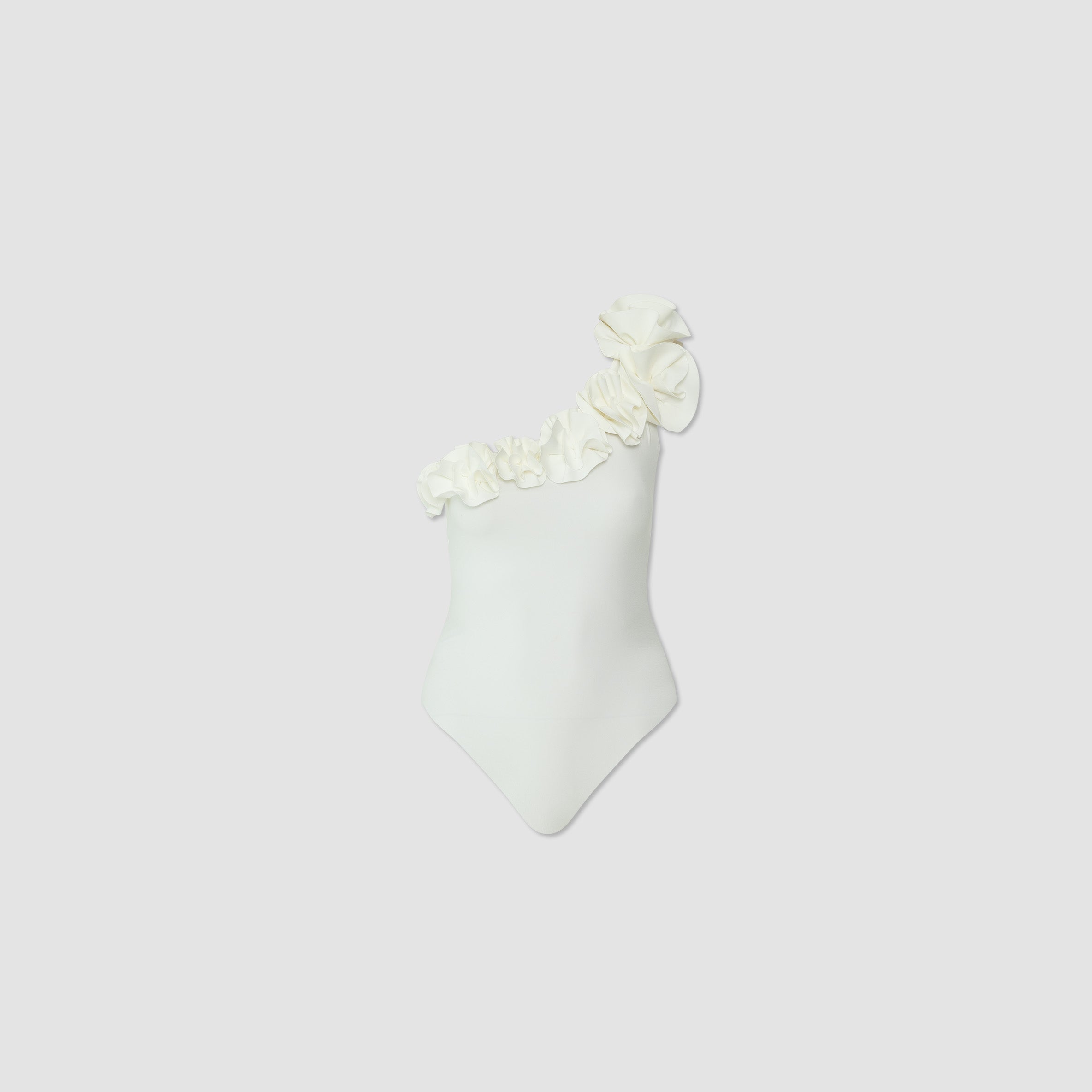 Straight neckline one-piece with delicate ruched detail at the waist in front and back, wrapped up with our signature 3D handmade flower at front and an elegant thin strap to the neck; a minimal design that embodies the brand's feminine essence.