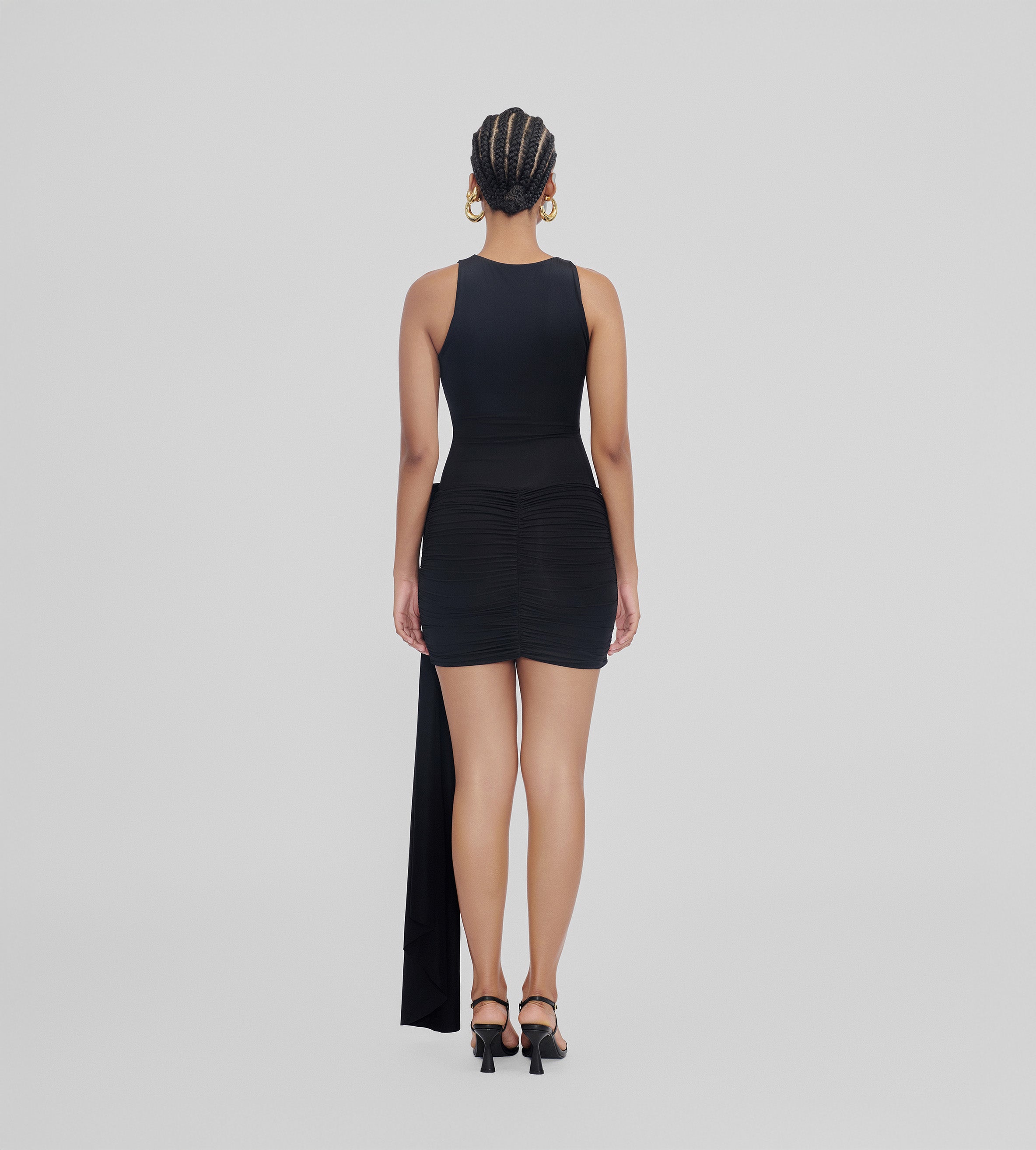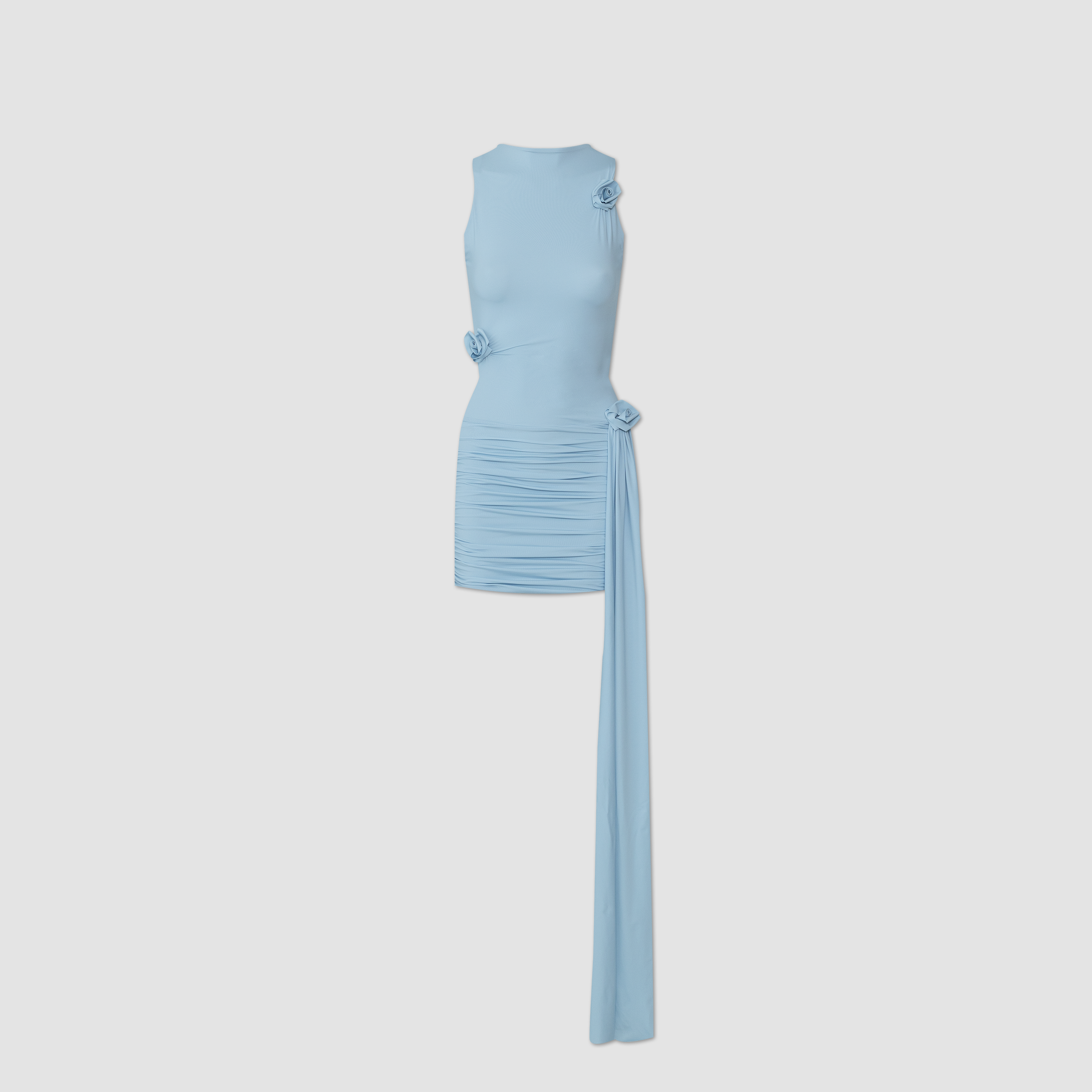 Our Azahar mini dress, crafted from our iconic stretch fabric, features a high round neckline and a form-fitting silhouette enhanced by memory-shape technology. The mini draped skirt cascades with single draping at the front and double draping at the back, beautifully accentuating the natural curves of the body. The look is completed with a side sash and strategically placed 3D handmade flowers.