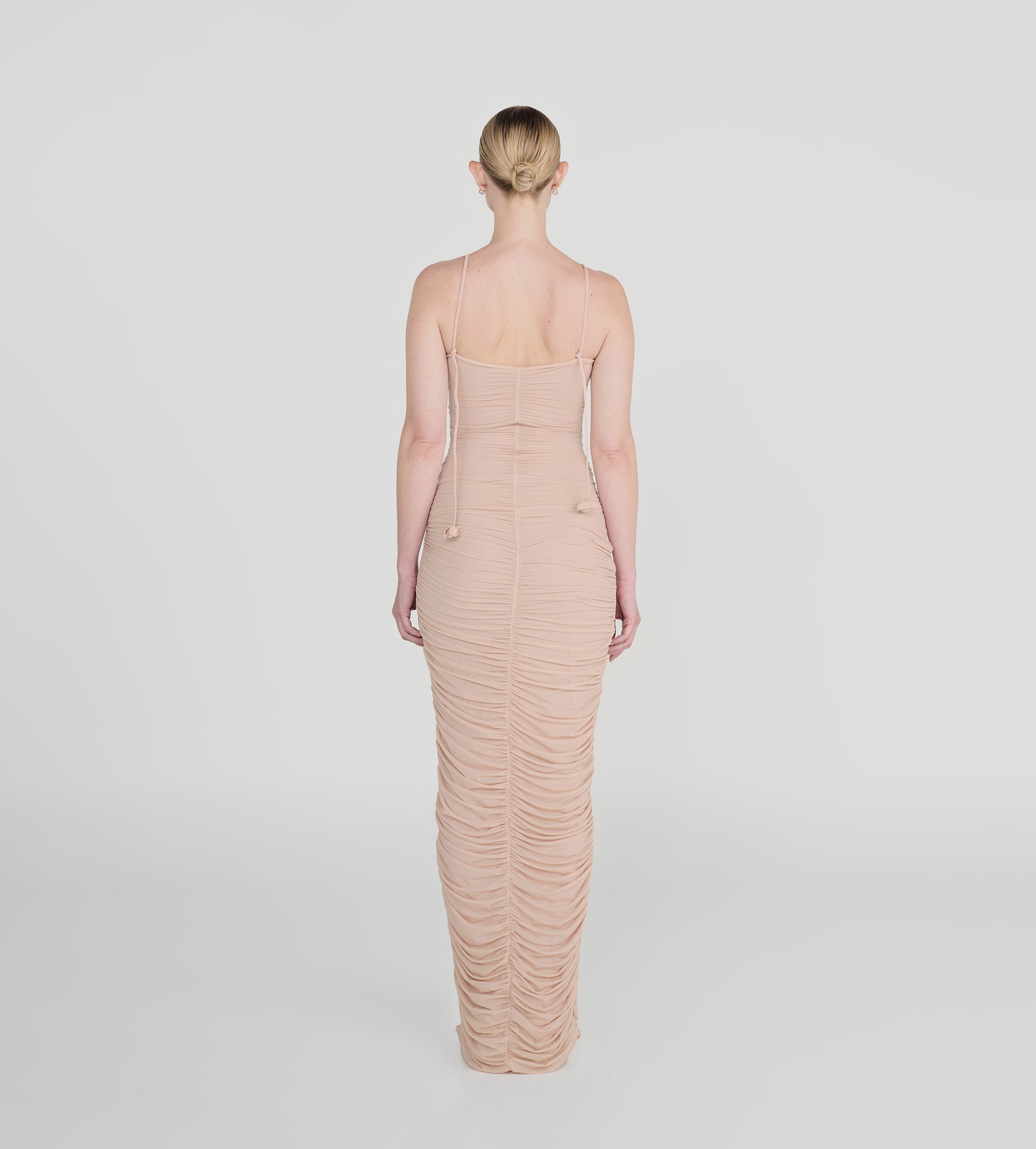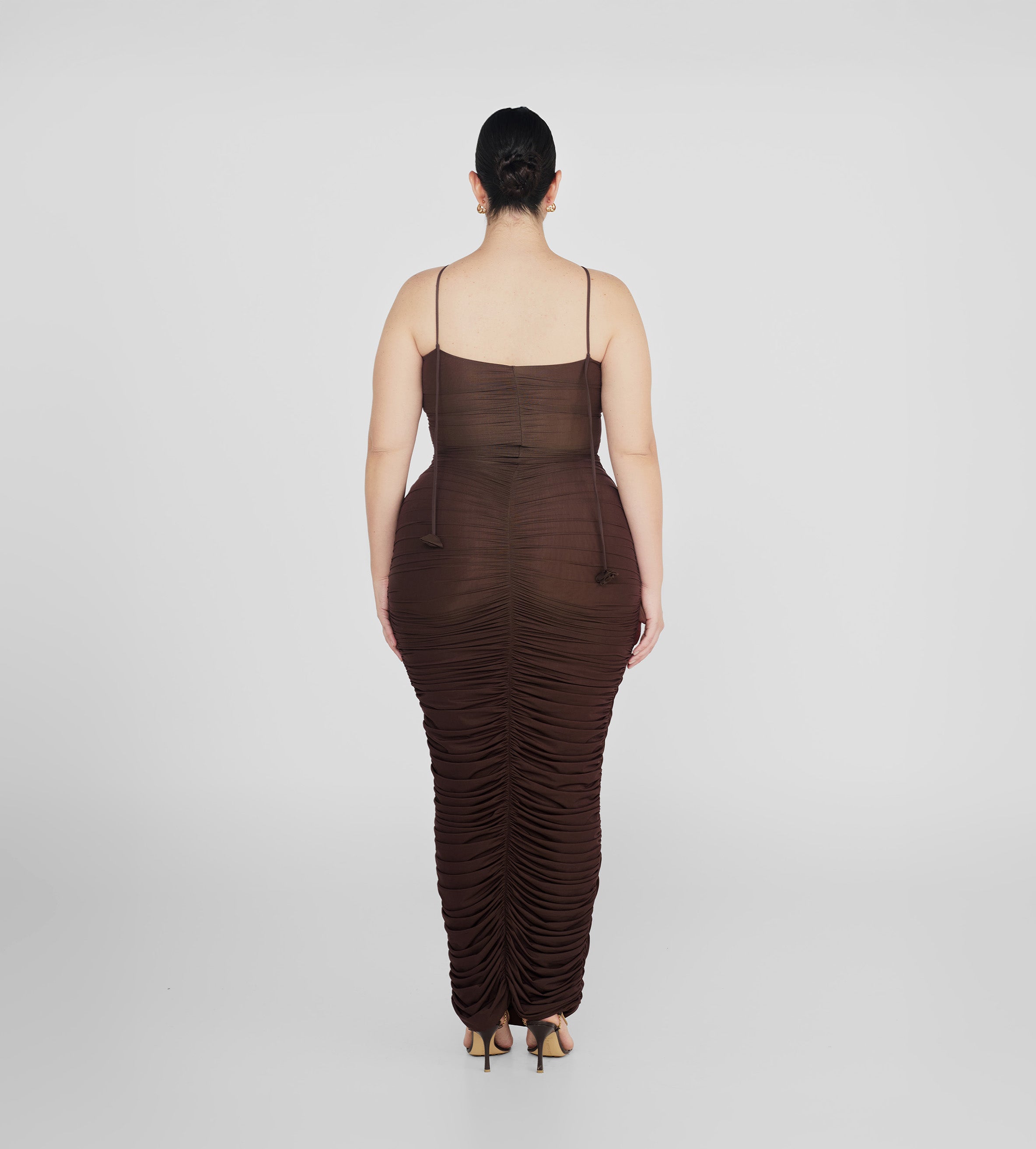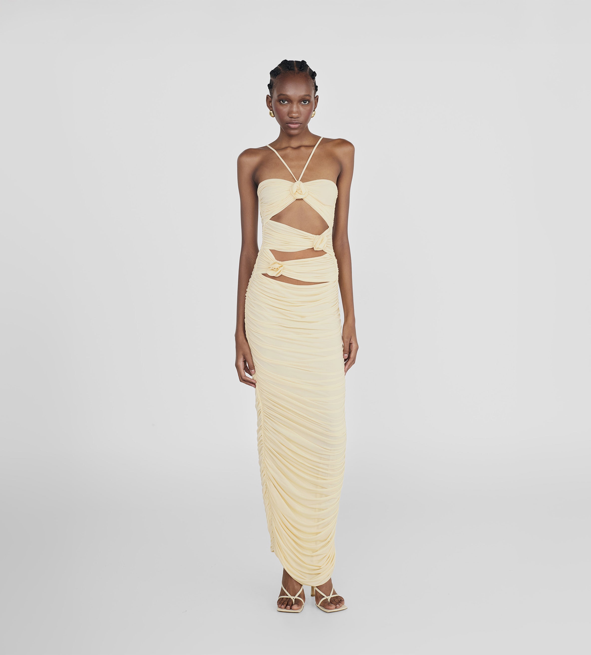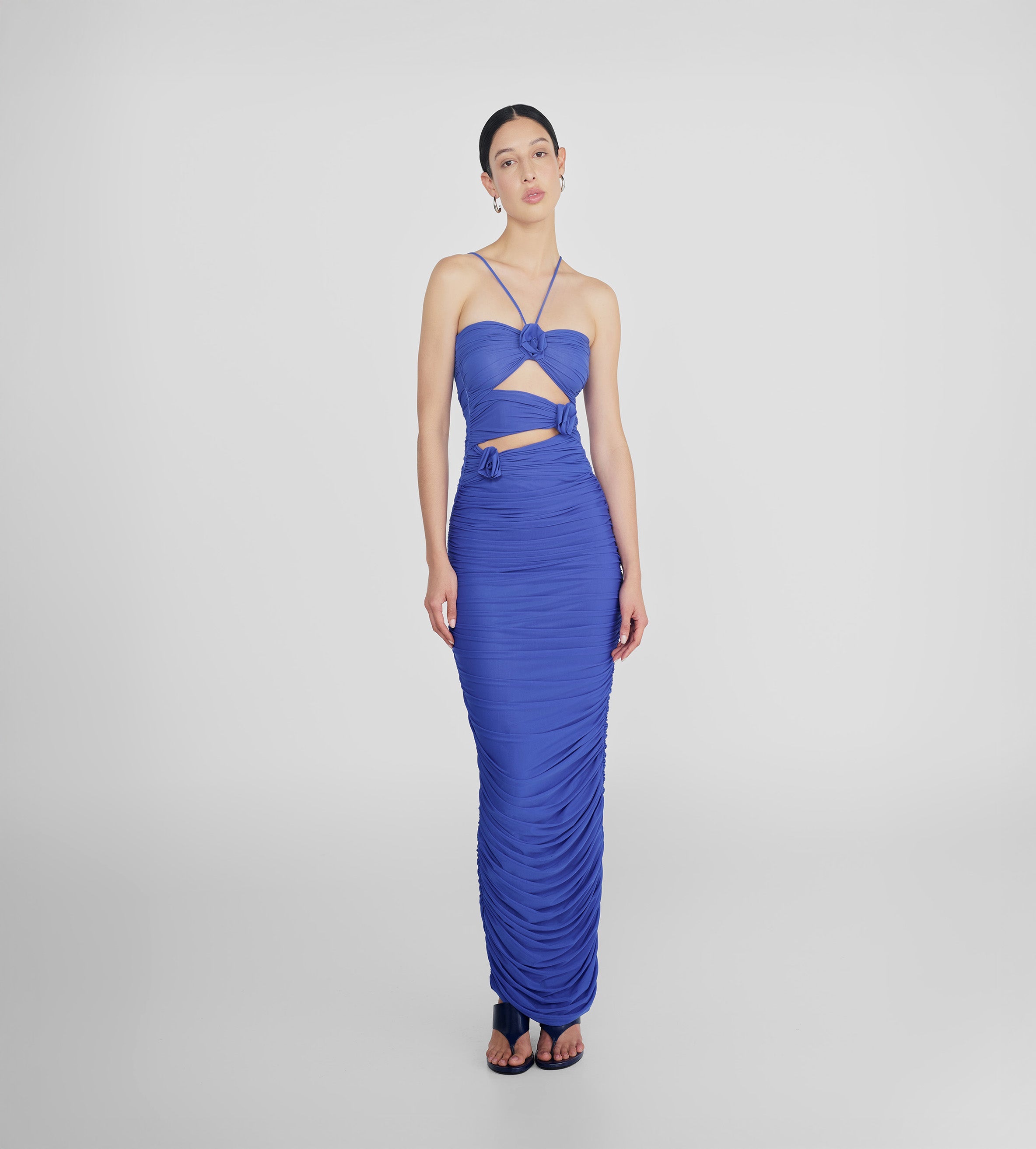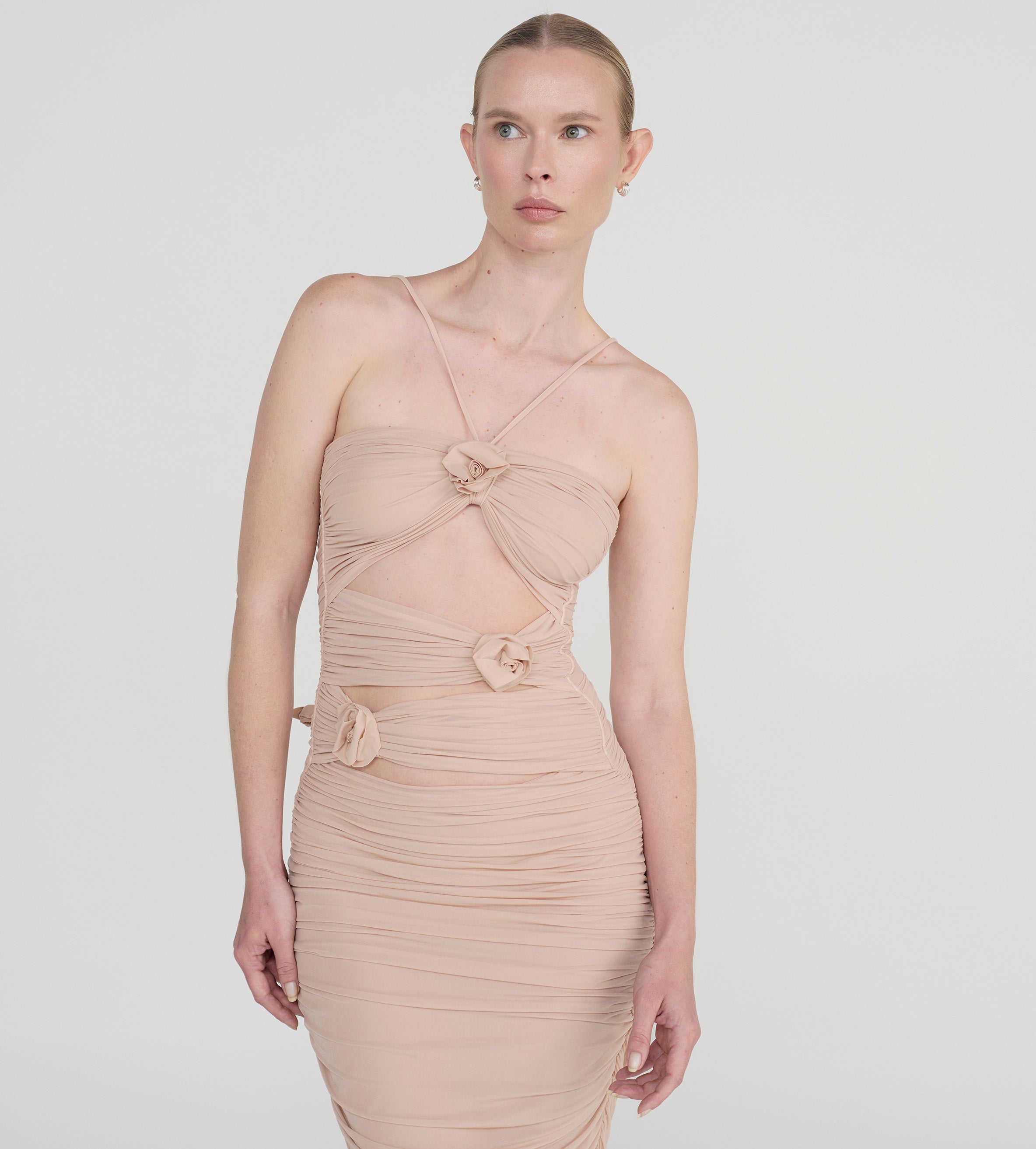 Long, straight-cut dress crafted from fully ruched stretch mesh. It features a knotted closure and asymmetrical cut-outs at the waist, adorned with three ruffled flower appliqués. The straps are embellished with our new, delicate rosebud details.