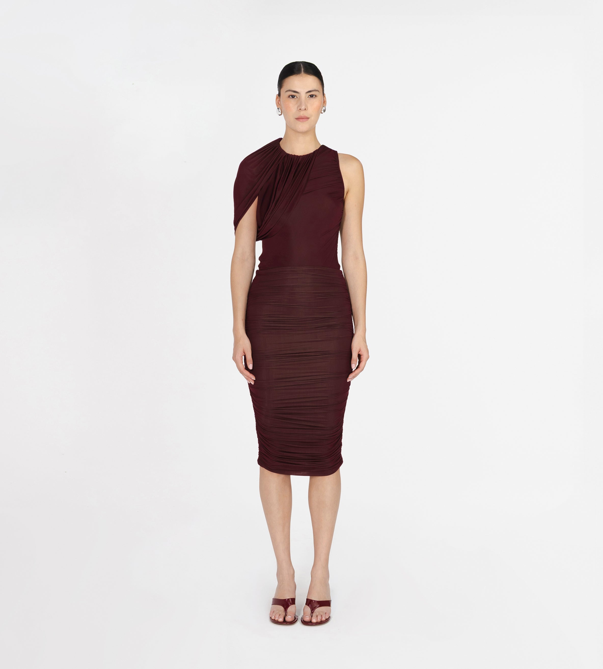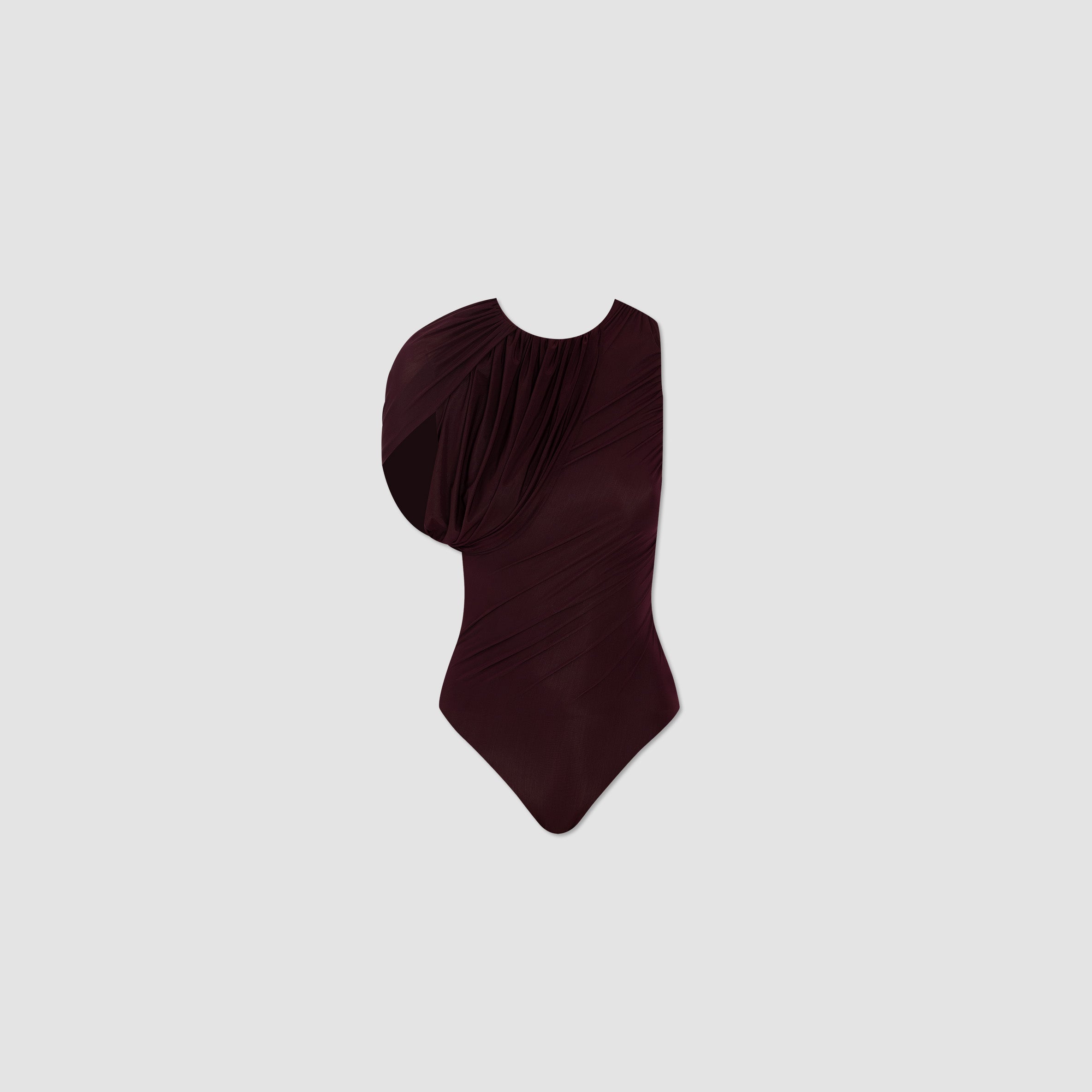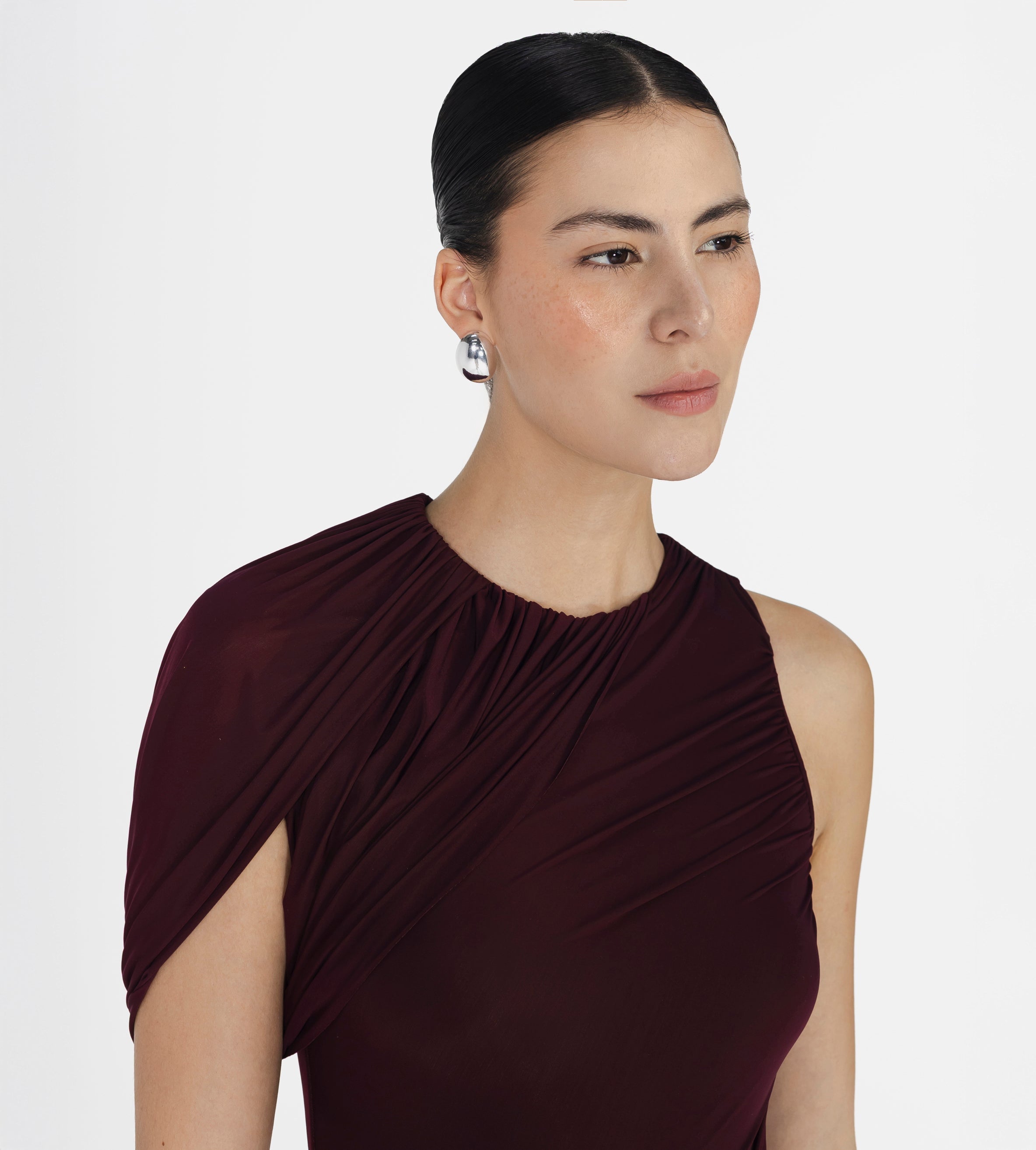 The Carlos one-piece features a round neckline and a striking twisted, draped single sleeve with versatile styling options, that flows into a diagonal ruched bodice. The gathered detailing hugs the body, enhancing the silhouette, while delicate covered buttons at the back add a refined finishing touch.