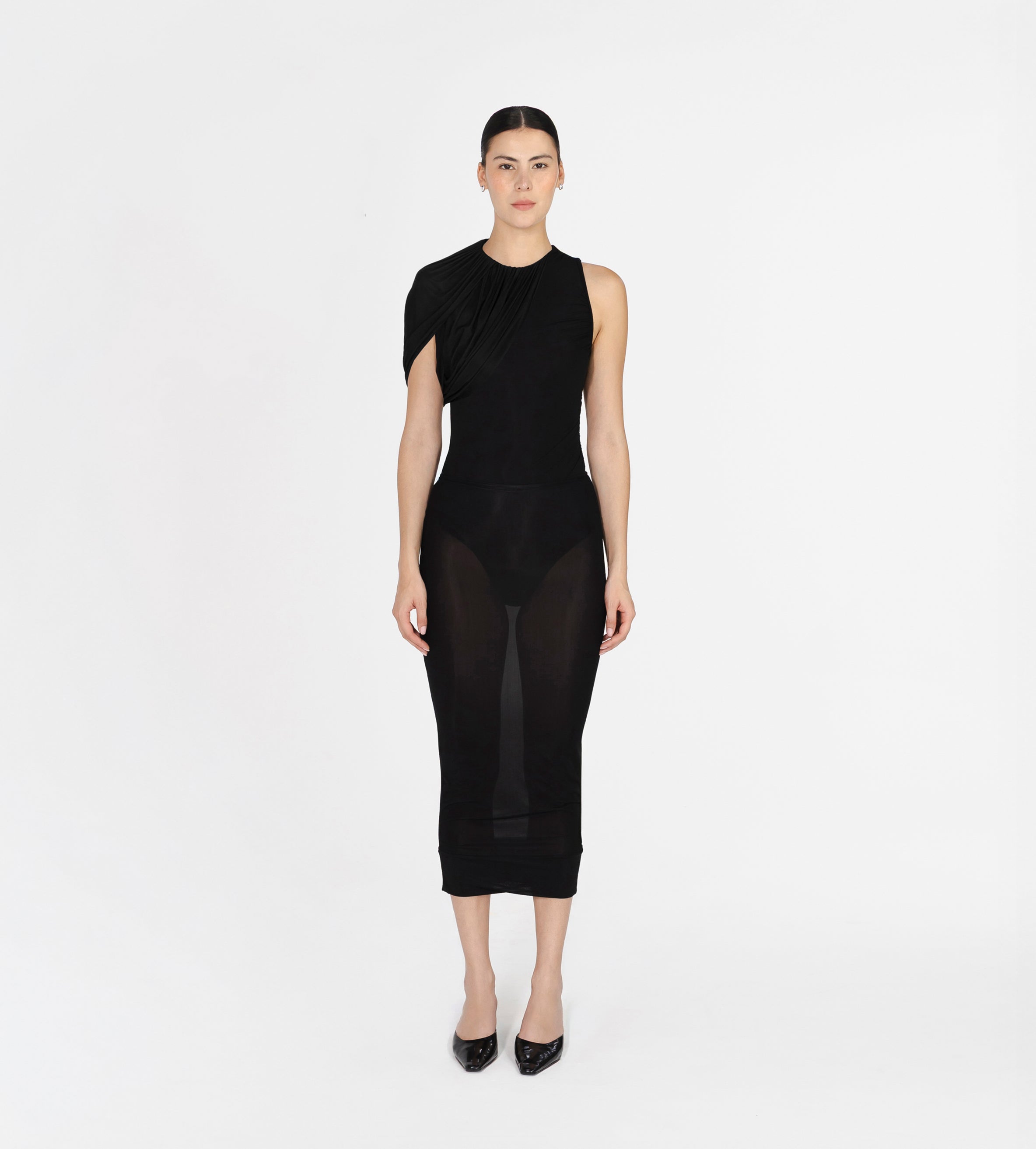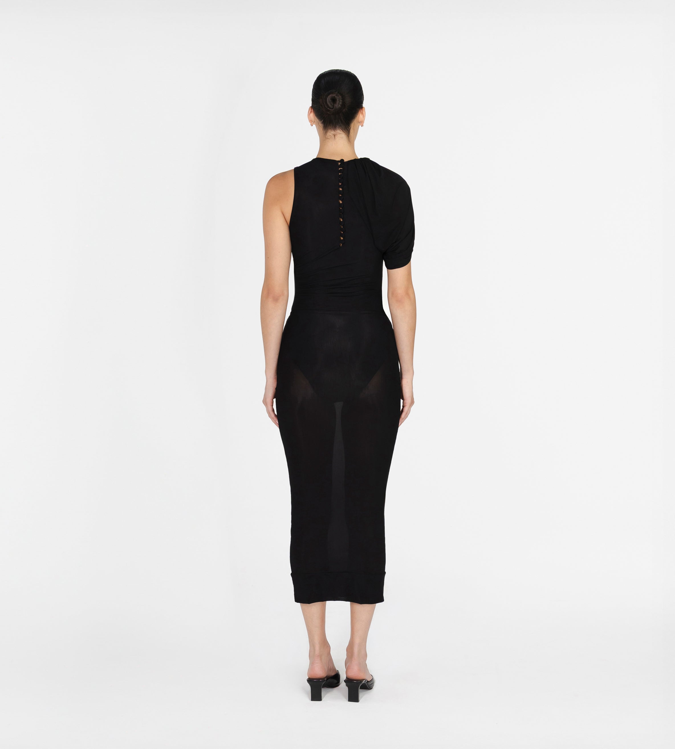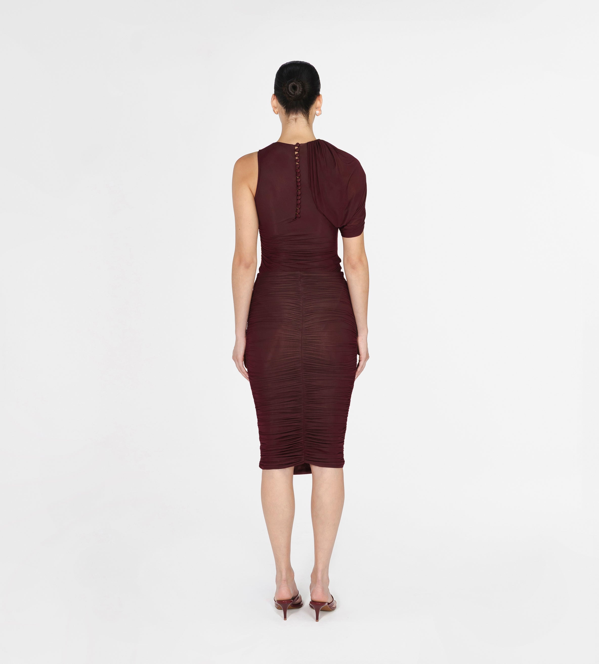 The Carlos one-piece features a round neckline and a striking twisted, draped single sleeve with versatile styling options, that flows into a diagonal ruched bodice. The gathered detailing hugs the body, enhancing the silhouette, while delicate covered buttons at the back add a refined finishing touch.