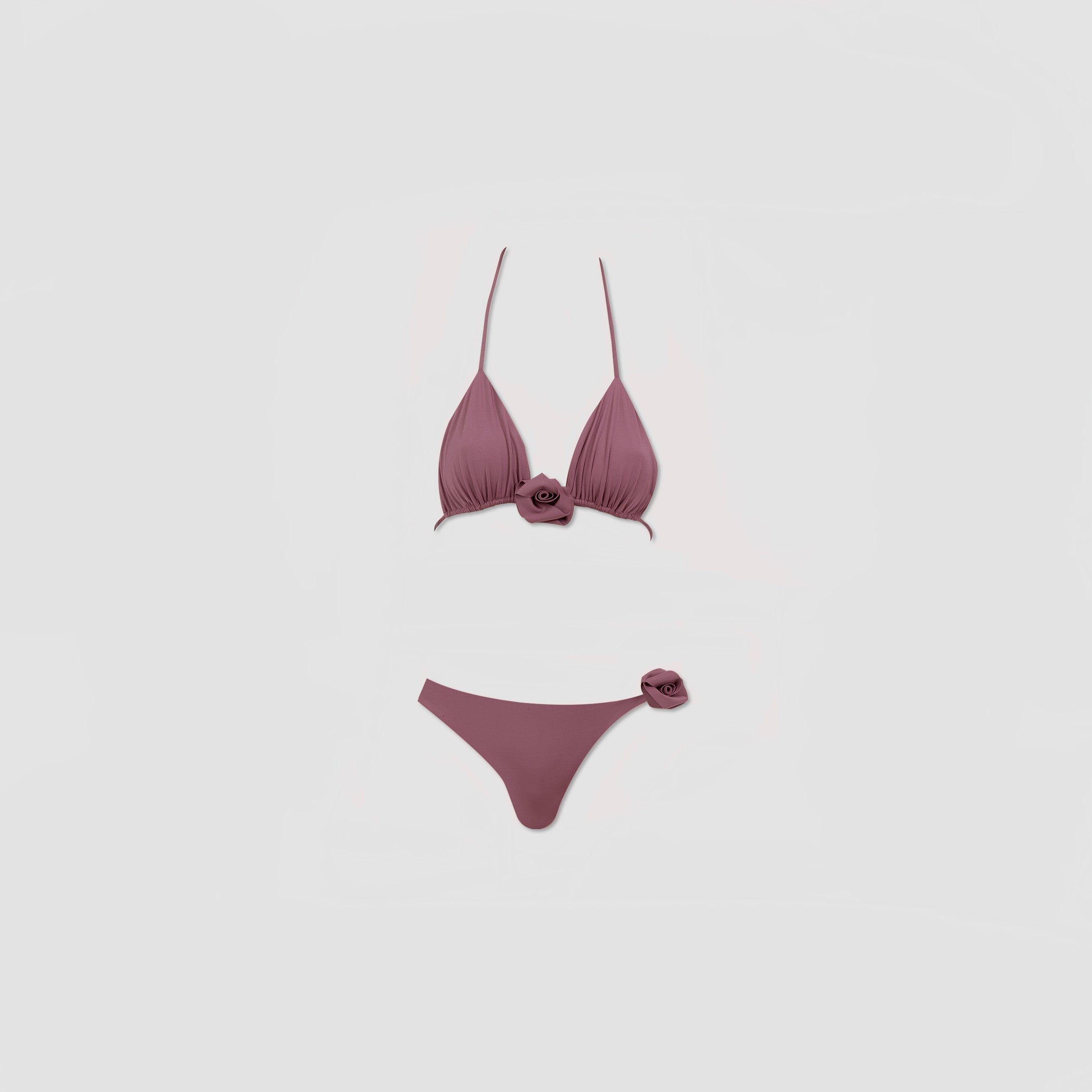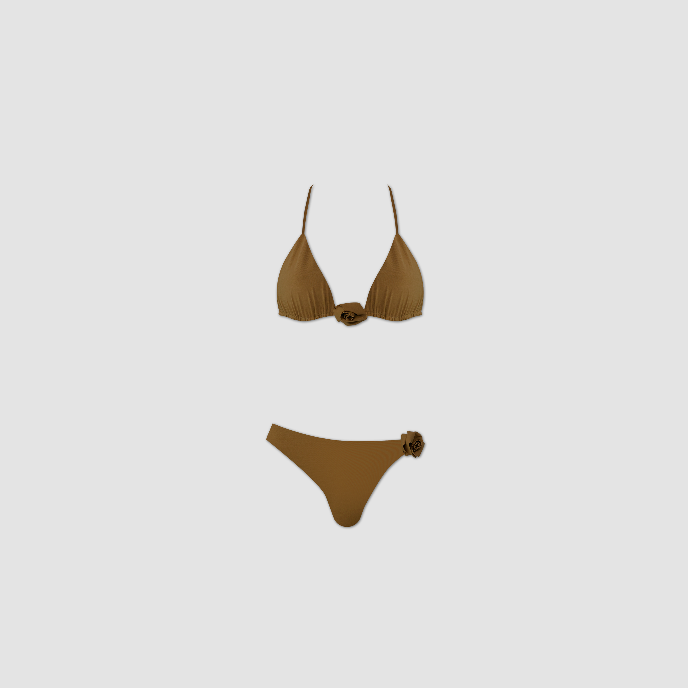 Our Chipi two-piece features a triangle top with delicate straps that tie at the back. The design is accentuated by our new 3D floral embellishment at center front. Paired with low-rise, cheeky bottoms, this asymmetric design is beautifully finished with a sensual 3D floral detail.