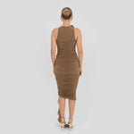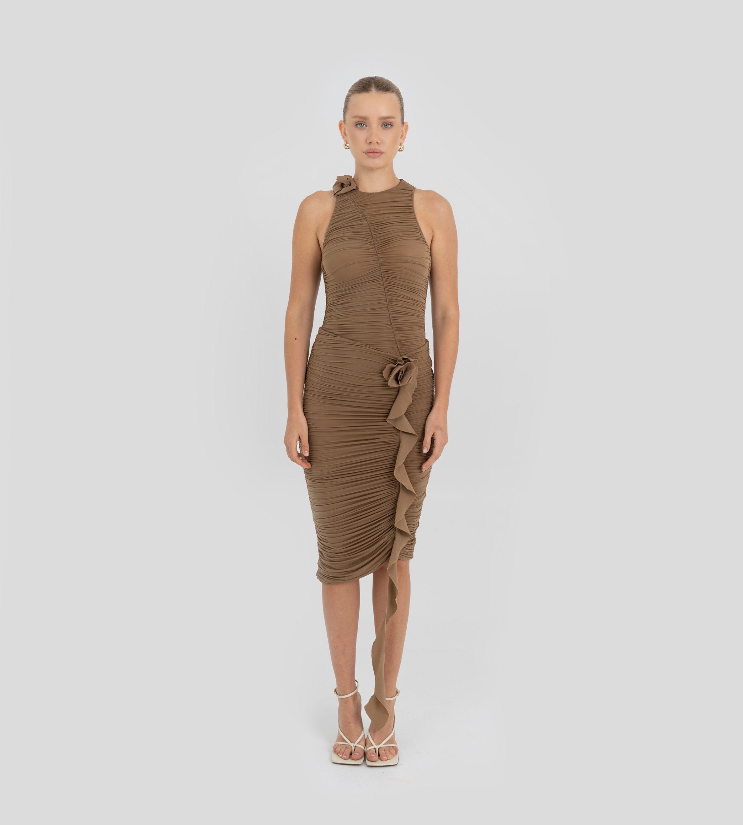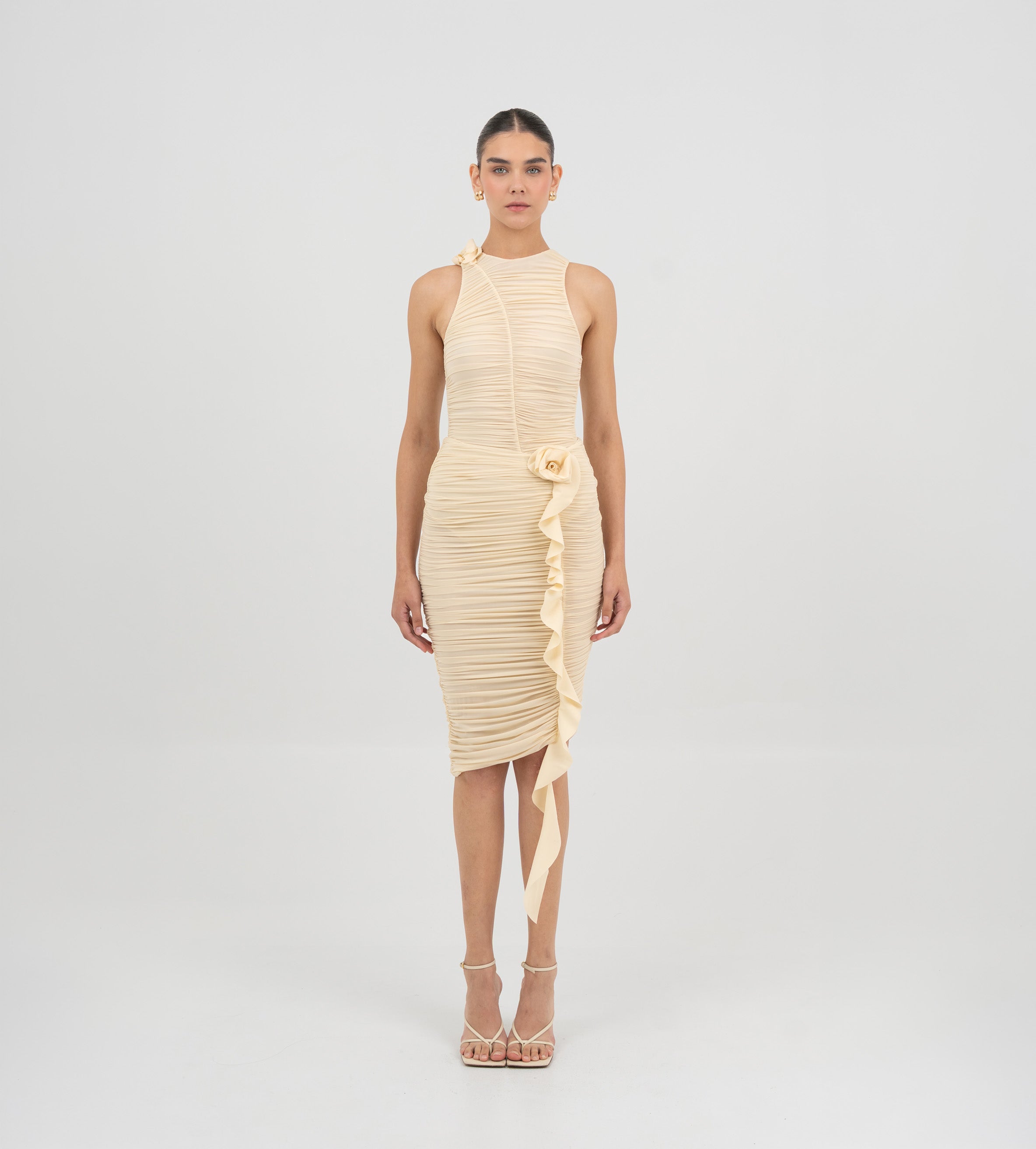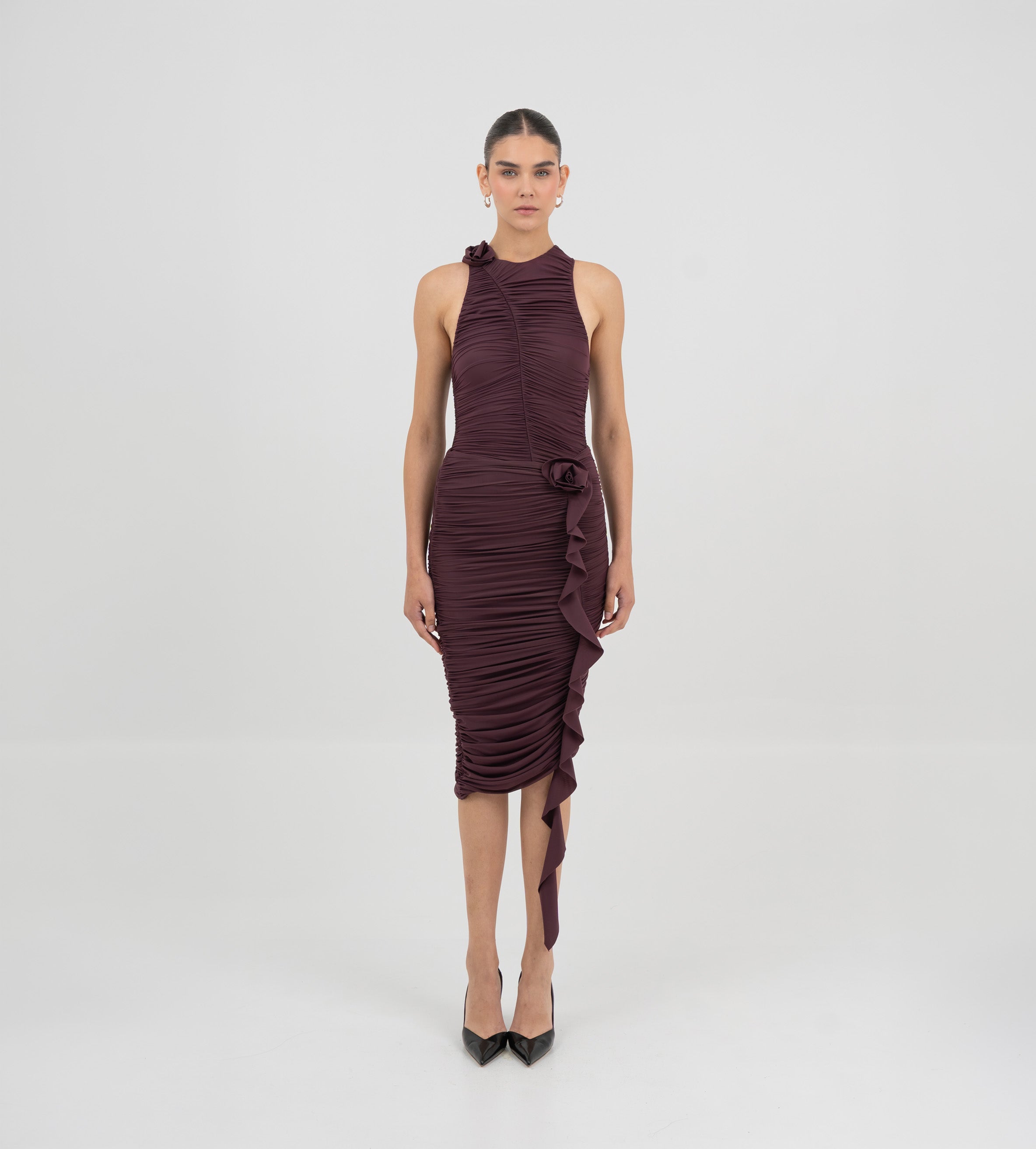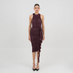 is finished with a fully horizontal draping and asymmetric hem, creating a