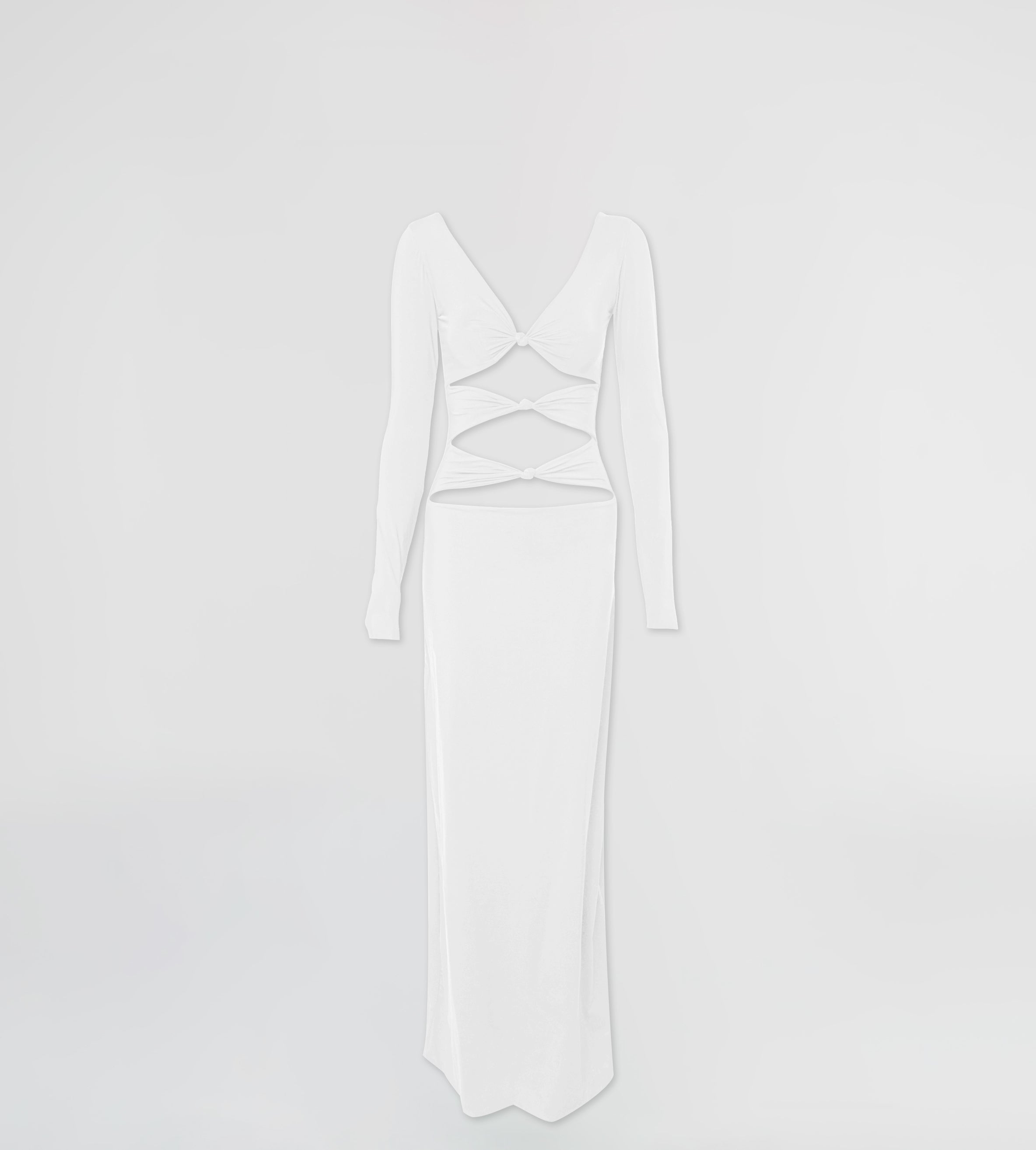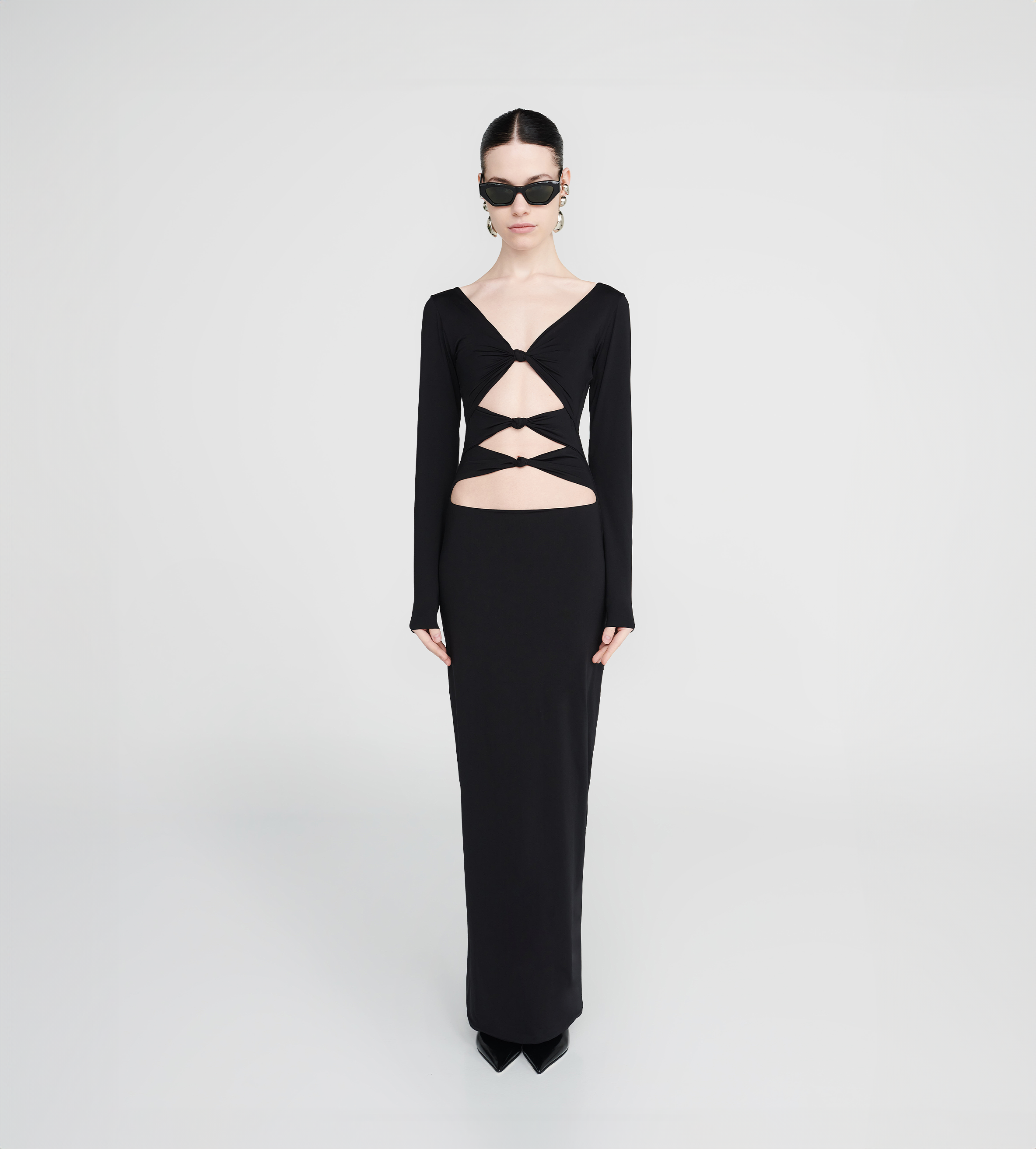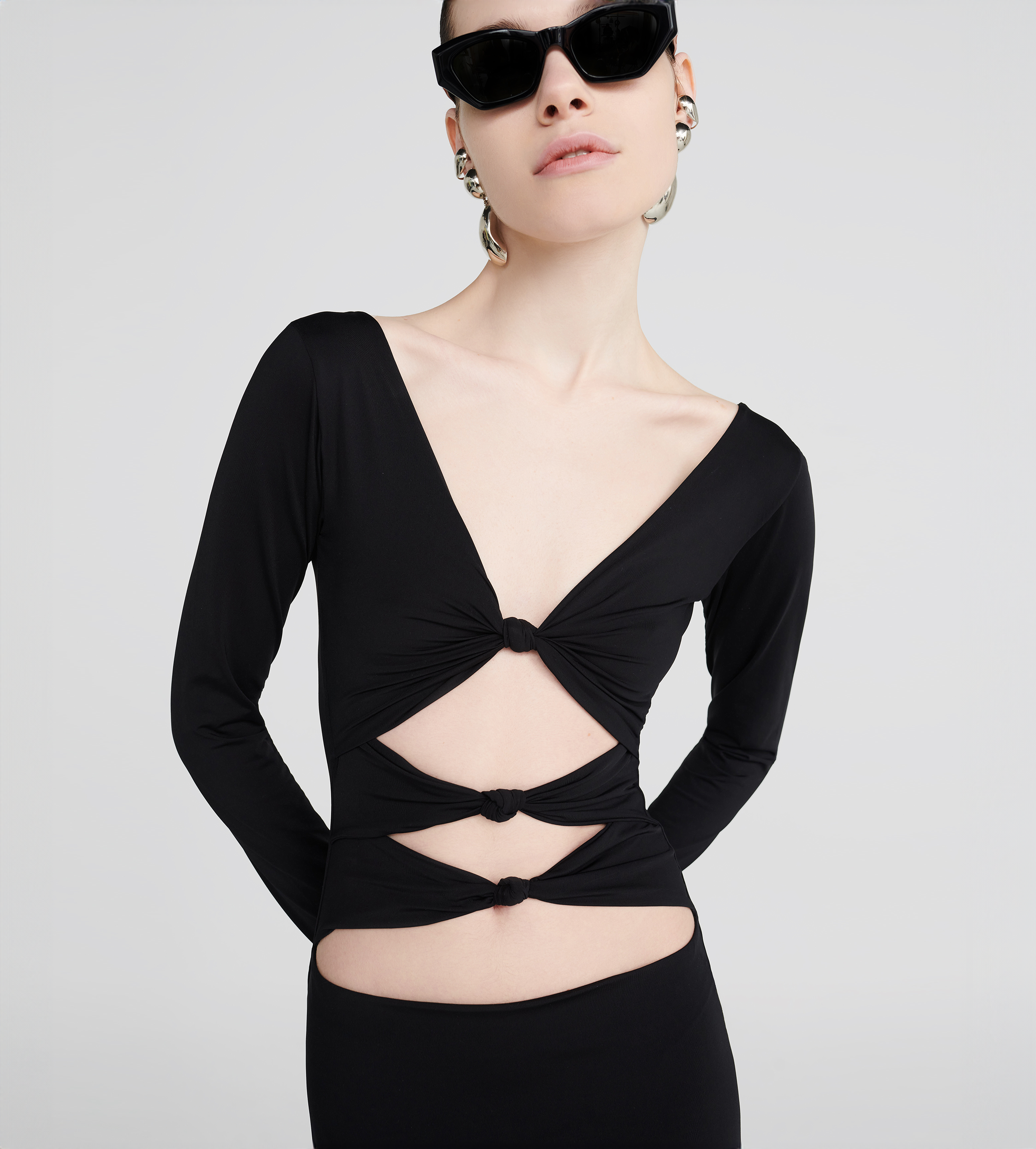 Bodycon dress with a triangular neckline, long sleeves and asymmetric openings with knot details.