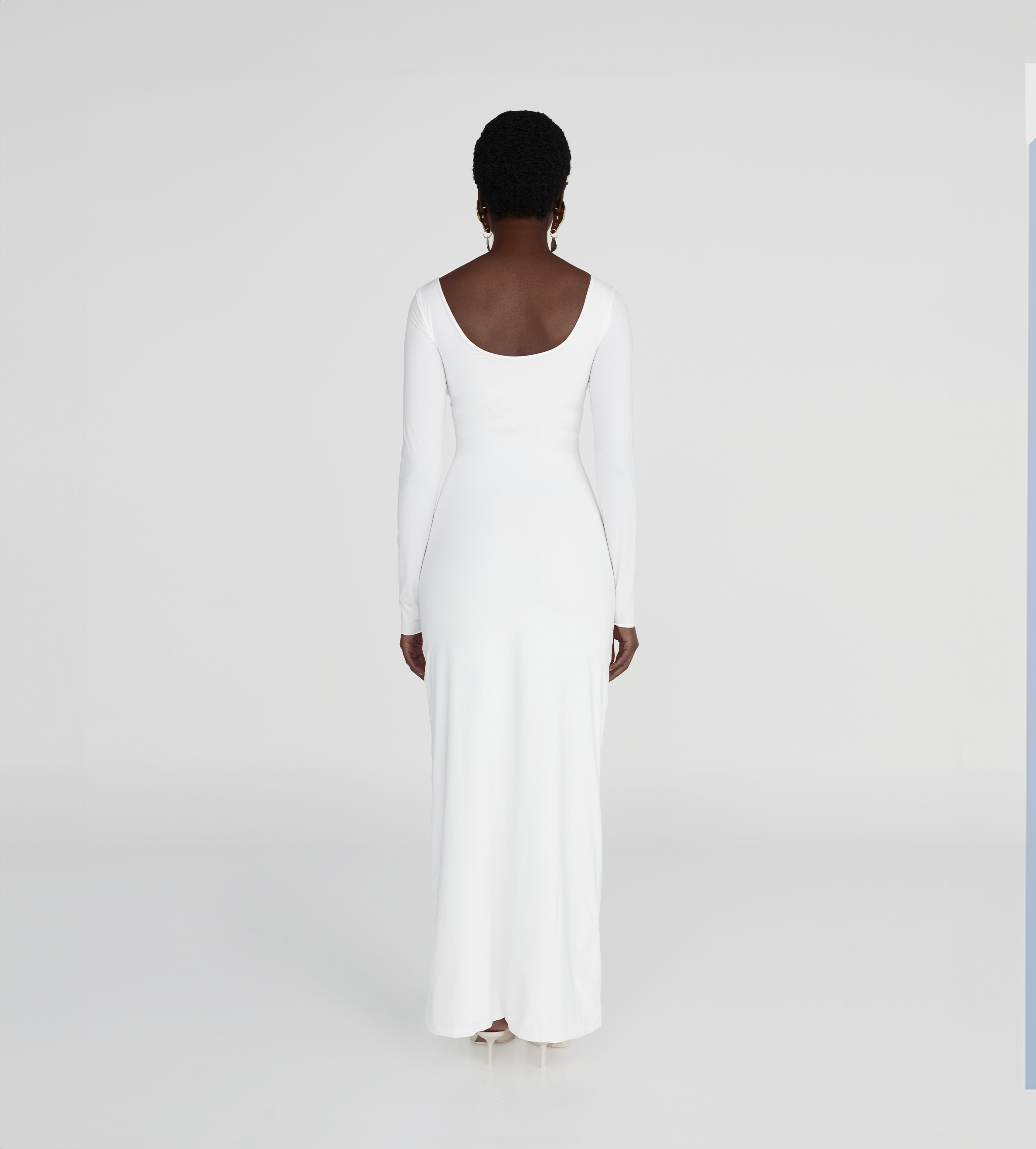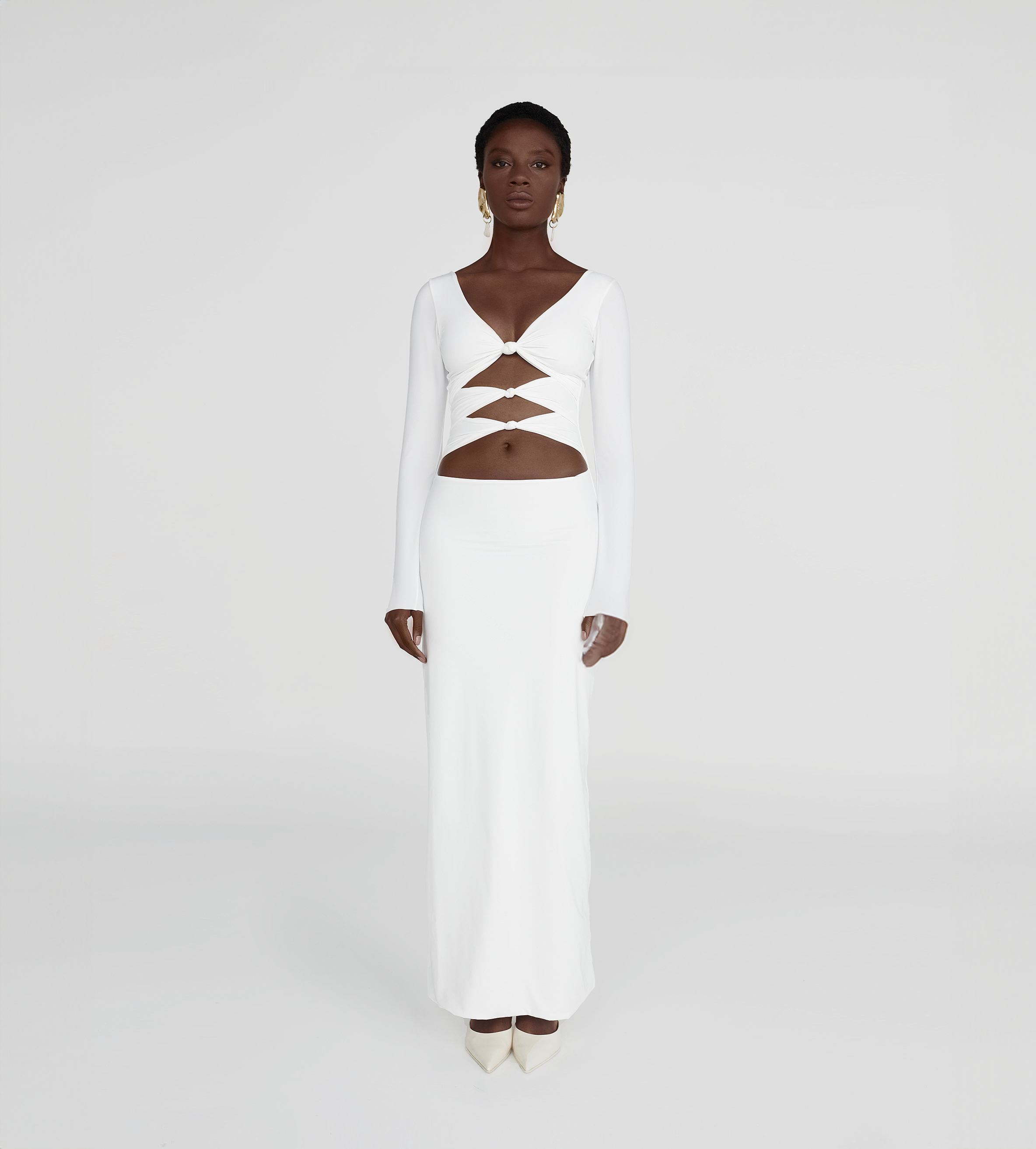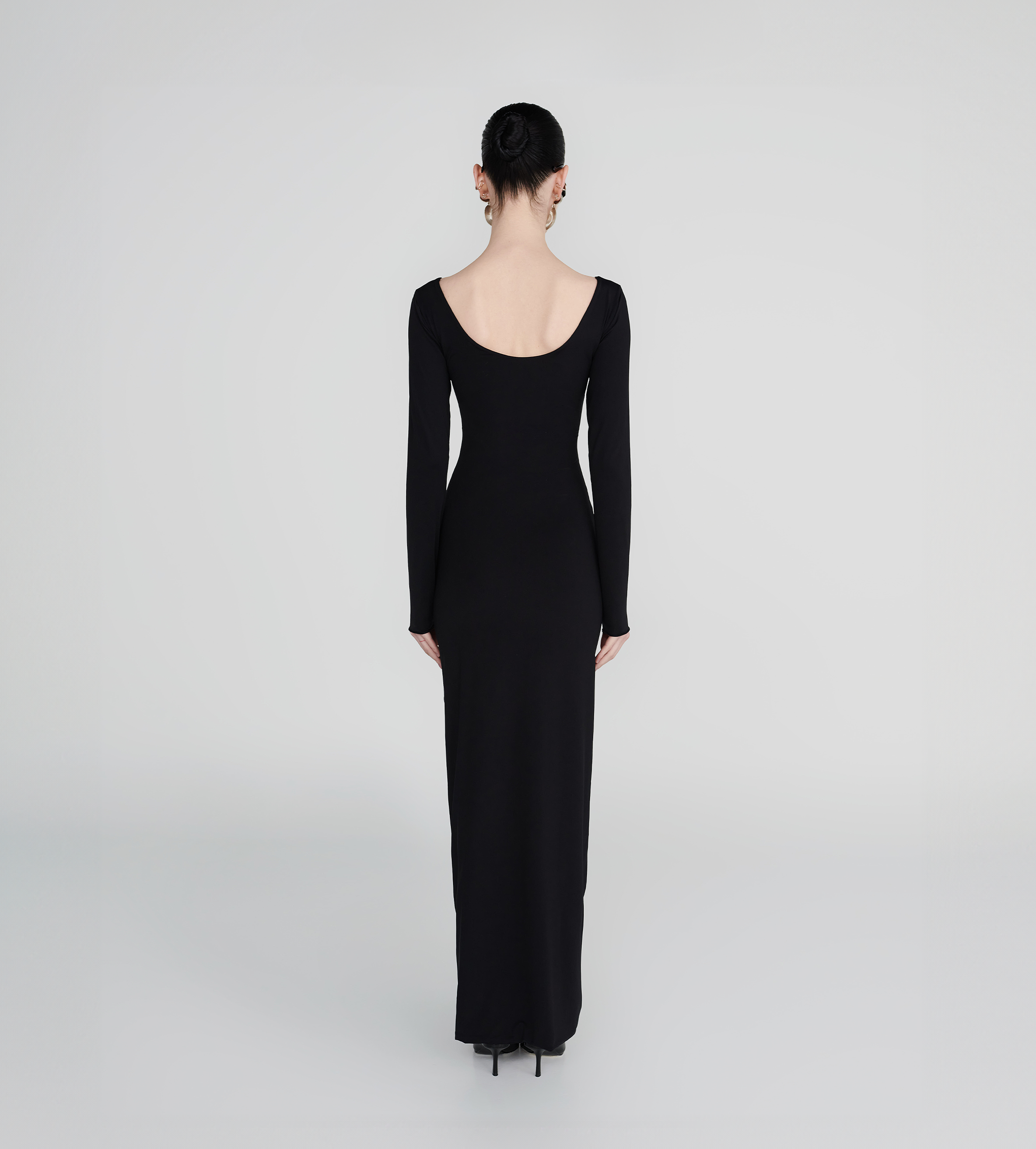 Bodycon dress with a triangular neckline, long sleeves and asymmetric openings with knot details.