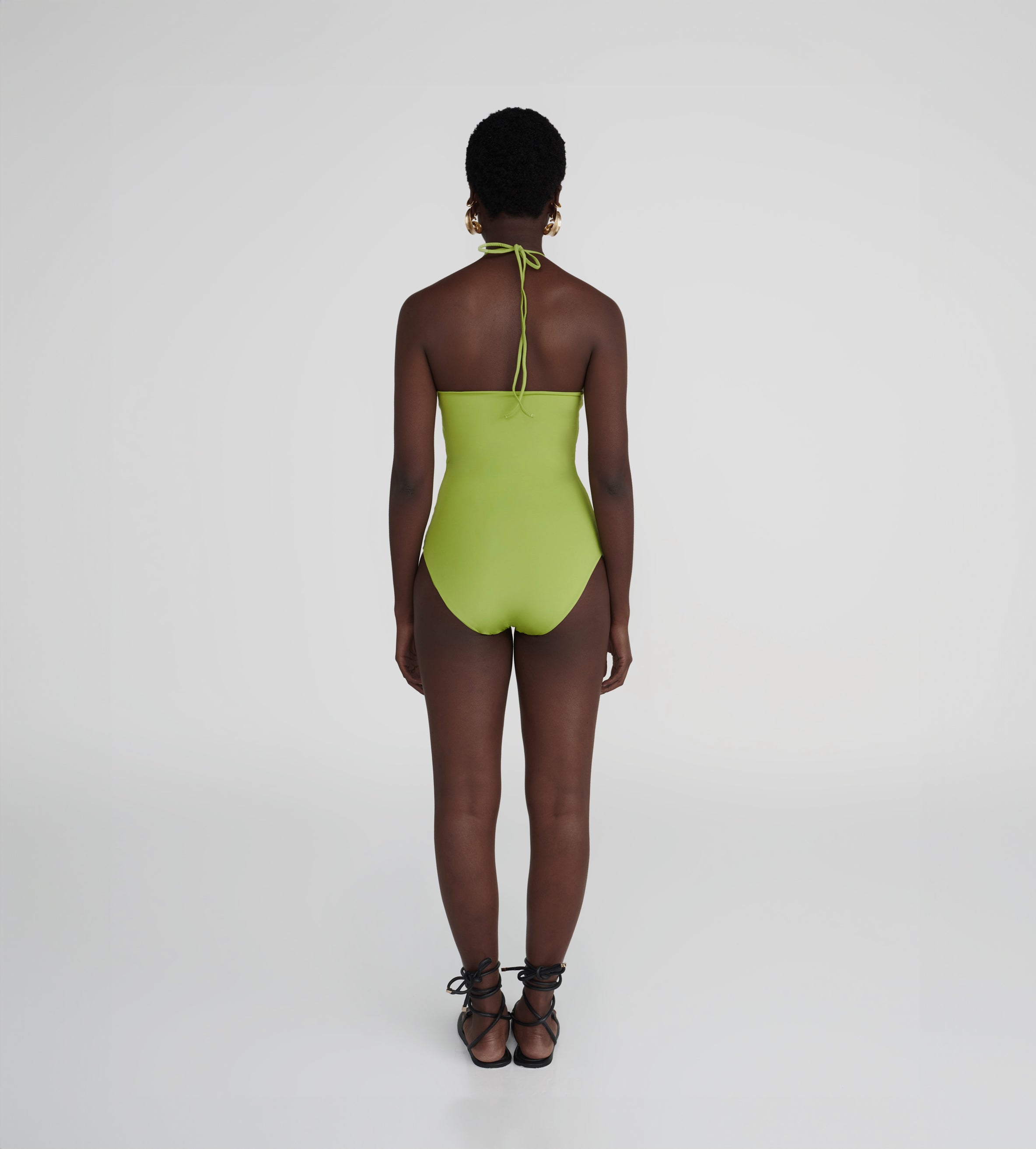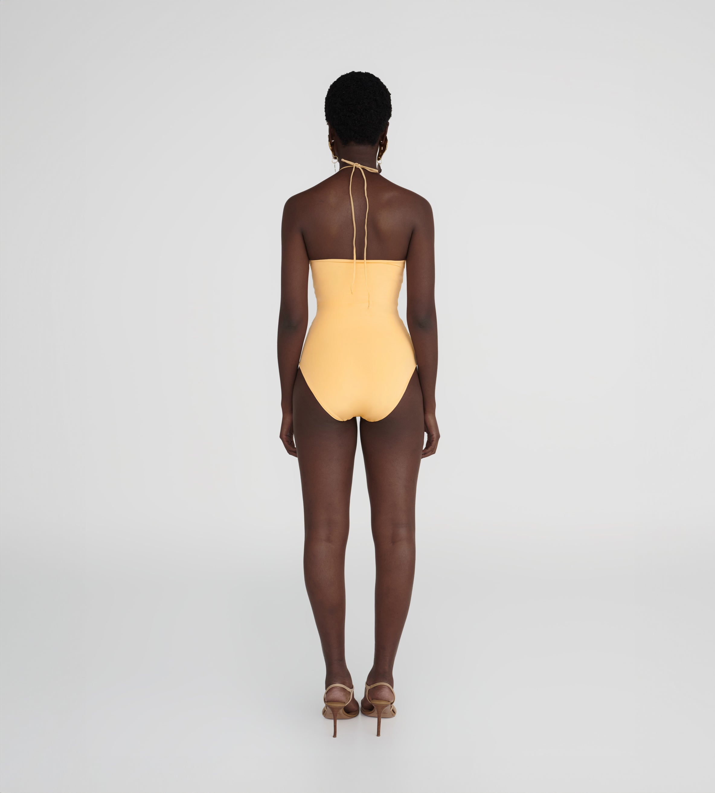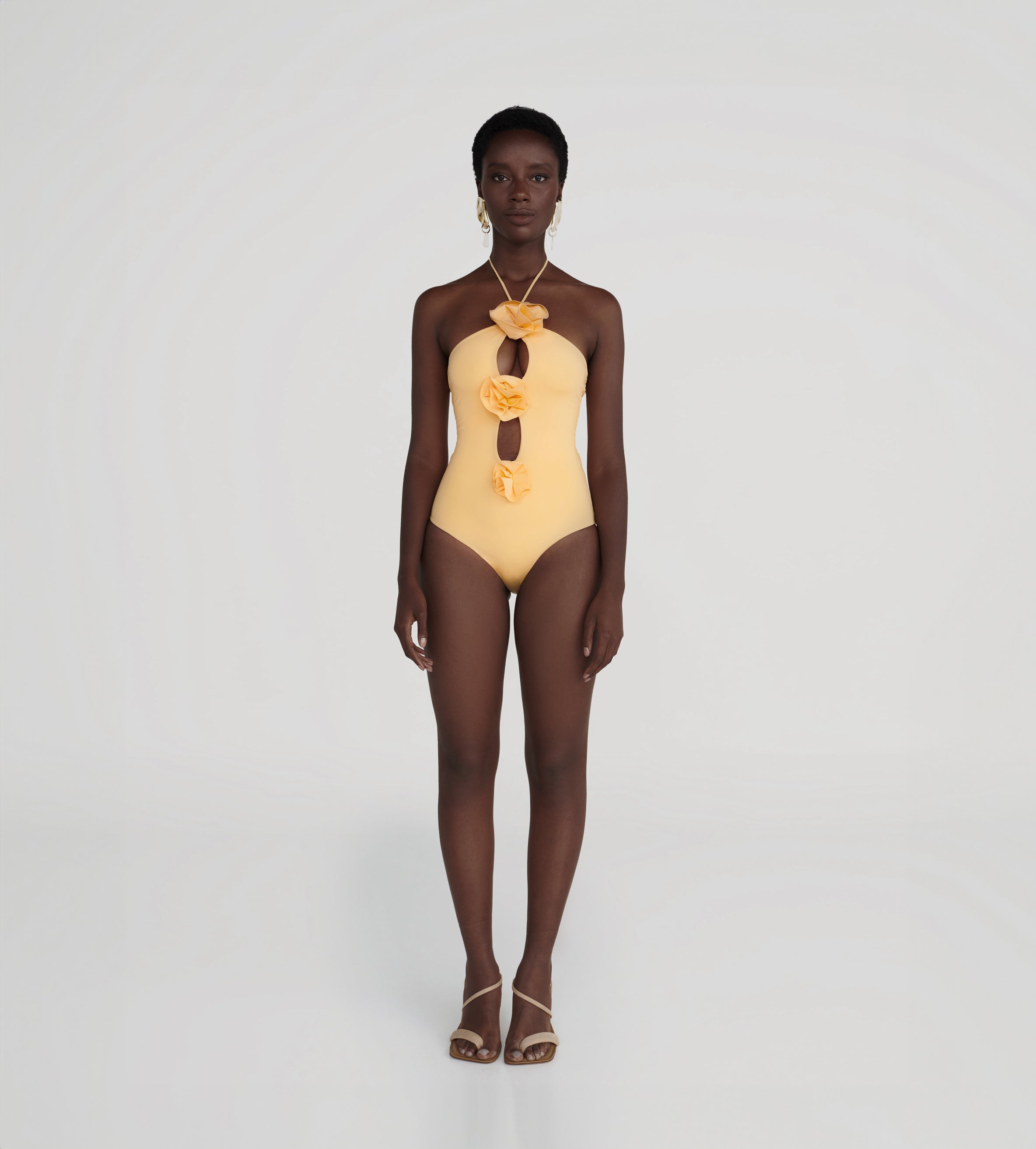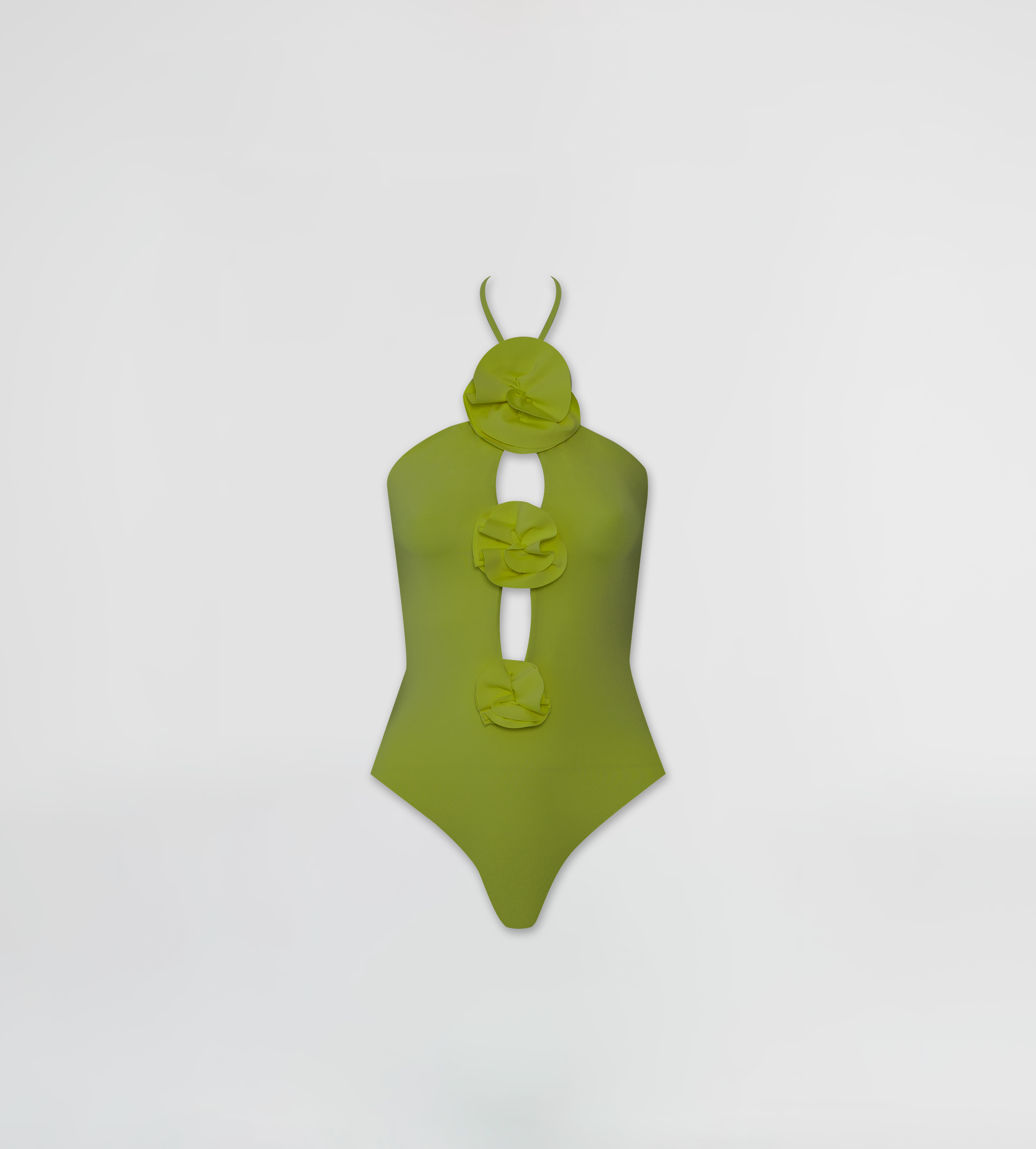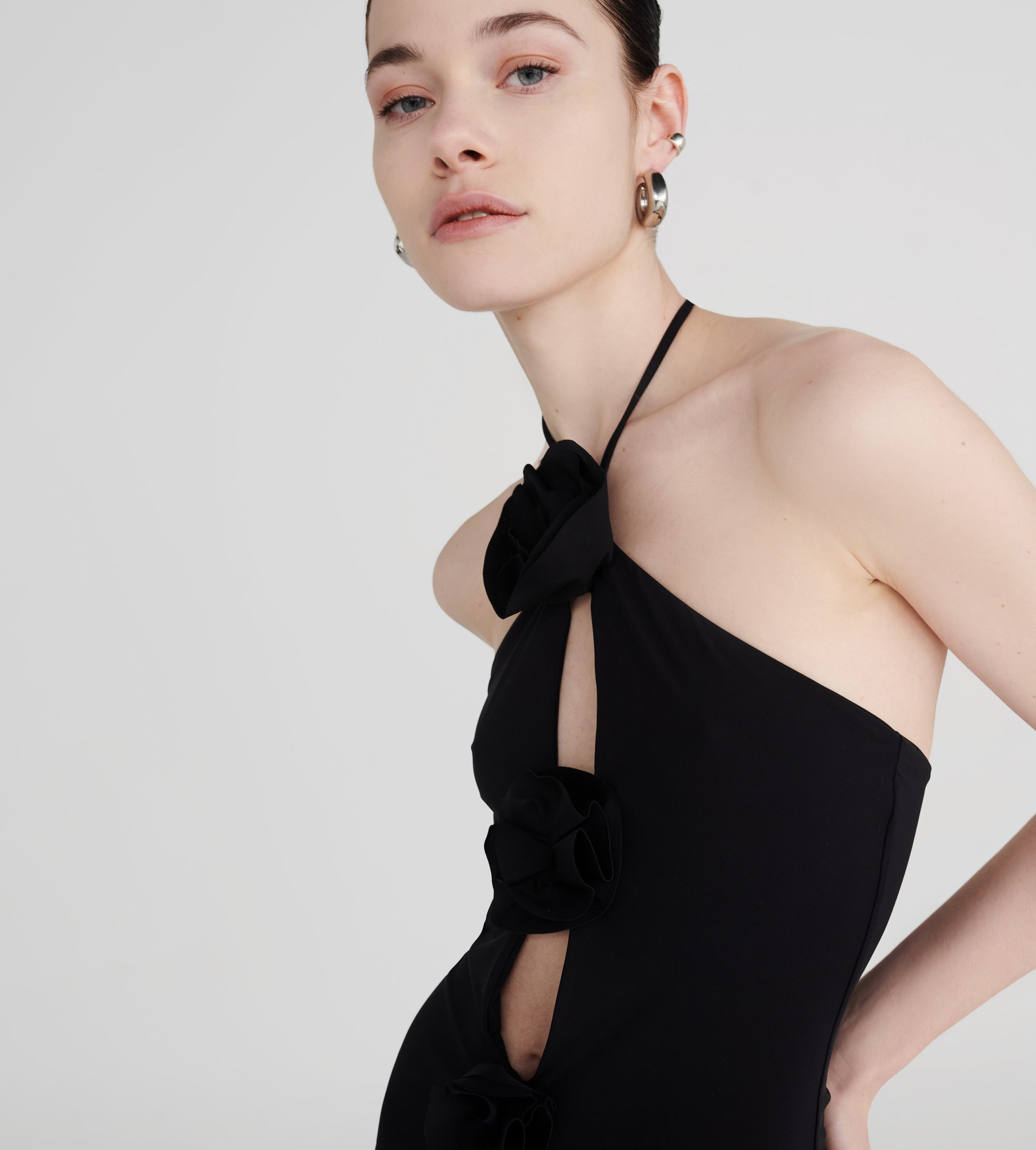 Halter neckline one-piece with center front peekaboo cutouts and an array of three handmade 3D flowers in different sizes, the perfect combination for this daring statement piece.