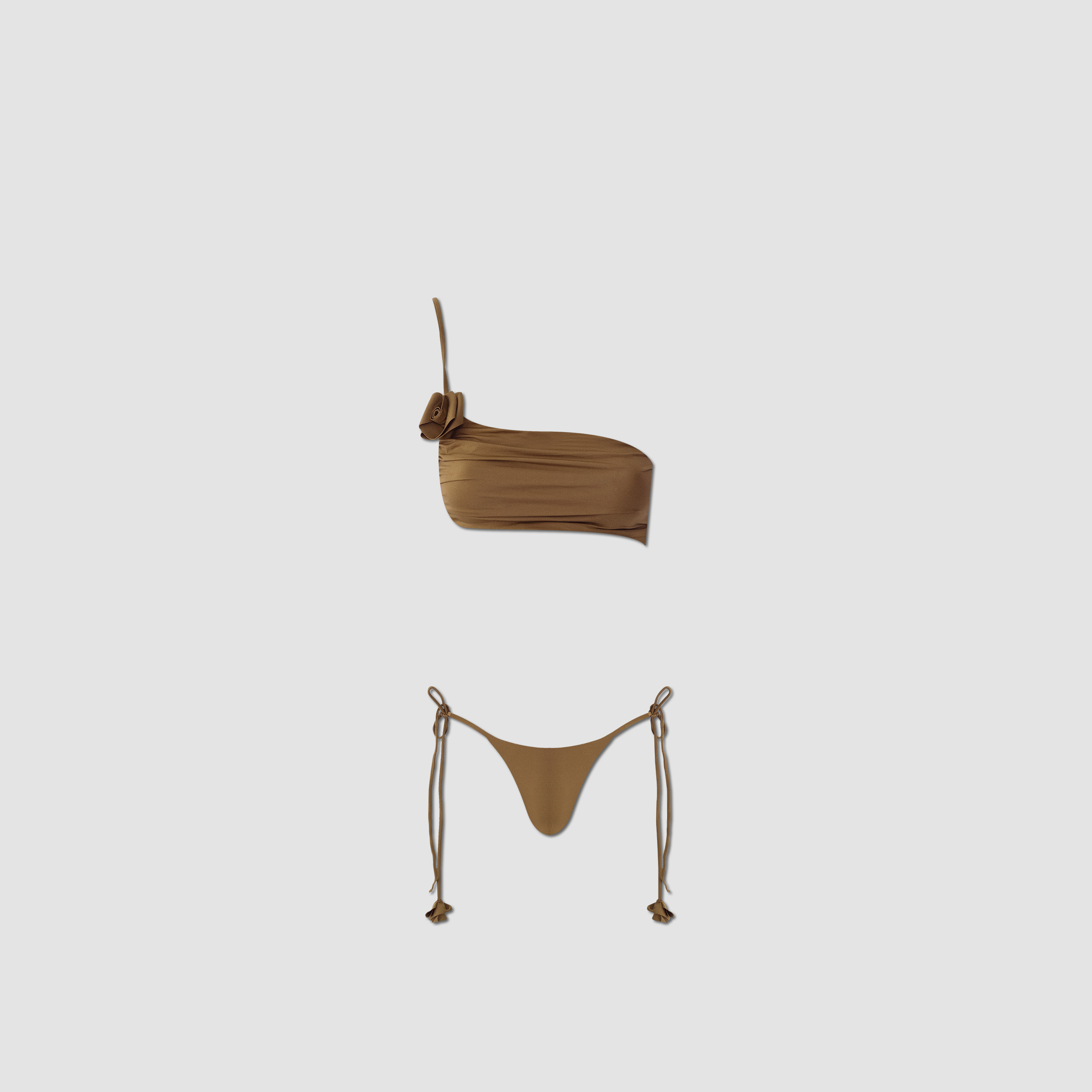 The Grau two-piece features a one-shoulder top with soft side ruching, a delicate thin strap, and an iconic lateral 3D flower detail. Paired with low-rise bottoms with side ties, adorned with our new tiny rosebud accents.