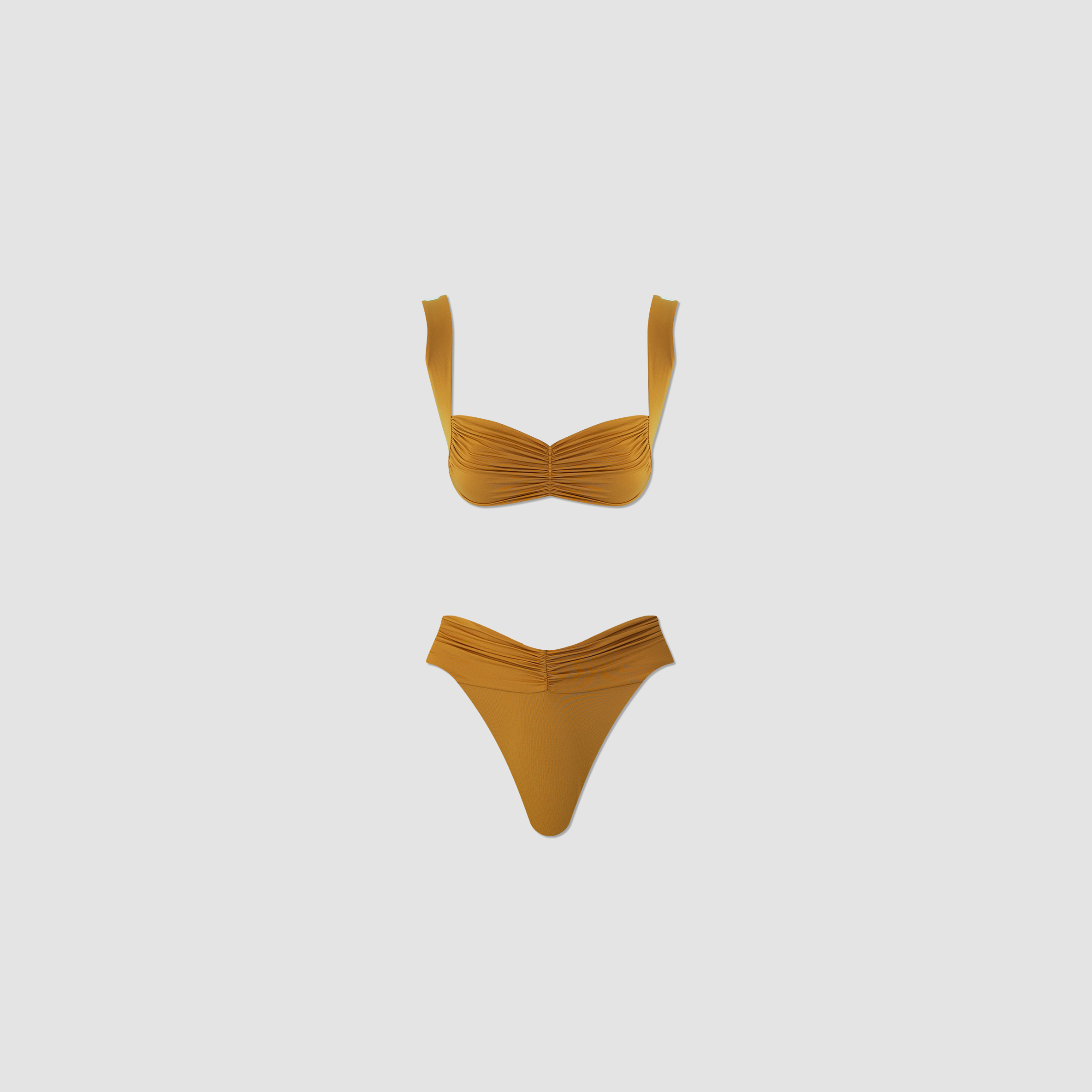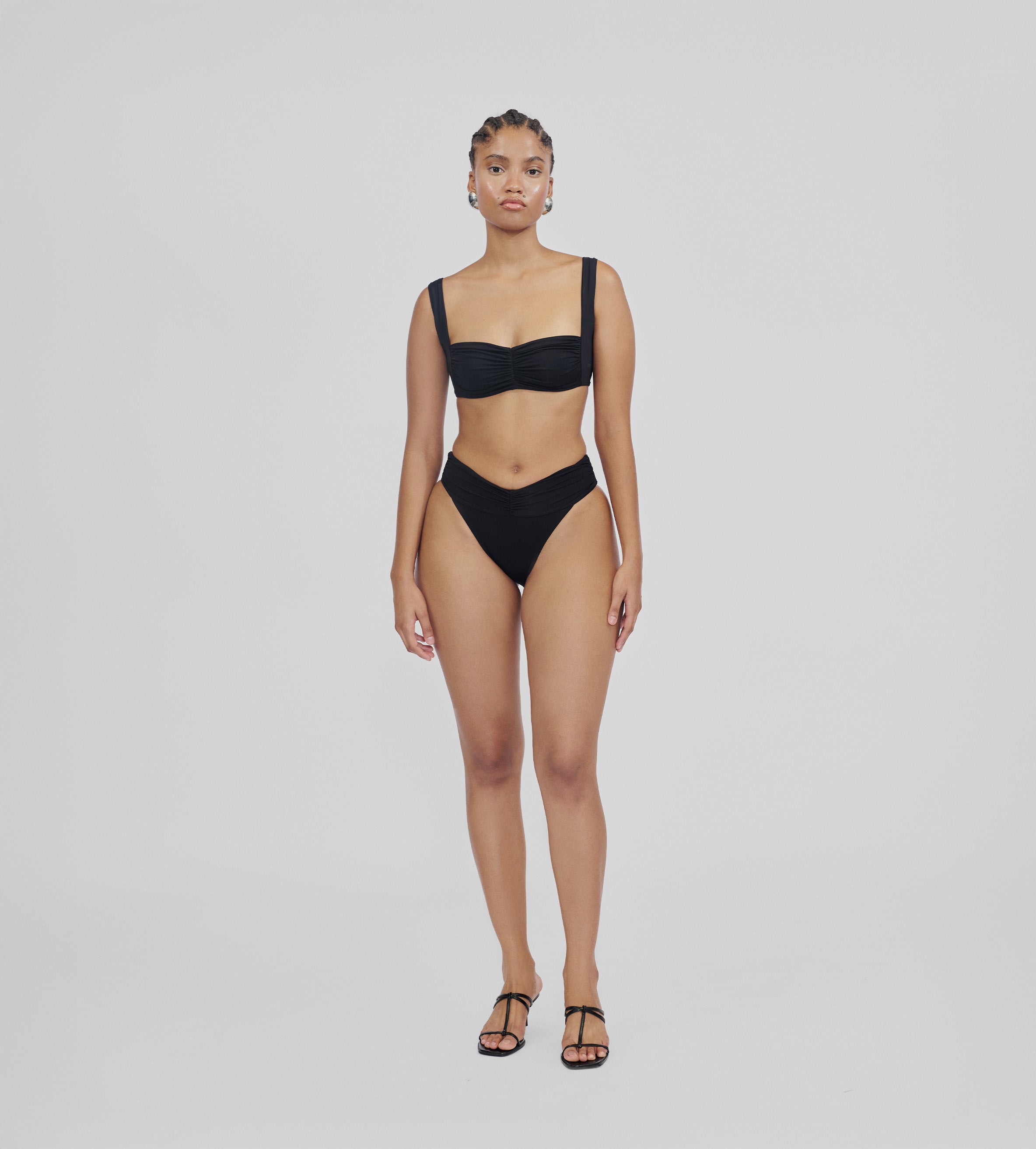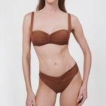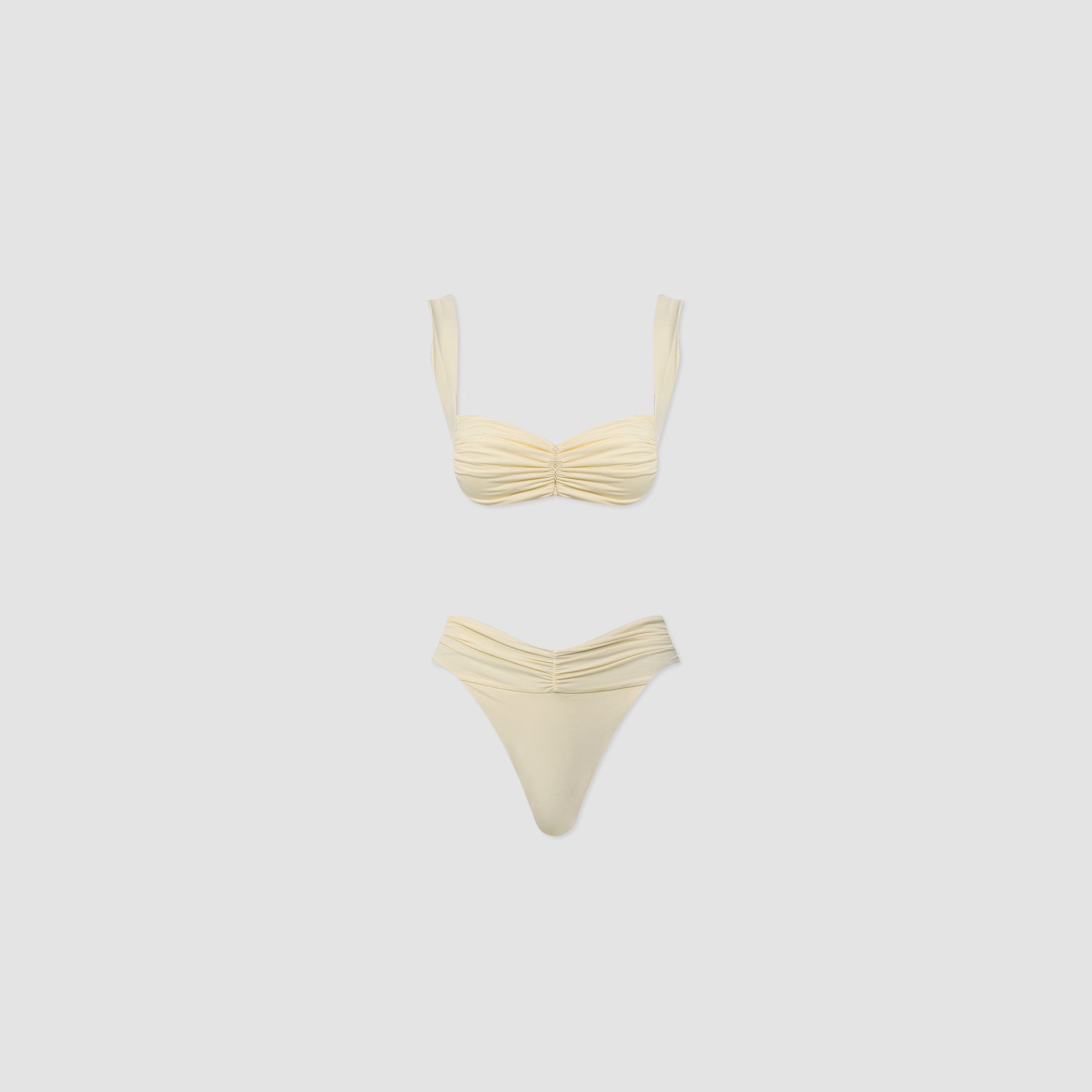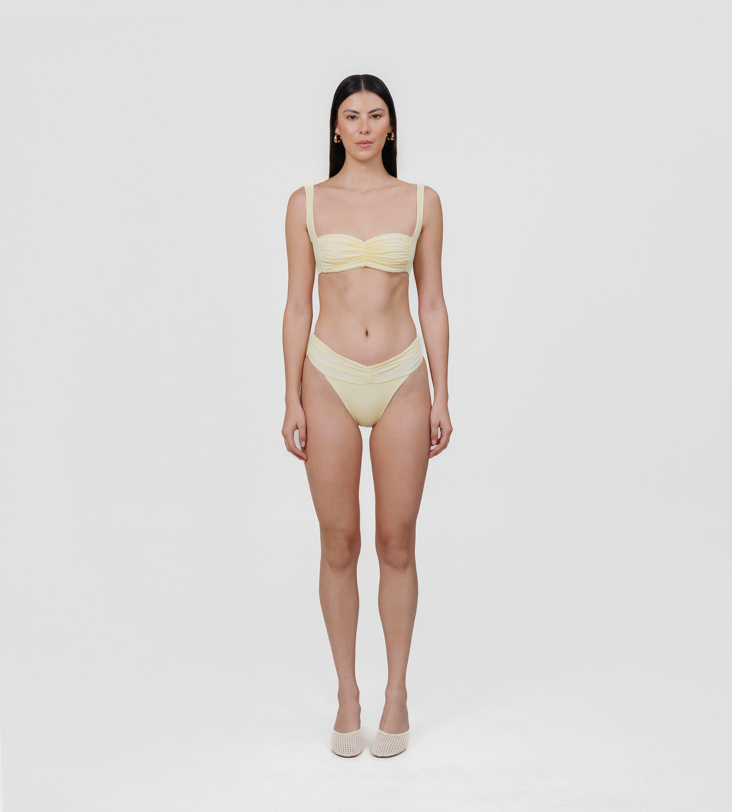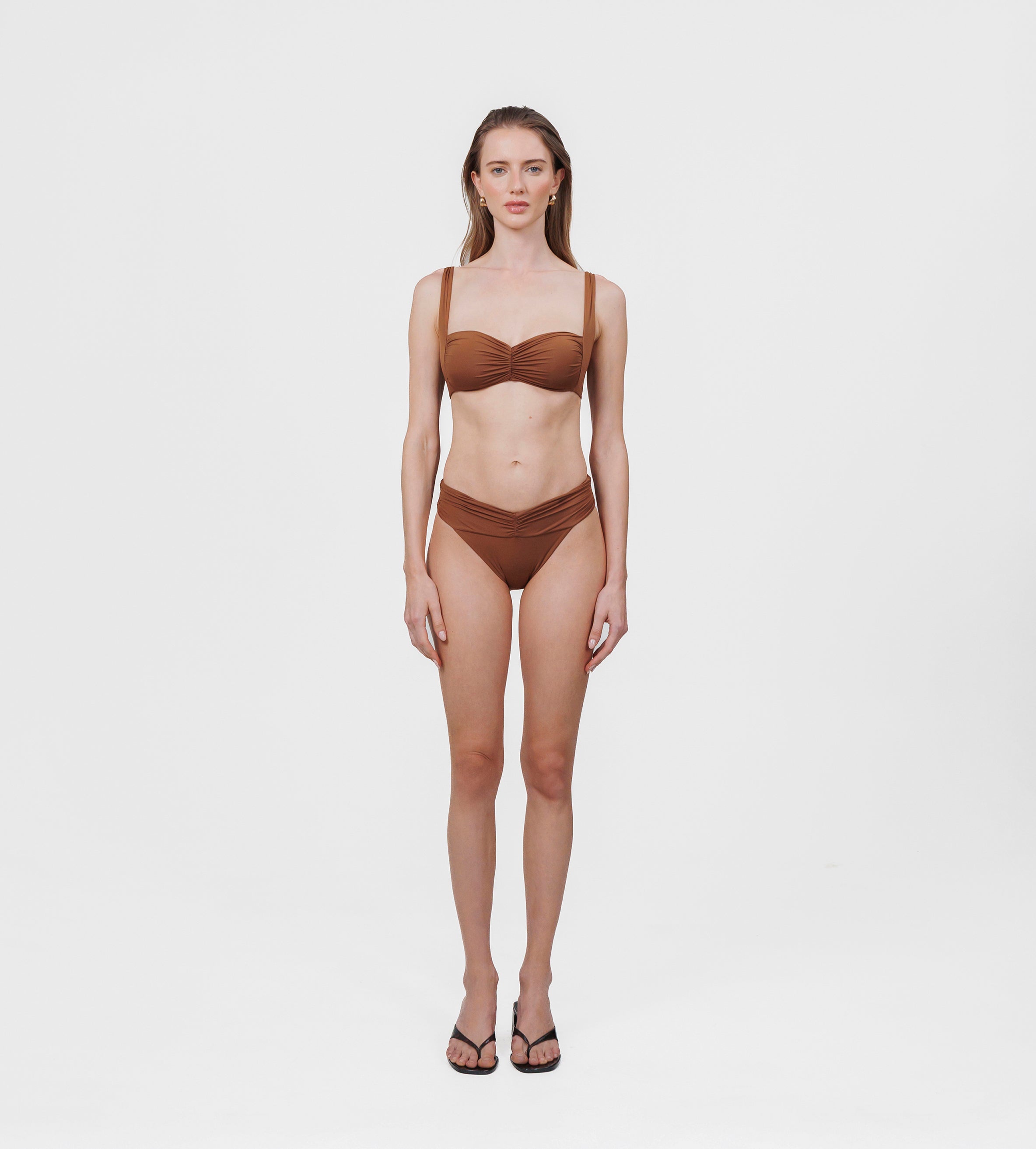 The Guandú two-piece features a top with a soft, heart-shaped ruched detail at the center, enhanced by wide straps for a comfortable and flattering fit. Paired with high-rise briefs that showcase a chic ruched detail at the front.