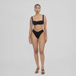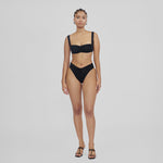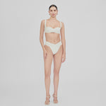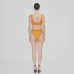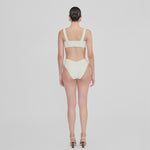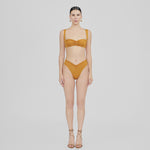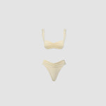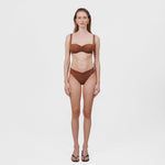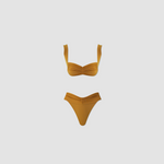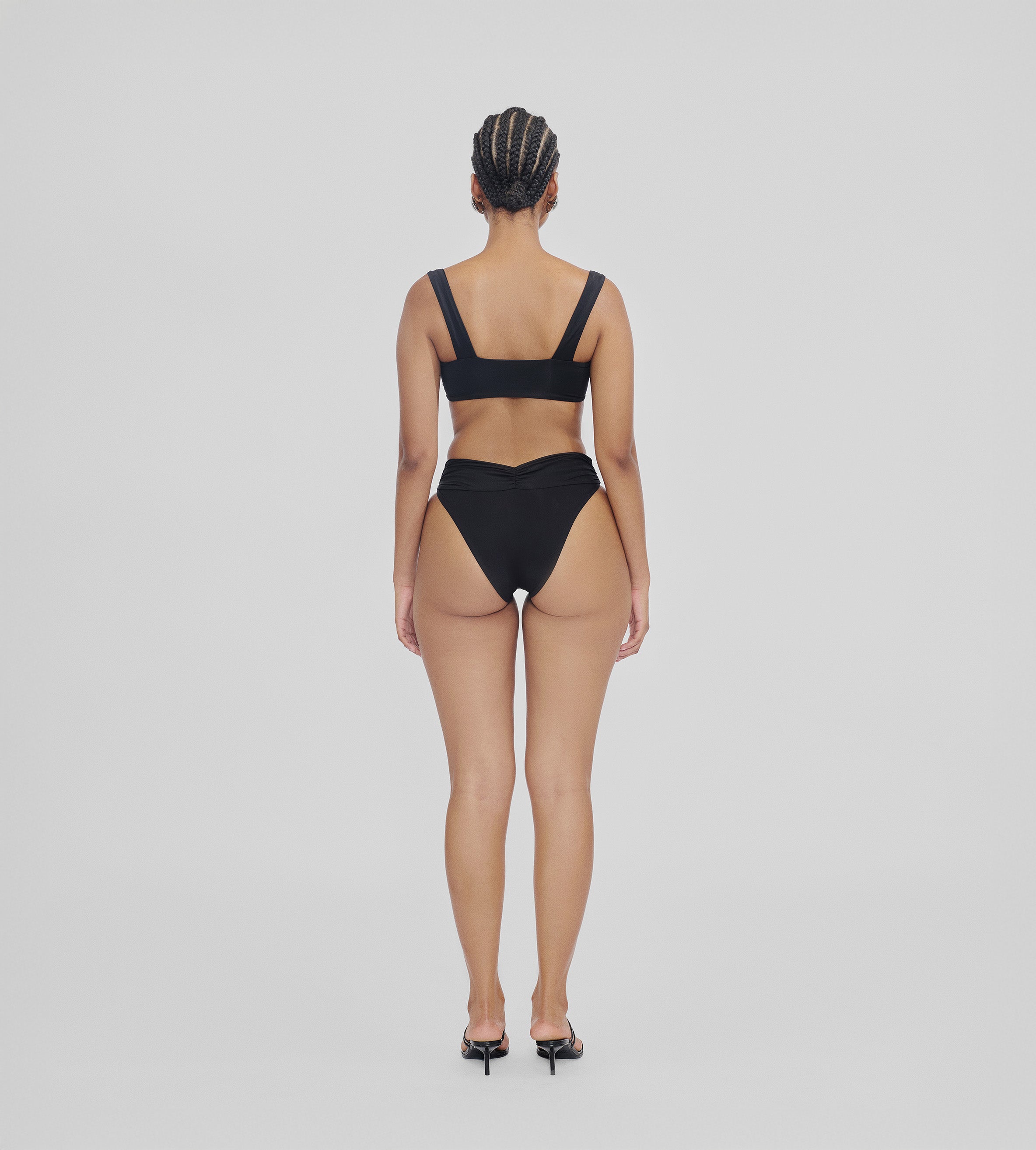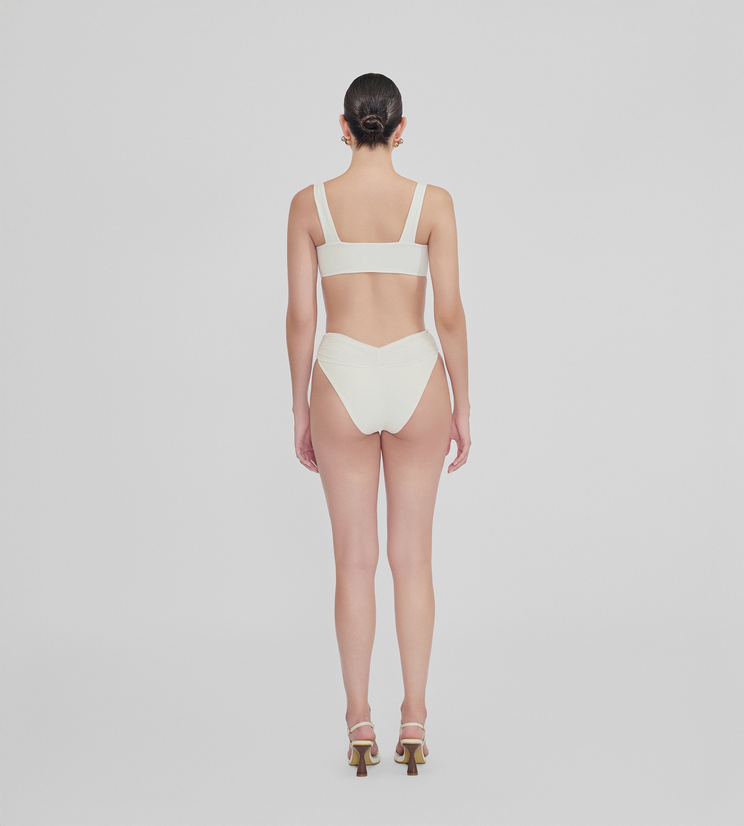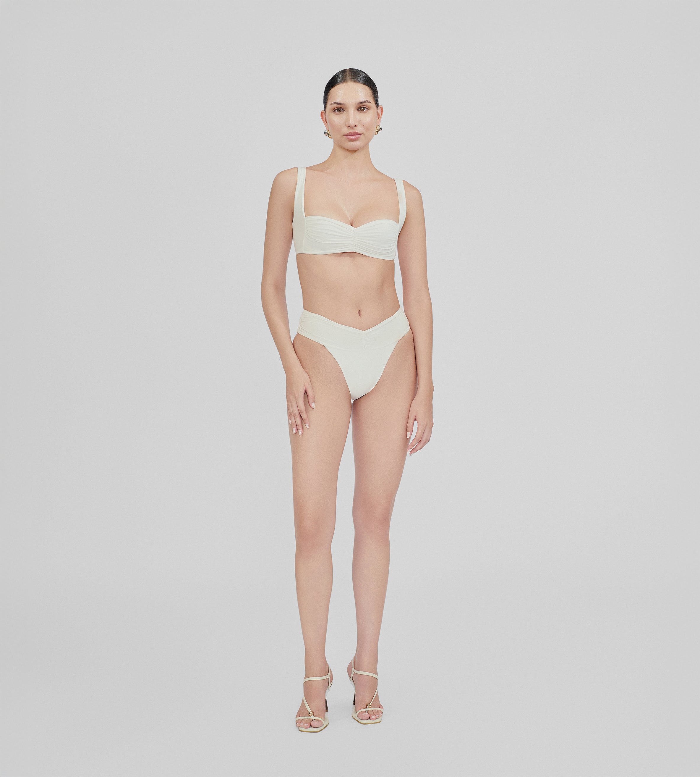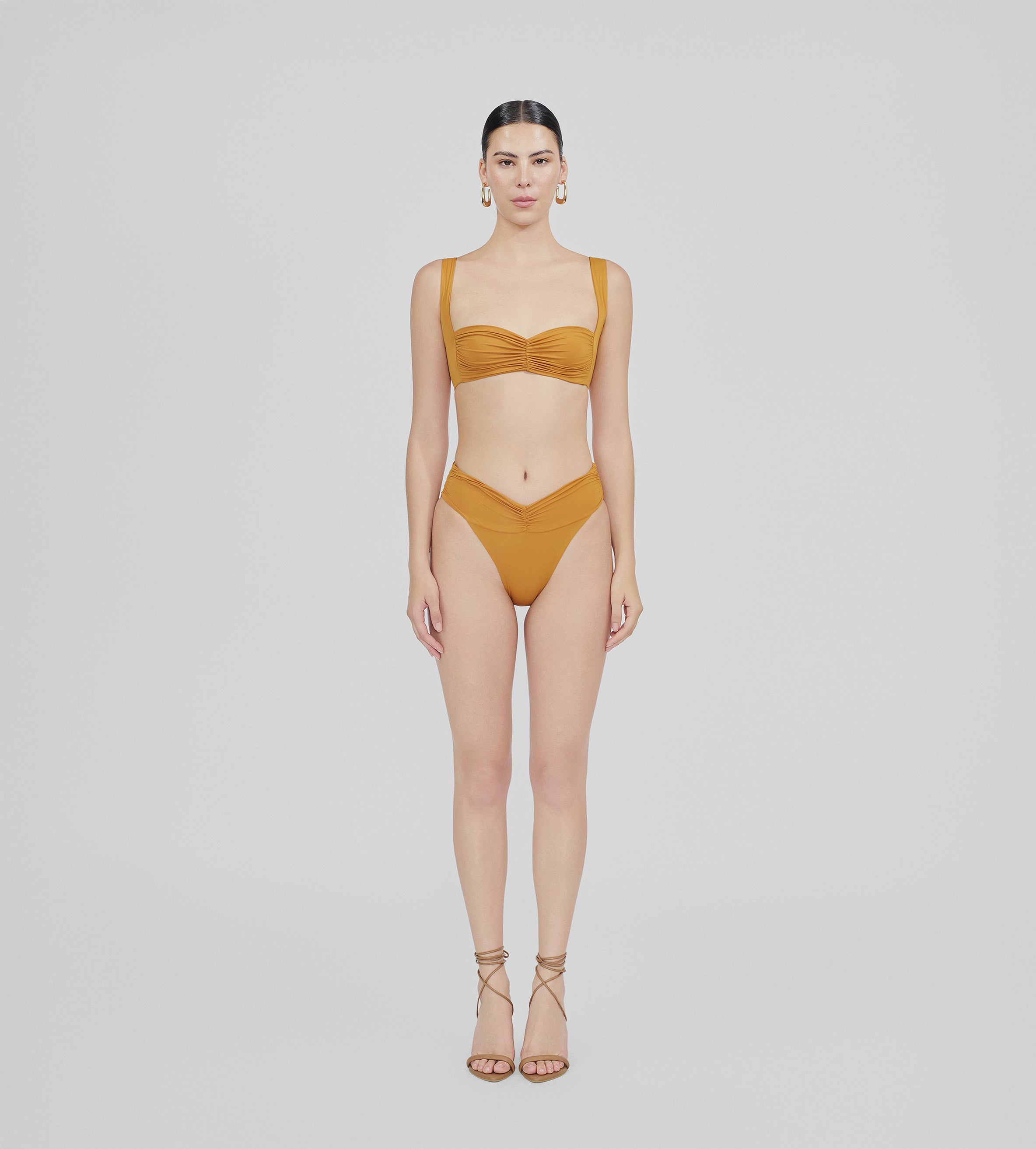 The Guandú two-piece features a top with a soft, heart-shaped ruched detail at the center, enhanced by wide straps for a comfortable and flattering fit. Paired with high-rise briefs that showcase a chic ruched detail at the front.