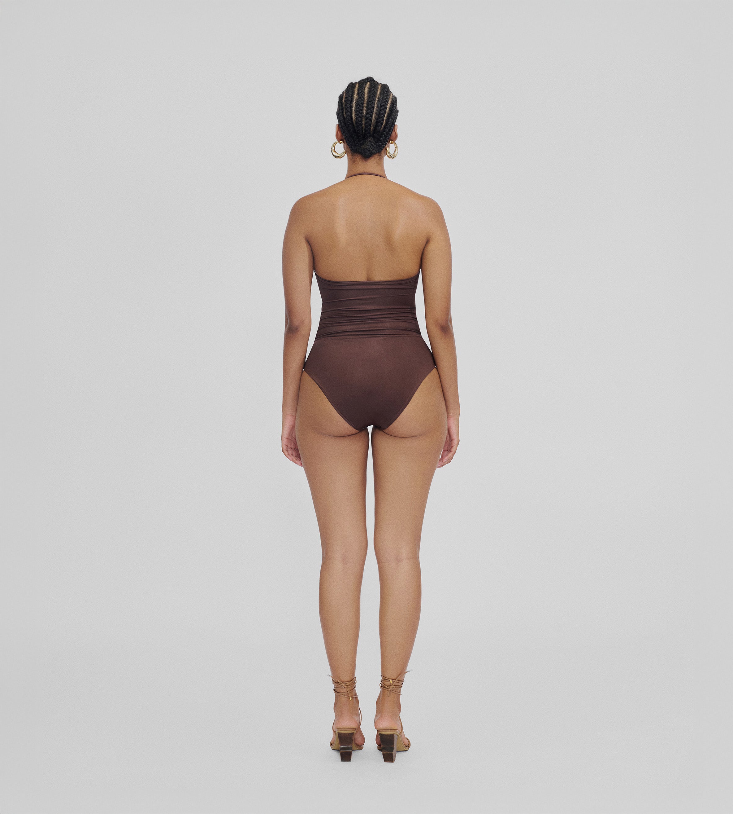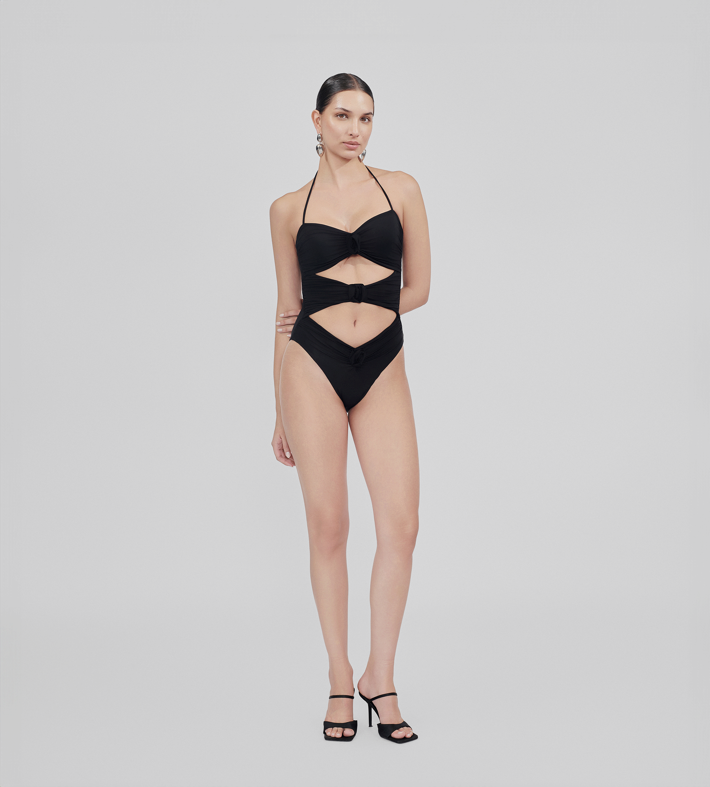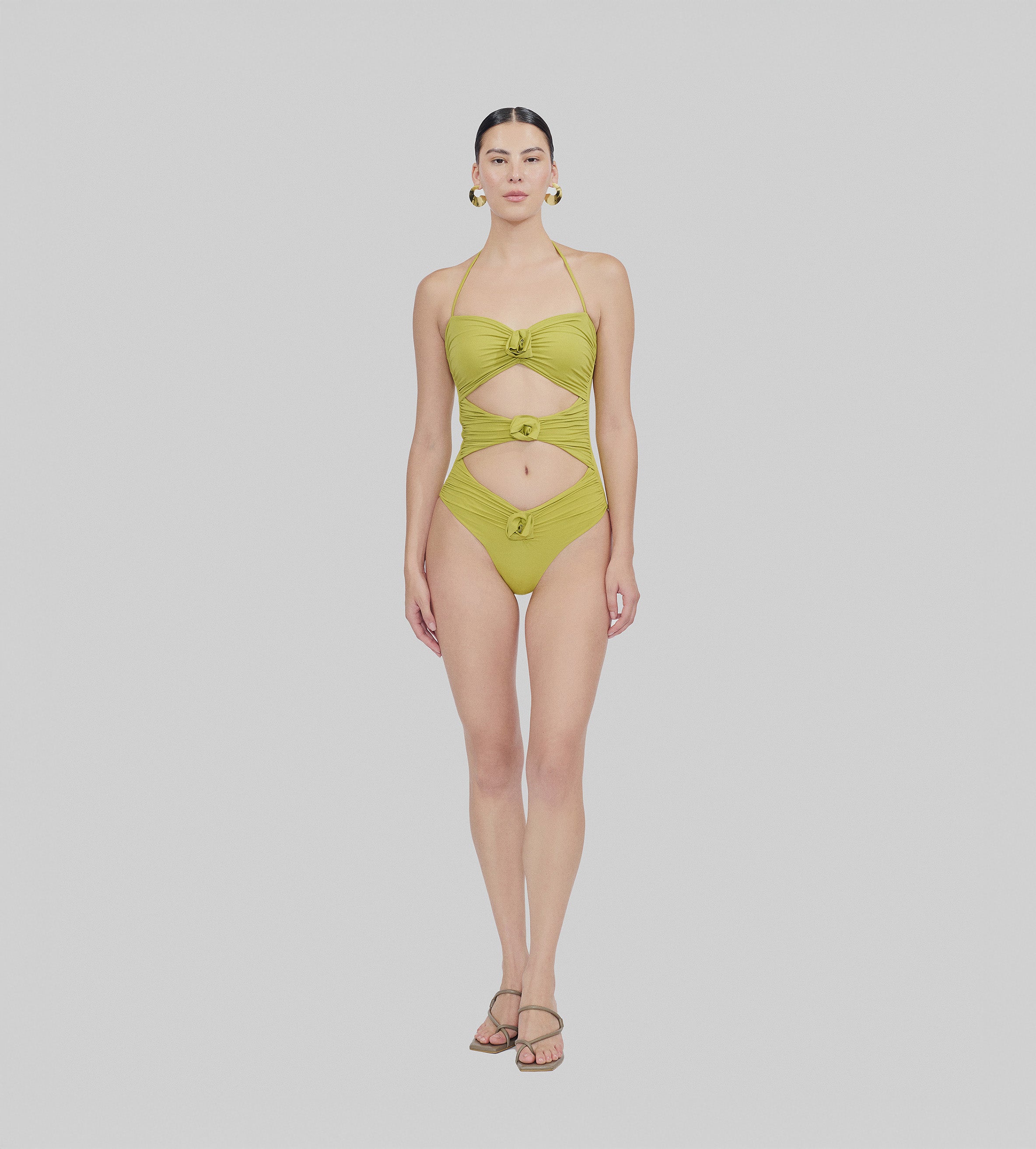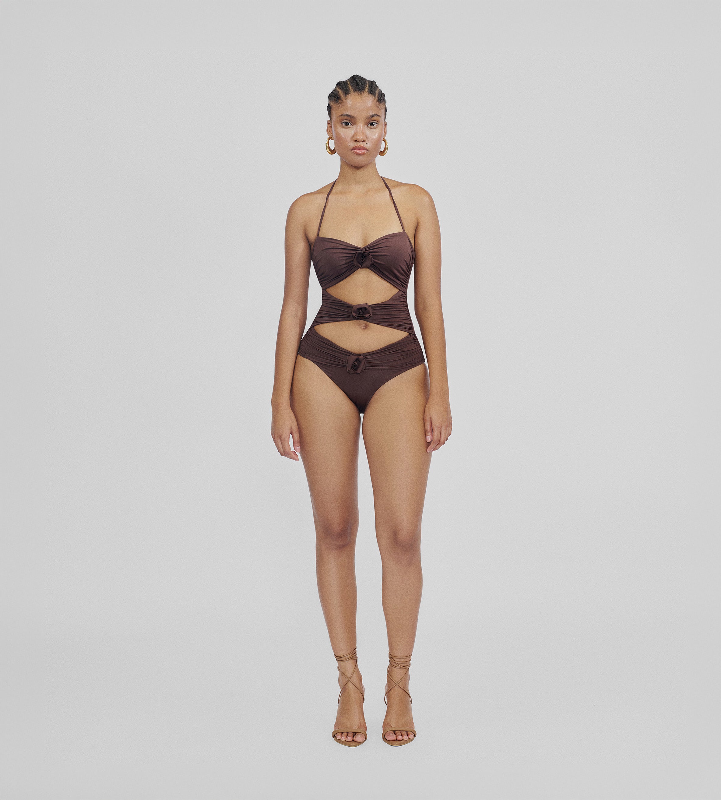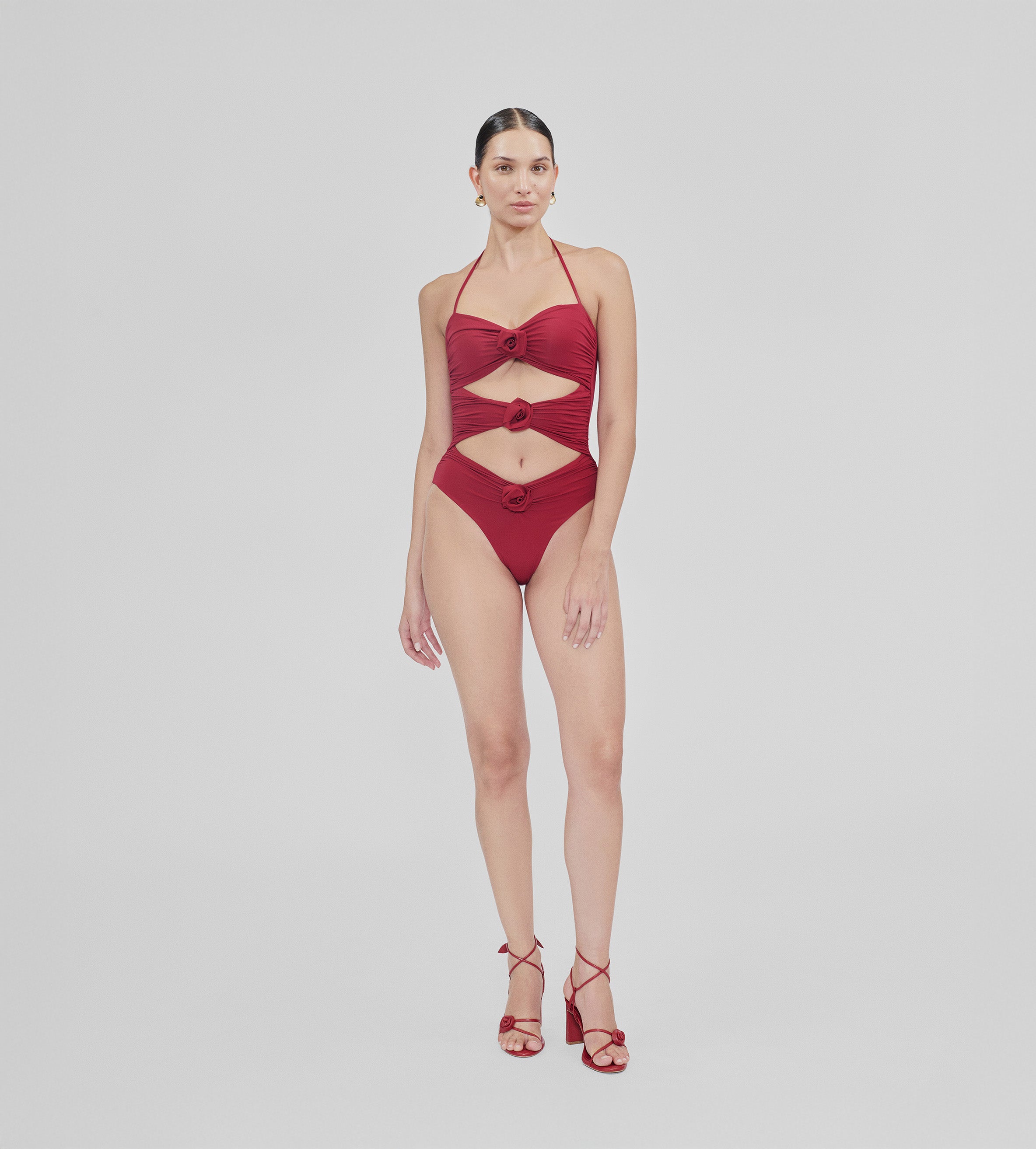 The Lantana one-piece features an intricate arrangement of front and ruched cutouts, each beautifully accented with our new floral embellishments, and is finished with a sleek, delicate neck strap.