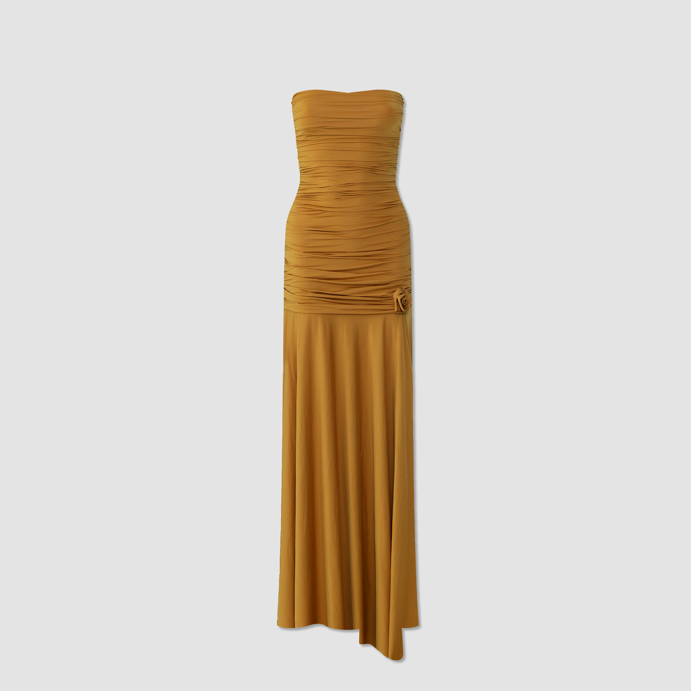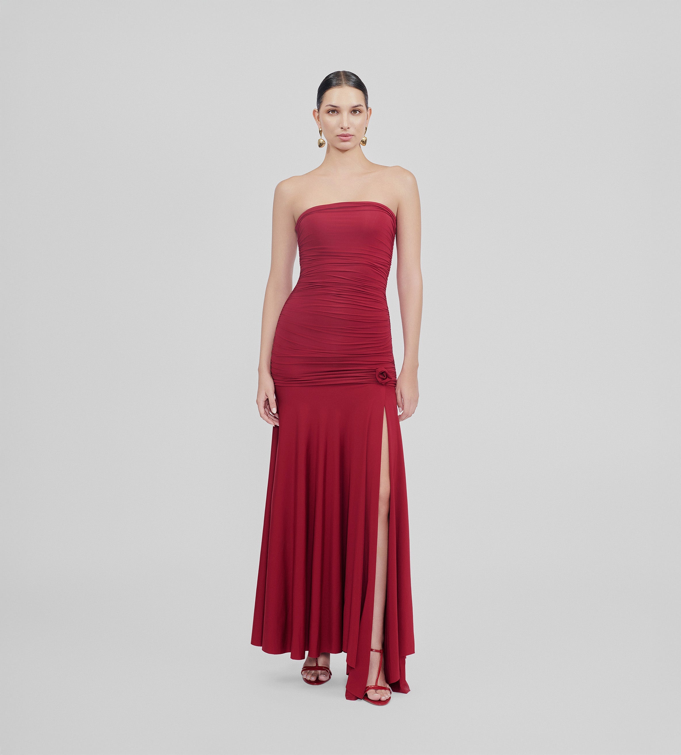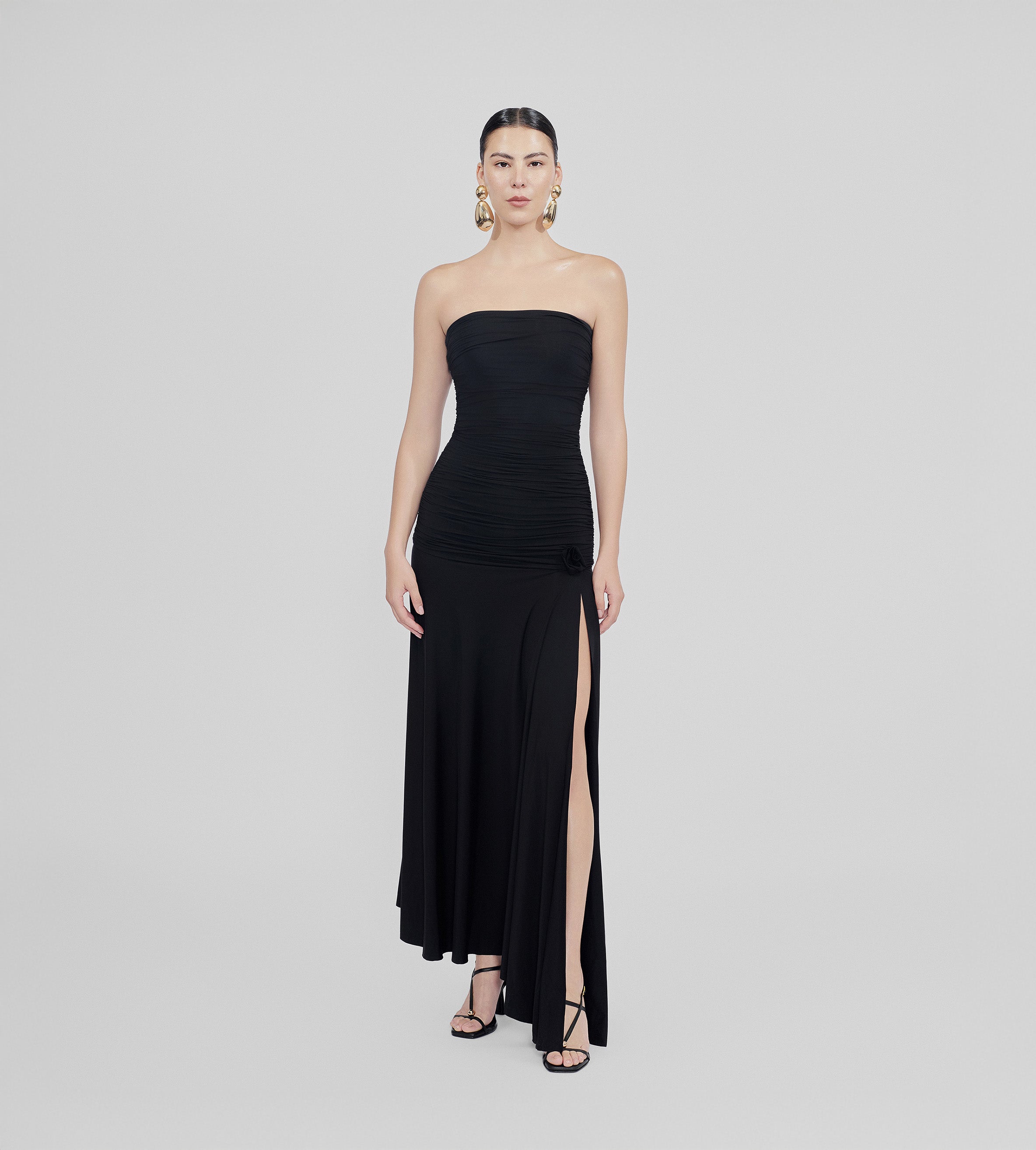 The Lemaitre long dress features a strapless heart-shaped neckline, this design flows effortlessly with a soft draped bodice that gently hugs the body. The long, wide, flouncy skirt is beautifully complemented by a slit at the front and a stunning handmade 3D flower detail, all crafted from our iconic stretch Lycra for a flawless fit and ultimate comfort.