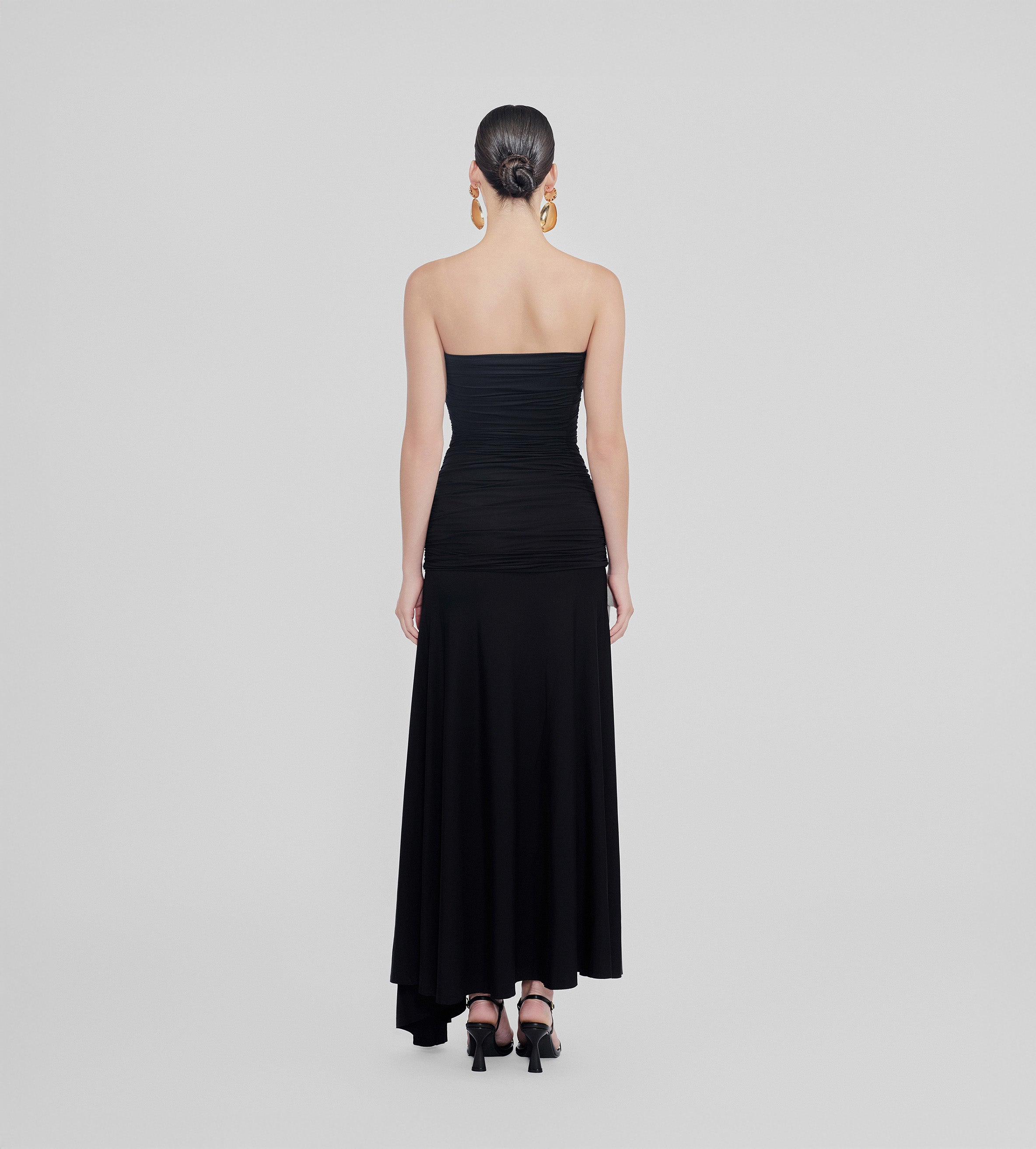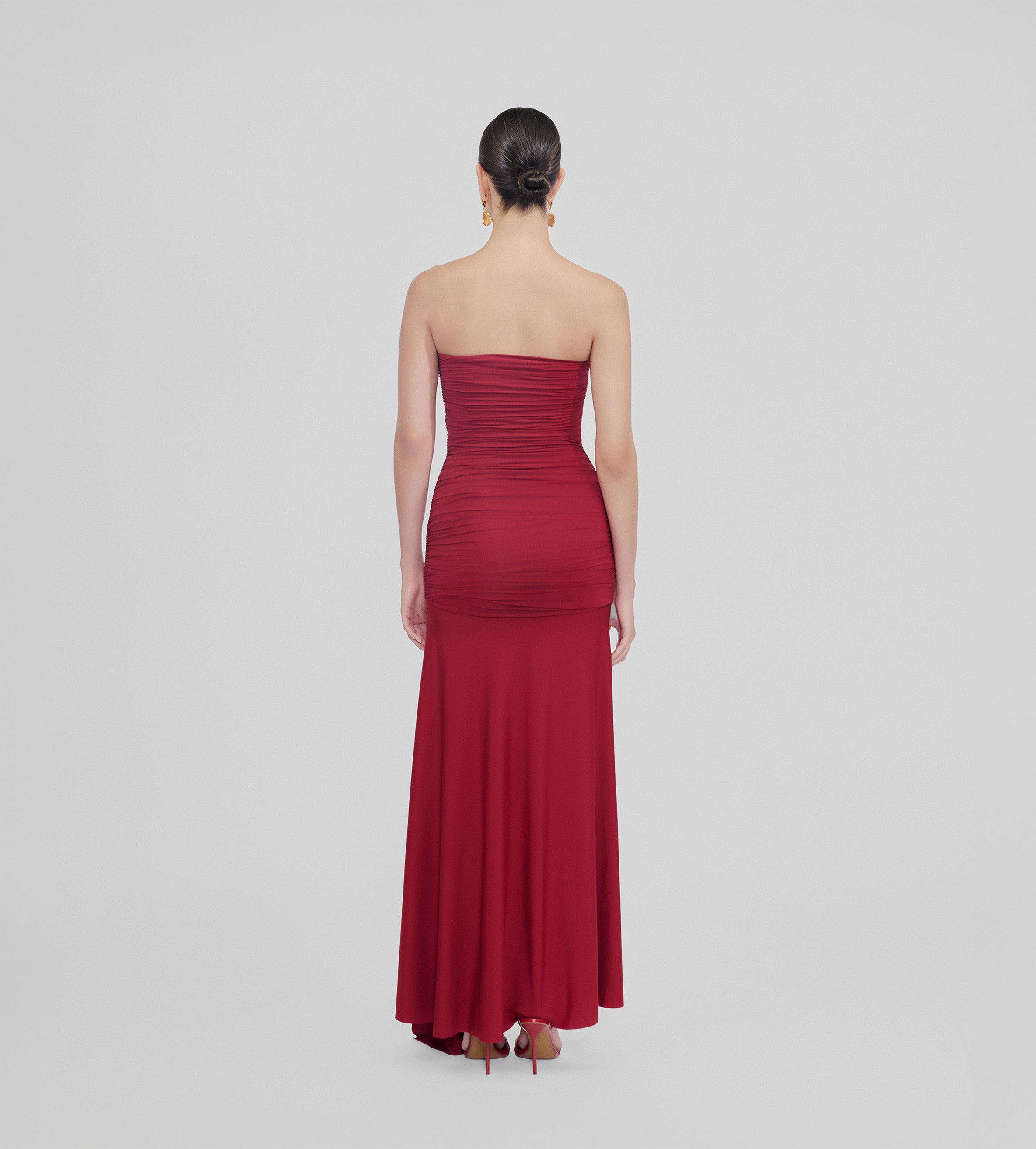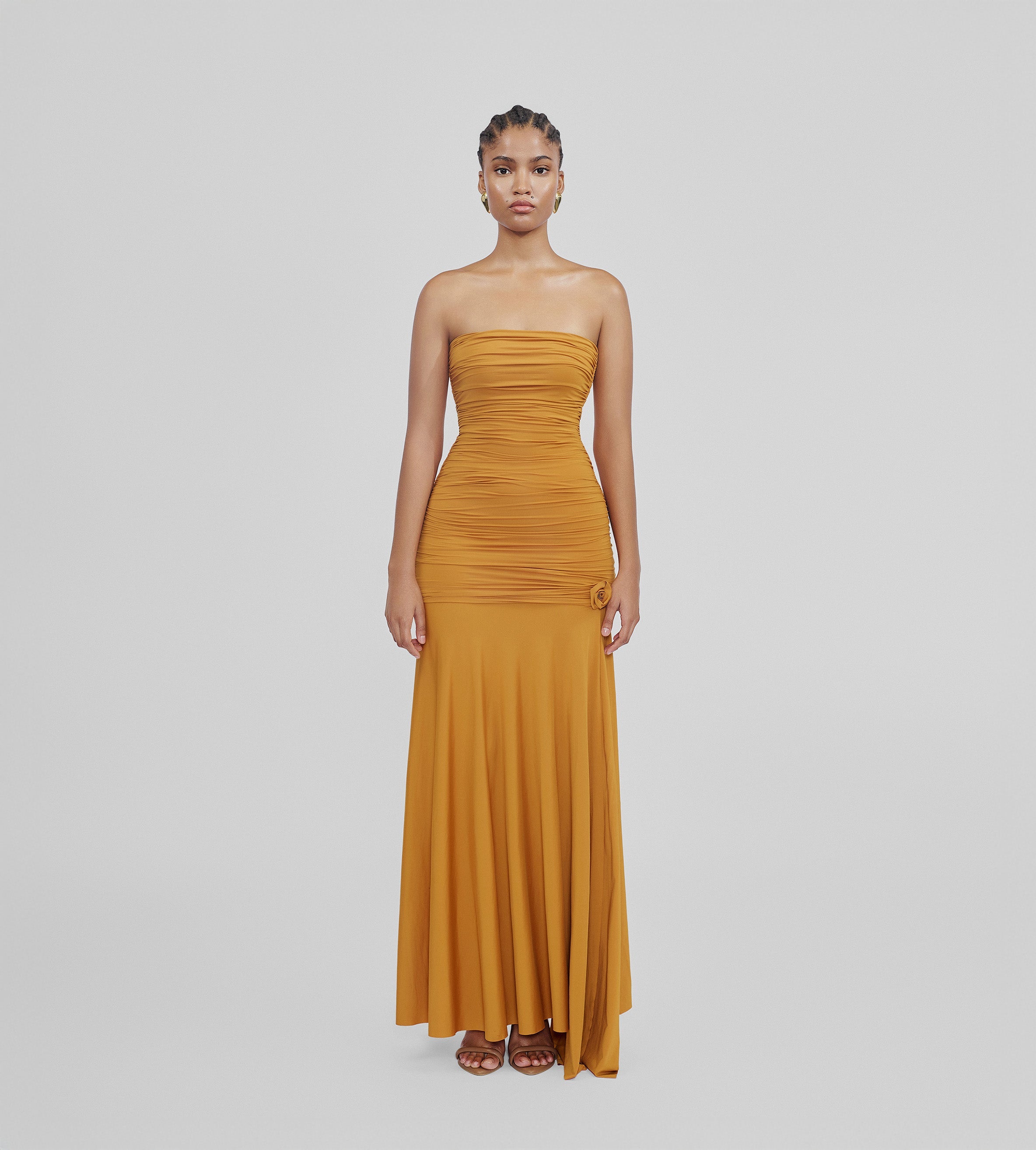 The Lemaitre long dress features a strapless heart-shaped neckline, this design flows effortlessly with a soft draped bodice that gently hugs the body. The long, wide, flouncy skirt is beautifully complemented by a slit at the front and a stunning handmade 3D flower detail, all crafted from our iconic stretch Lycra for a flawless fit and ultimate comfort.