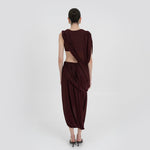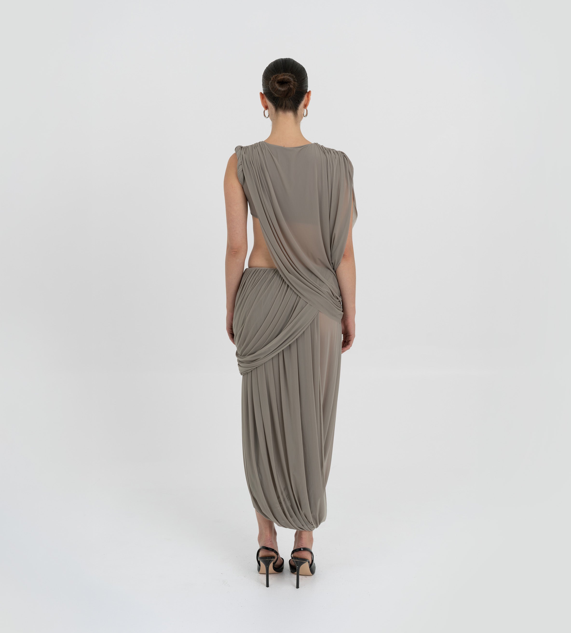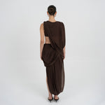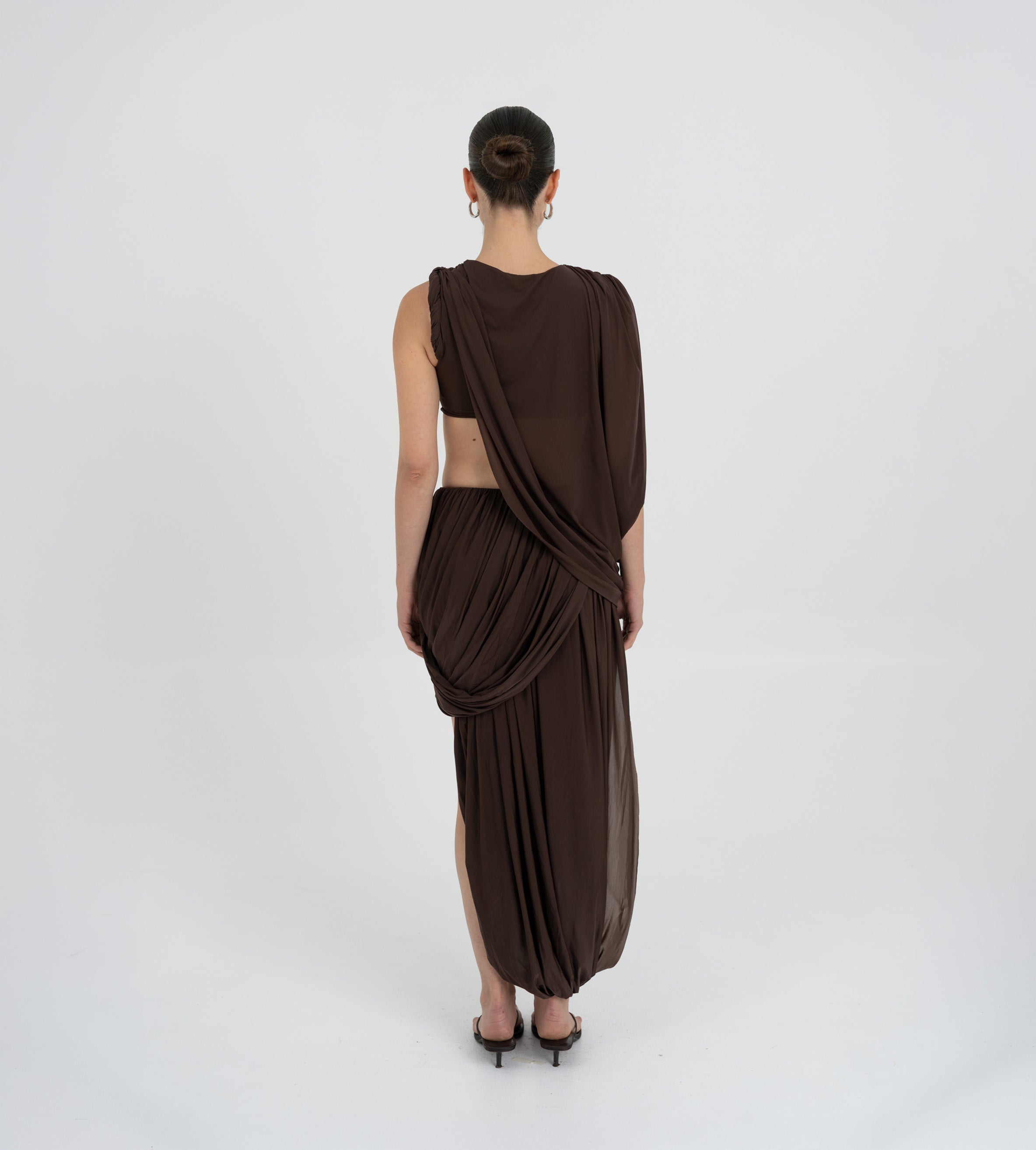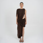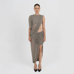 The León midi skirt features a low rise double-layer asymmetric skirt with twisted draping,  that creates depth, movement and a striking silhouette.