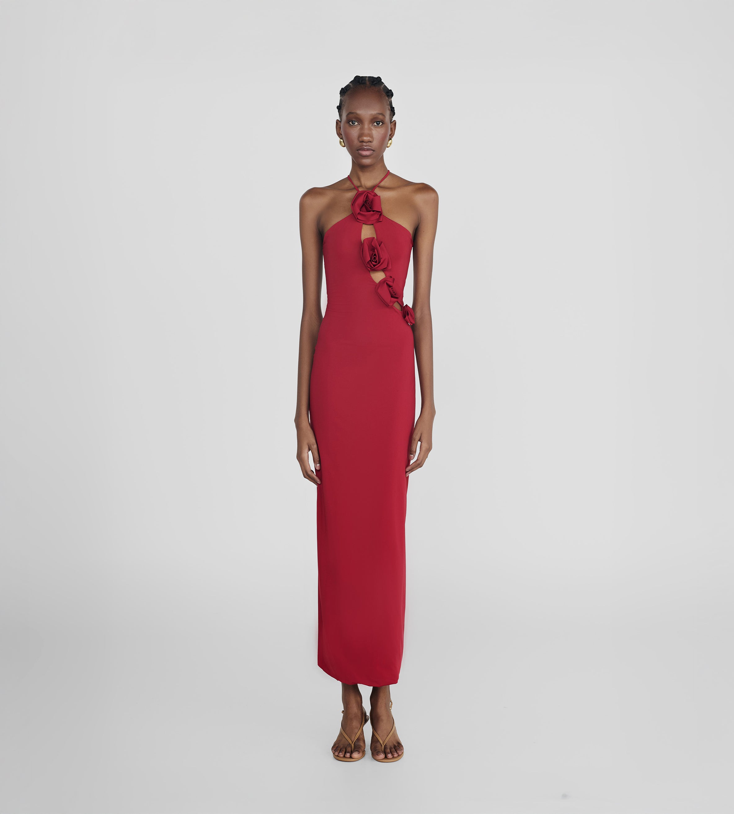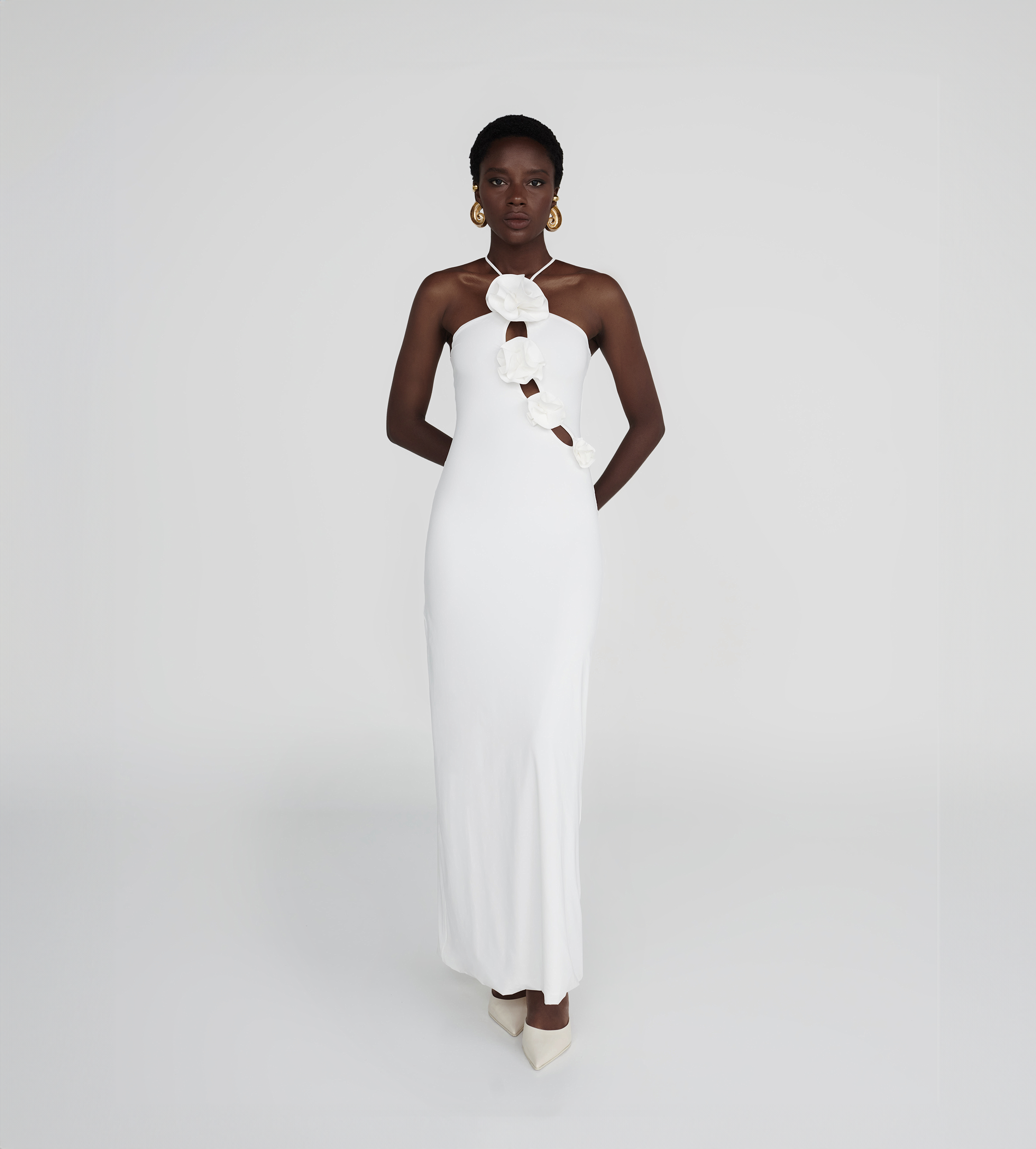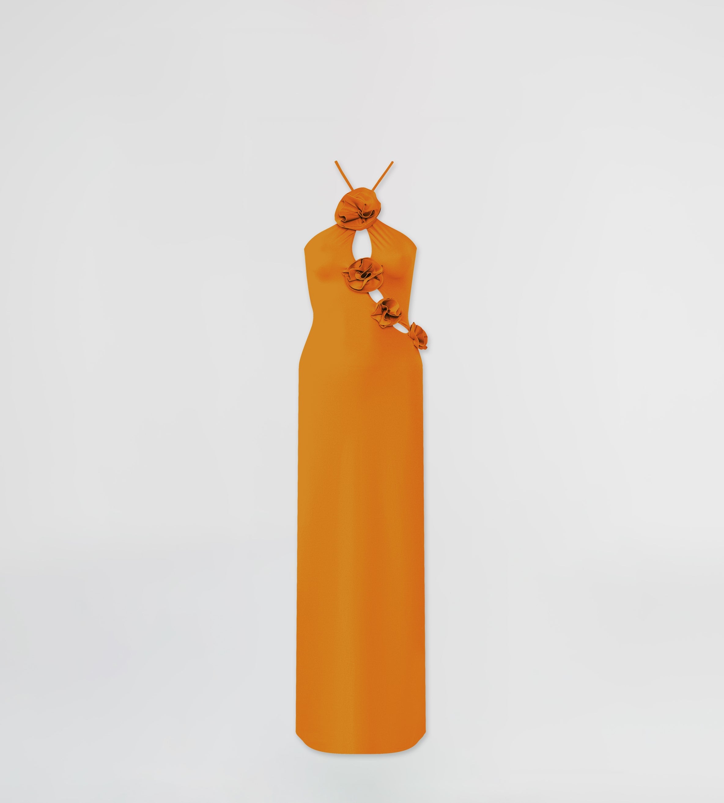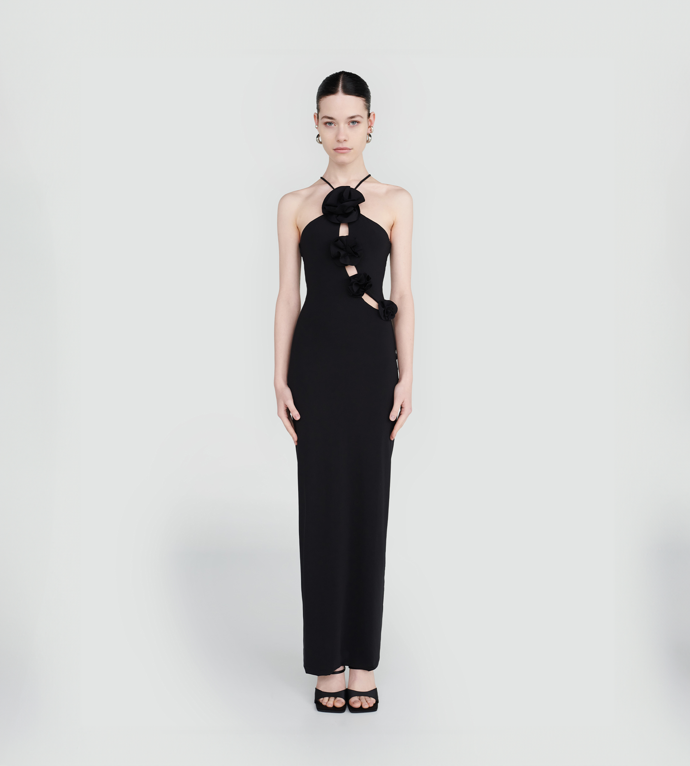 A cascade of handmade 3D flowers that catches the eye and complements sensual cutouts is the ultimate detail in our Liri long dress, a fitted dress with thin adjustable straps that creates a flirtatious and sophisticated design.