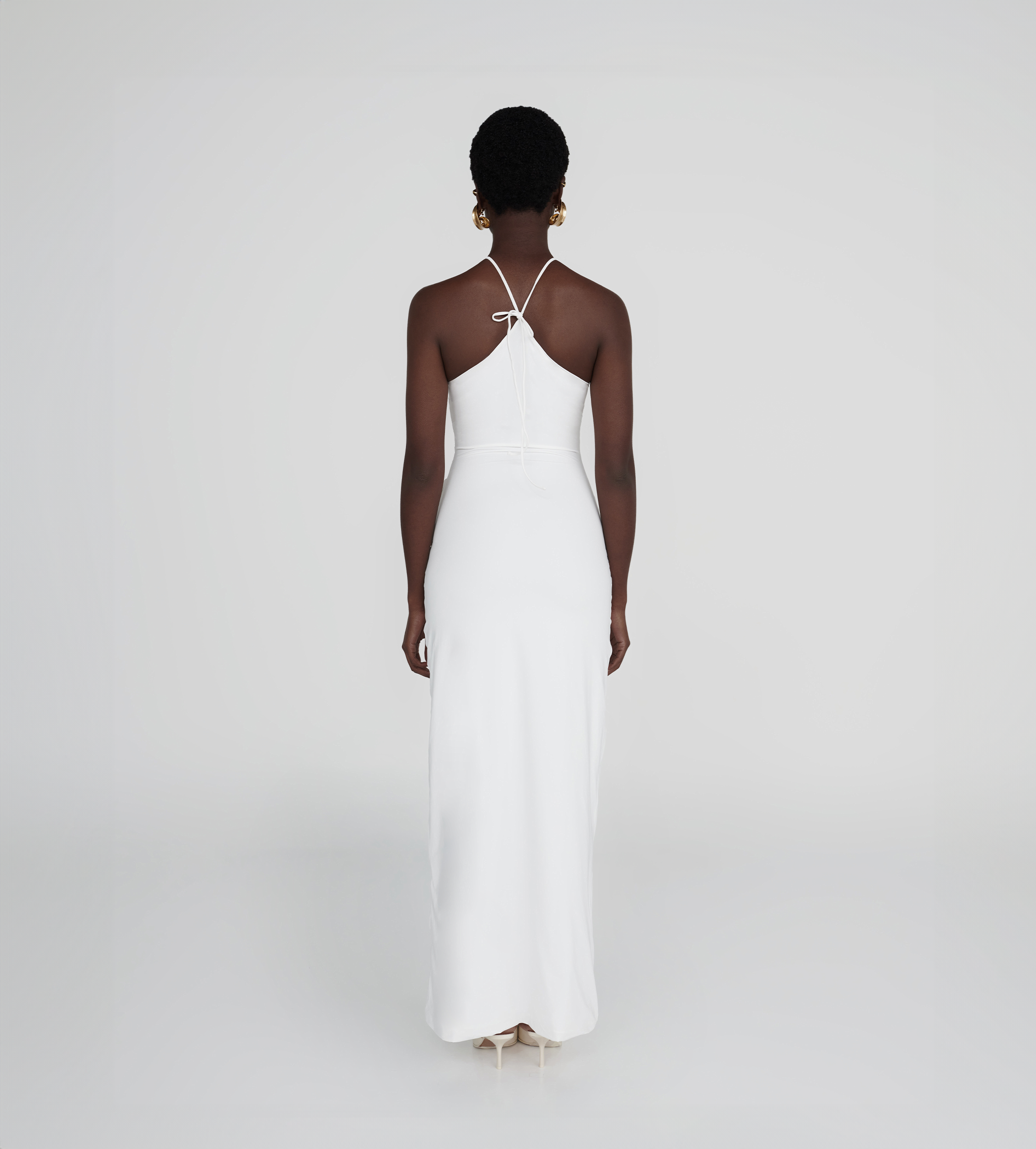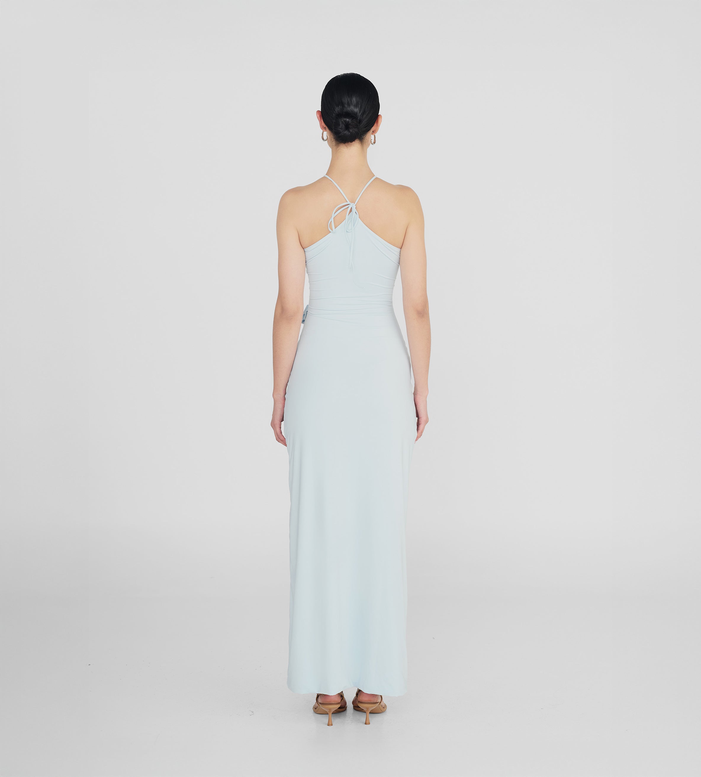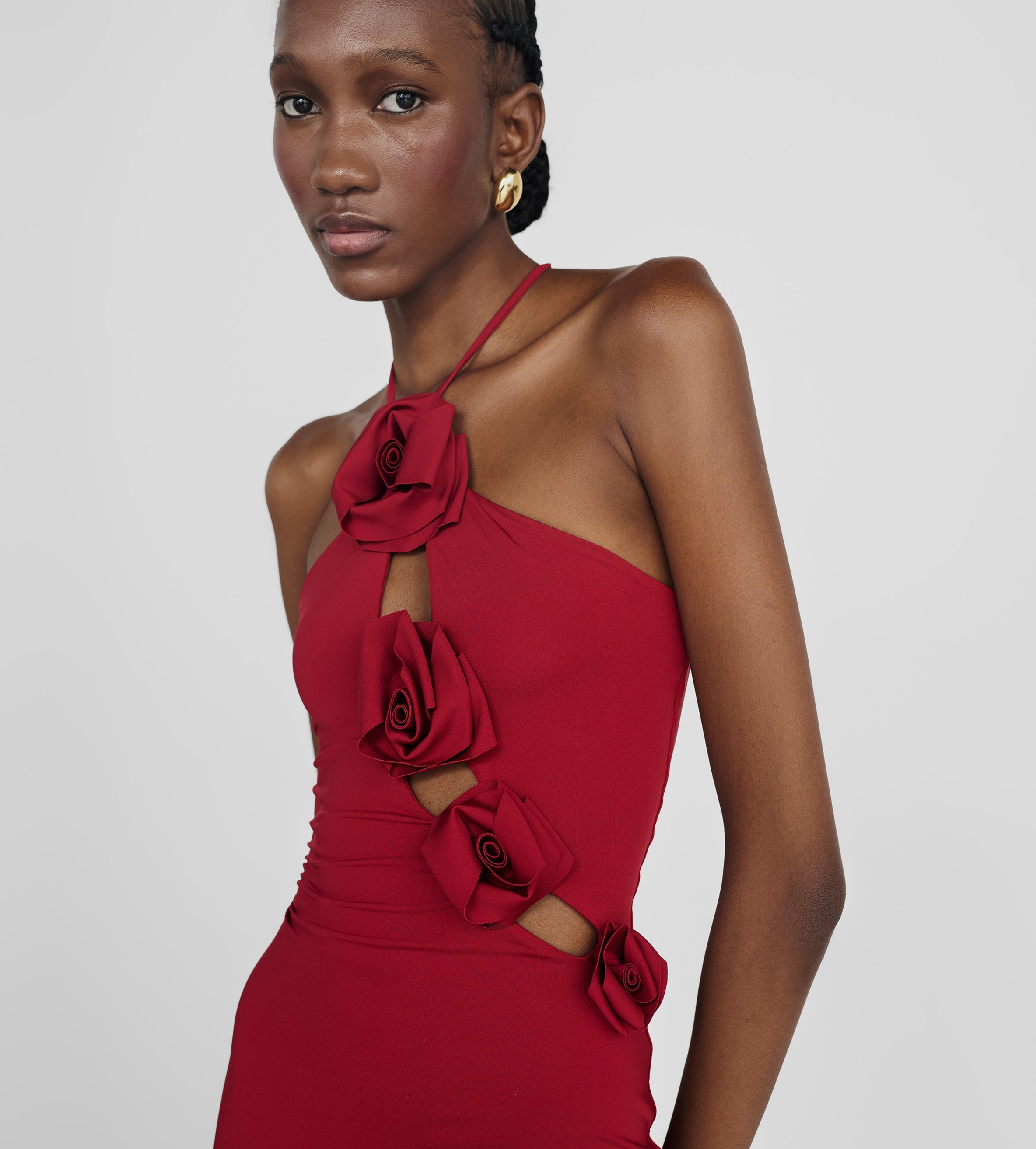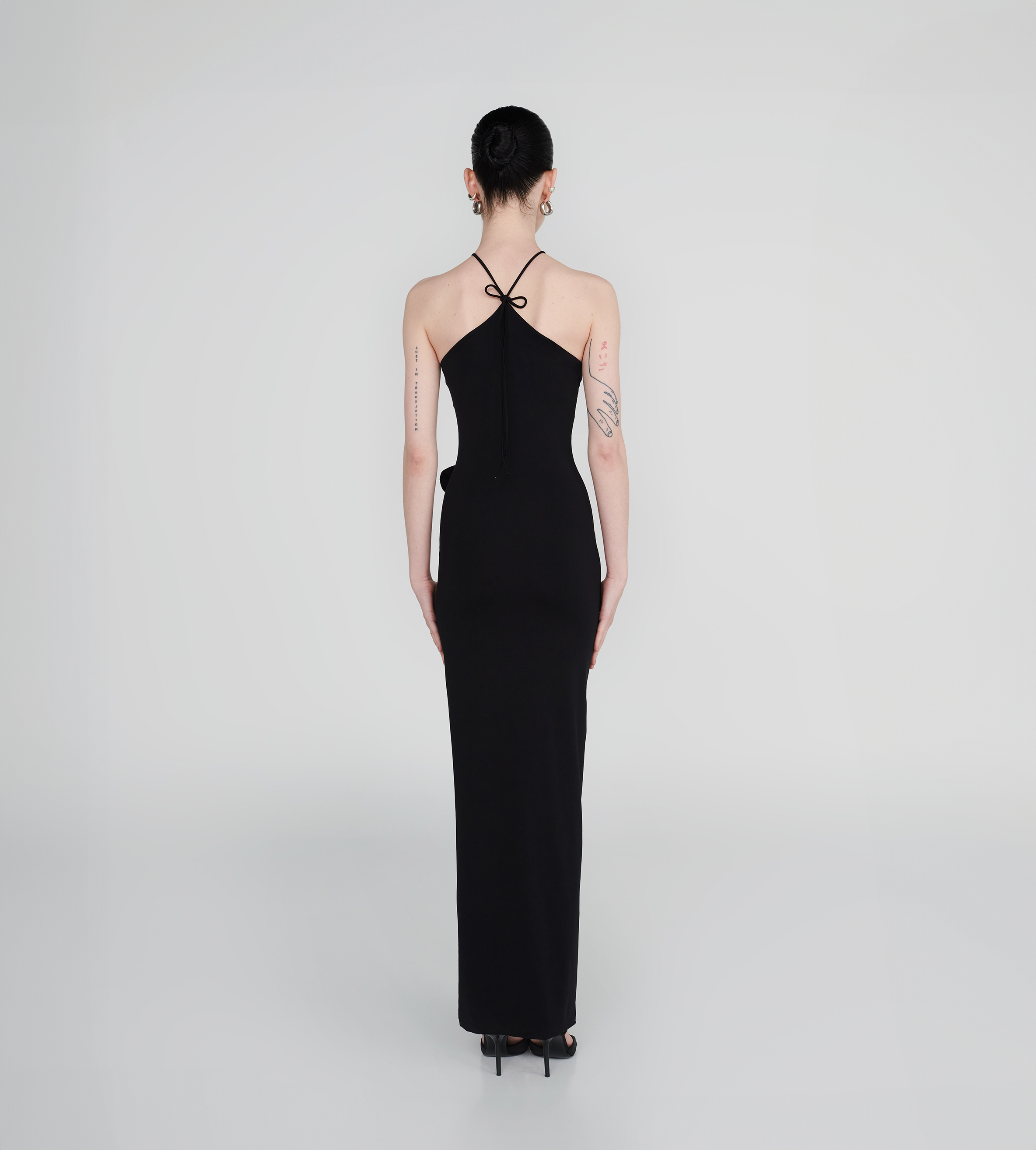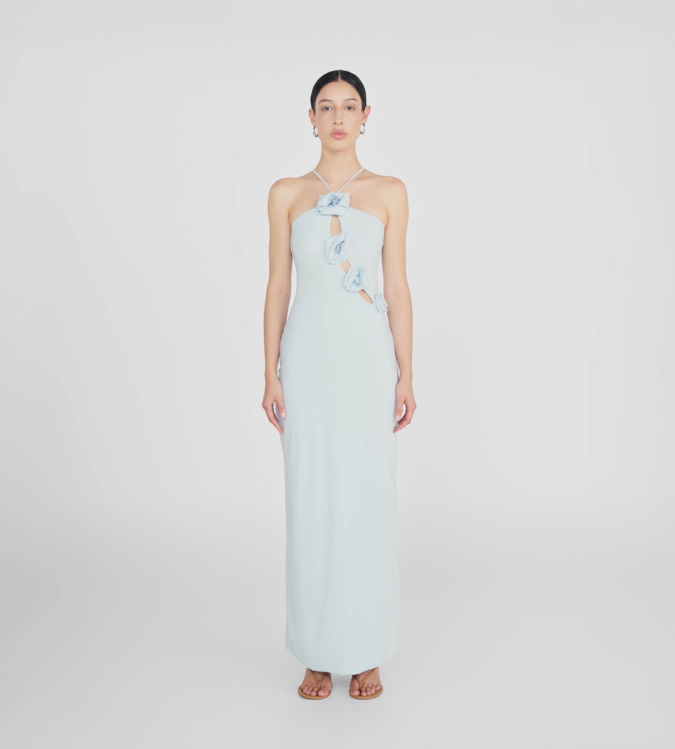 A cascade of handmade 3D flowers that catches the eye and complements sensual cutouts is the ultimate detail in our Liri long dress, a fitted dress with thin adjustable straps that creates a flirtatious and sophisticated design.