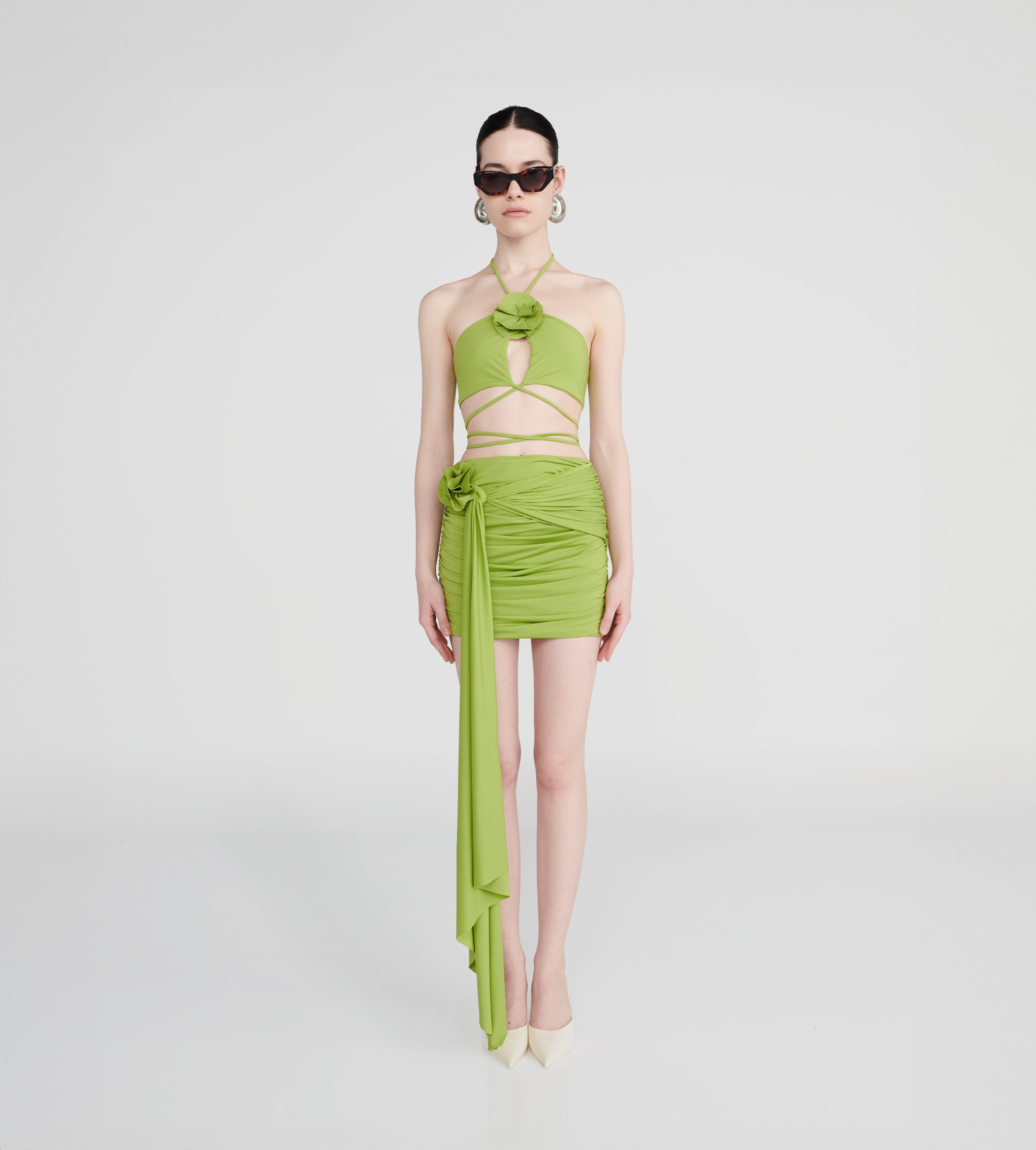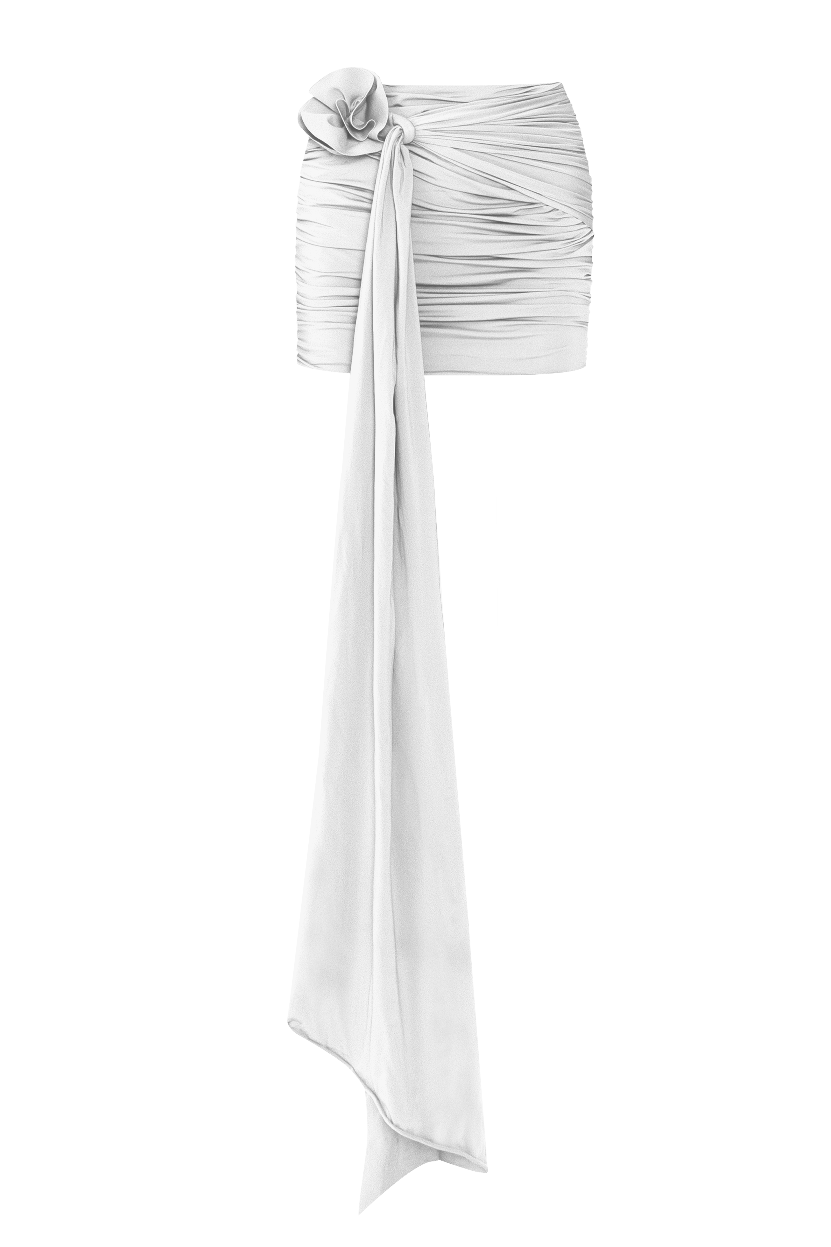 Mini skirt with ruching details in the front and back, an adjustable sash detail at the front that merges with the 3D blossoming iconic flower feature, rounding up an effortless and sophisticated design.