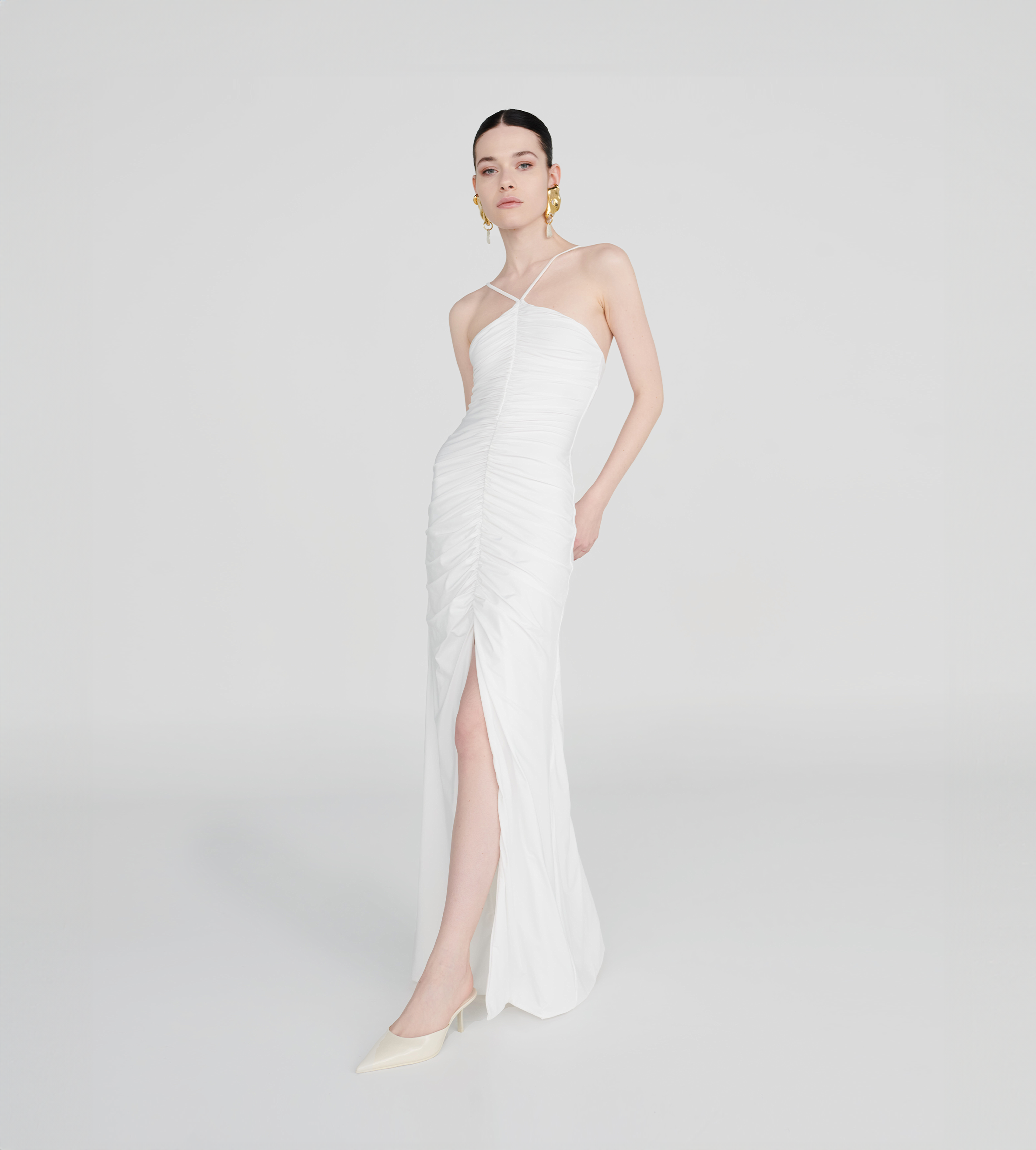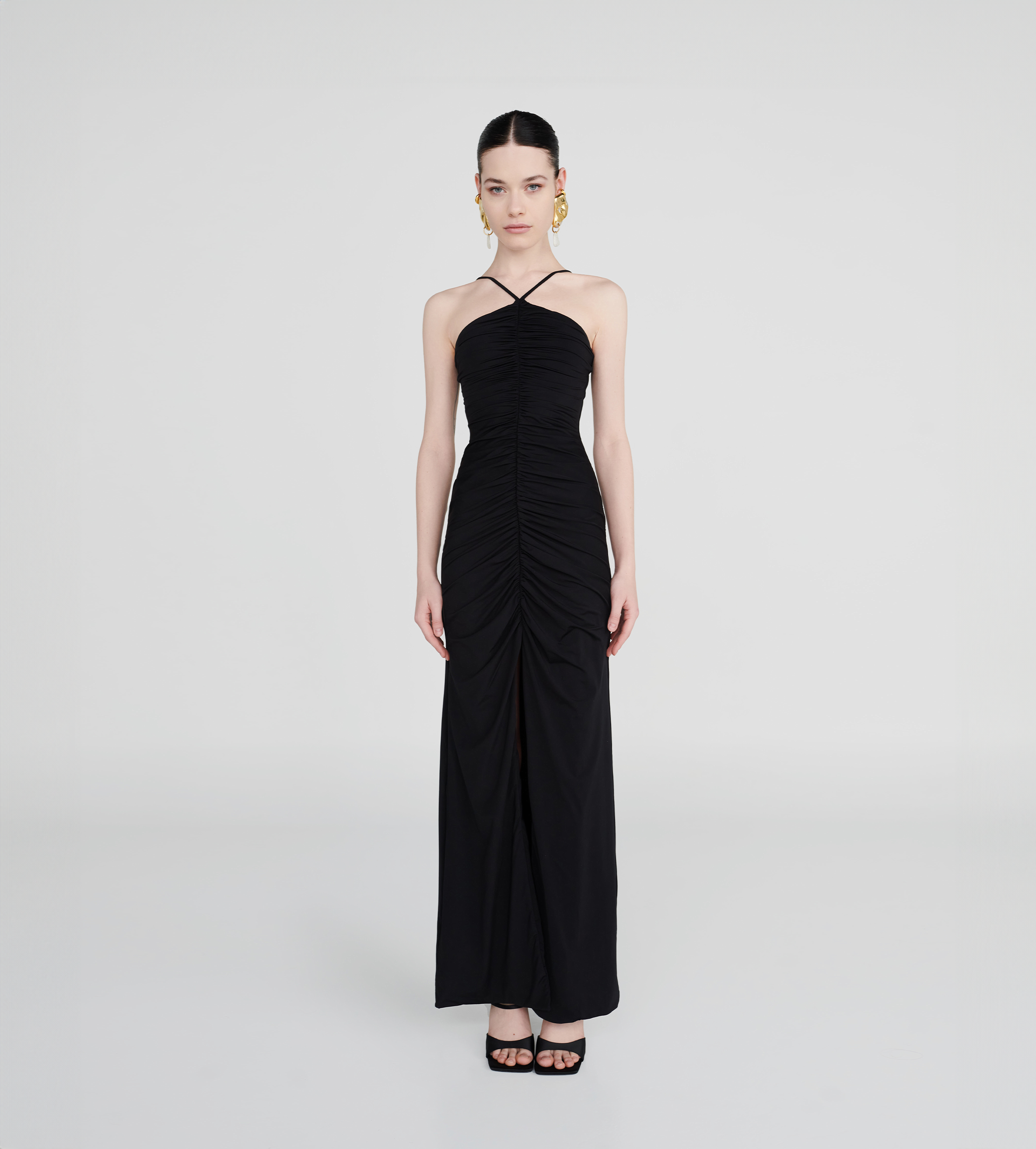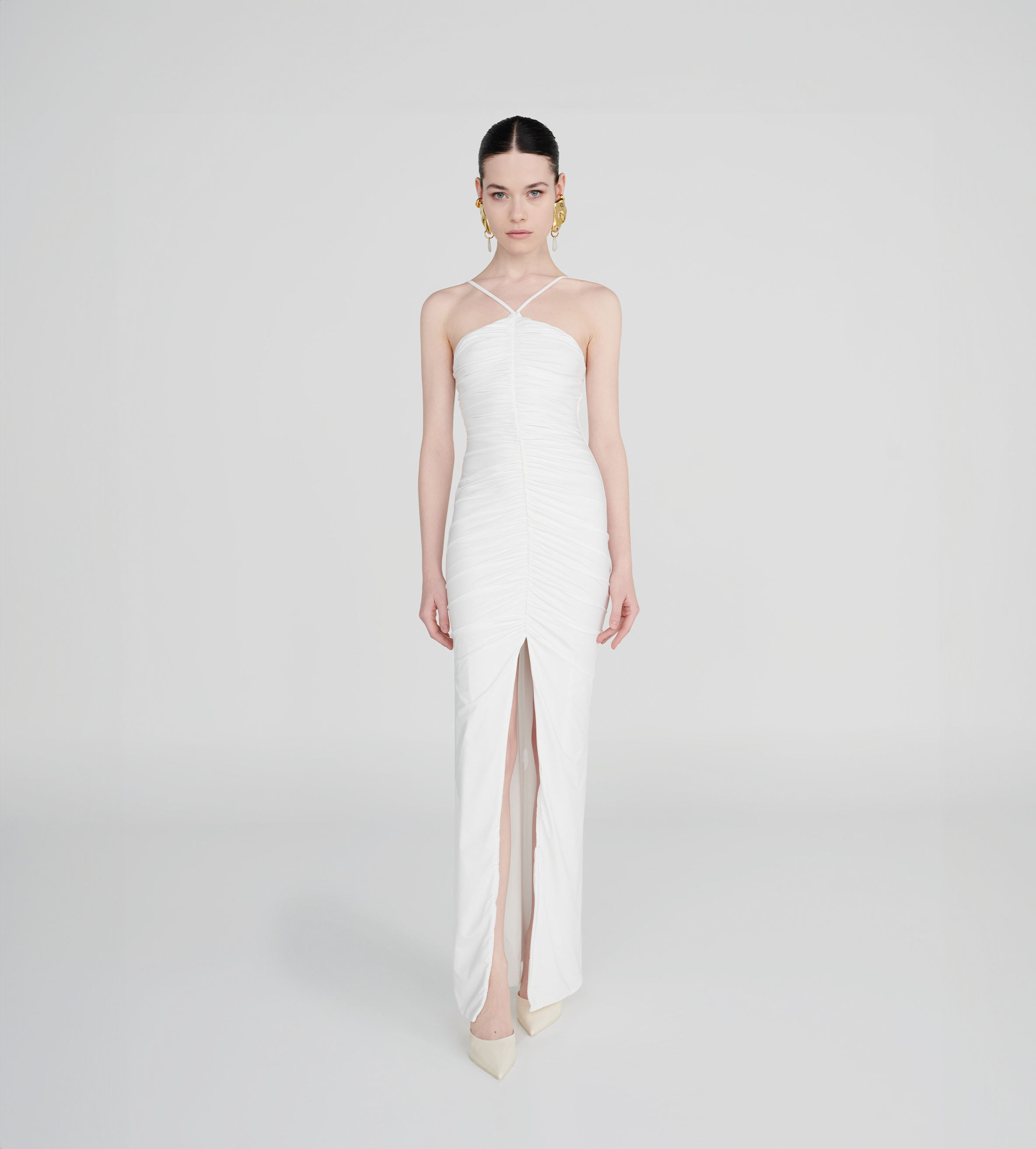 Maxi sheath dress with a halter neck and a knot closure, along with a frontal ruched detail and an opening between the legs.