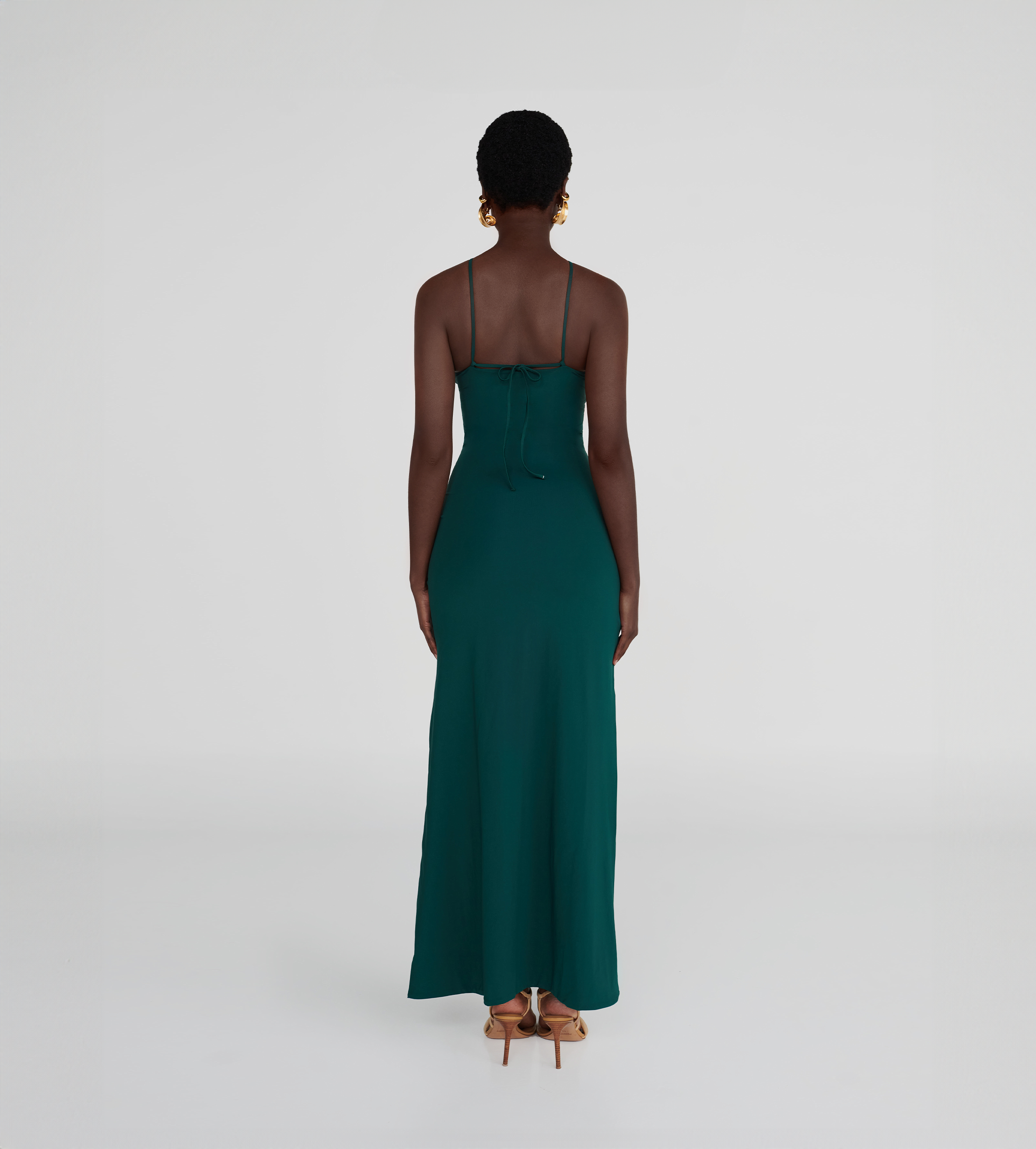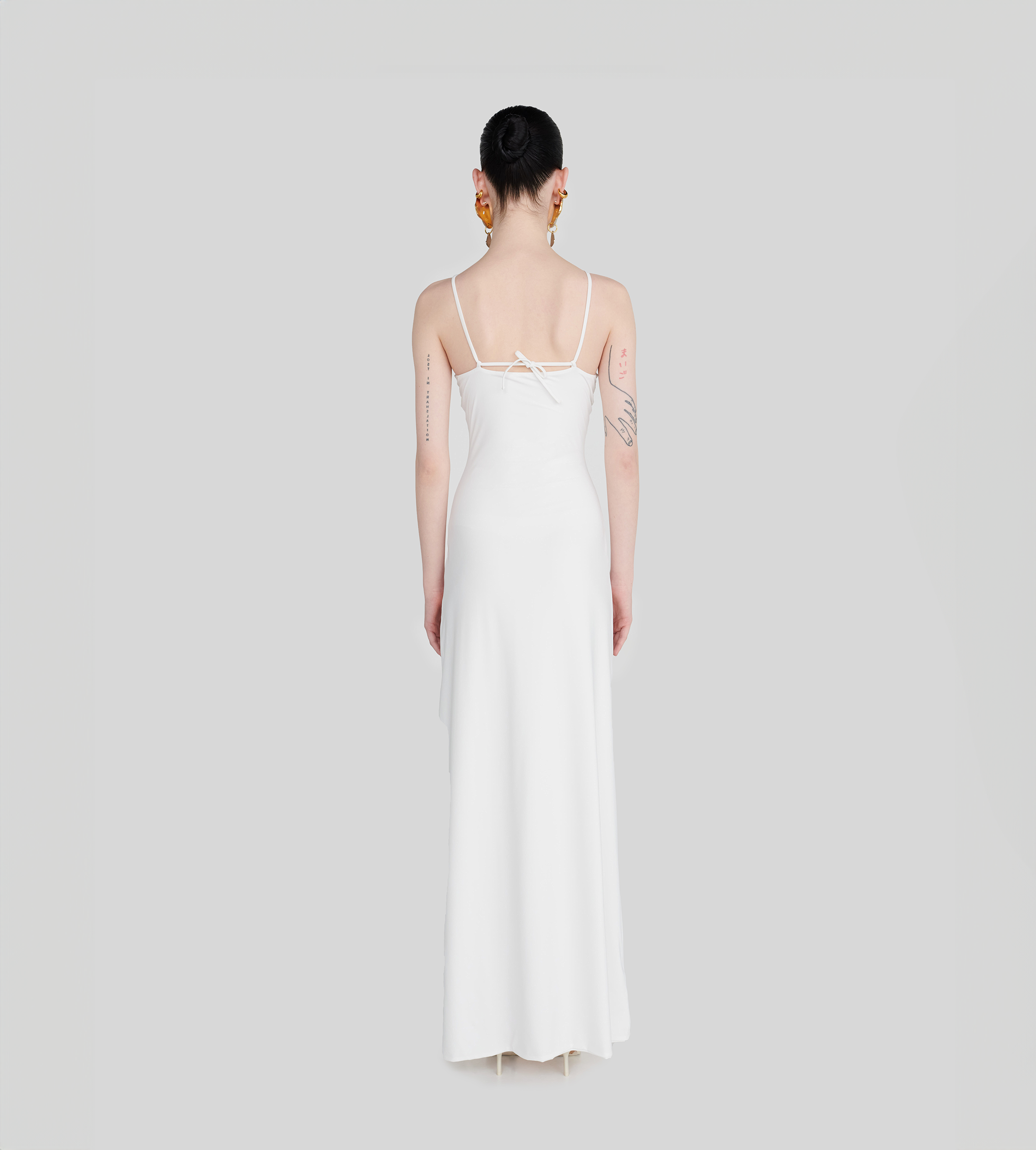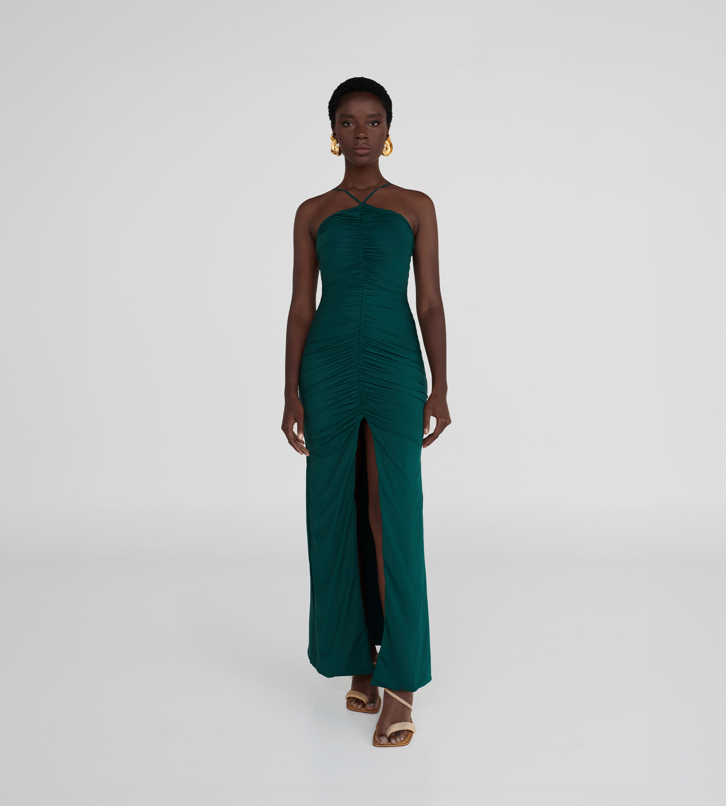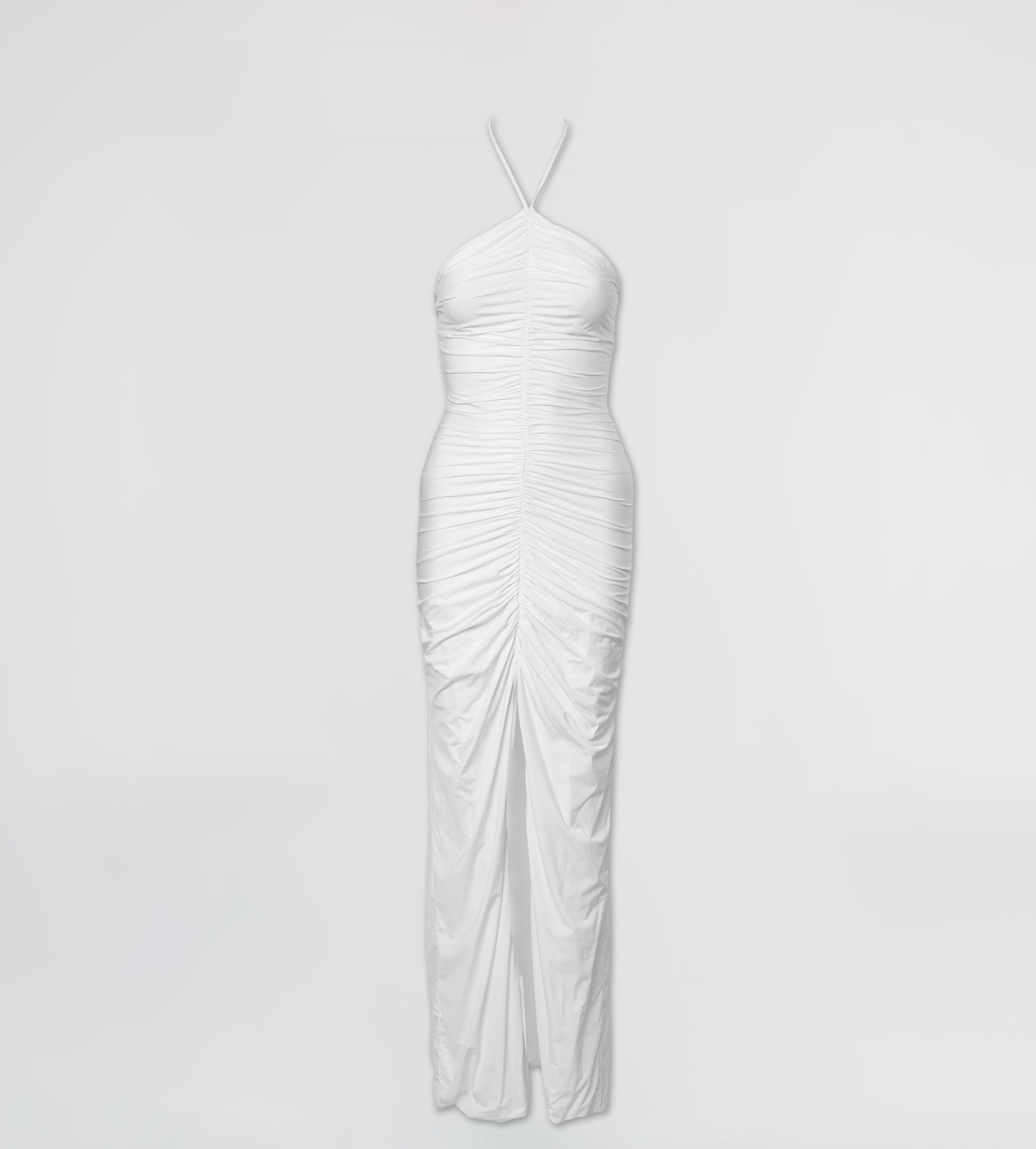 Maxi sheath dress with a halter neck and a knot closure, along with a frontal ruched detail and an opening between the legs.