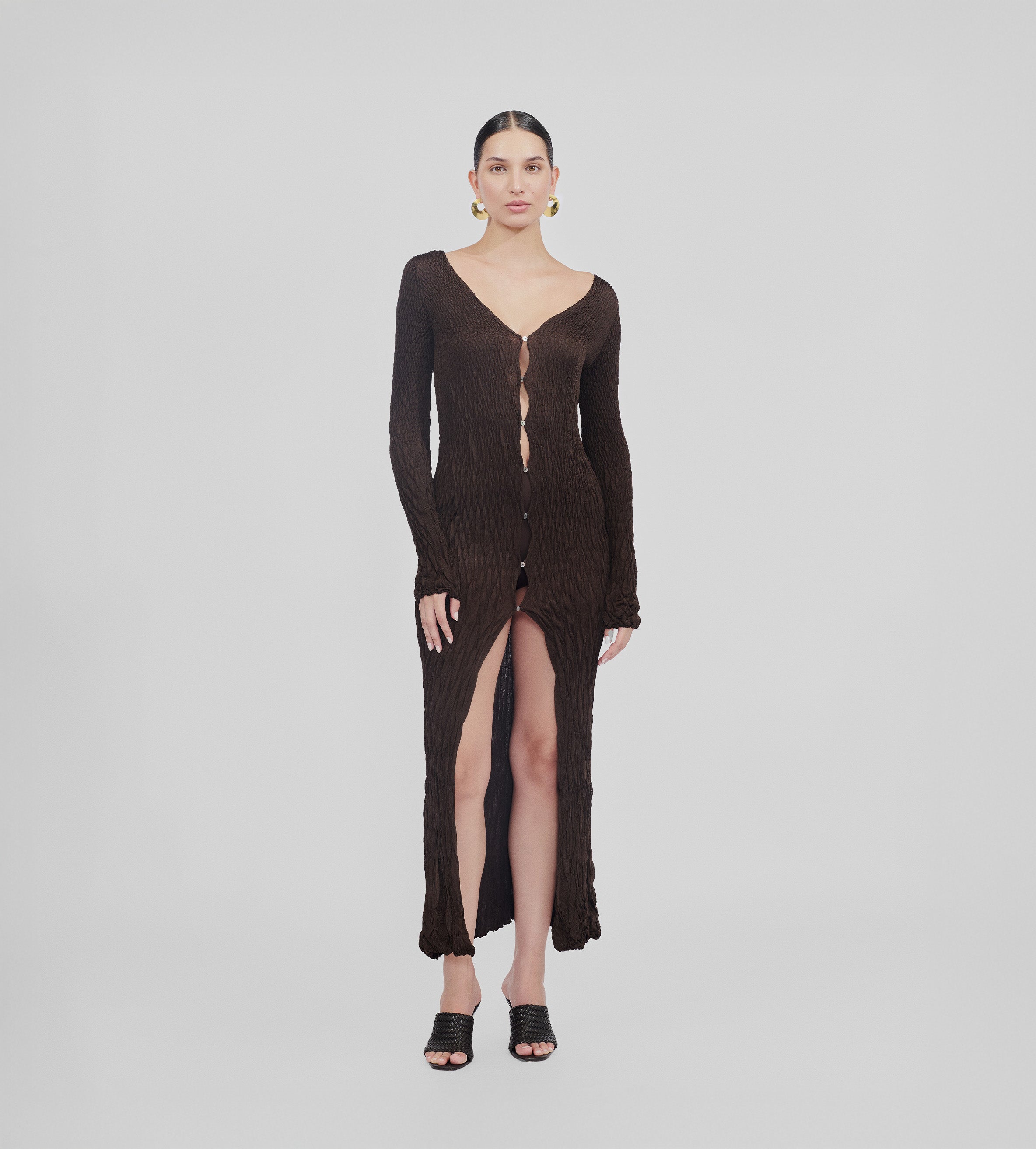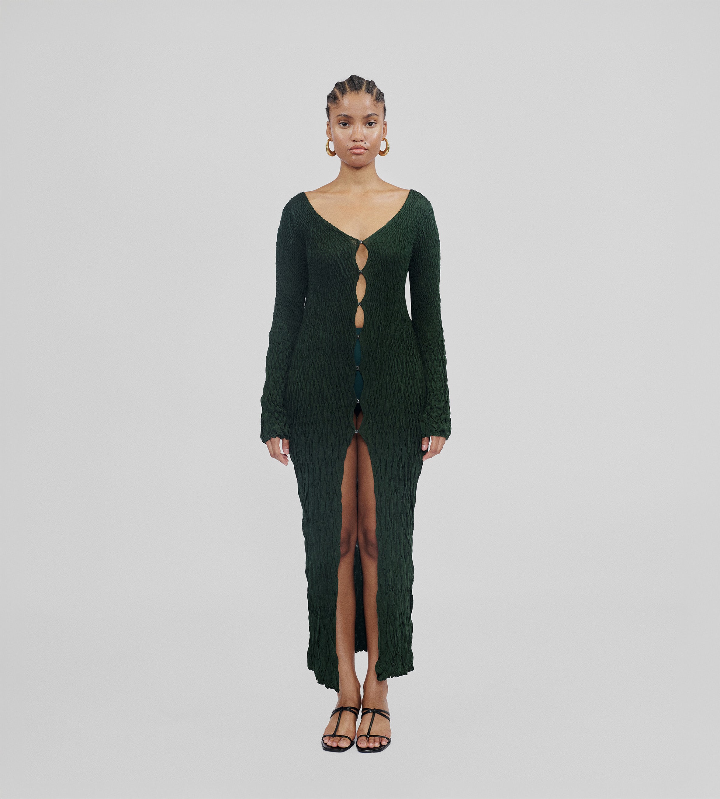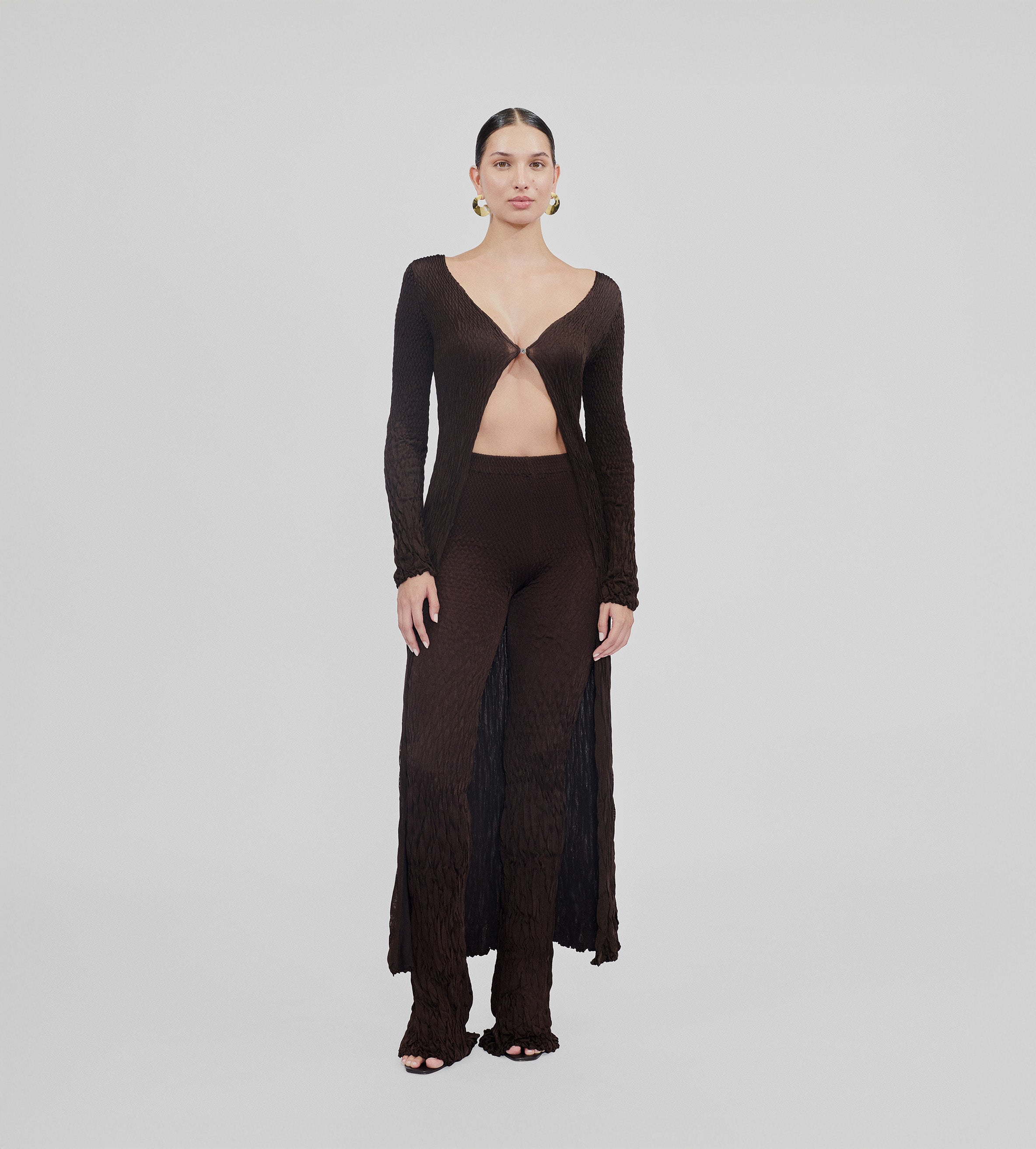 Long, fitted cardigan featuring a deep V-neckline, long sleek sleeves and a front opening that highlights the versatile styling options of this modern design. A fresh silhouette crafted from our new textured knit fabric, offering endless possibilities.