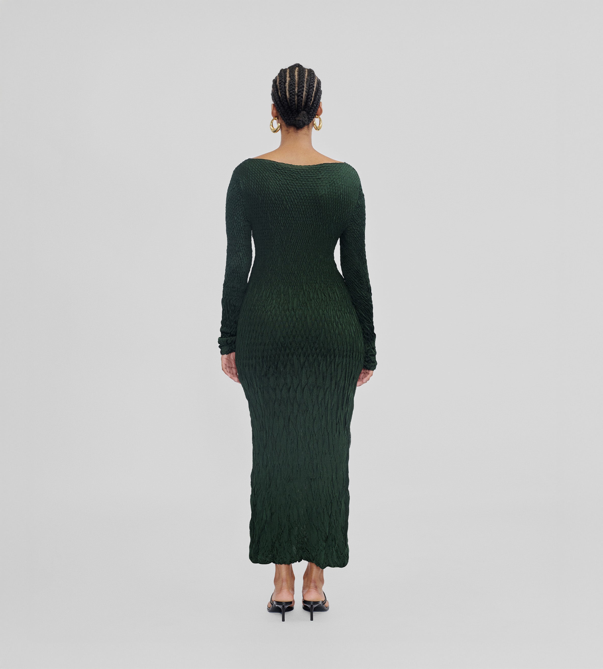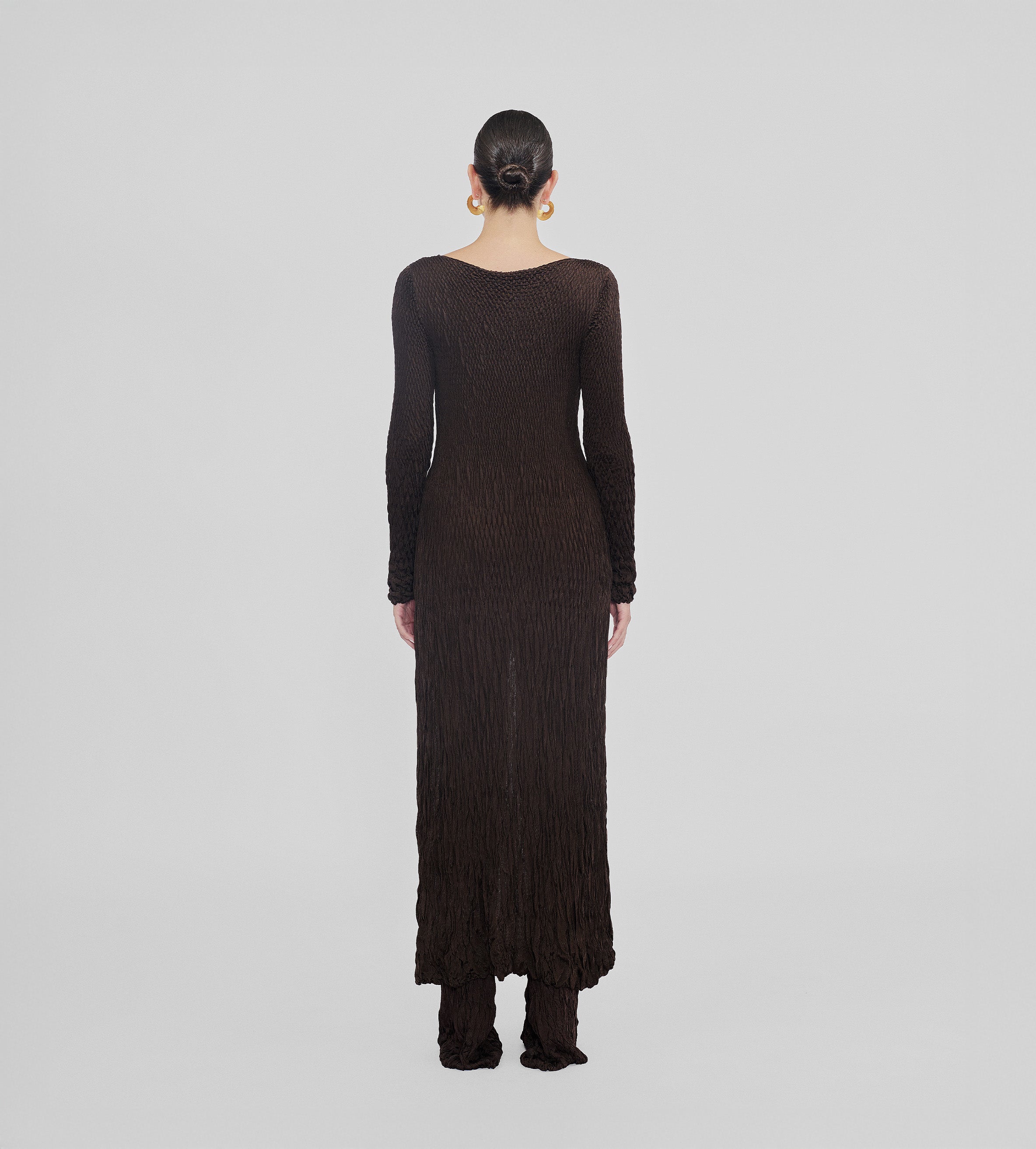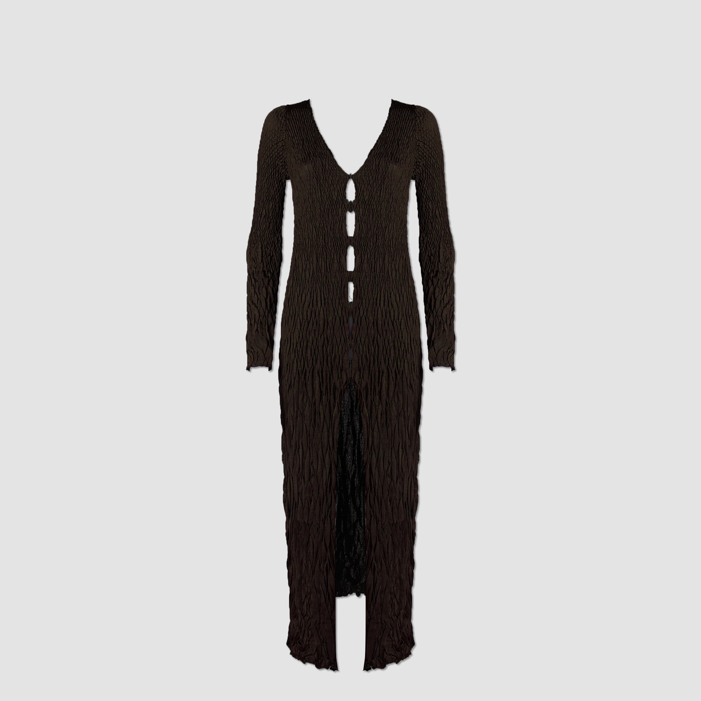 Long, fitted cardigan featuring a deep V-neckline, long sleek sleeves and a front opening that highlights the versatile styling options of this modern design. A fresh silhouette crafted from our new textured knit fabric, offering endless possibilities.