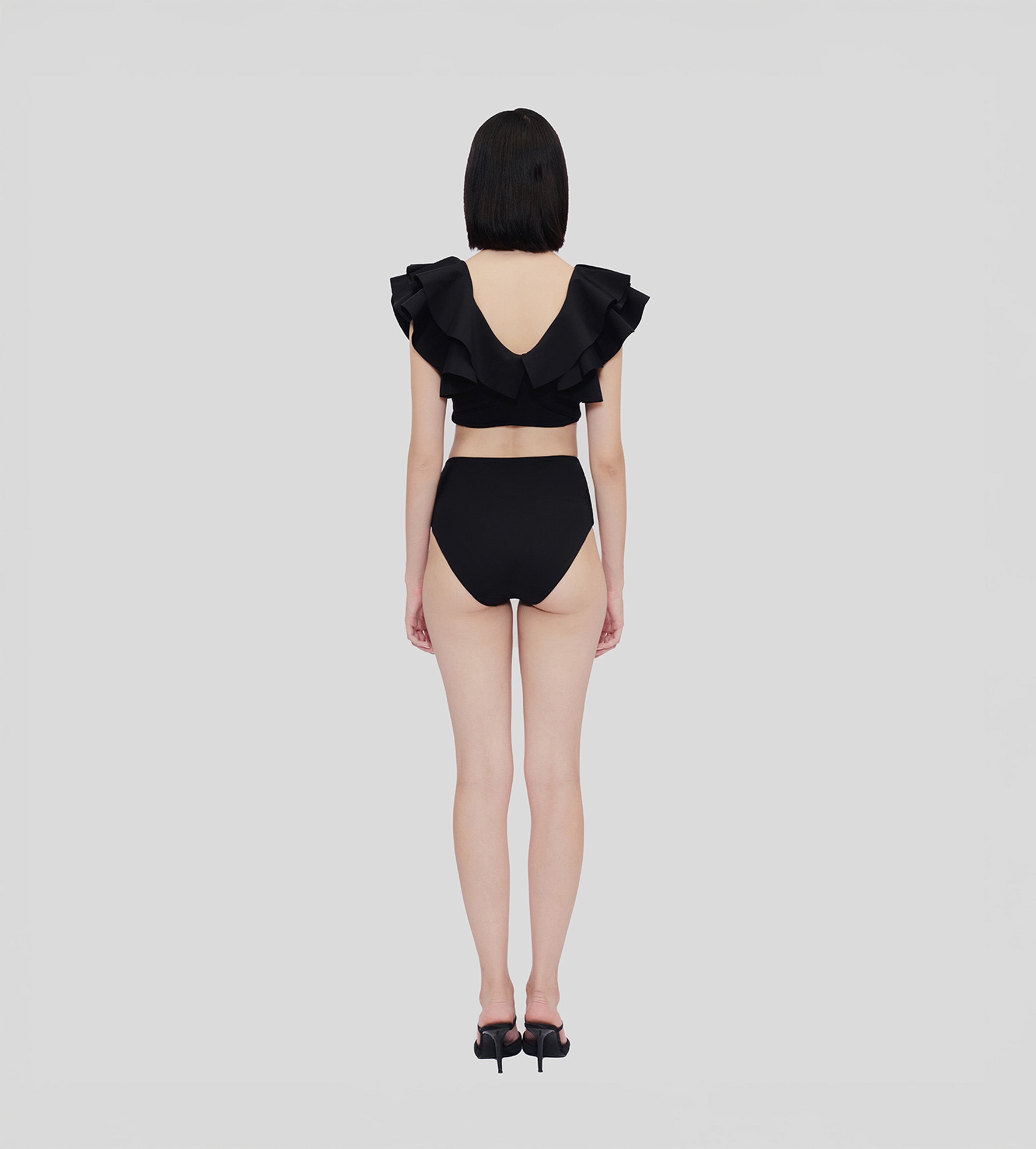 High-waisted two-piece swimsuit with a triangular-neckline top on the front and the back with double ruffles around the cleavage that cover the shoulders.