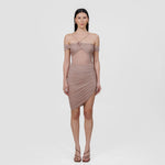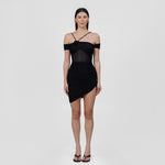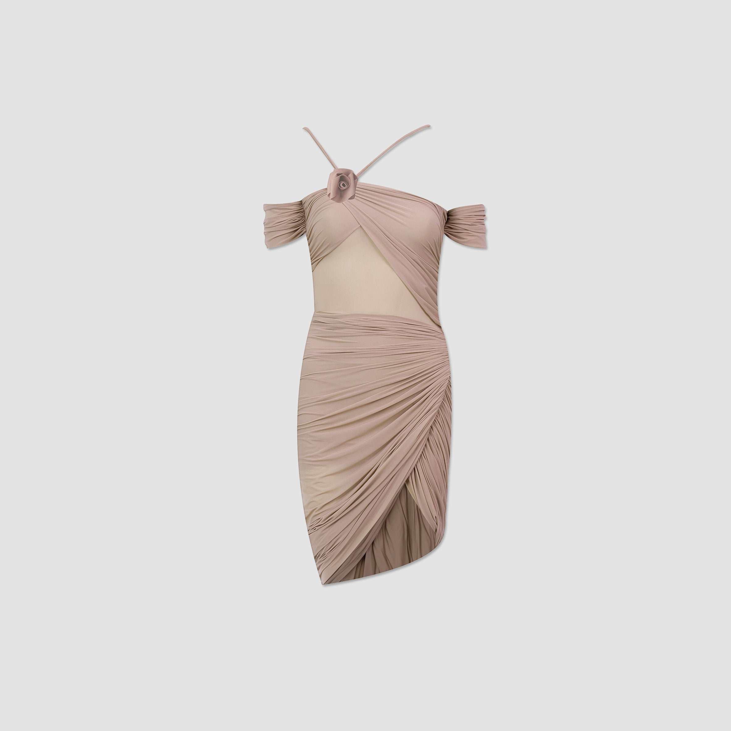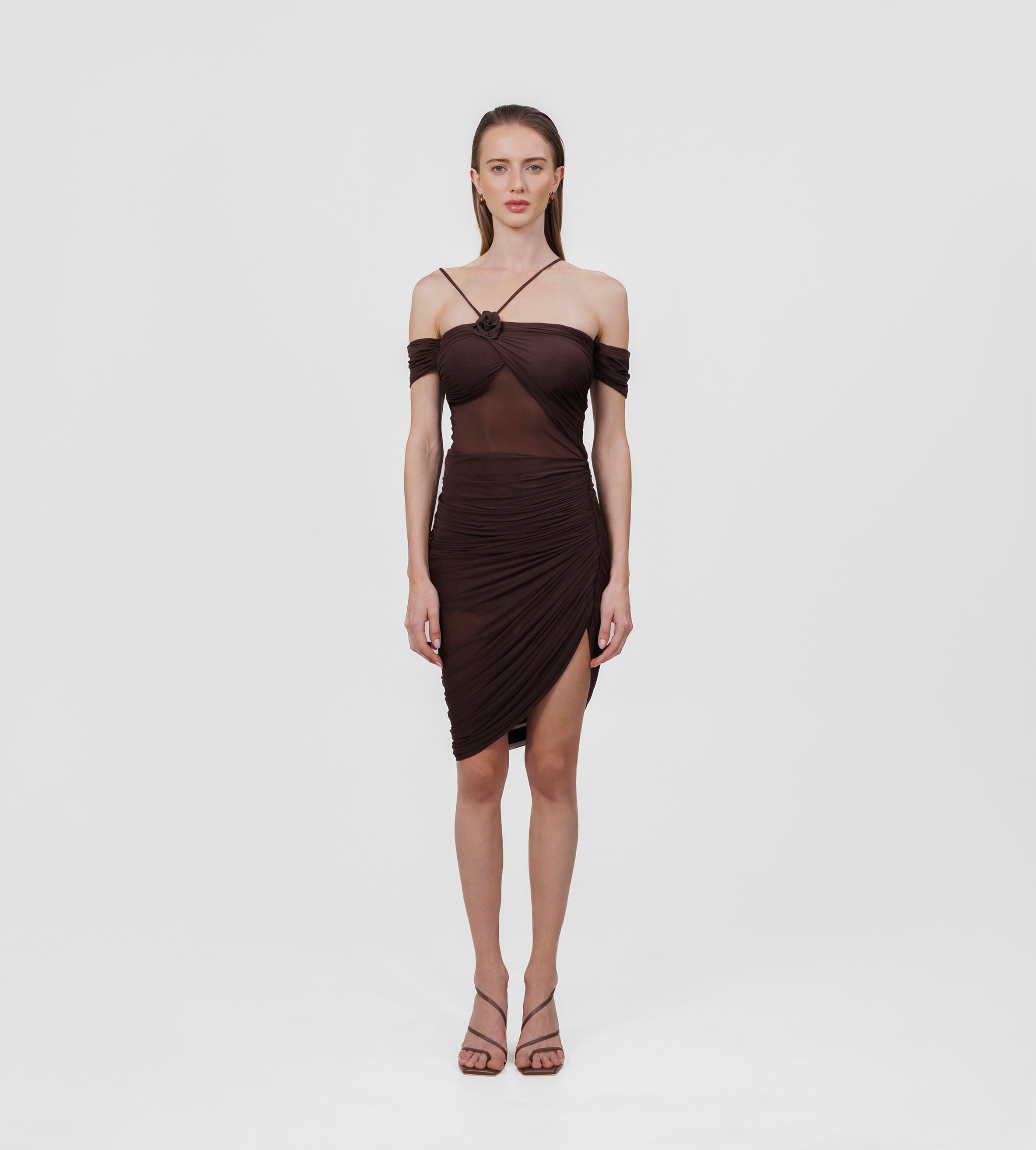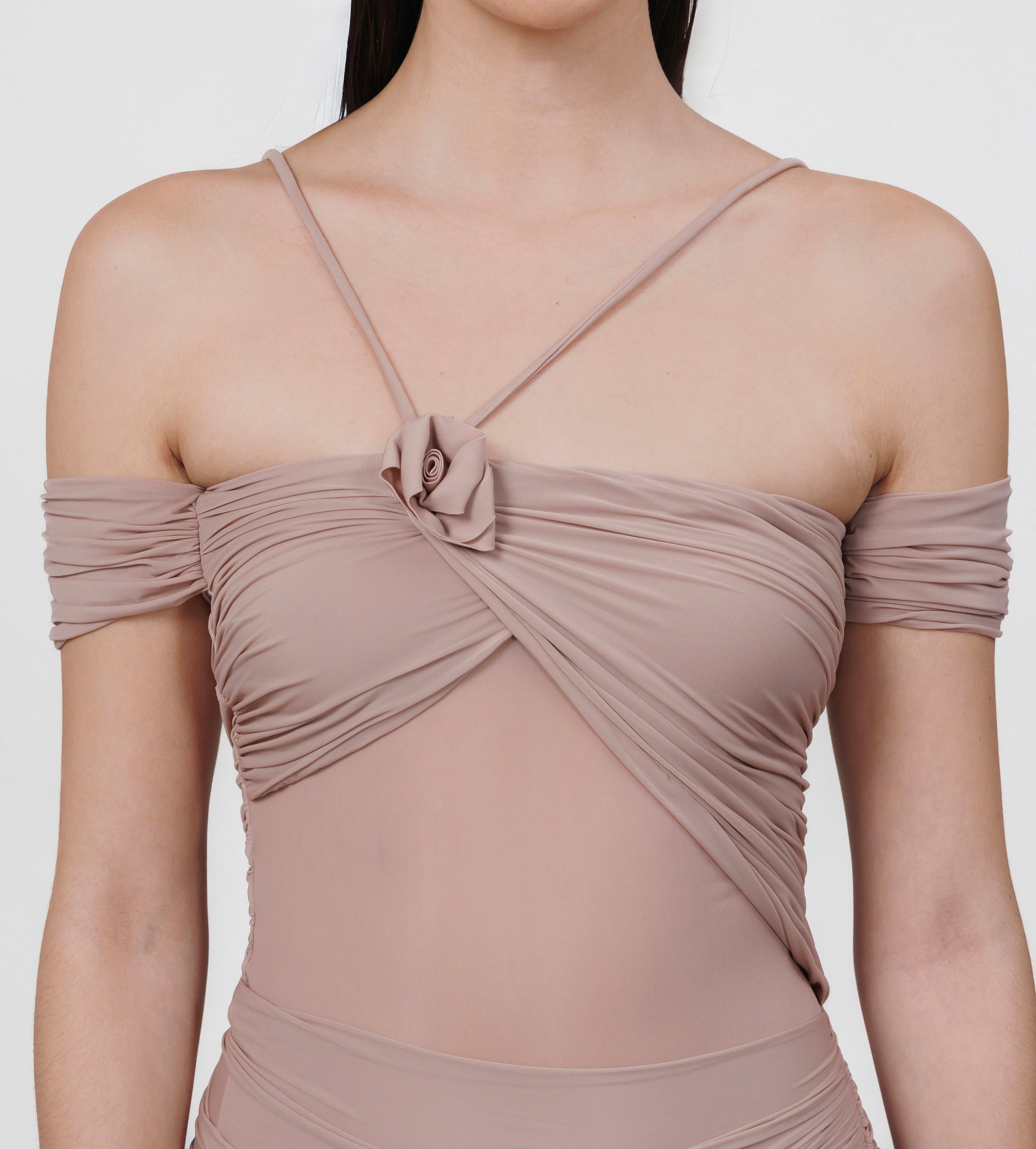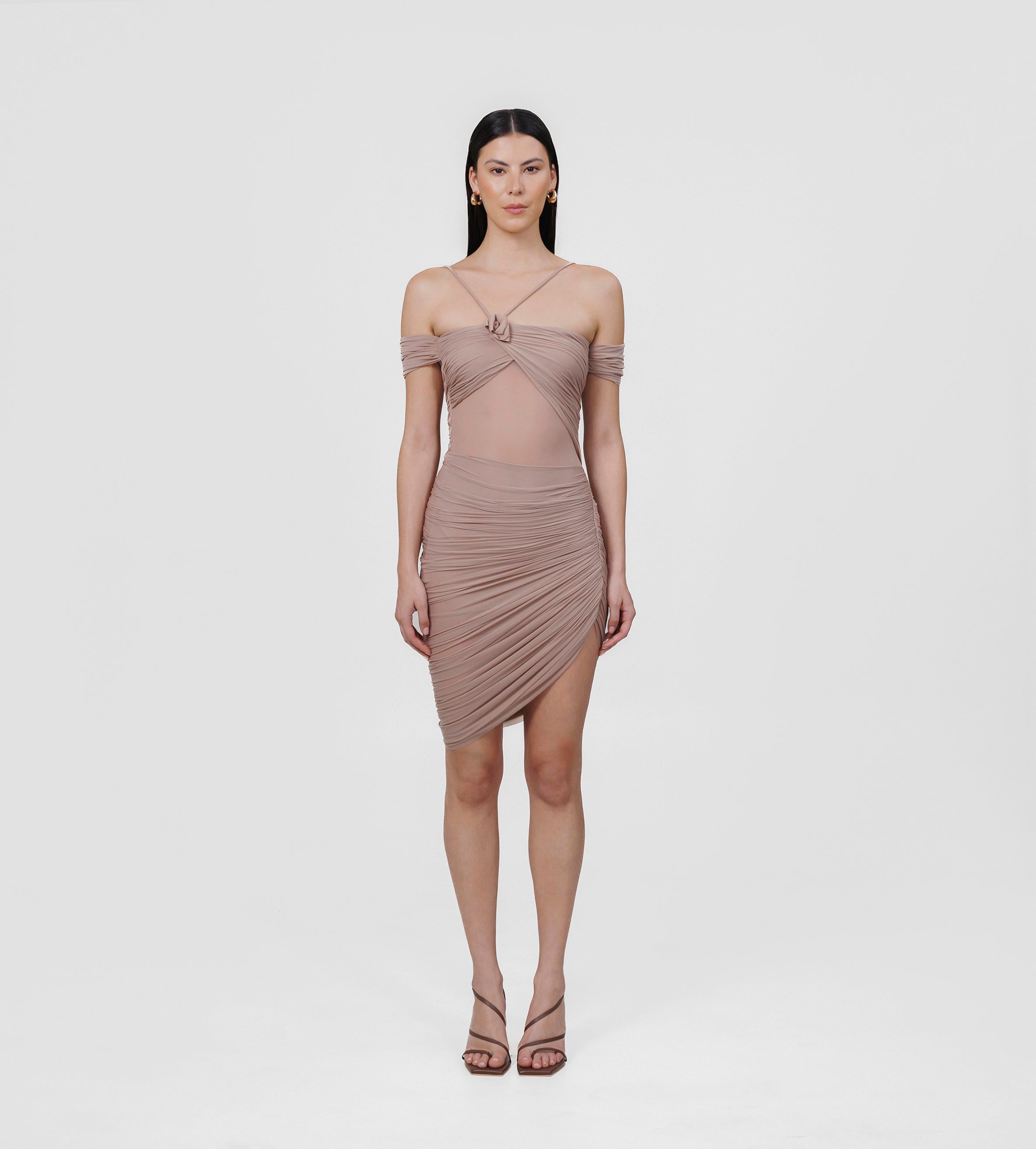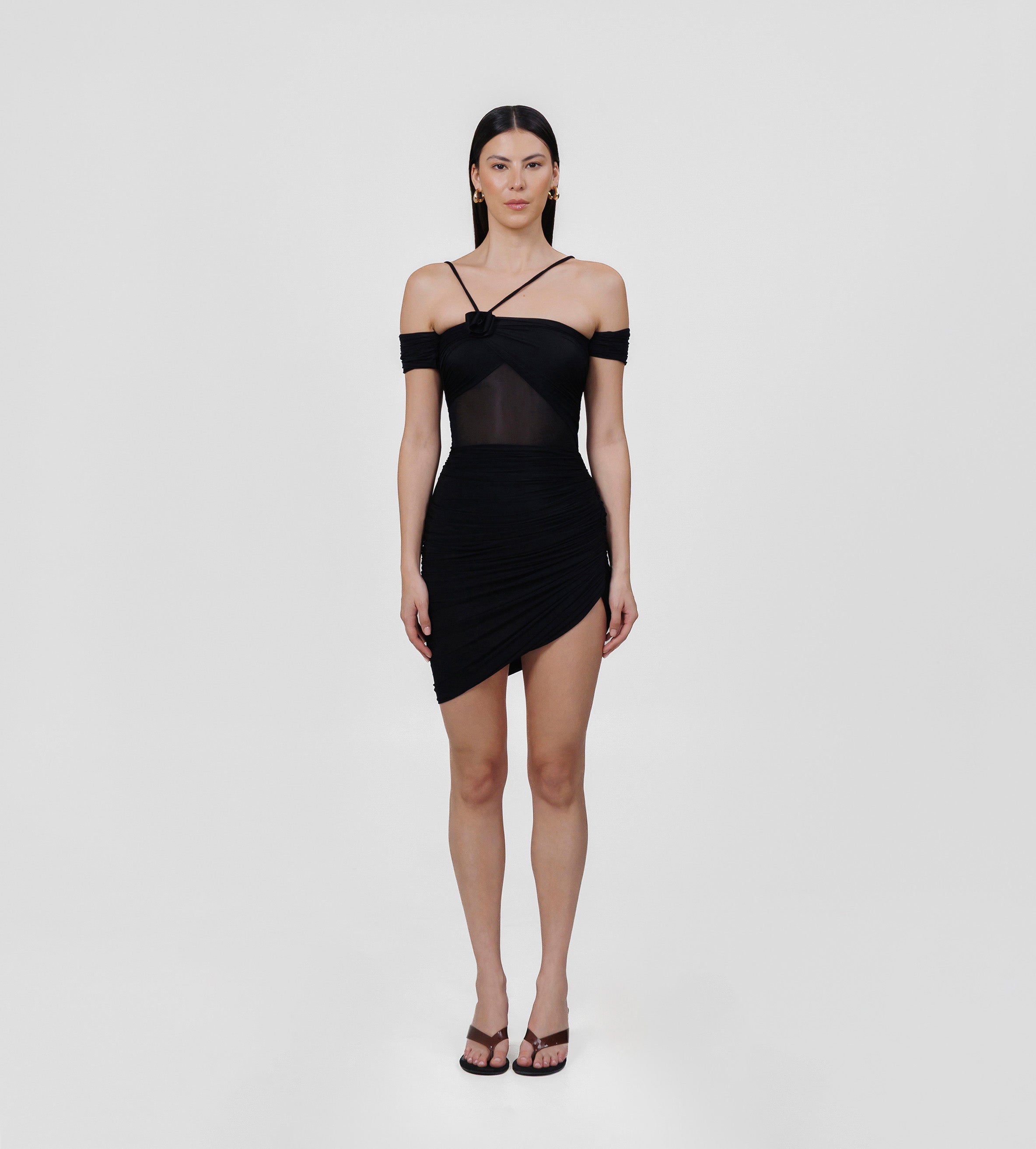 The Moreno mini dress features and off-shoulder neckline with short ruched sleeves and delicate thin straps that meet at a 3D floral embellishment at the front. The asymmetric bodice plays with a double-layer ruching and a sheer panel at the torso, flowing into a ruched wrap skirt and a fully gathered back—a perfect balance of texture and movement.