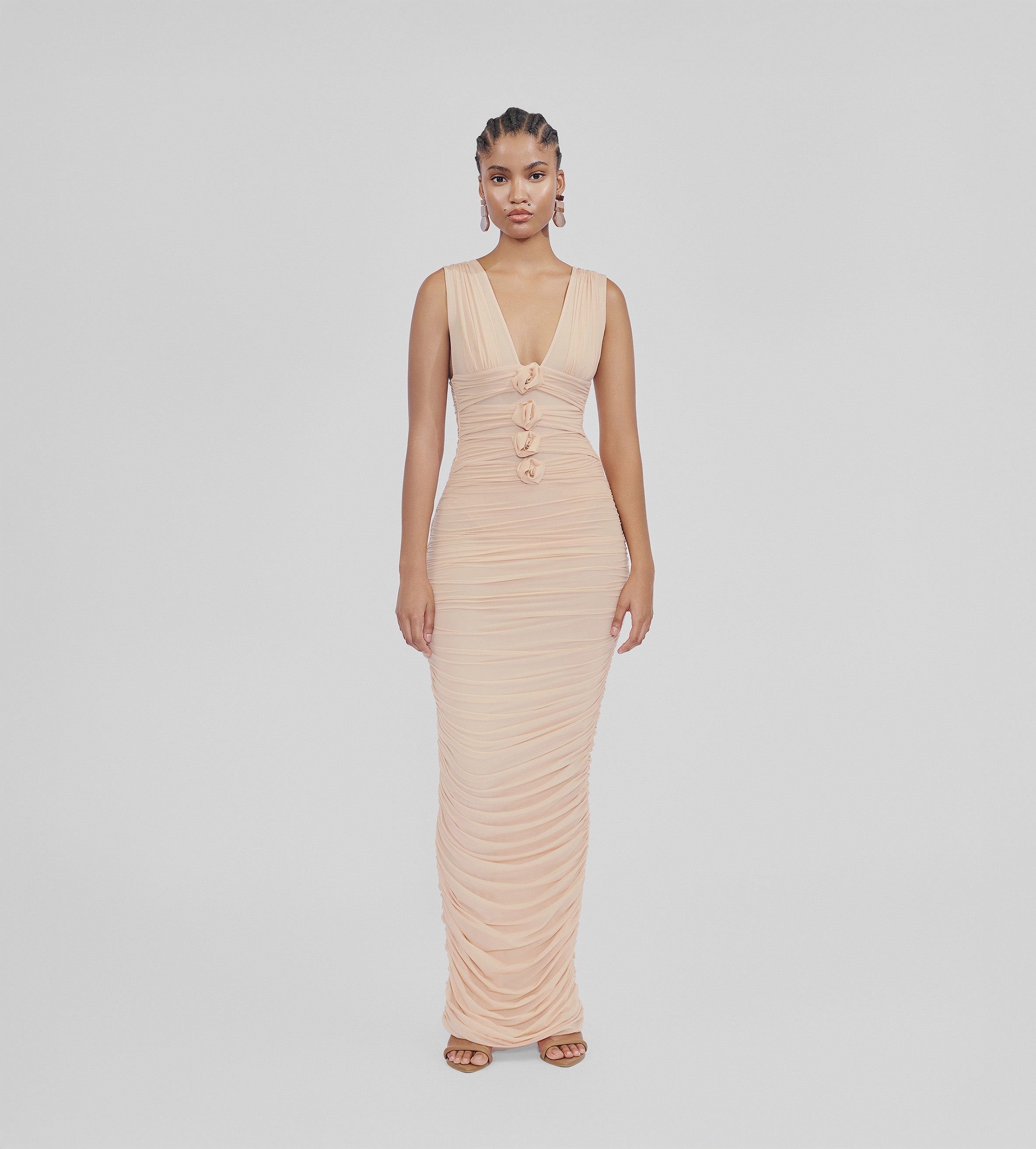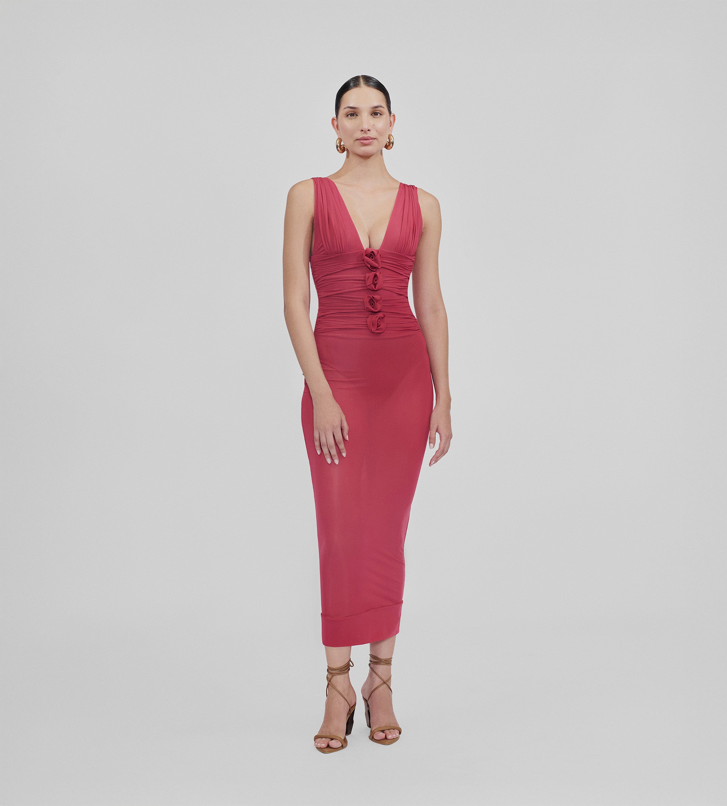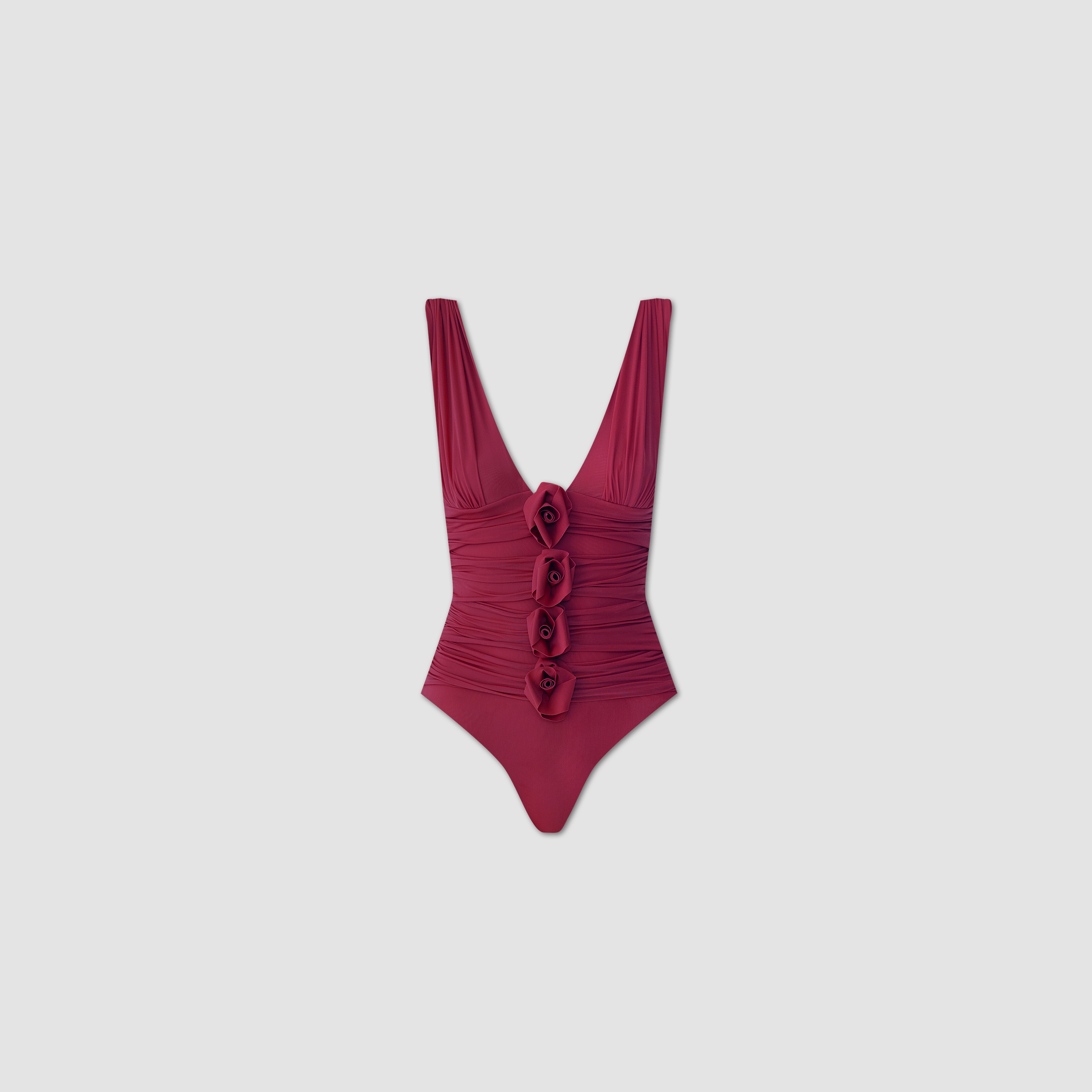 The Níspero bodysuit showcases a daring deep V plunging neckline, paired with strategically placed ruched straps that create a beautifully sculpted look. It is adorned with a delicate line of our 3D flower design. Made completely from our semi-transparent lycra.