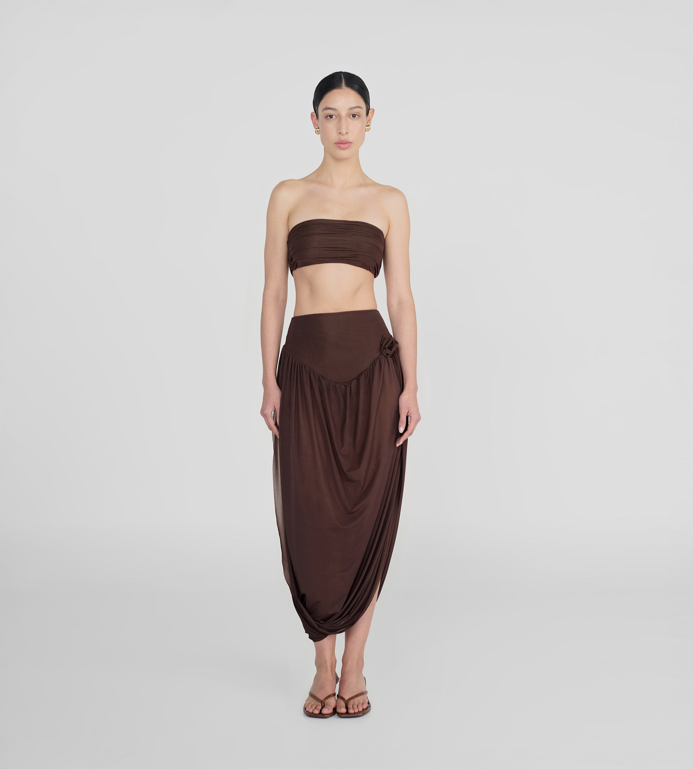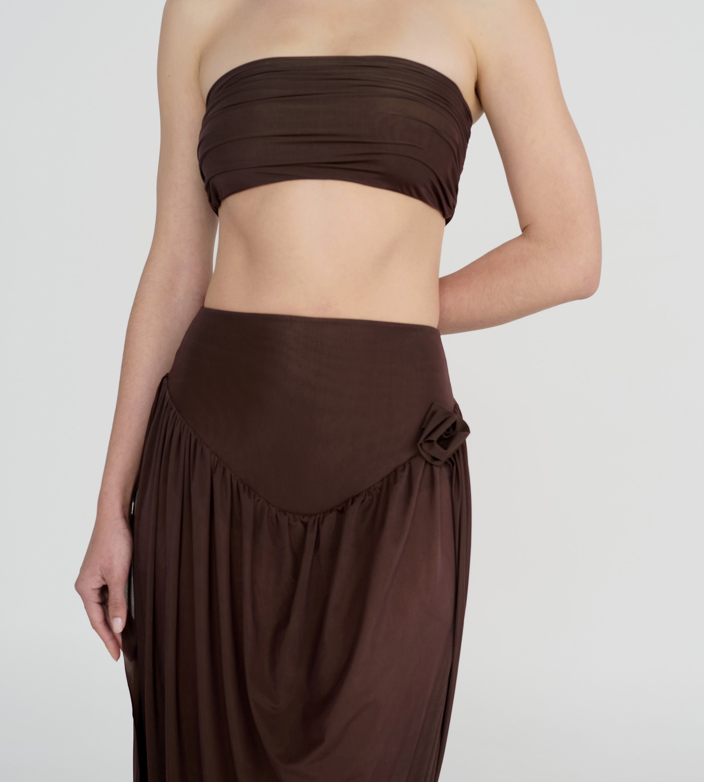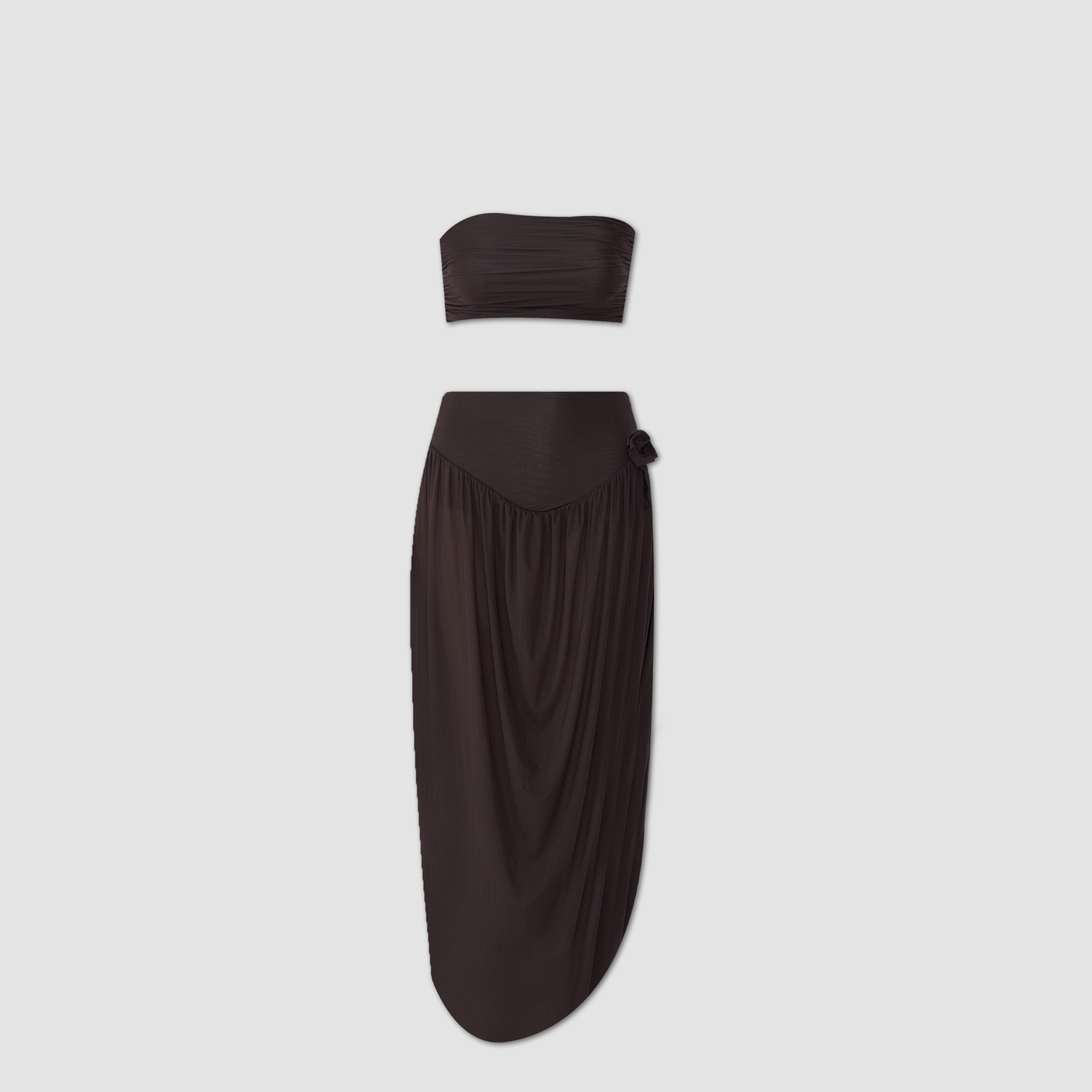 The Noriega set features a ruched, strapless tube-top paired with a long skirt, designed with a V-shape finish at front that flows into a twisted, draped silhouette, with a sensual side slit and 3D floral detail at the waist.