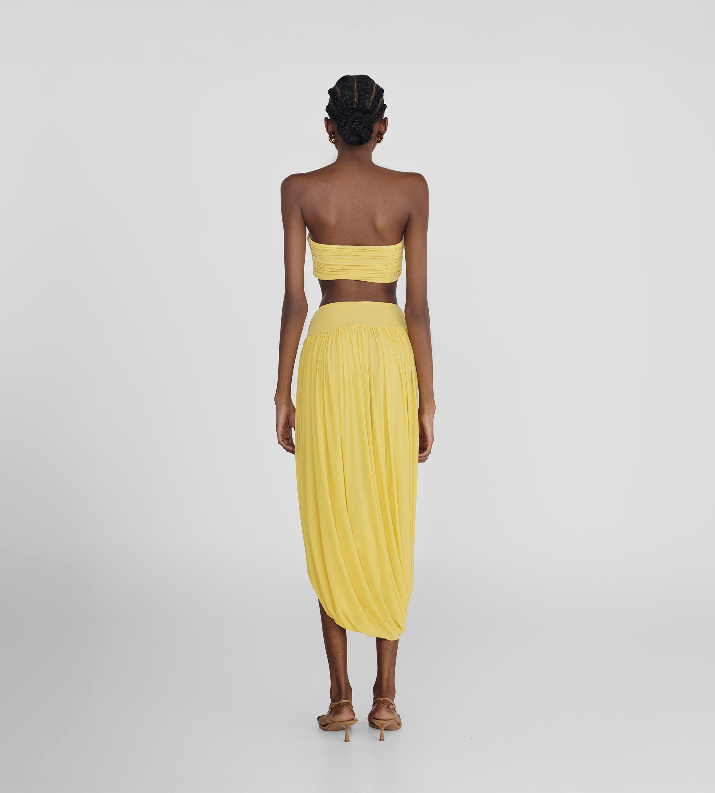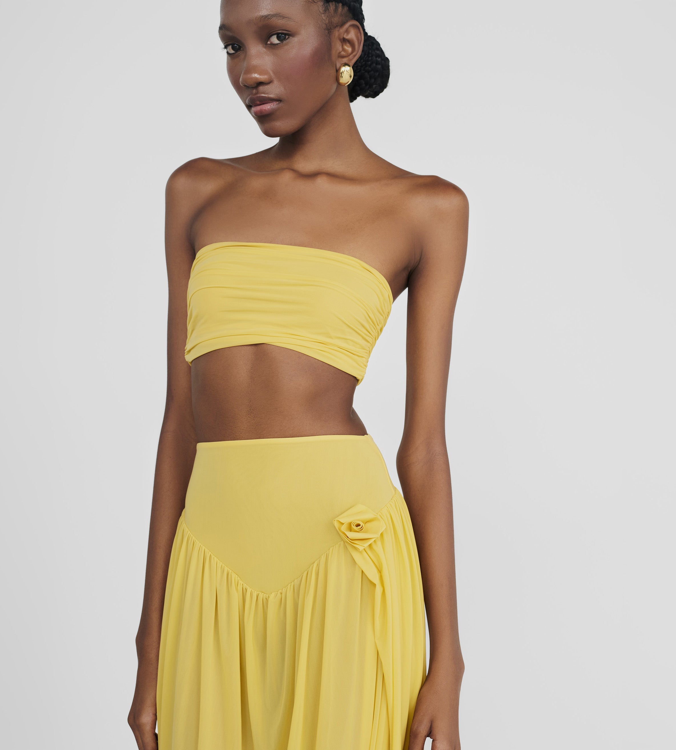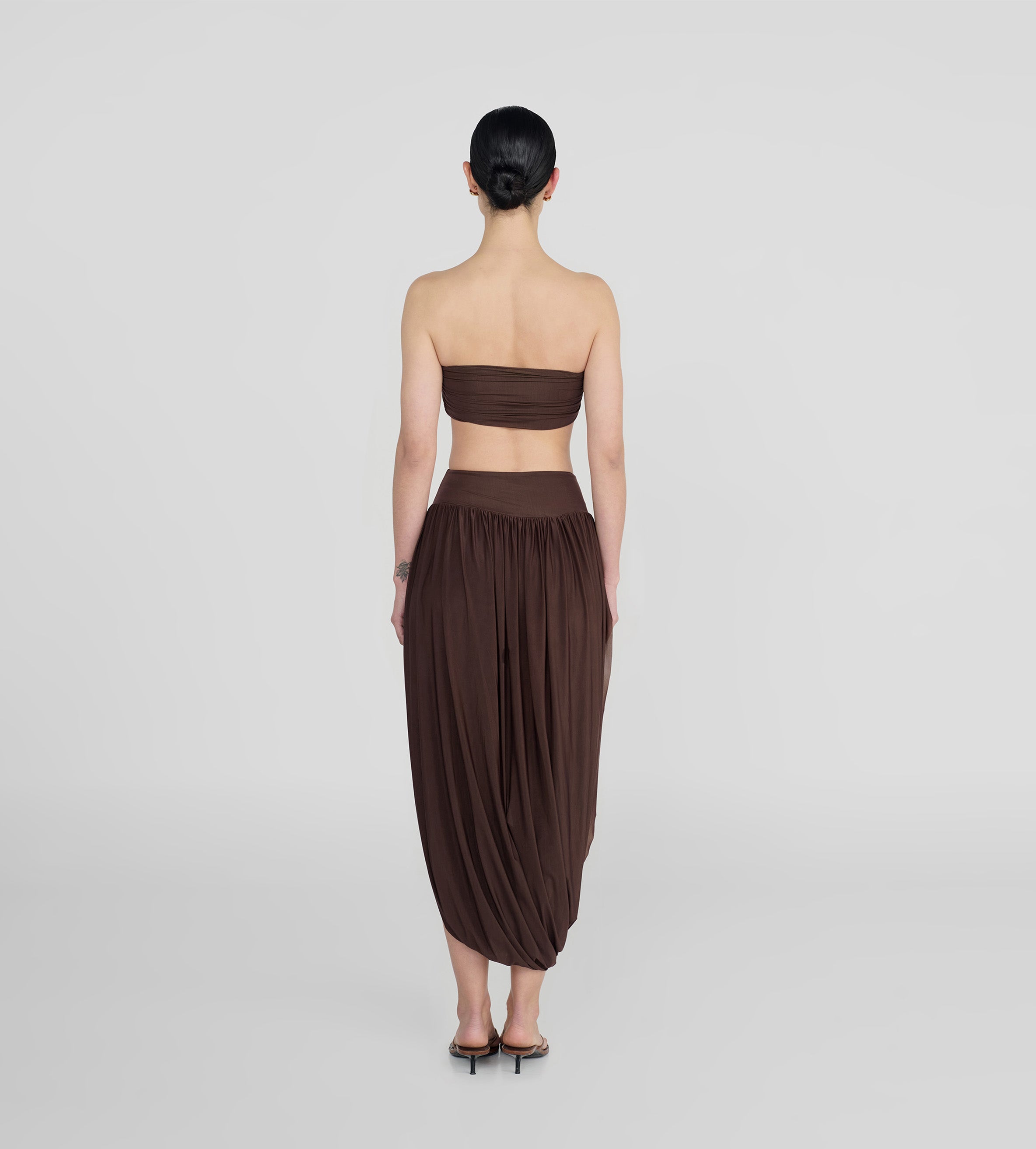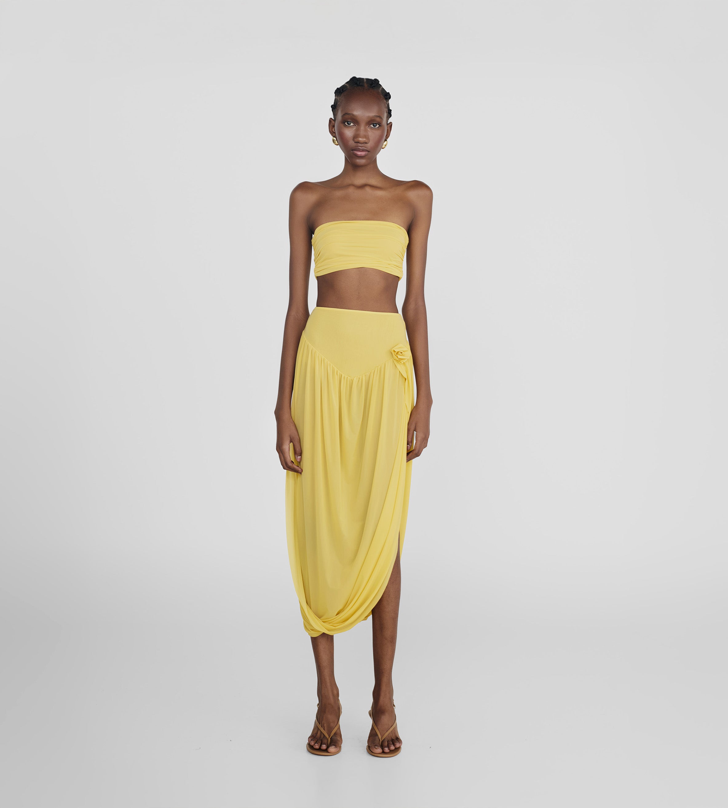 The Noriega set features a ruched, strapless tube-top paired with a long skirt, designed with a V-shape finish at front that flows into a twisted, draped silhouette, with a sensual side slit and 3D floral detail at the waist.