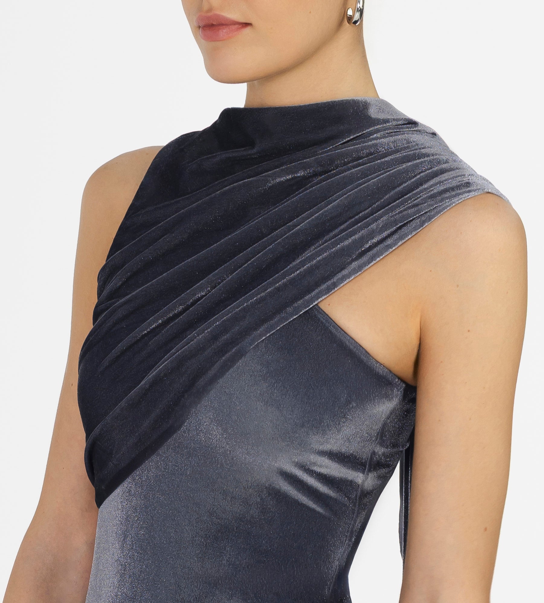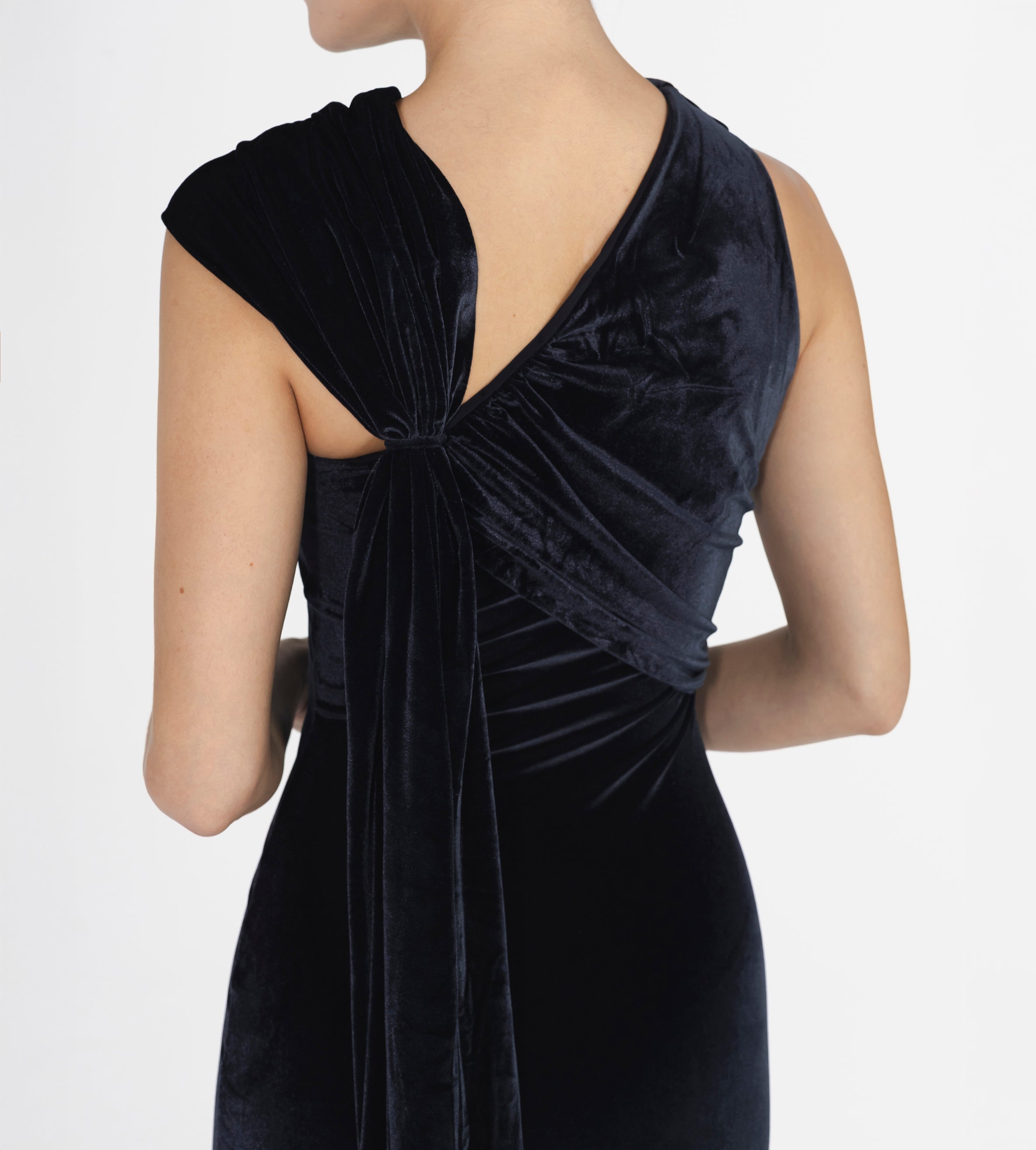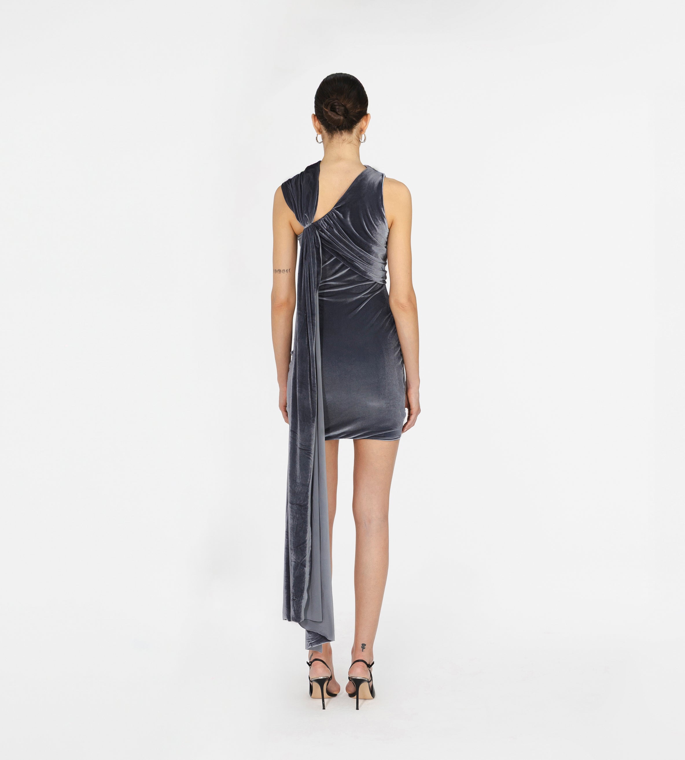 The Rodin mini dress features a high, draped neckline that cascades diagonally across the front, extending into a long, adjustable sash that flows down the back for a dramatic effect. Its asymmetric design hugs the body with a second-skin fit, creating a bold yet refined silhouette.