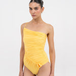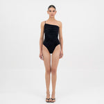 flows into a deeply ruched silhouette. A diagonal front detail frames the body