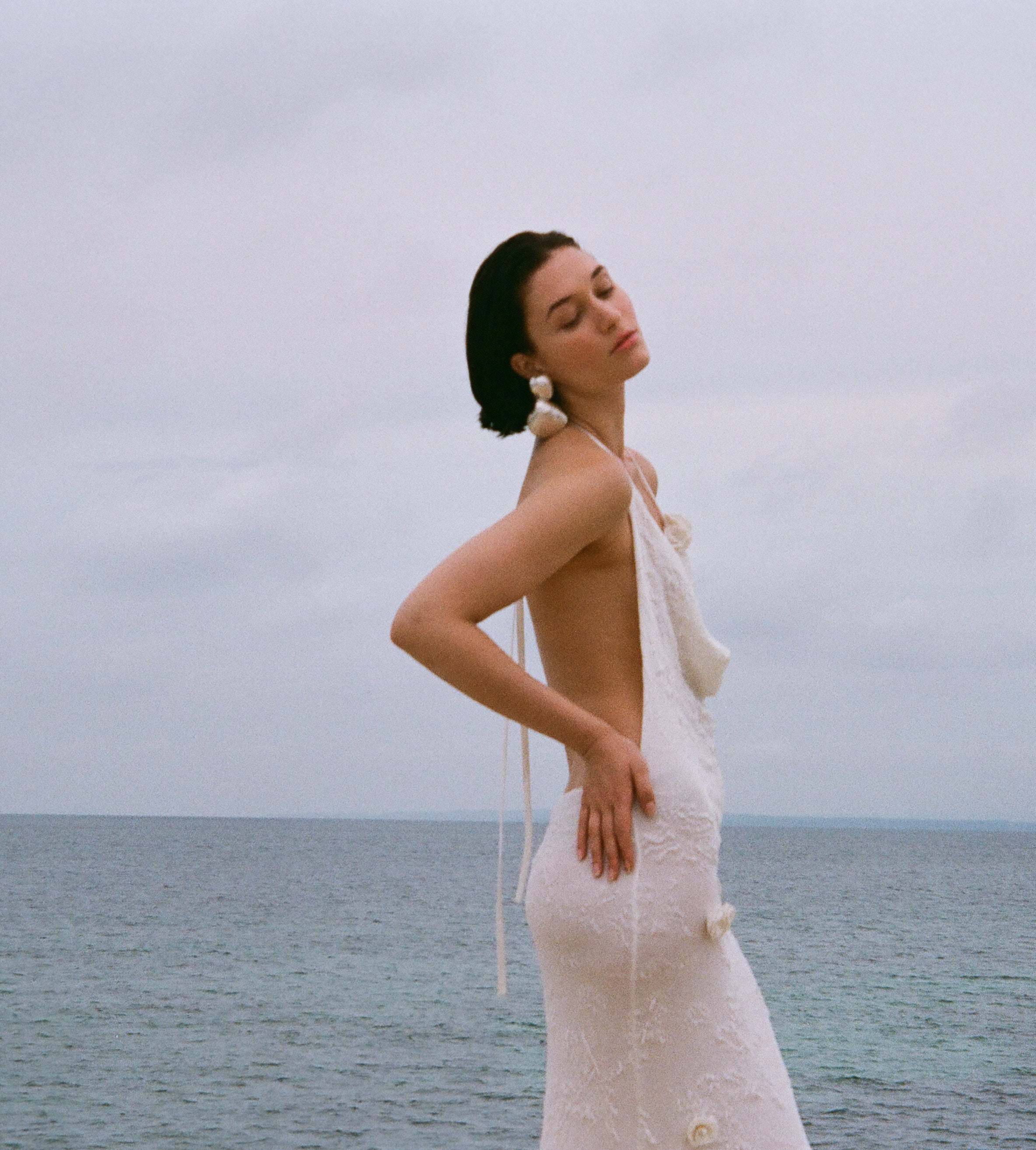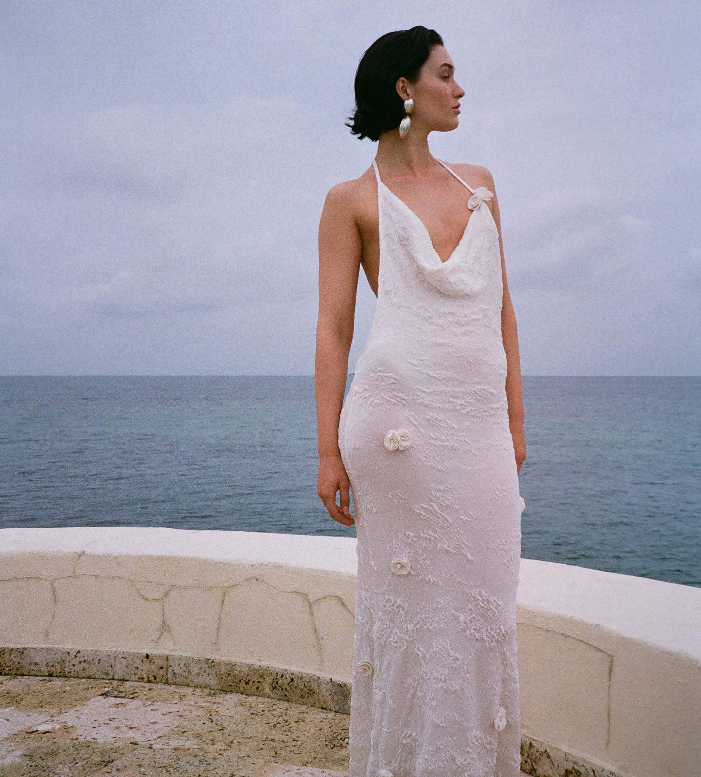 The Tal Para Cual long dress, crafted from an exquisite, delicately floral-textured Italian knit with body-contouring softness, seamlessly blends a dramatic deep cowl neckline with delicate, thin straps that tie gracefully at the neck. Its sleek mermaid silhouette is elegantly complemented by a striking open back, adorned with strategically placed 3D floral accents that highlight our new floral design.