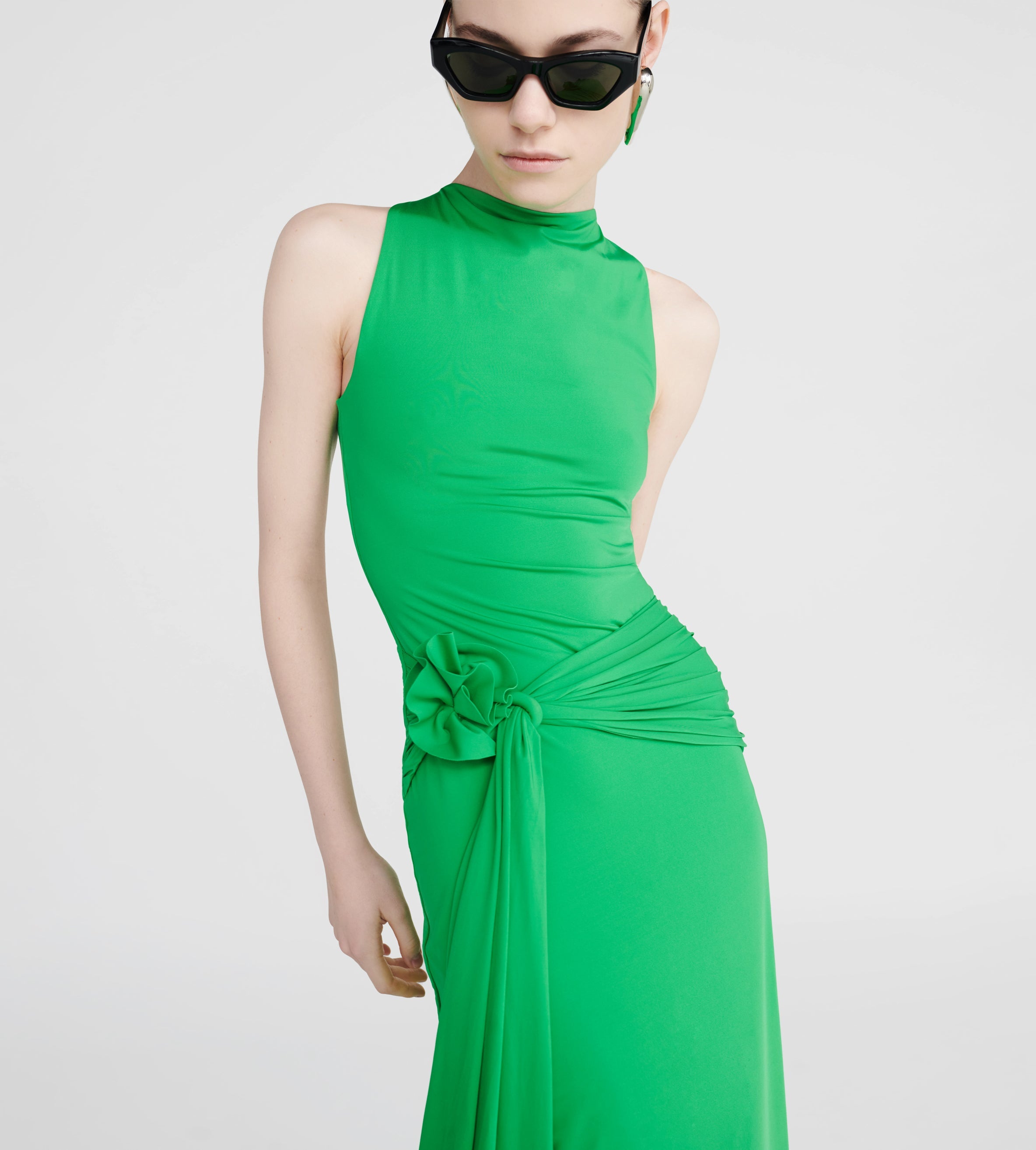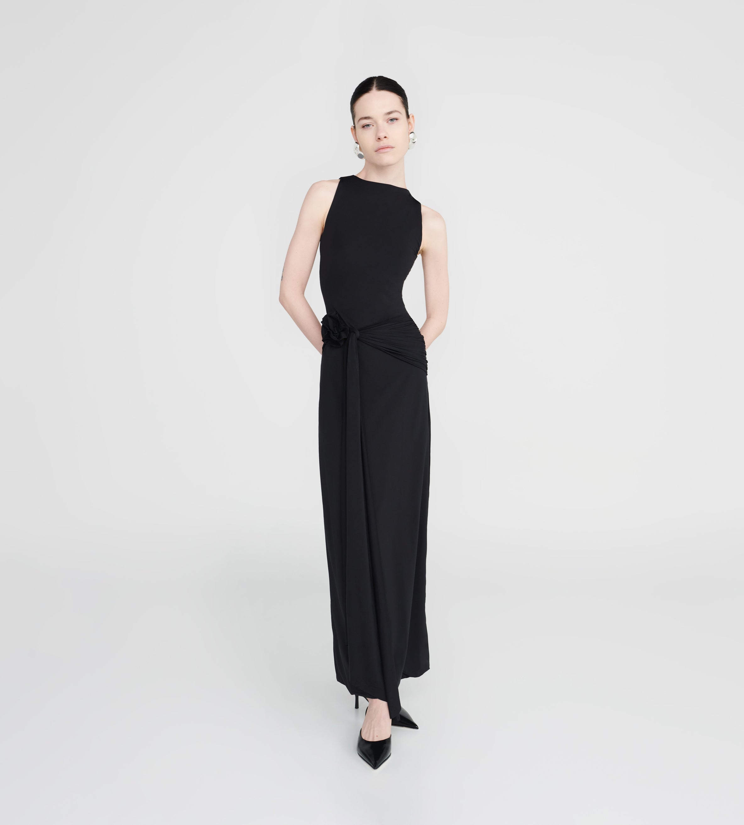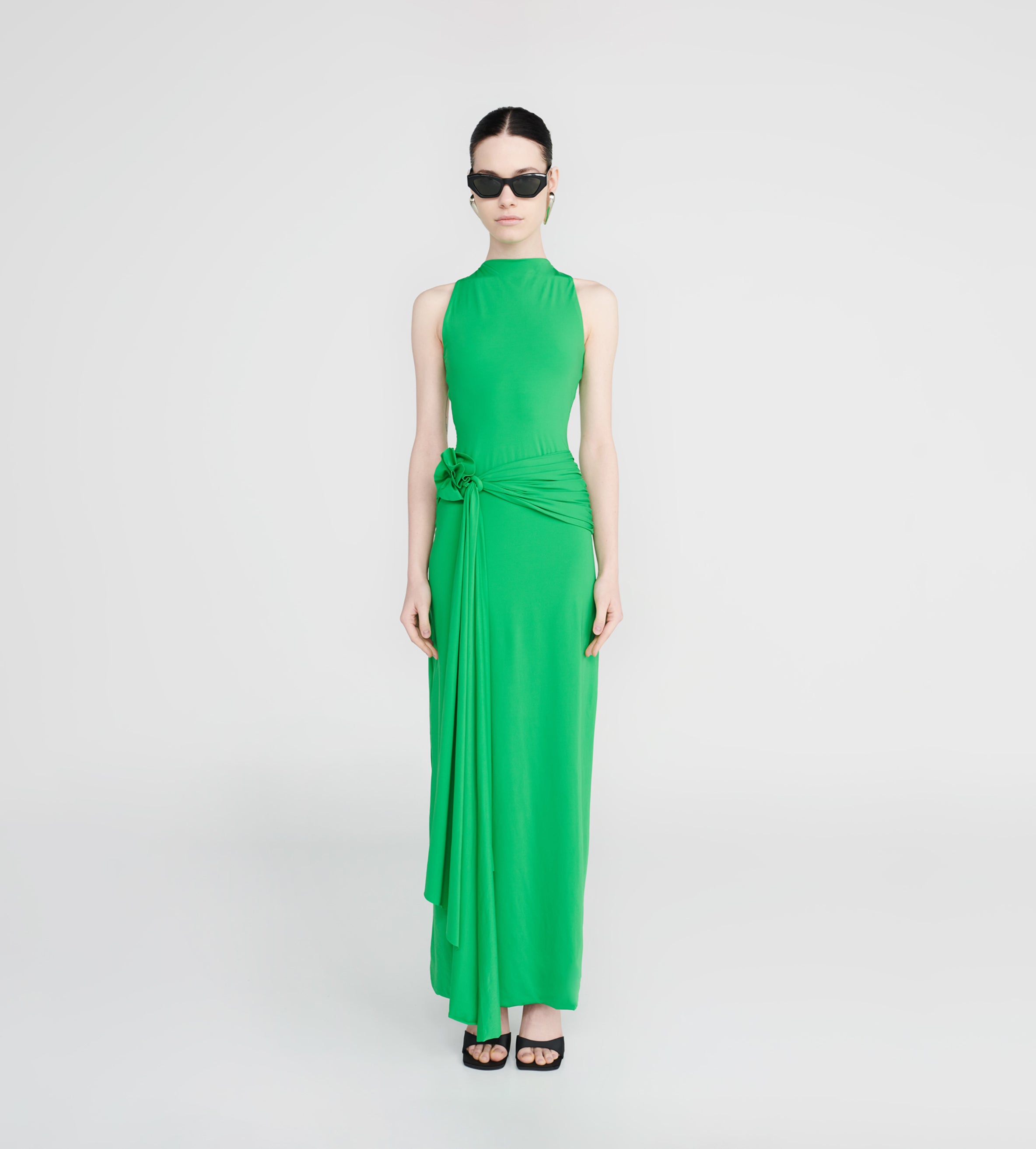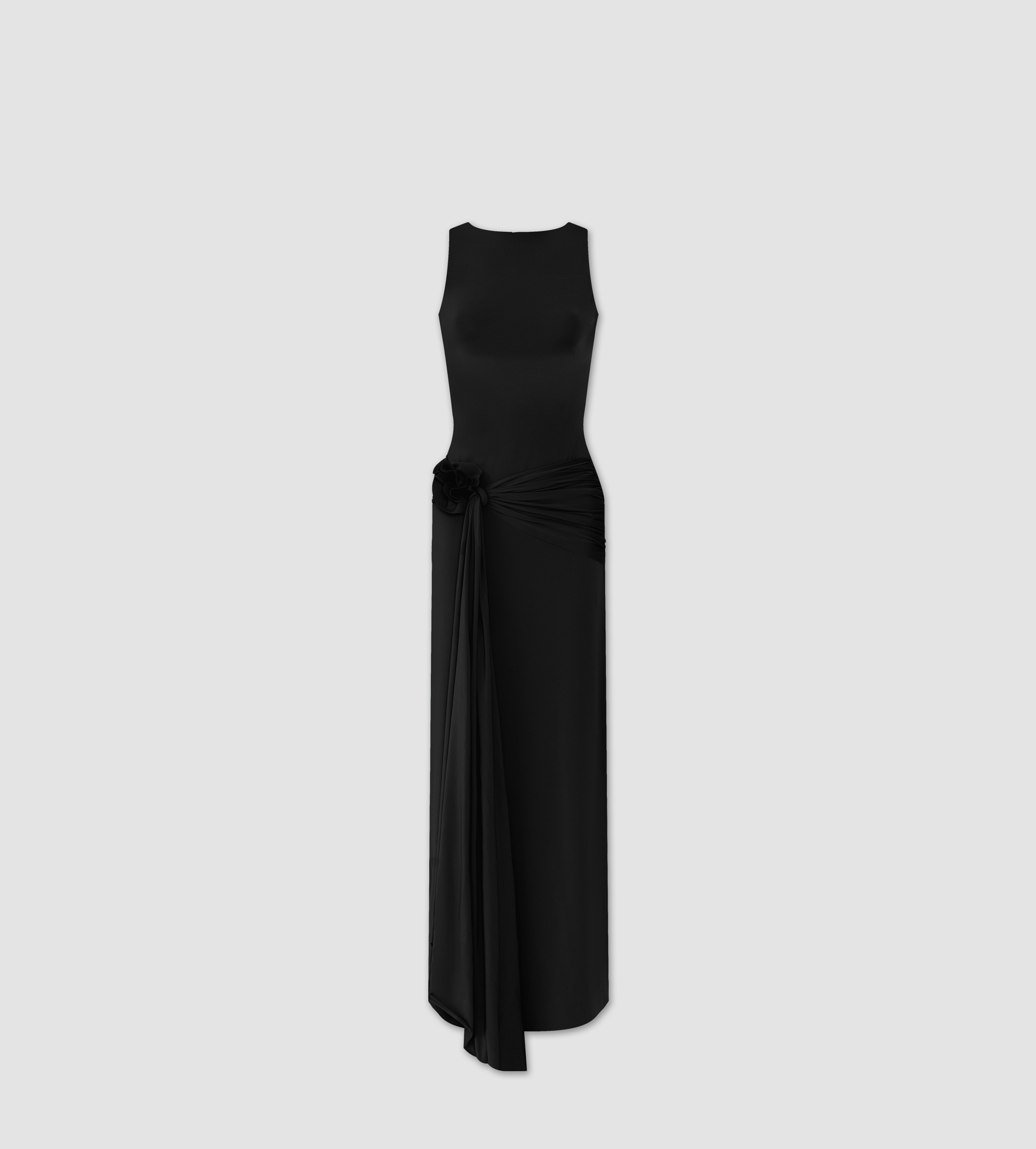 Our Tirso long dress is the ultimate fitted dress, with a round neckline at the front and a sensual open back. It hugs the body in all the right places and features a ruched adjustable sash at the waist for that extra detail. Finished with a 3D handmade flower detail, it's an alluring and powerful mix.