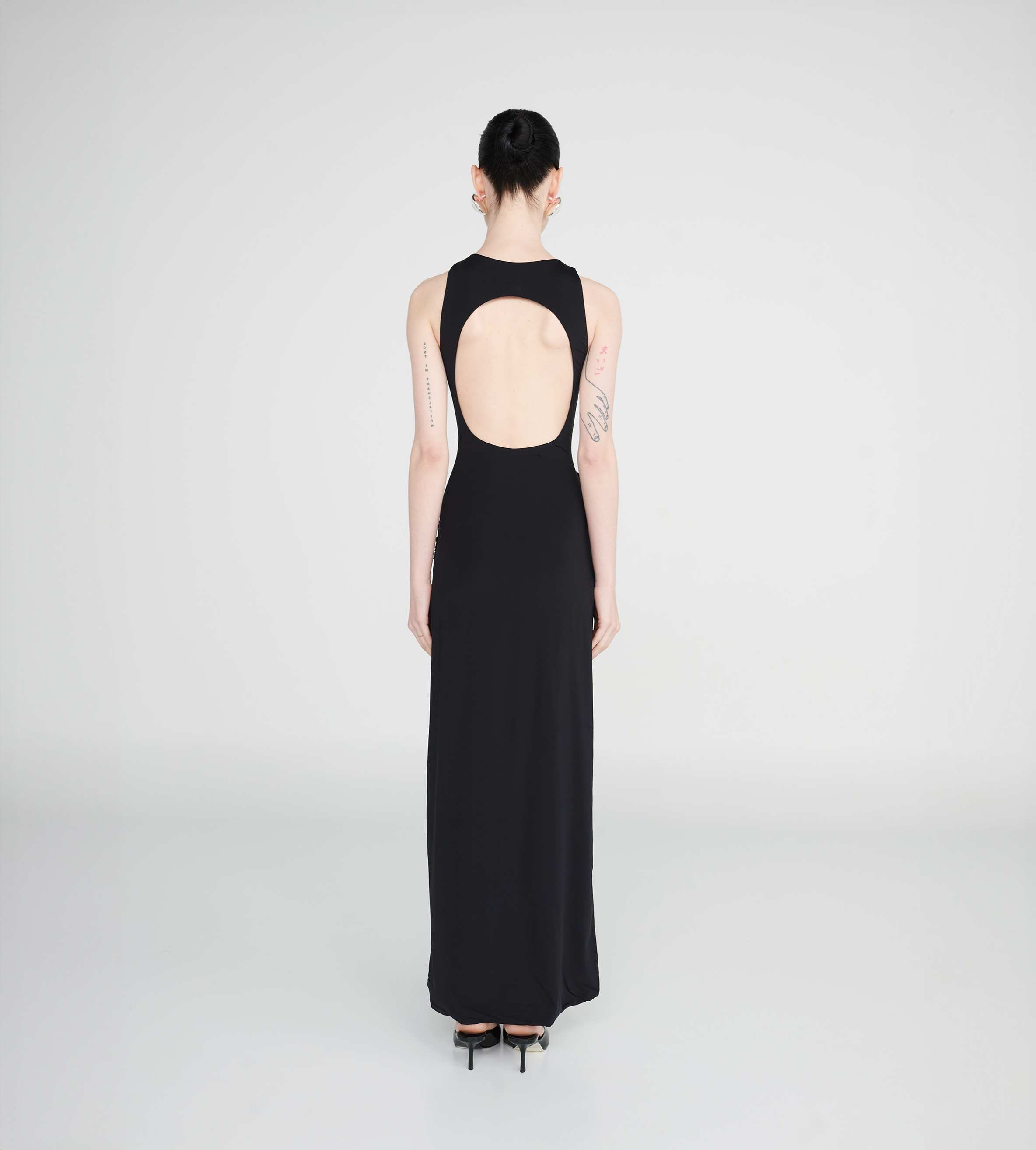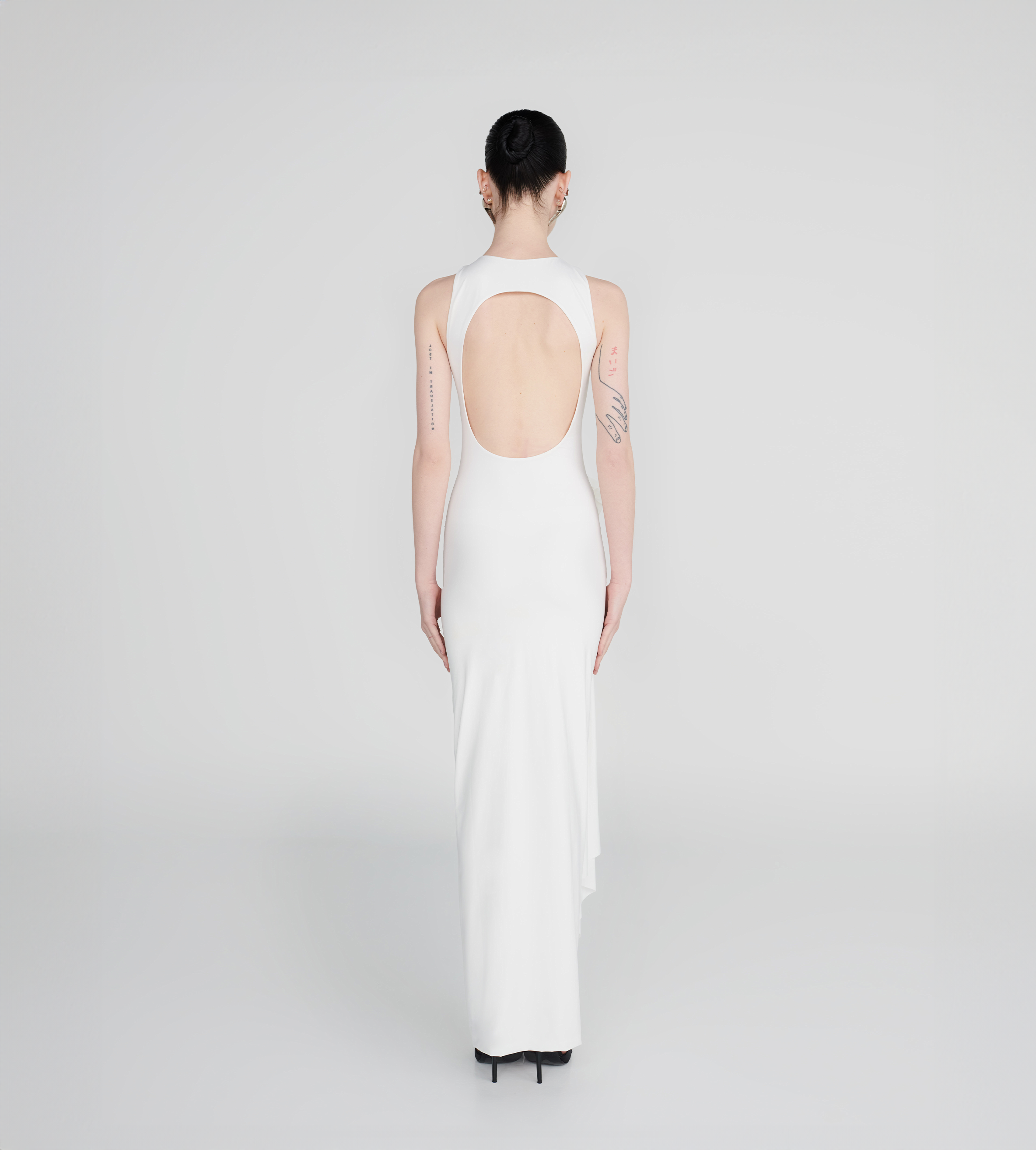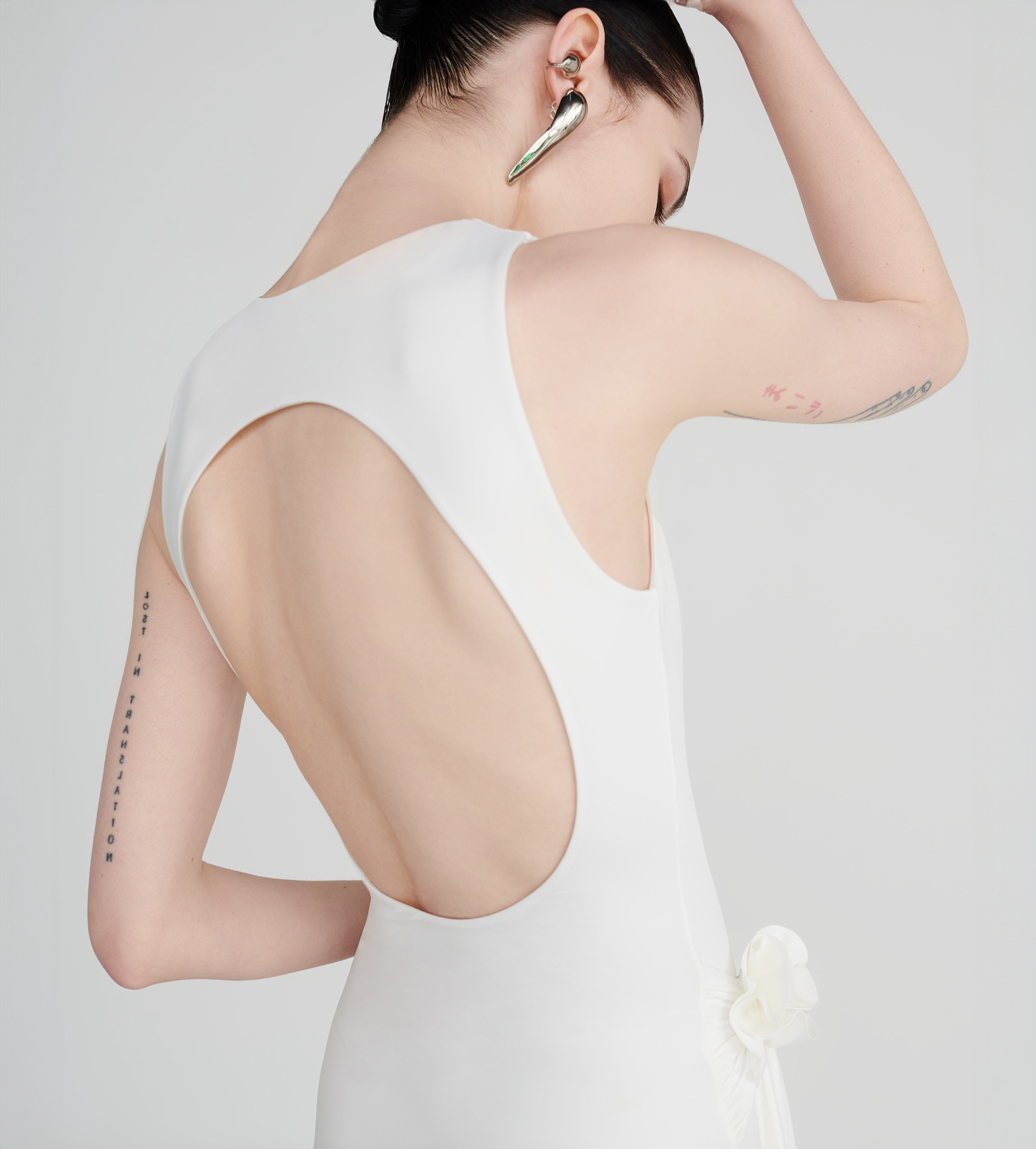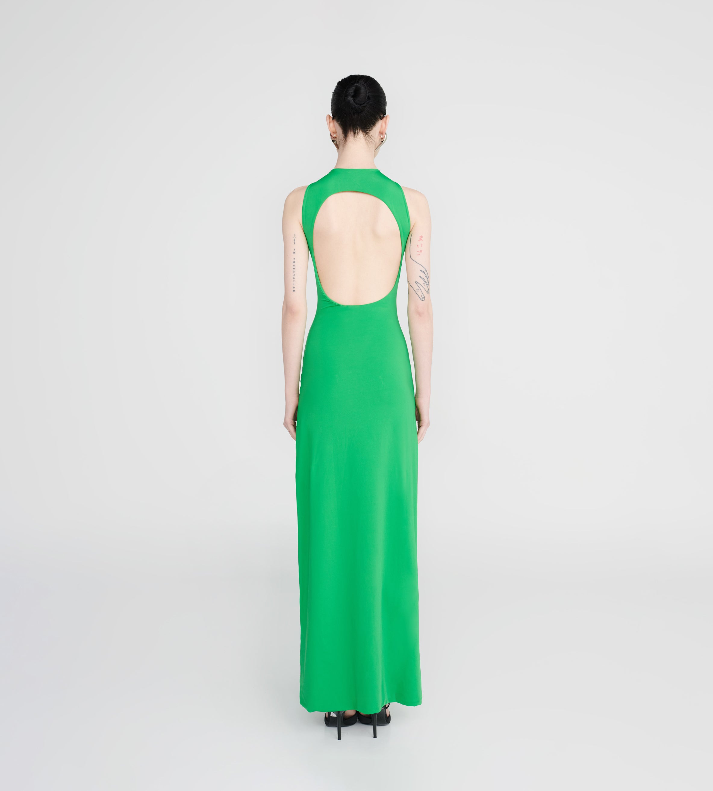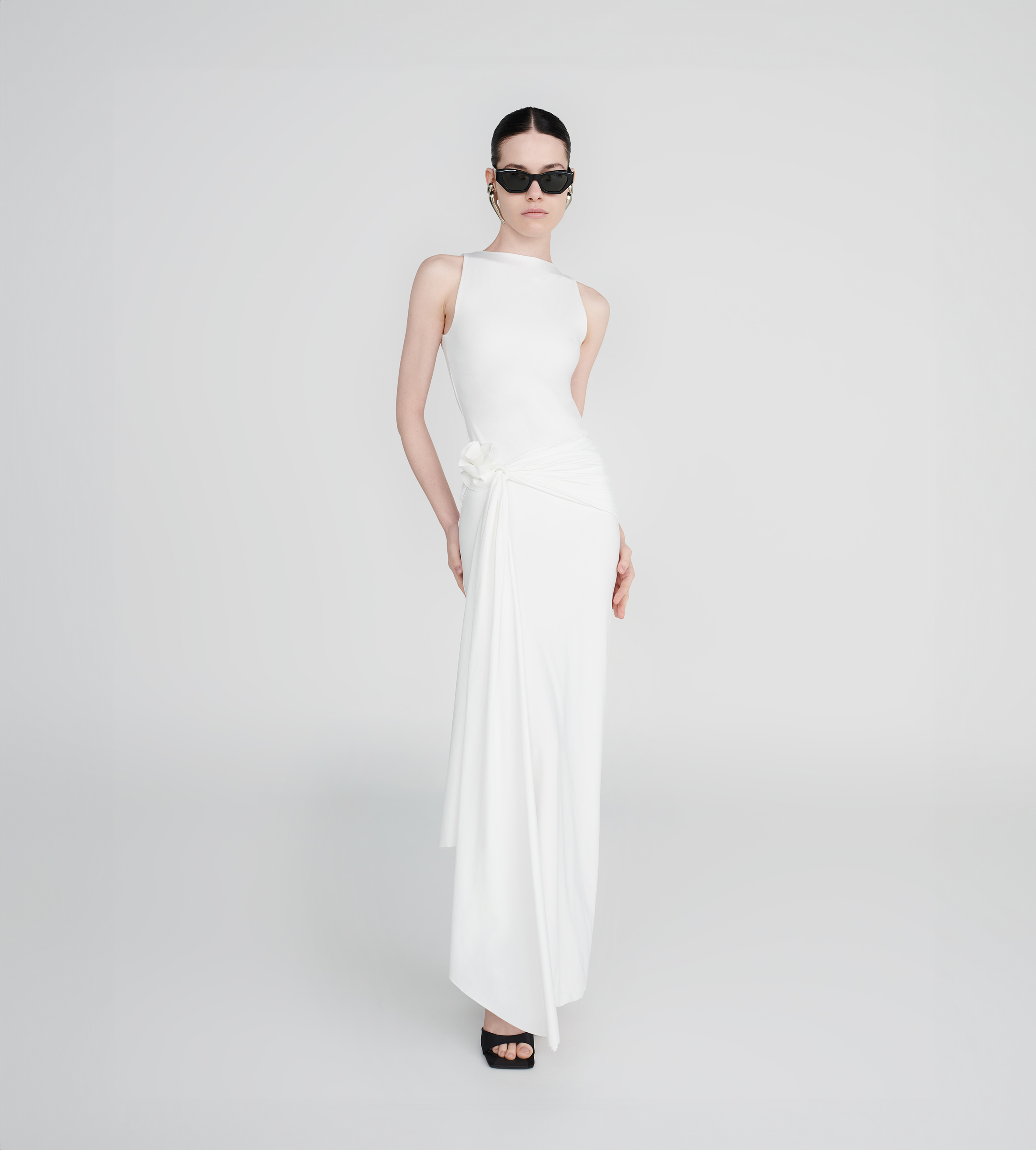 Our Tirso long dress is the ultimate fitted dress, with a round neckline at the front and a sensual open back. It hugs the body in all the right places and features a ruched adjustable sash at the waist for that extra detail. Finished with a 3D handmade flower detail, it's an alluring and powerful mix.