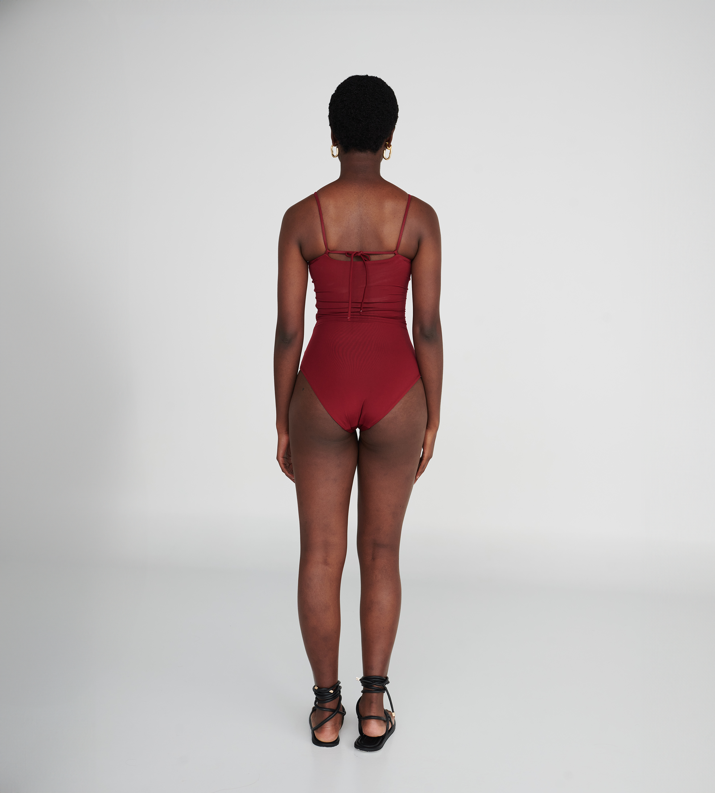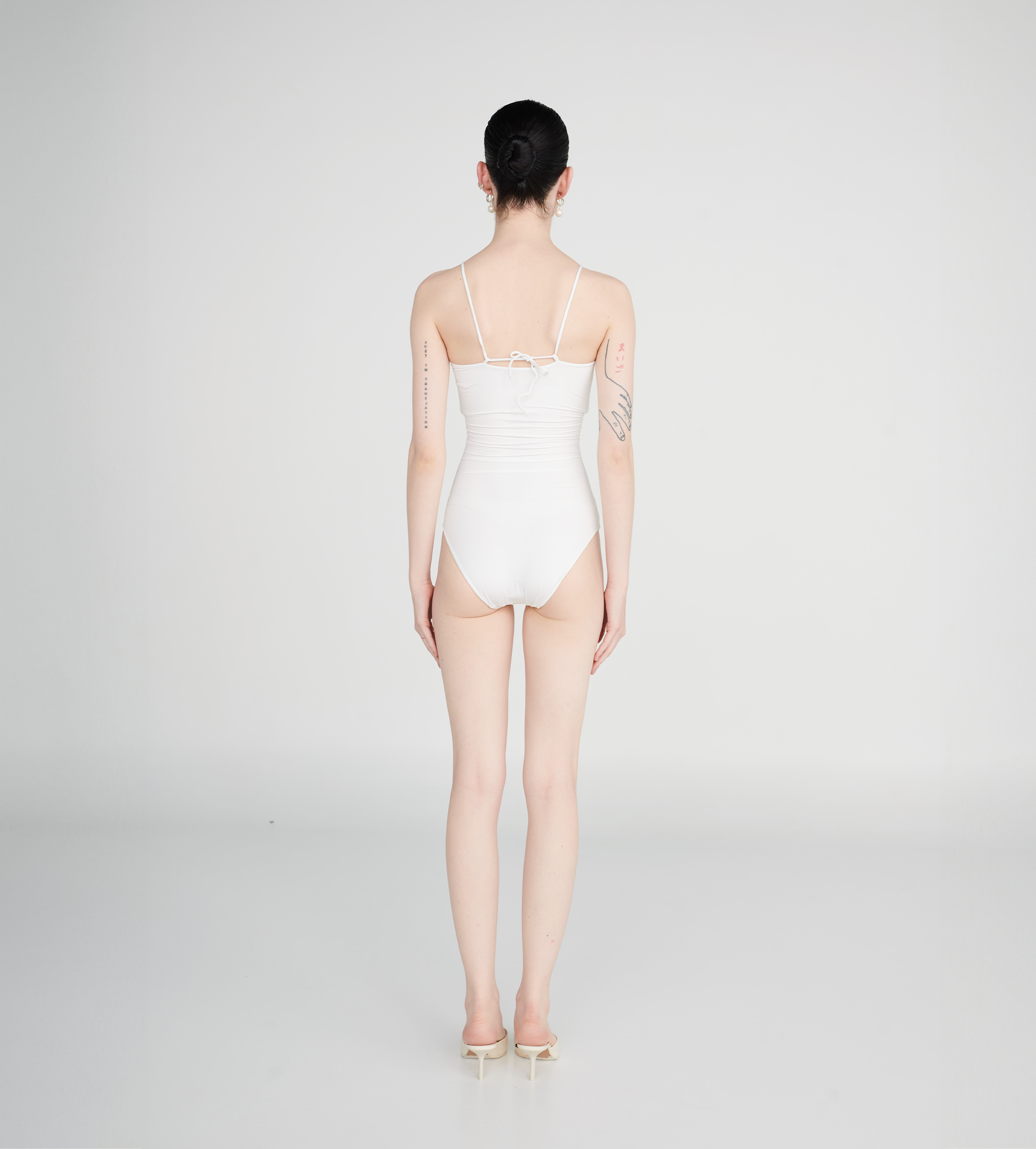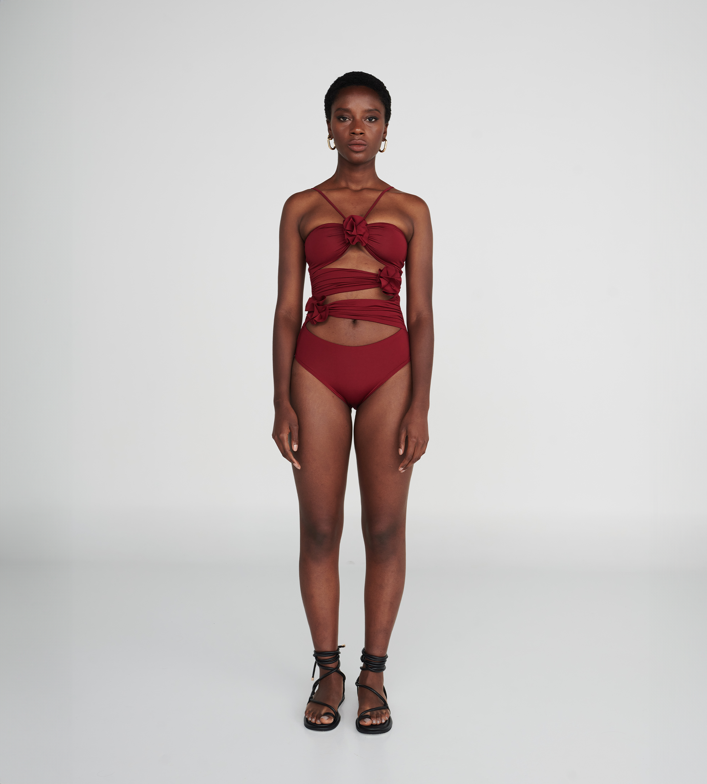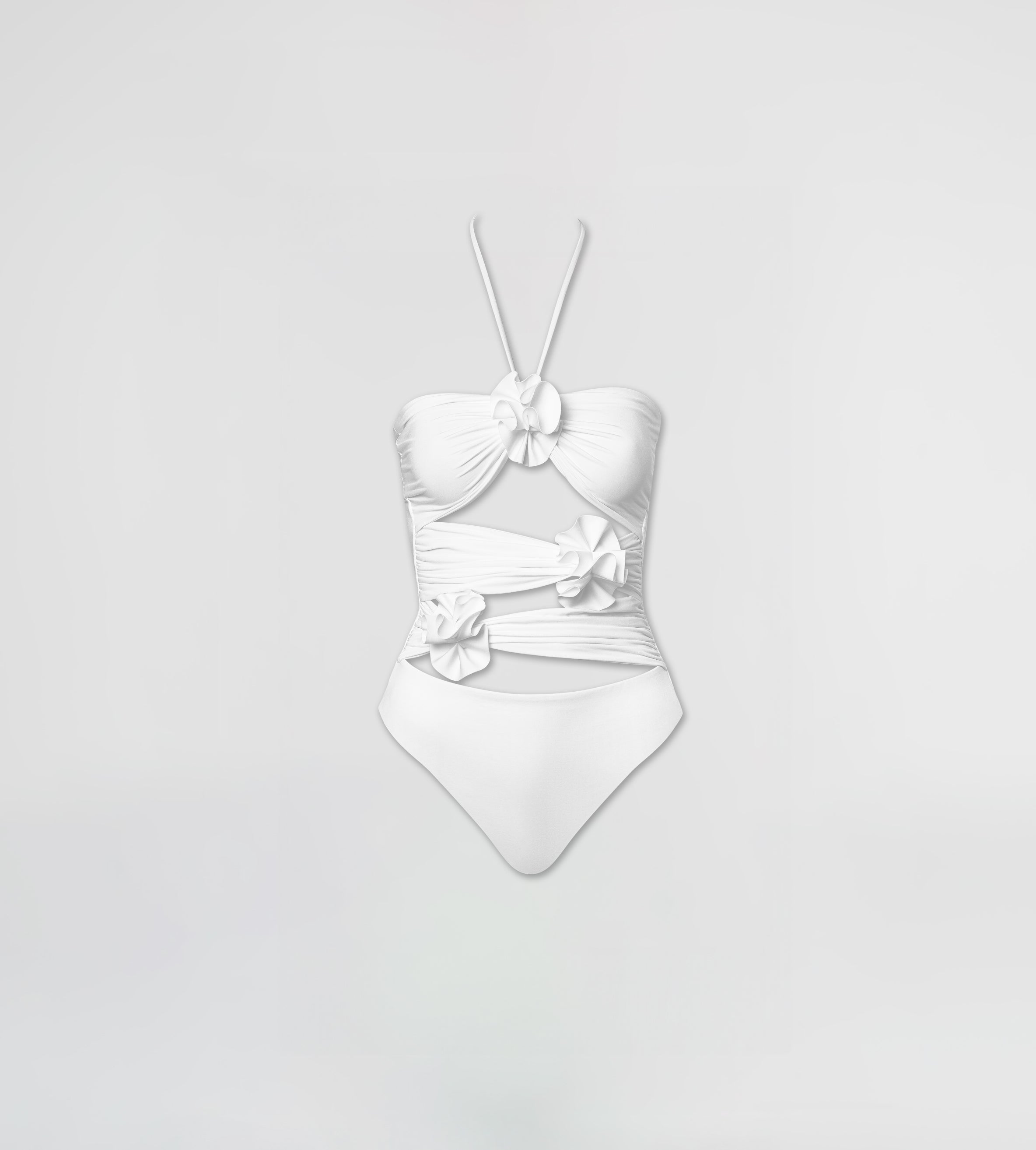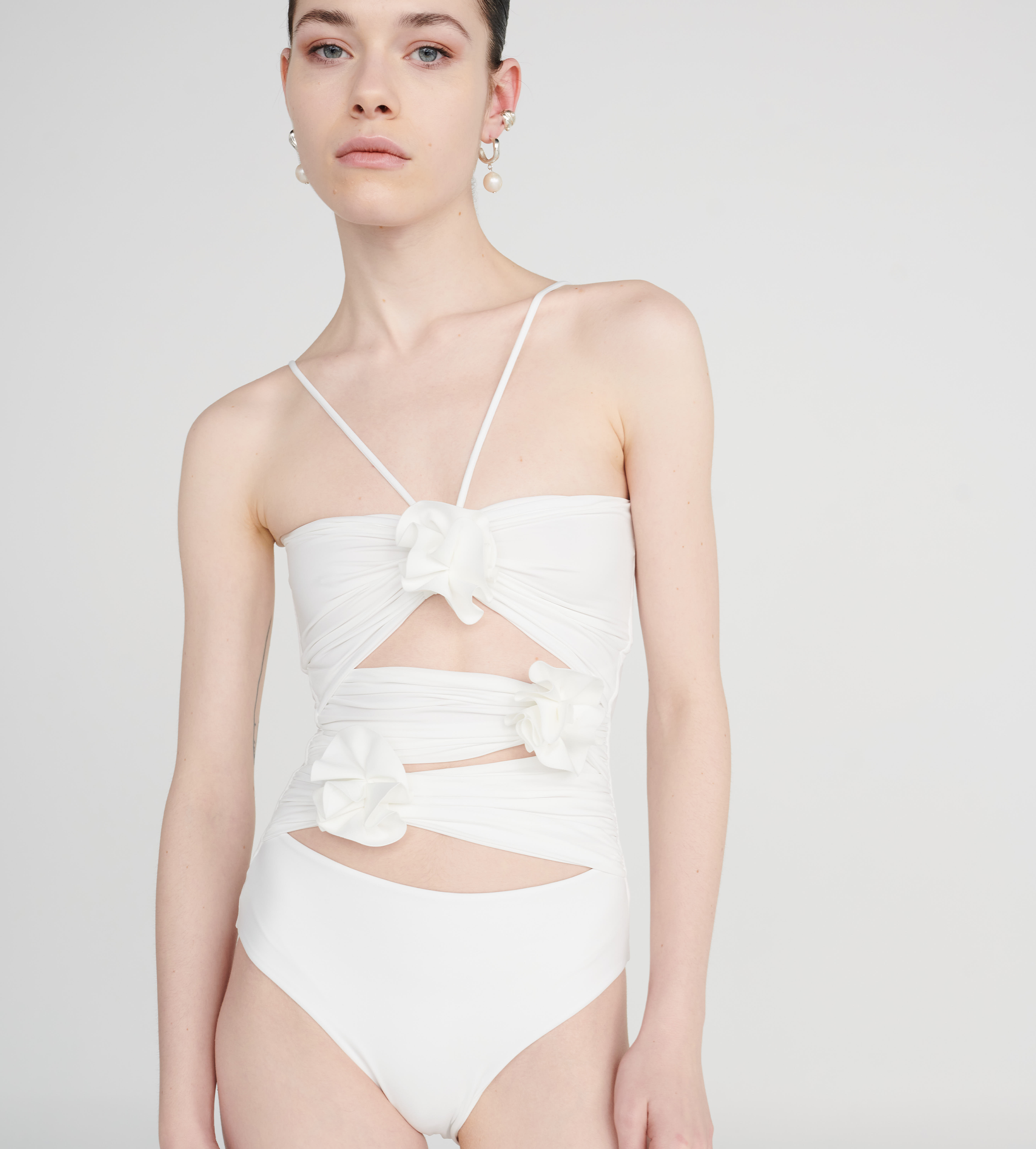 One-piece swimsuit with a straight neckline at the front and back, knot closure and asymmetrical openings on the abdomen with 3 flower-shaped ruffles. This suit has a higher rise in the leg that offers a sexier silhouette.
