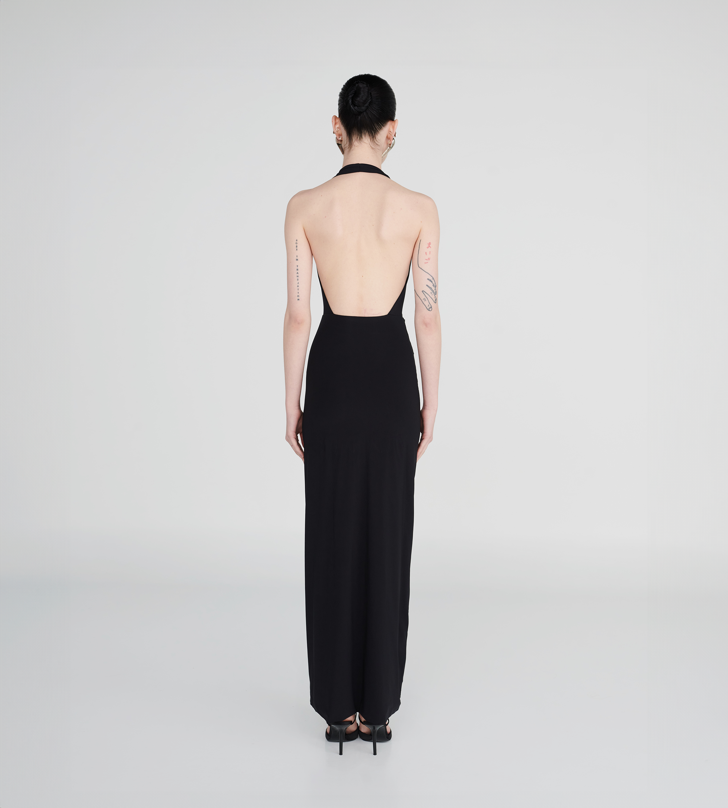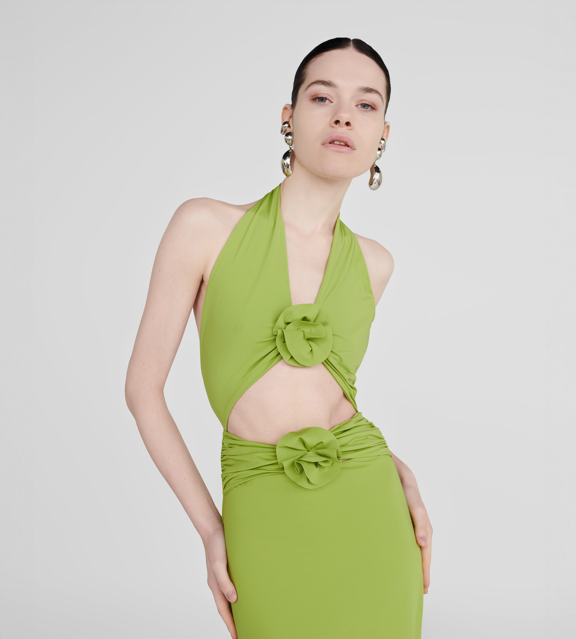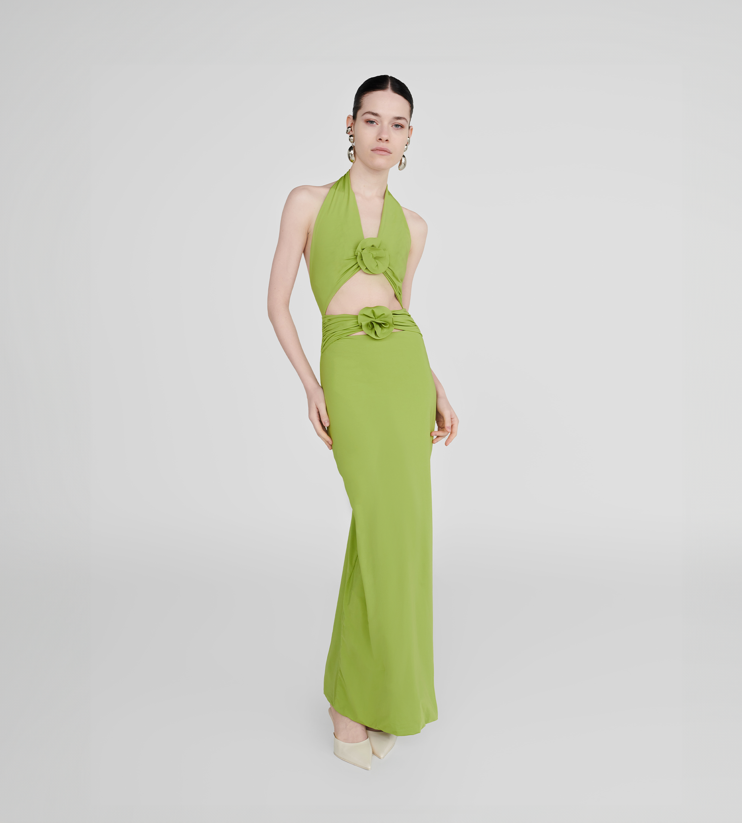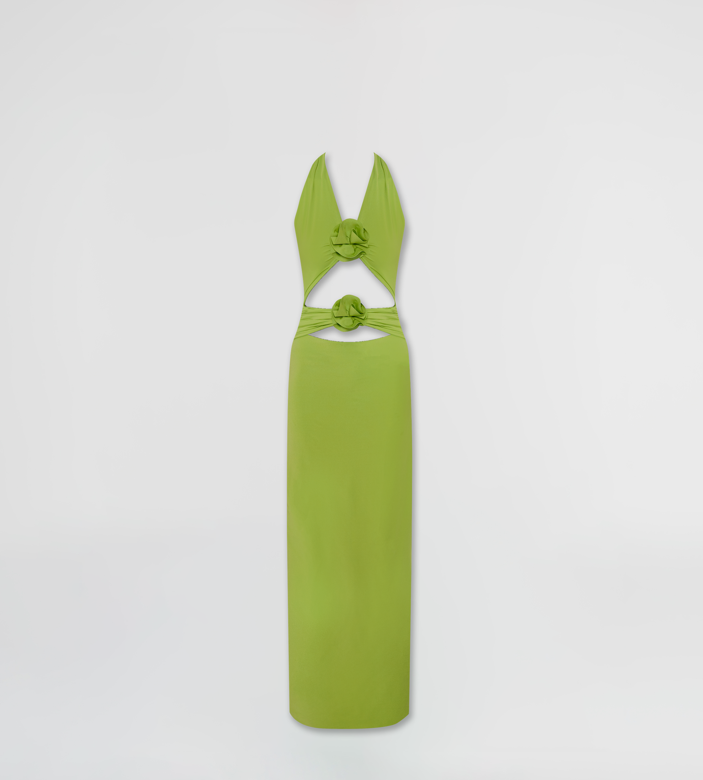 Deep halter neckline maxi dress with an alluring open back, blossoming 3D handmade flowers that enhance playful cutouts and complement a ruched waistband detail, rounded up with a flirty long skirt, characterizes our Vaupes dress – your perfect day-to-night party companion.