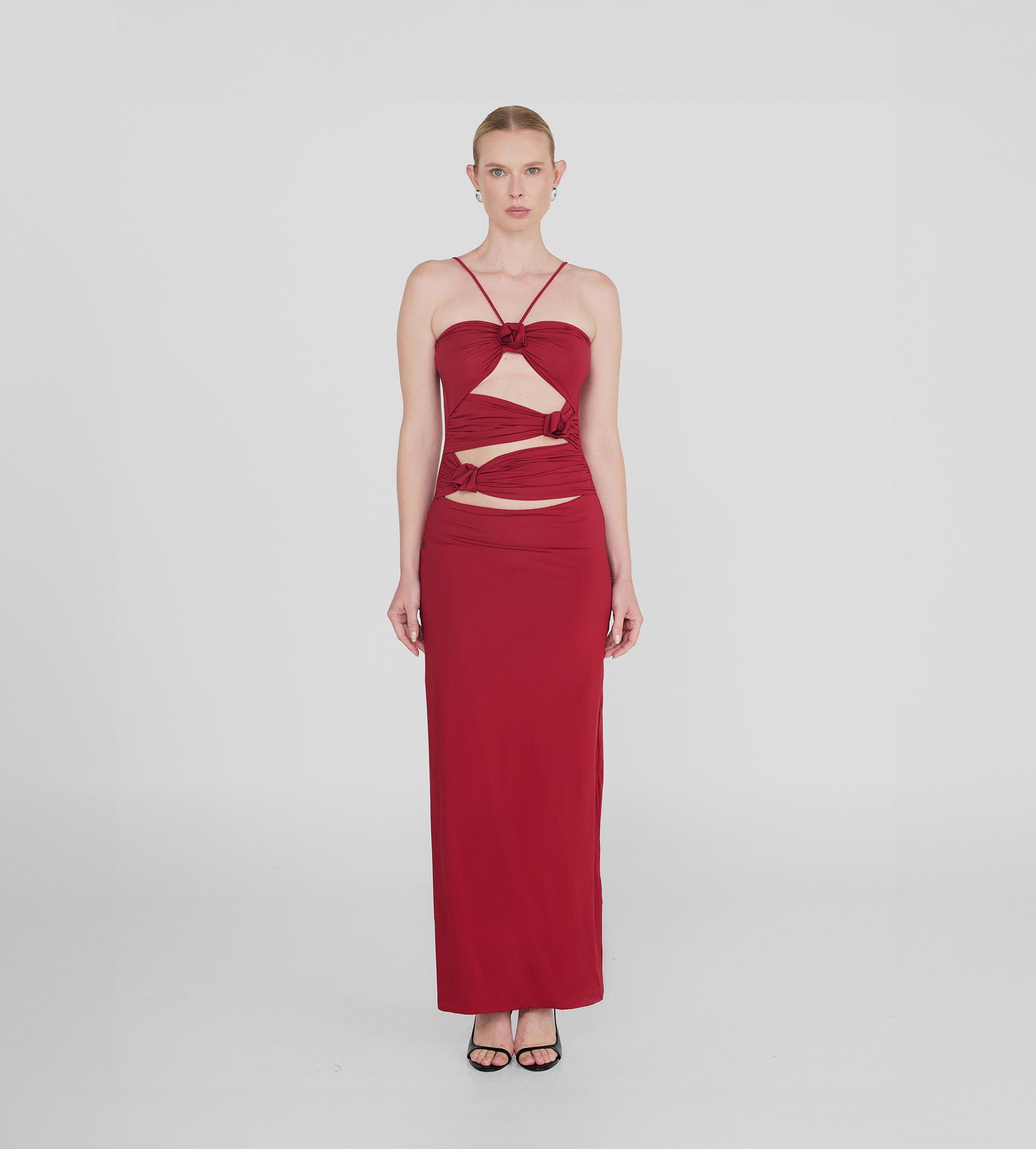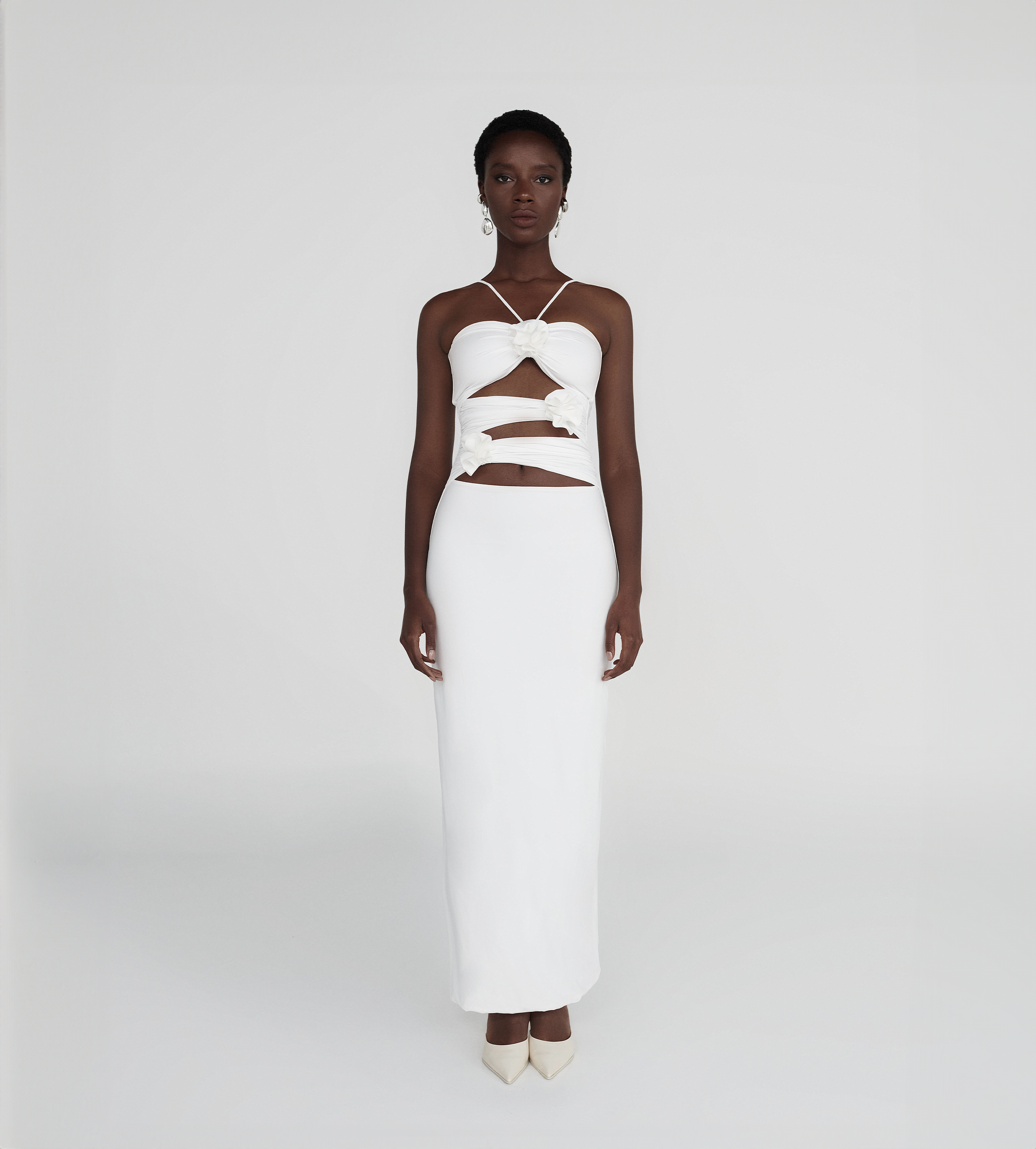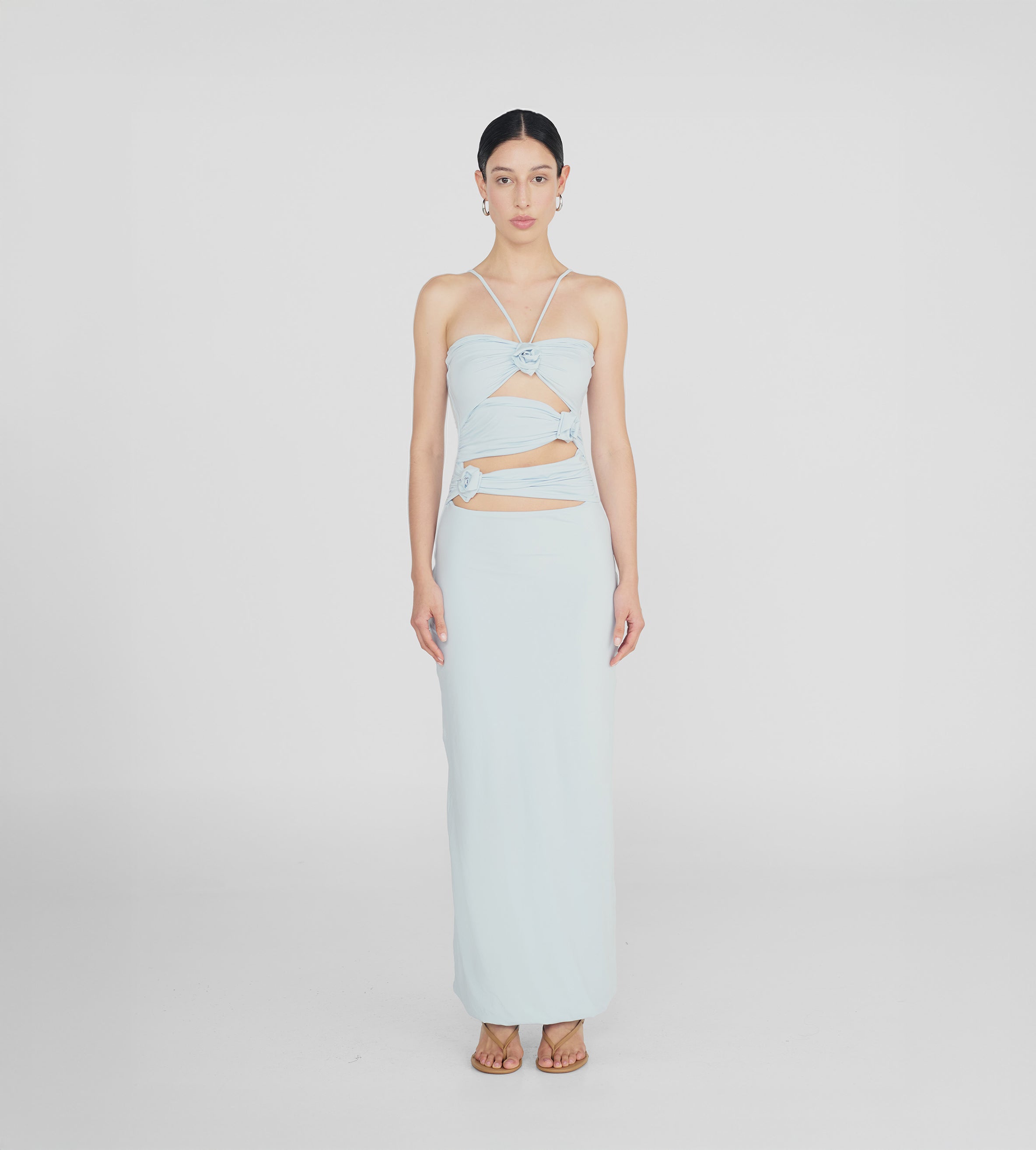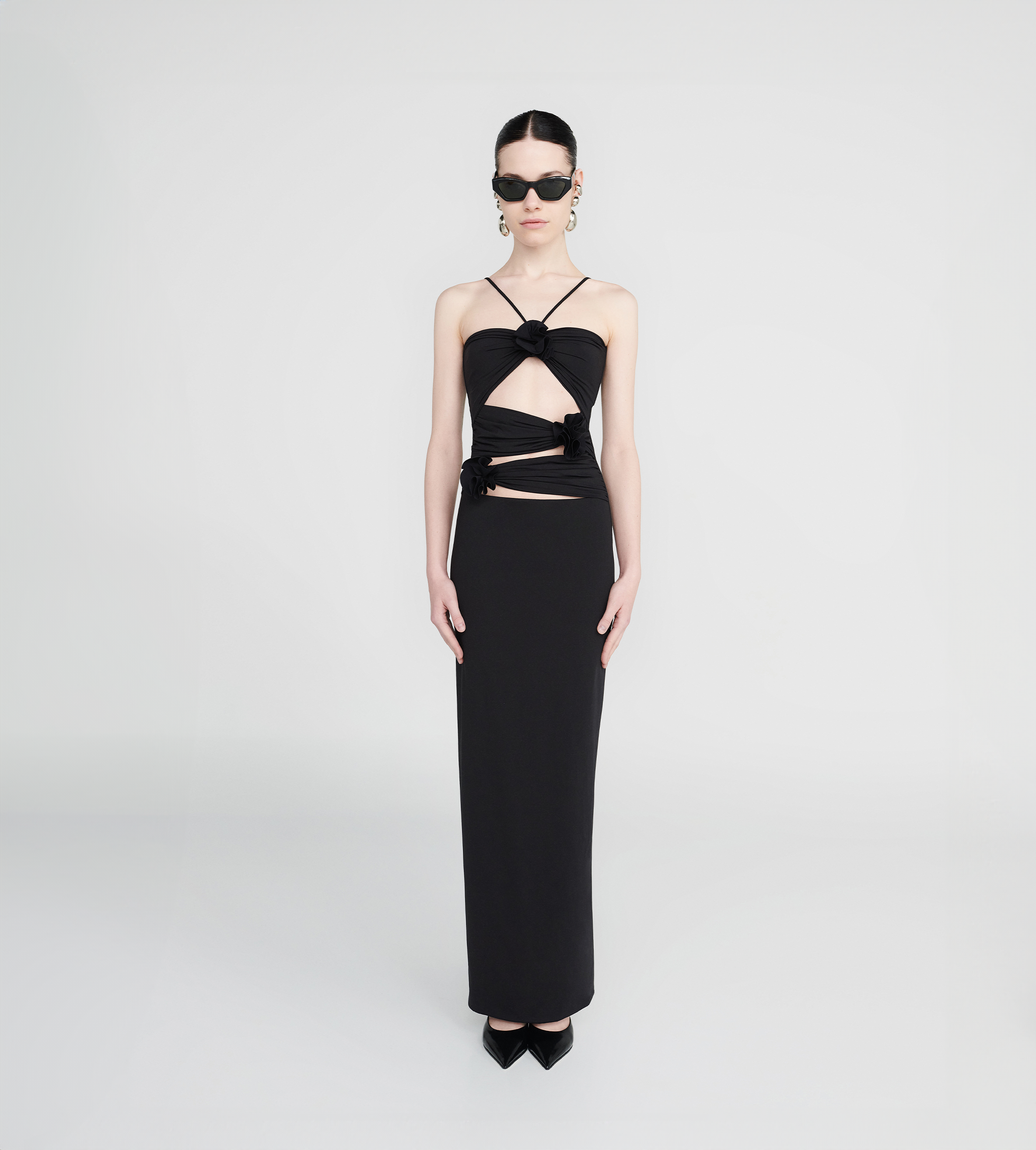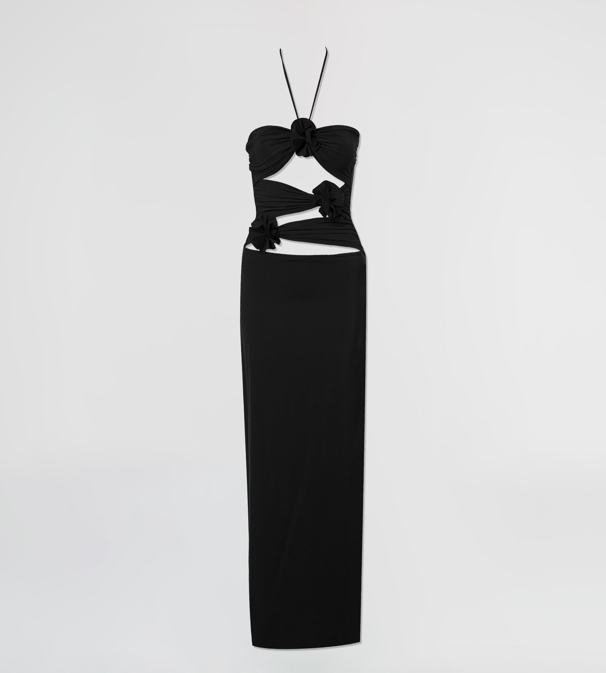 Maxi sheath dress with a straight neckline at the front and back, knot closure and asymmetrical openings on the abdomen with 3 flower-shaped ruffles.