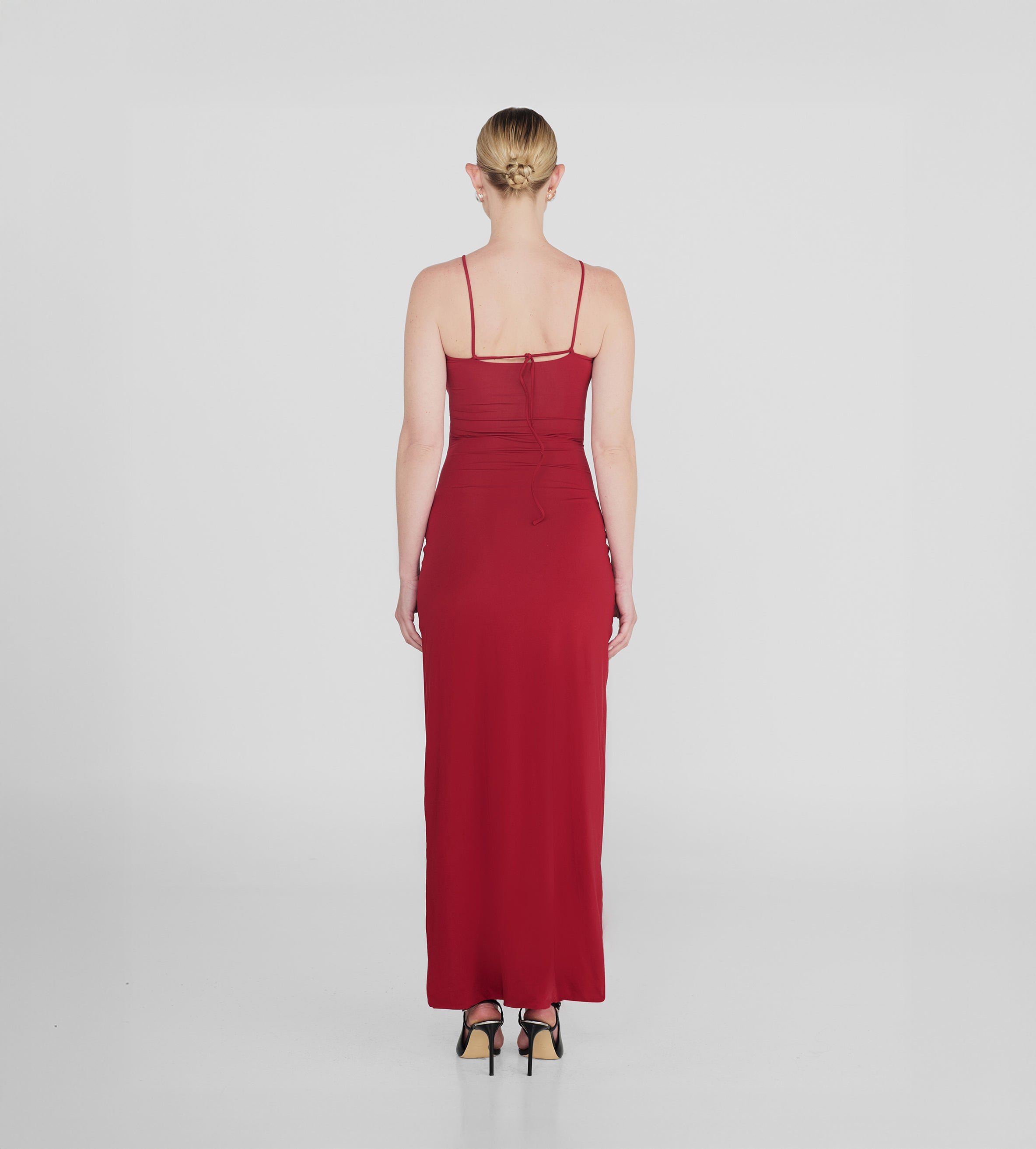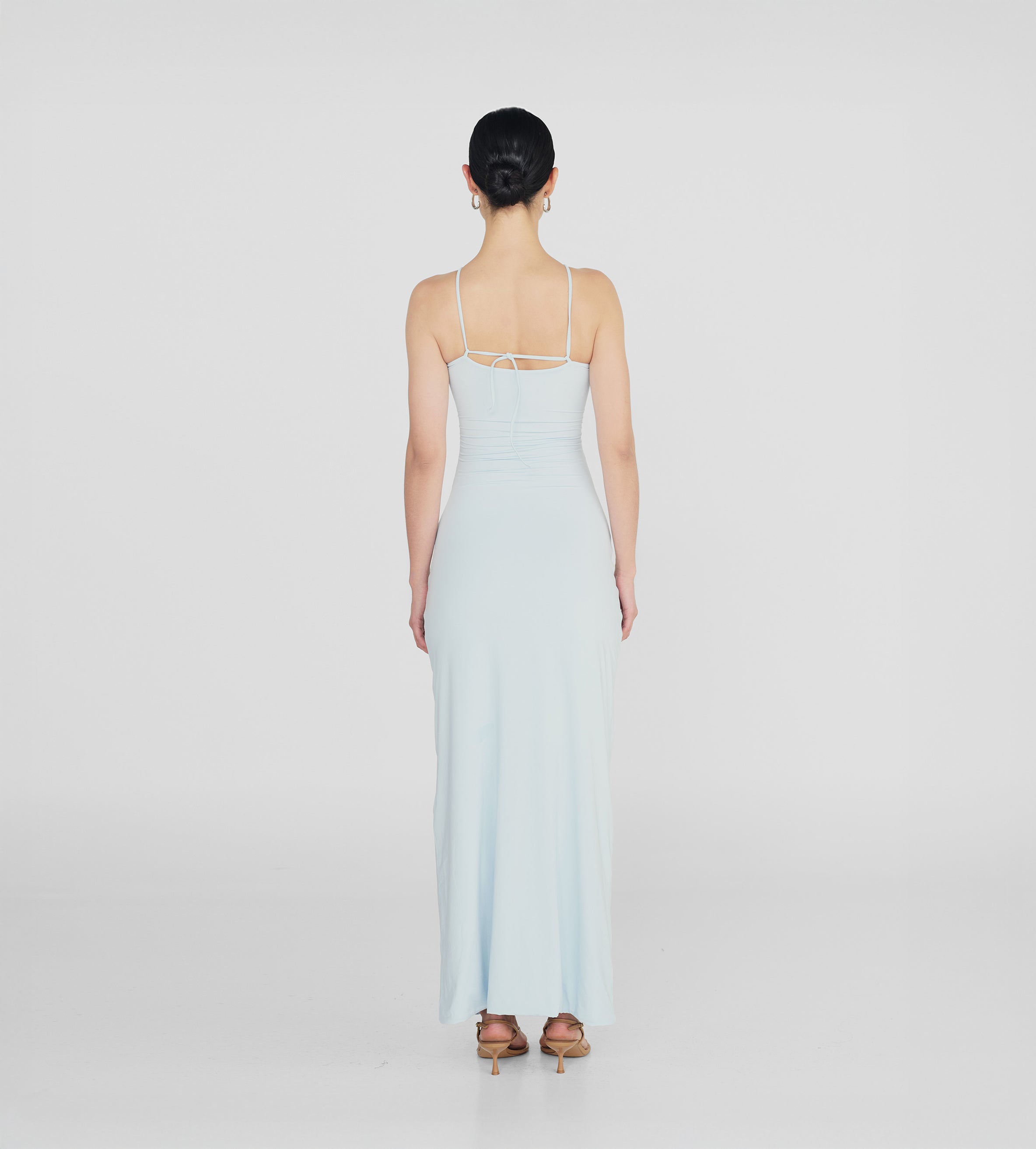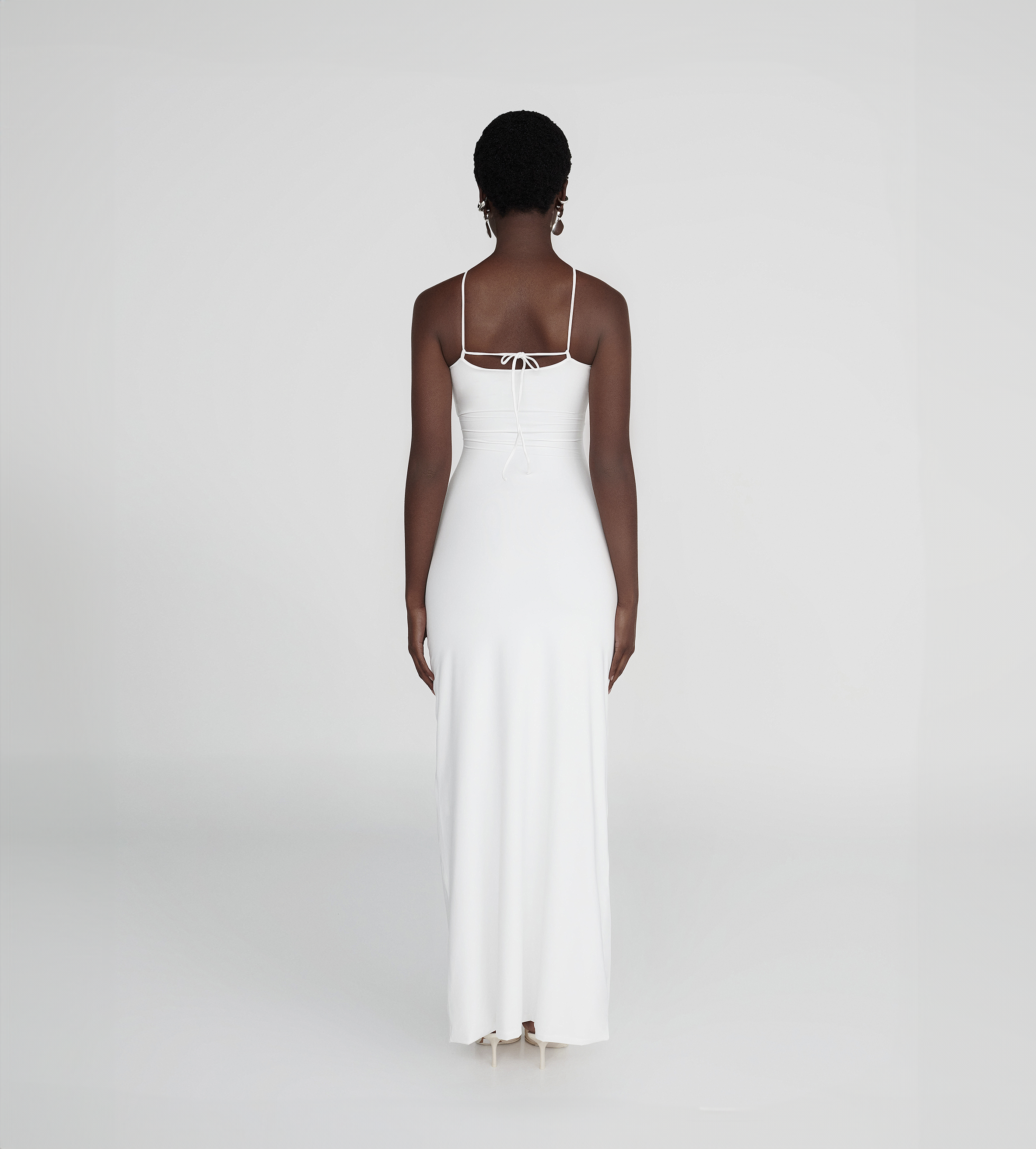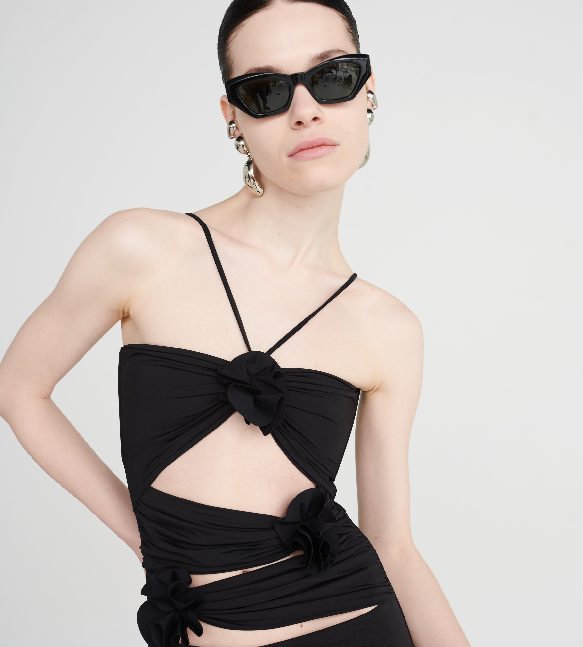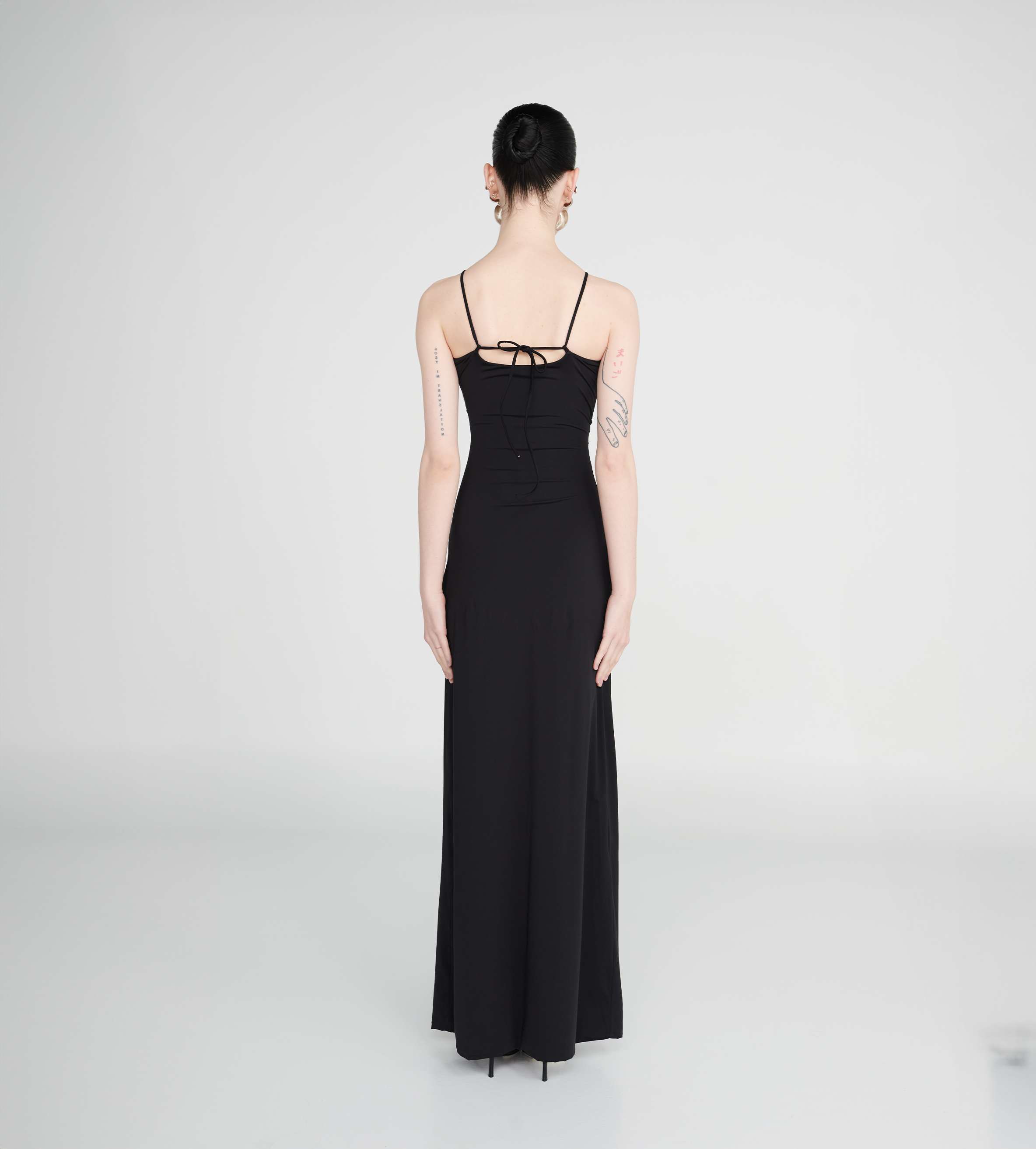 Maxi sheath dress with a straight neckline at the front and back, knot closure and asymmetrical openings on the abdomen with 3 flower-shaped ruffles.